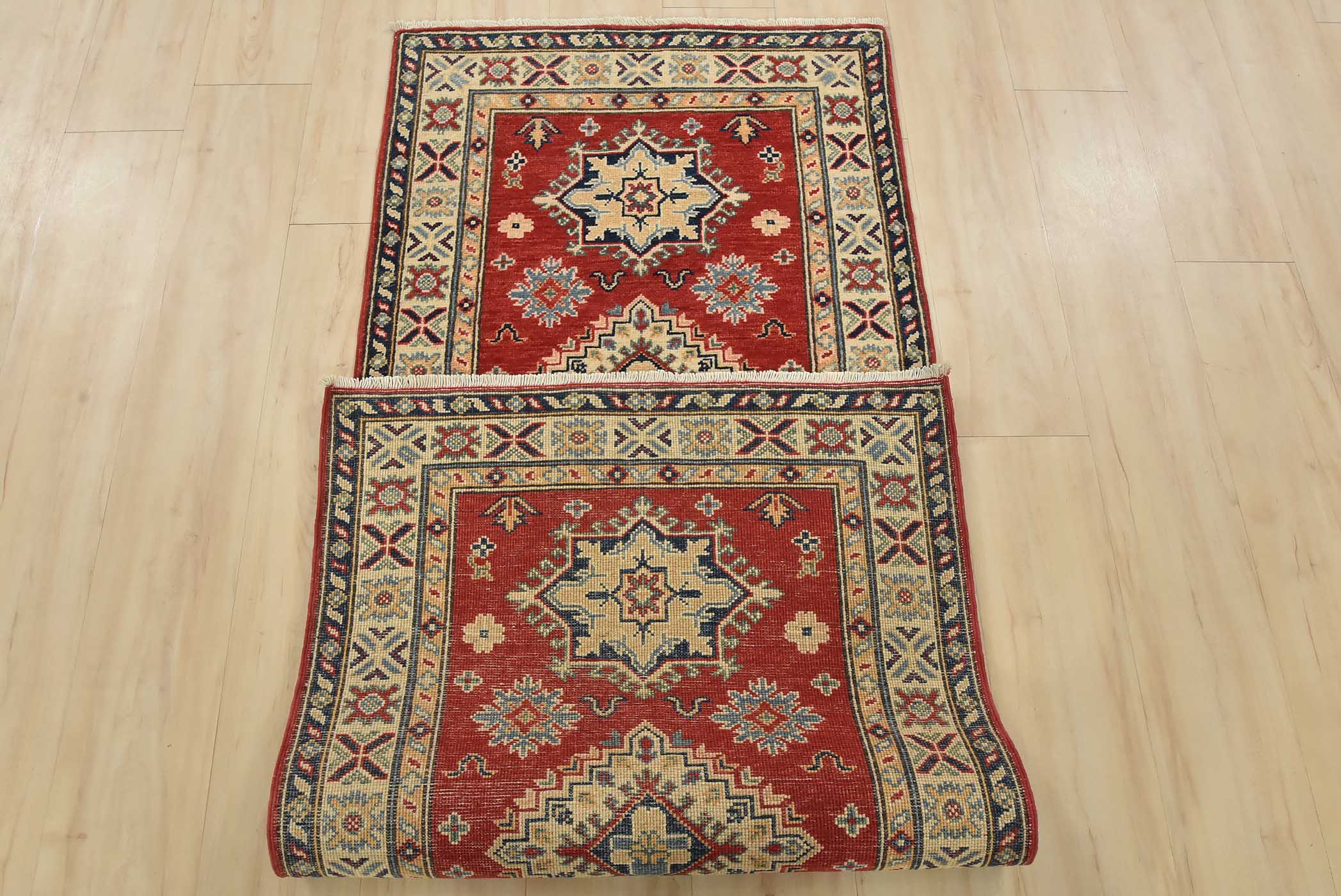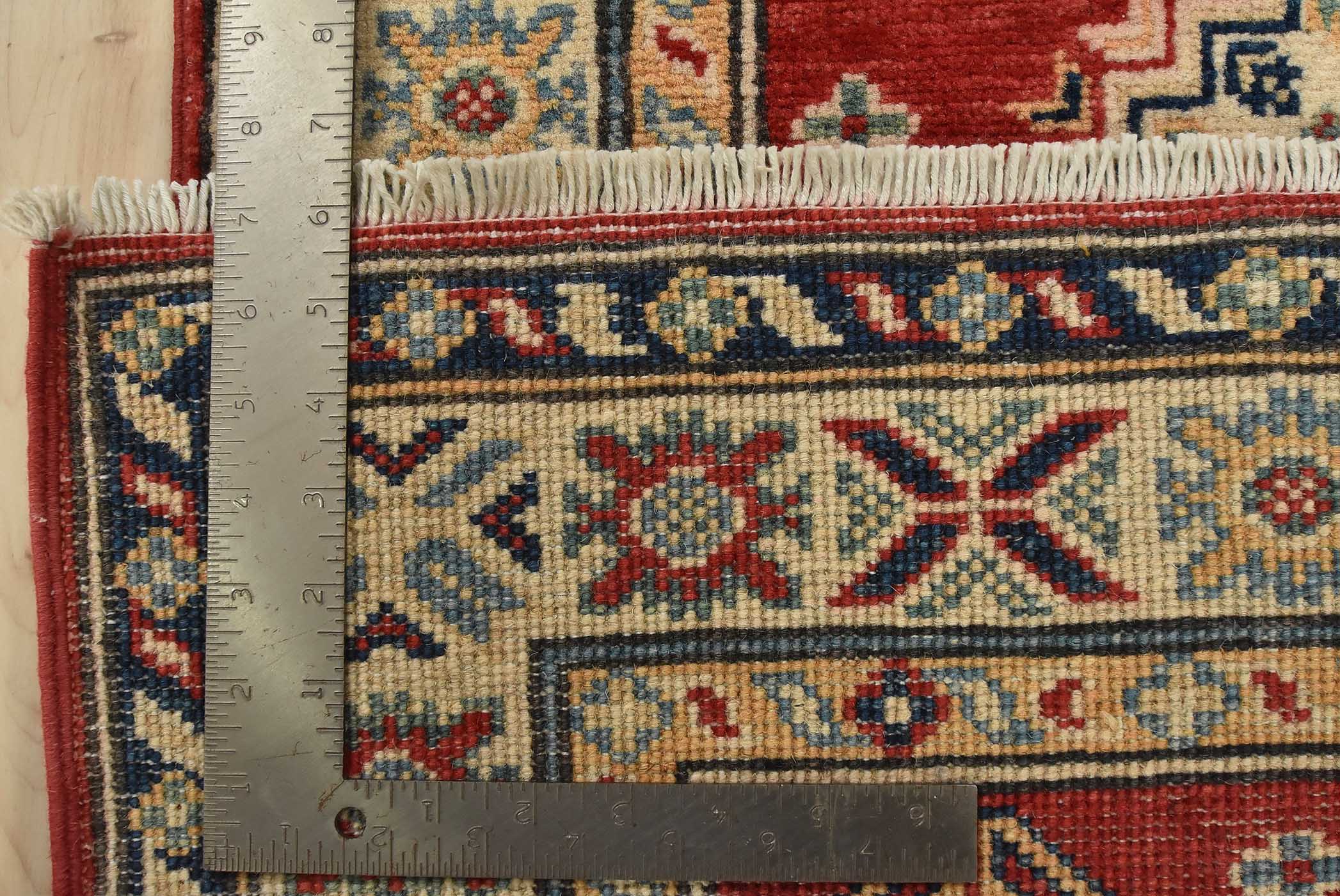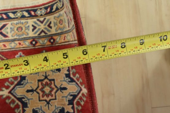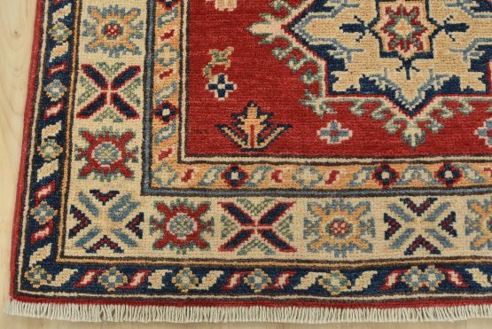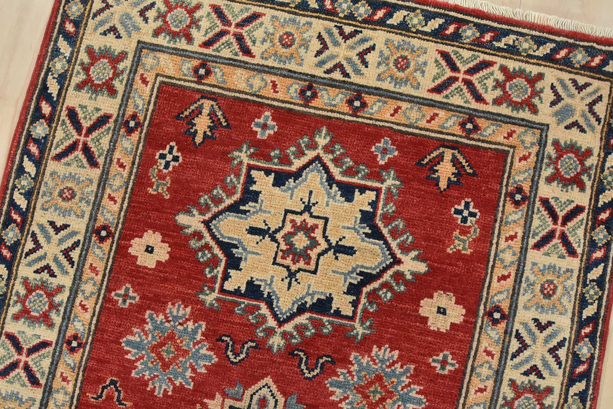 A tribal Caucasian Kazak runner hand-knotted with fine wool on a cotton foundation. This rug features geometric medallions surrounded by small geometric floral motifs set against a red background. It is new and in excellent condition.
