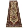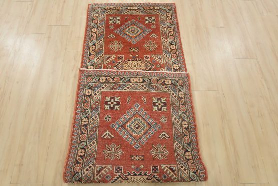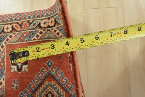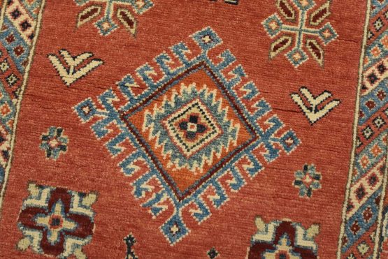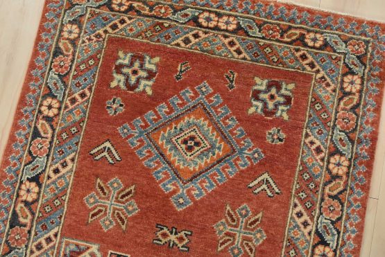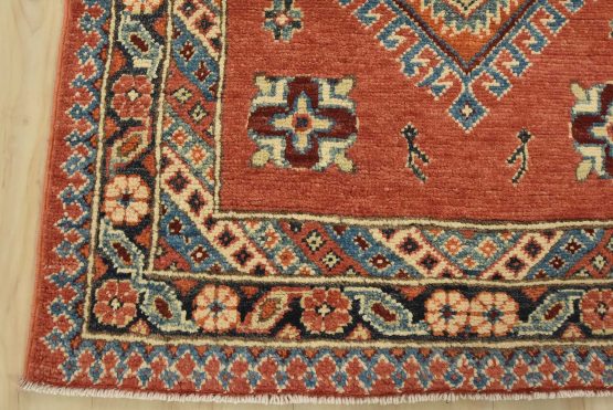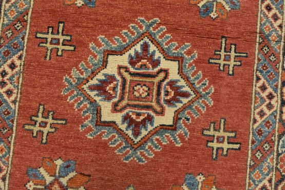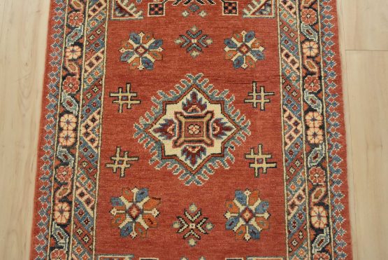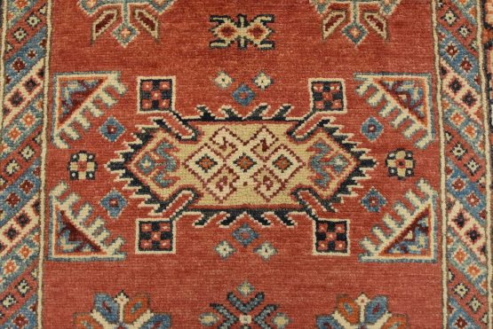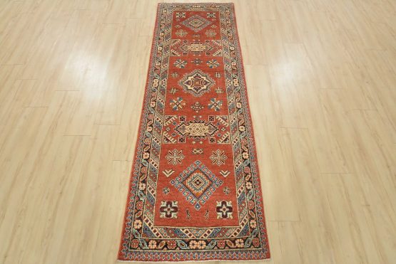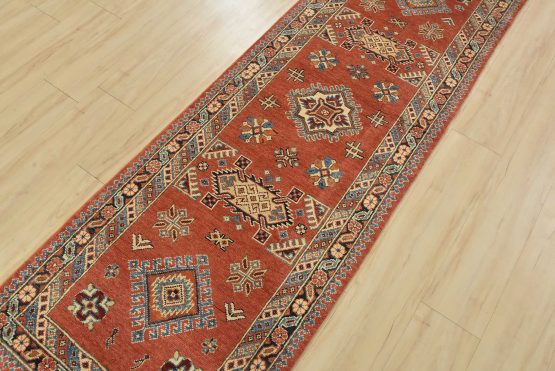 A tribal Caucasian Kazak runner hand-knotted with an all-wool pile on a cotton foundation. This oriental rug features geometric medallions surrounded by geometric motifs set against a red background. It is new and in excellent condition.