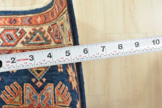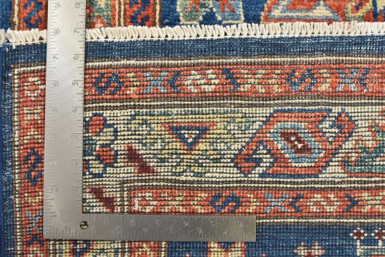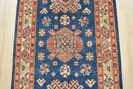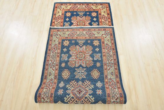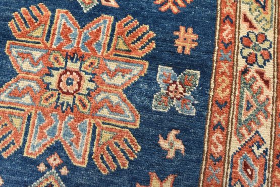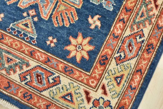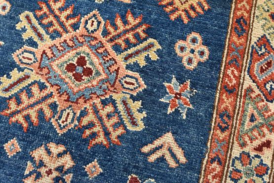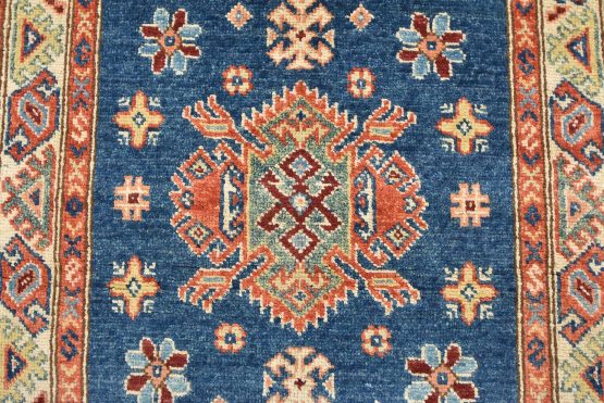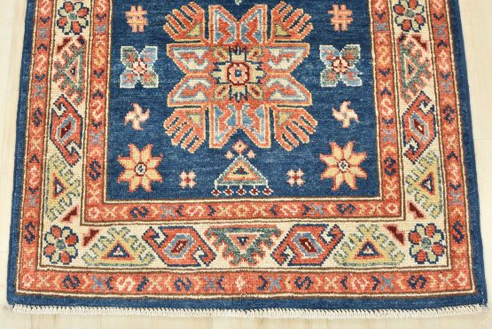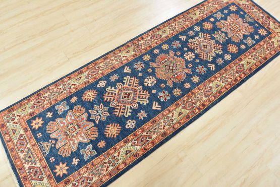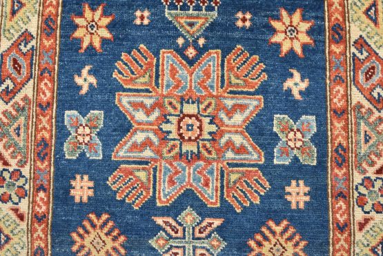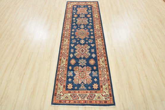 A tribal Kazak runner hand-knotted with an all-wool pile on a cotton foundation. This oriental rug features a row of geometric motifs surrounded by smaller geometric motifs set against a blue background. It is new and in excellent condition.