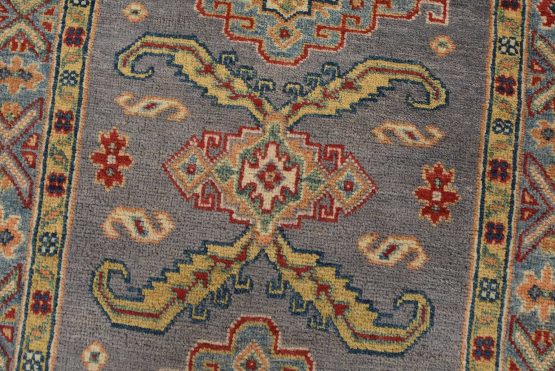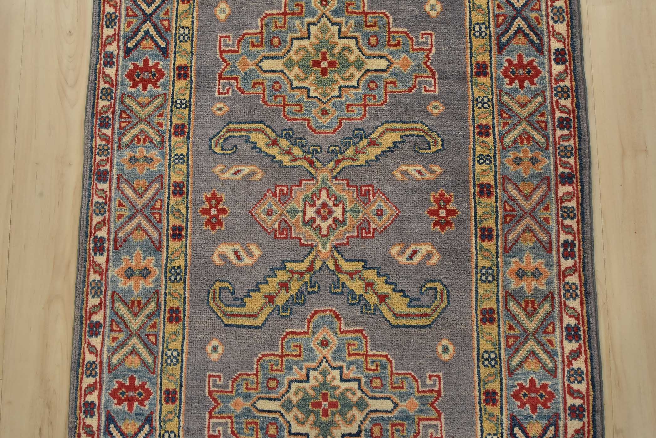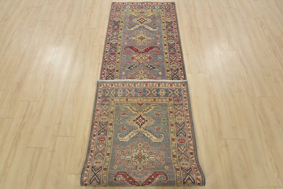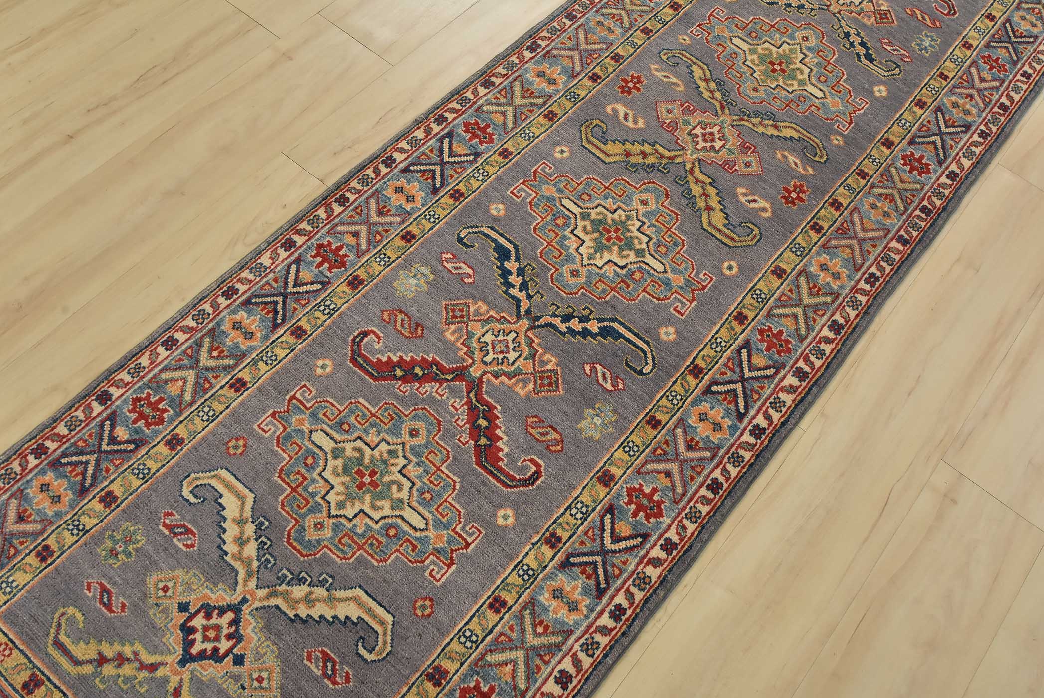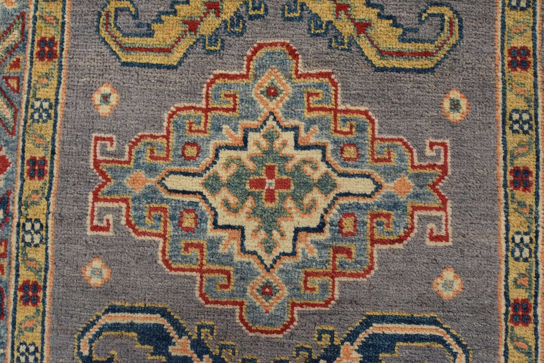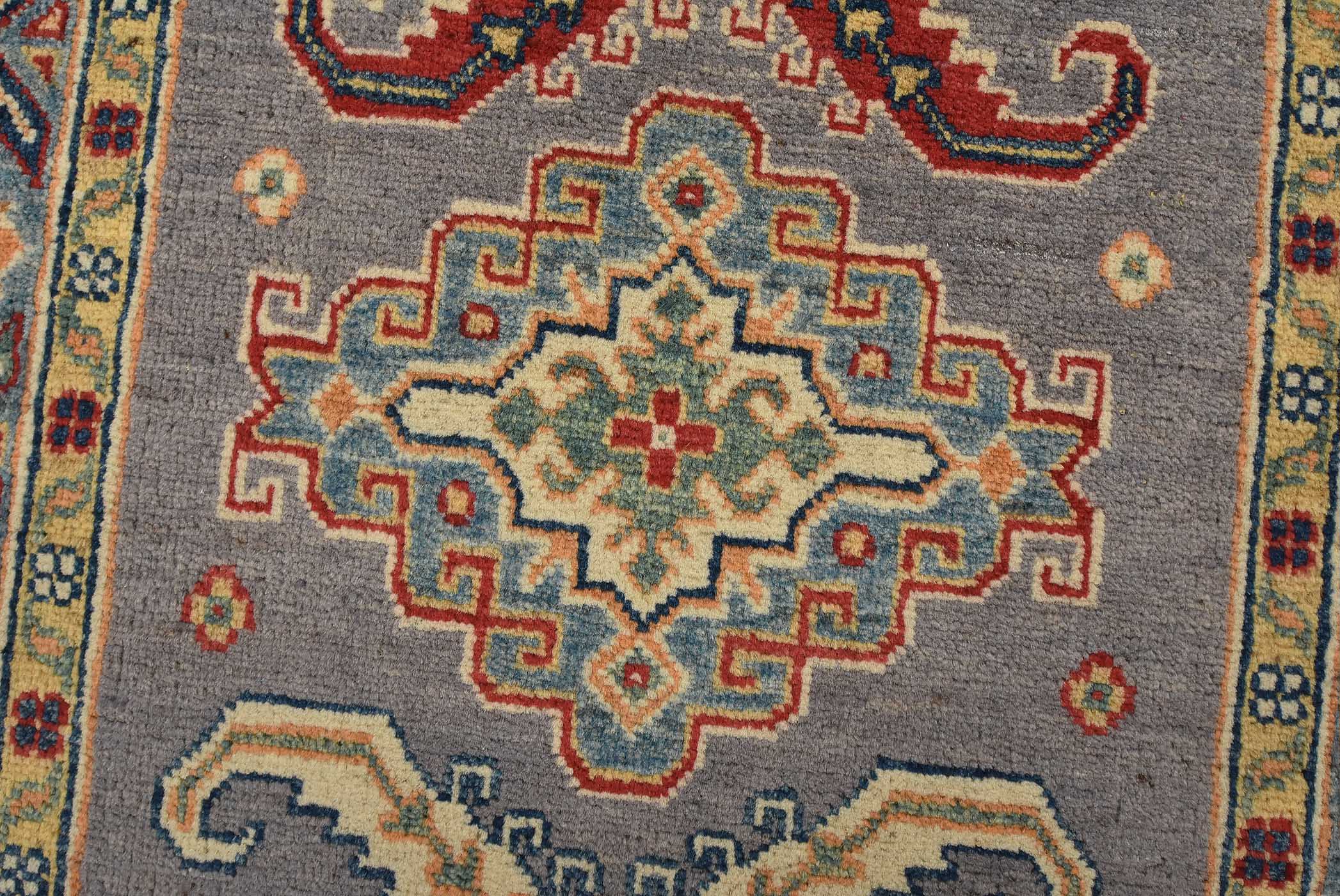 A tribal Caucasian Kazak runner hand-knotted with fine wool on a cotton foundation. This rug features a row of geometric medallions surrounded by small geometric motifs set against a gray background. It is new and in excellent condition.