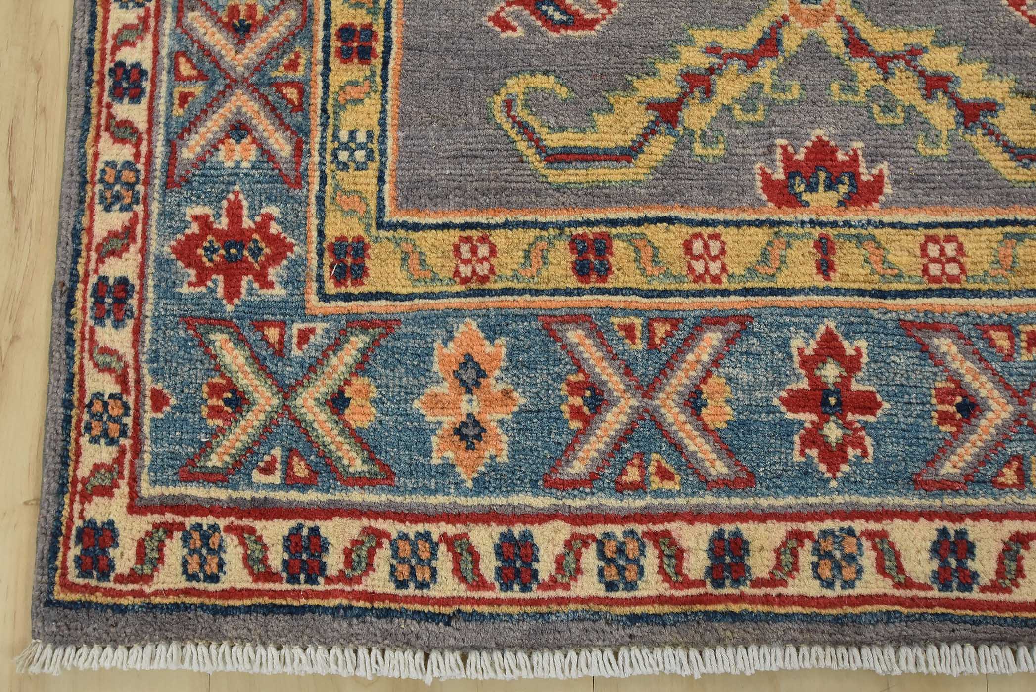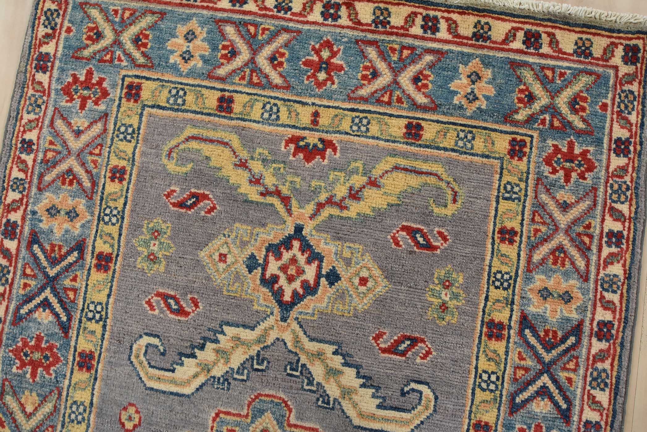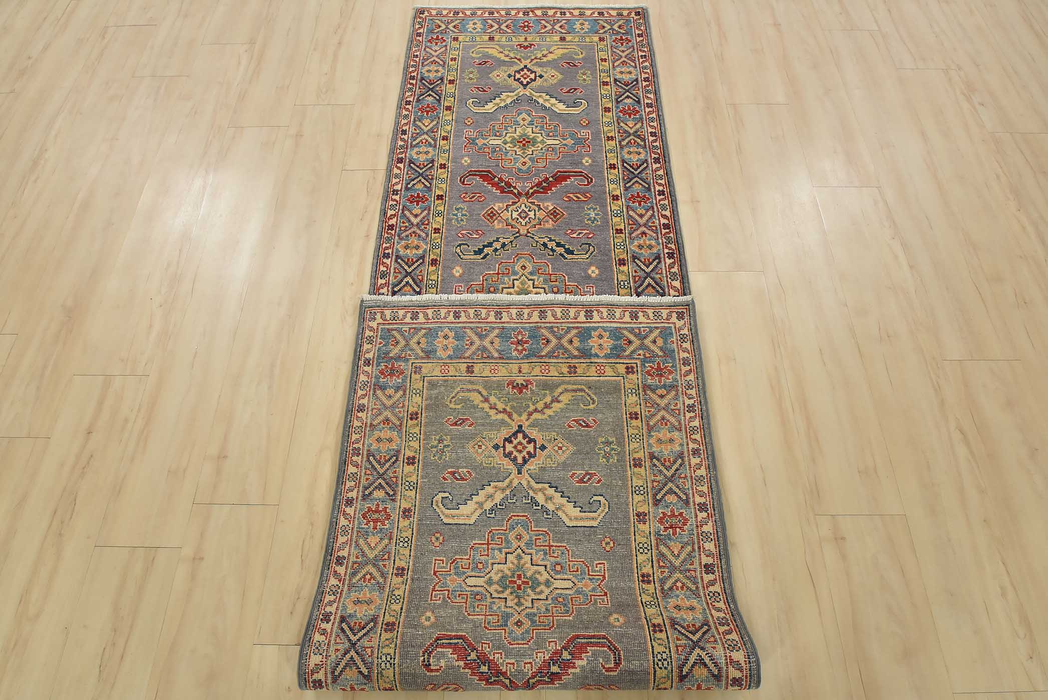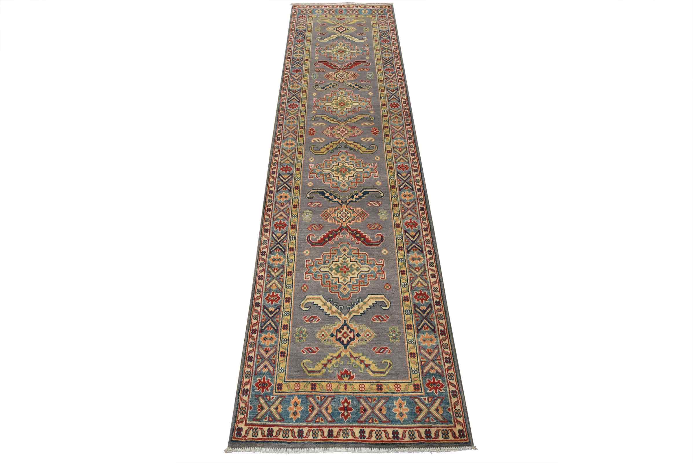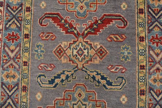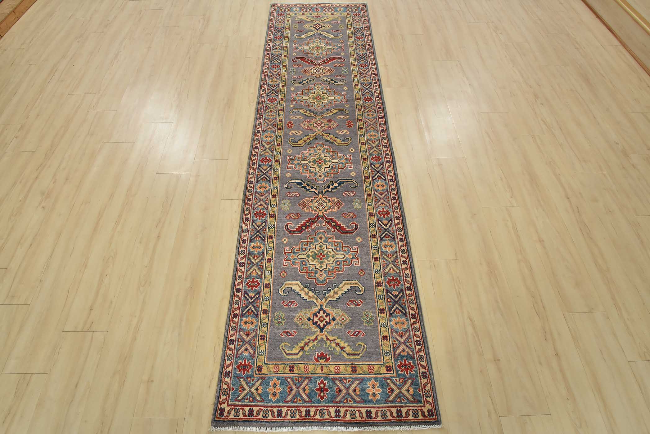 A tribal Caucasian Kazak runner hand-knotted with fine wool on a cotton foundation. This rug features a row of geometric medallions surrounded by small geometric motifs set against a gray background. It is new and in excellent condition.