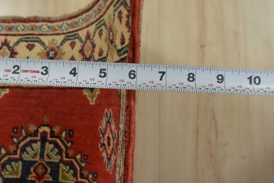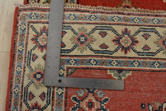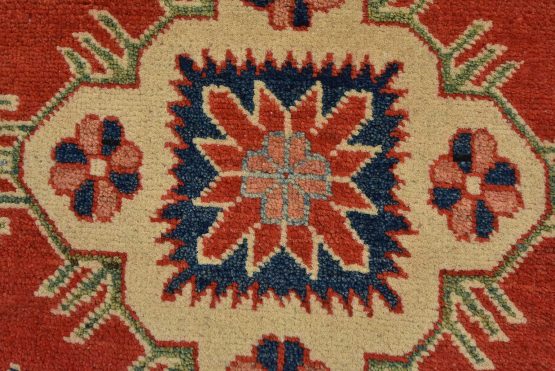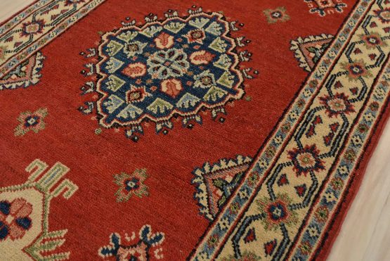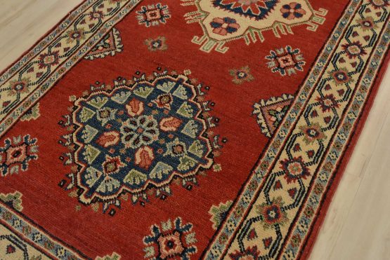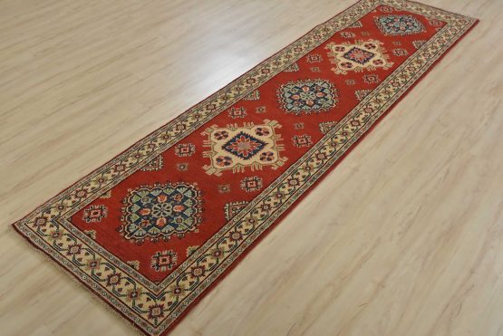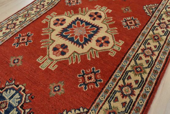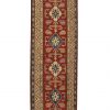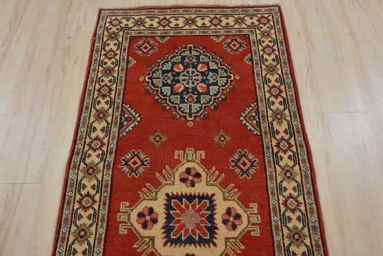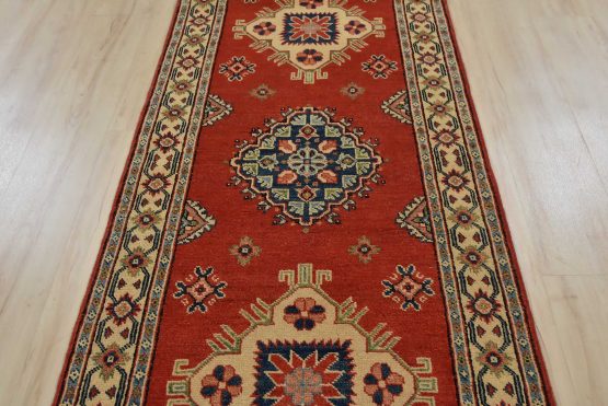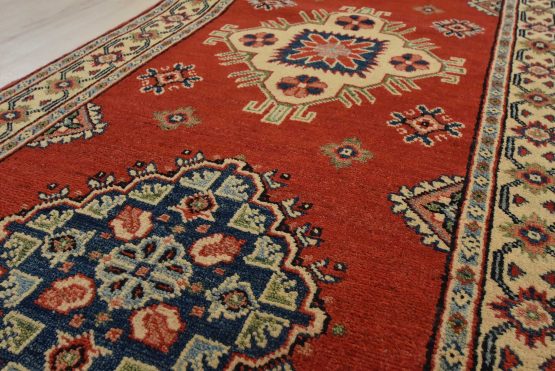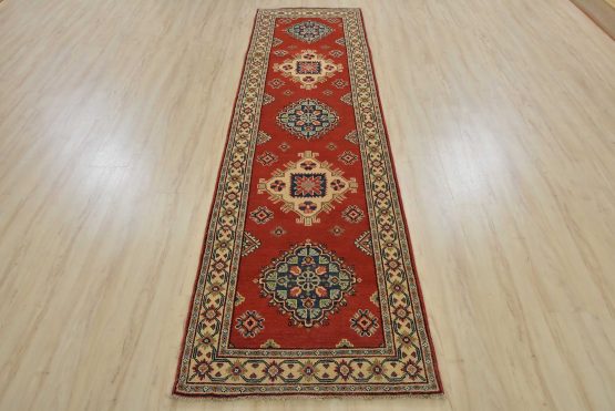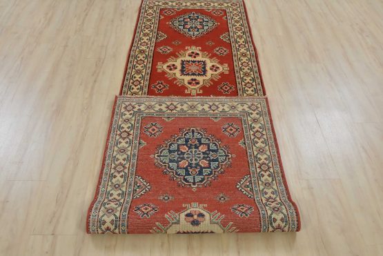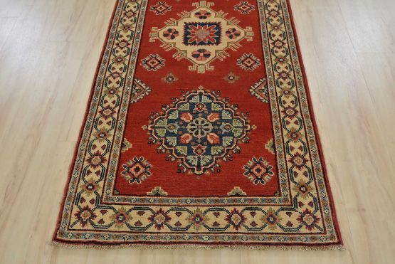 A traditional tribal Caucasian Kazak runner hand-knotted with an all-wool pile on a cotton foundation. This oriental rug features a row of geometric medallions surrounded by geometric motifs set against a red background. It is new and in excellent condition.