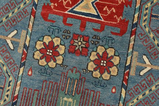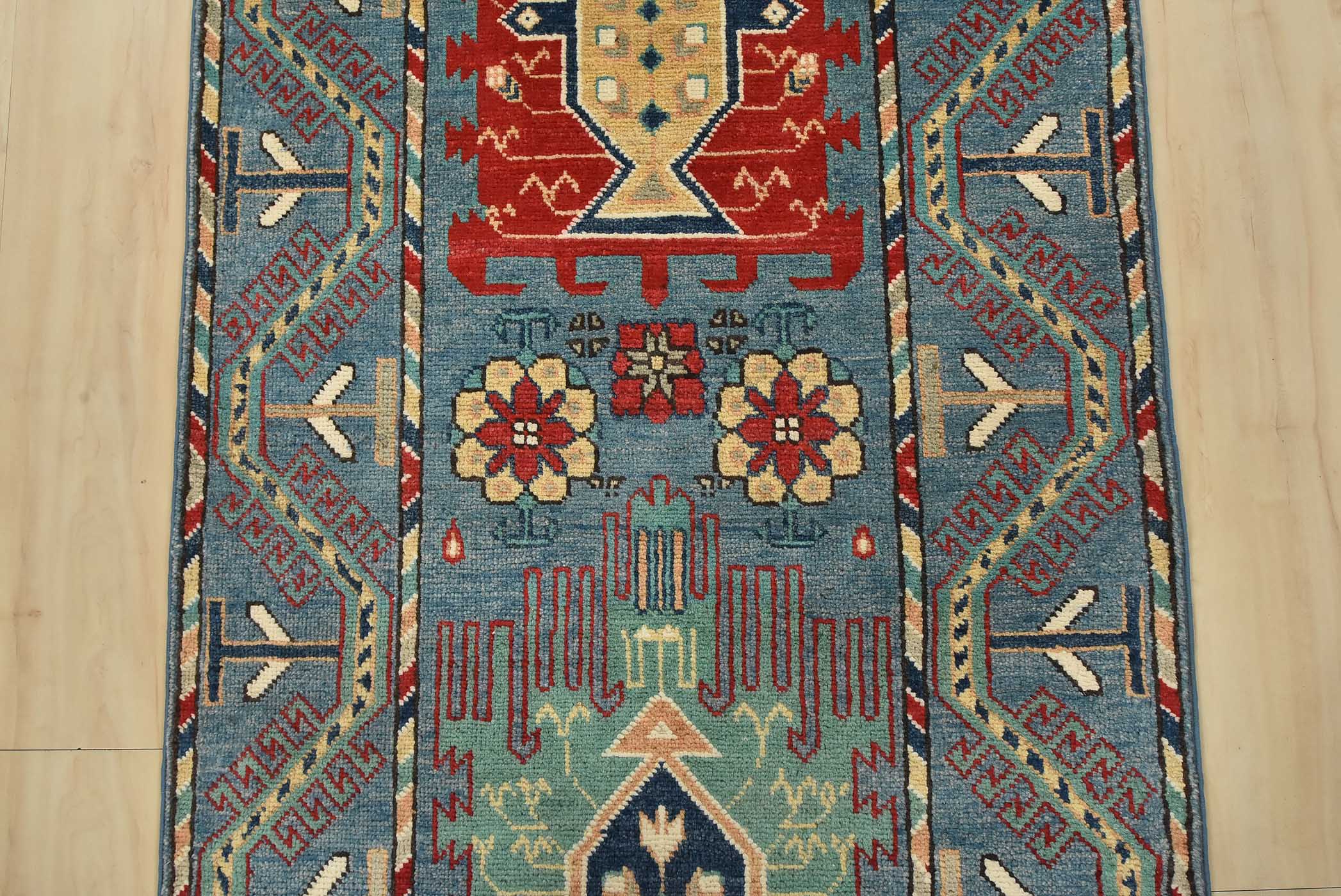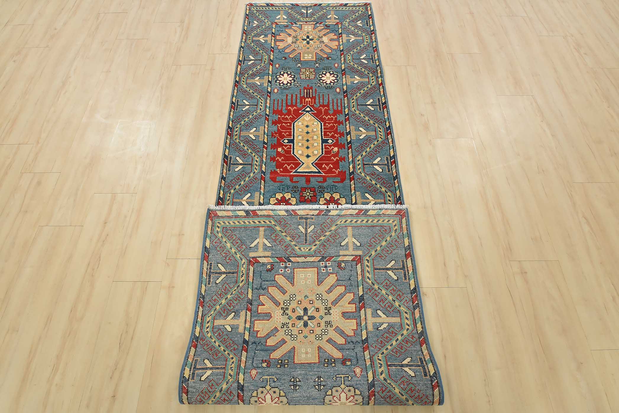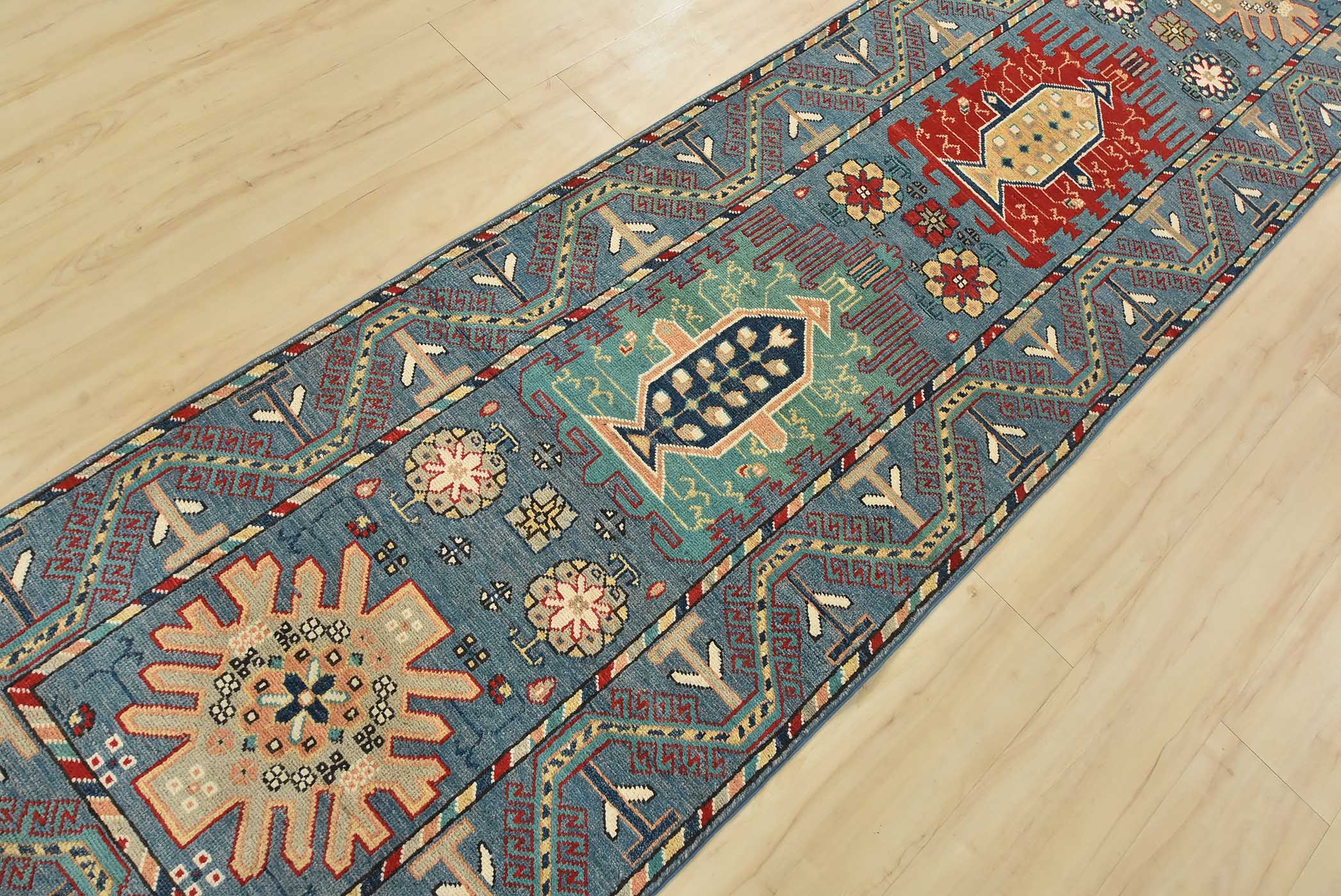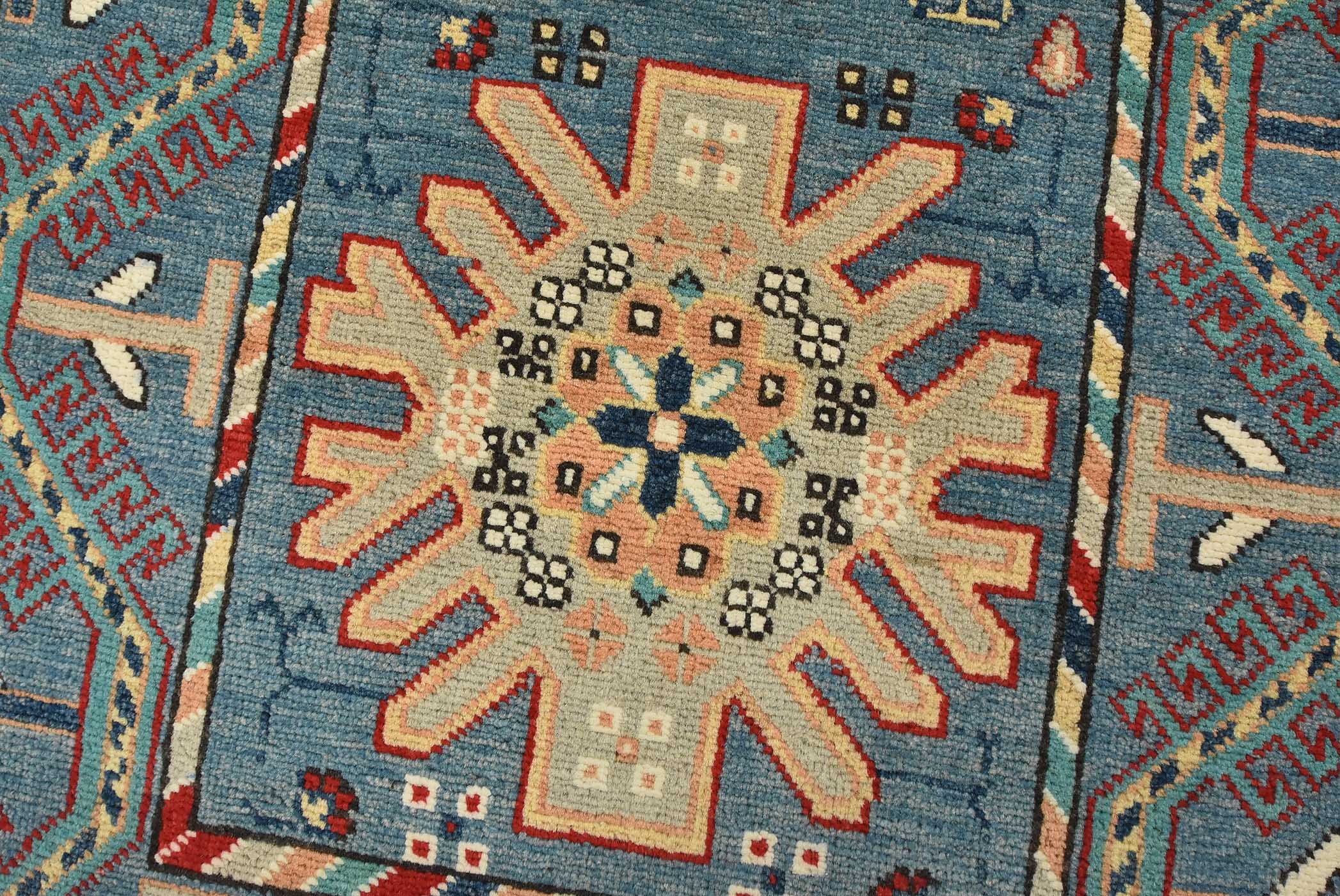 A tribal Caucasian Kazak runner hand-knotted with fine wool on a cotton foundation. This rug features a row of geometric medallions set against a blue background. It is new and in excellent condition.