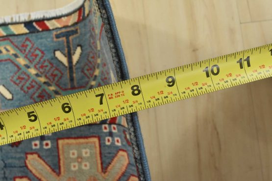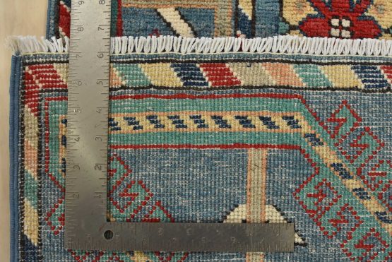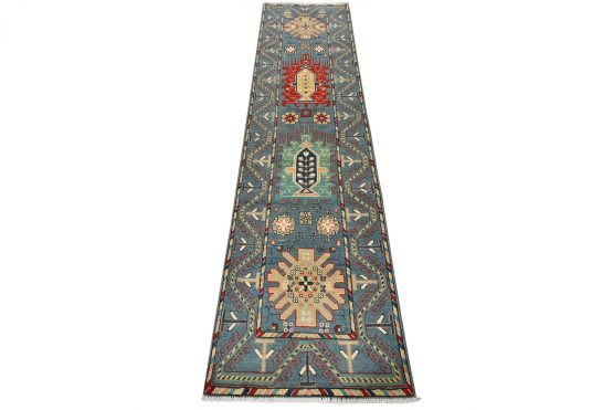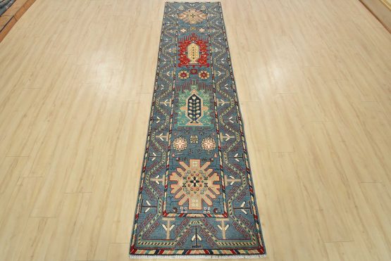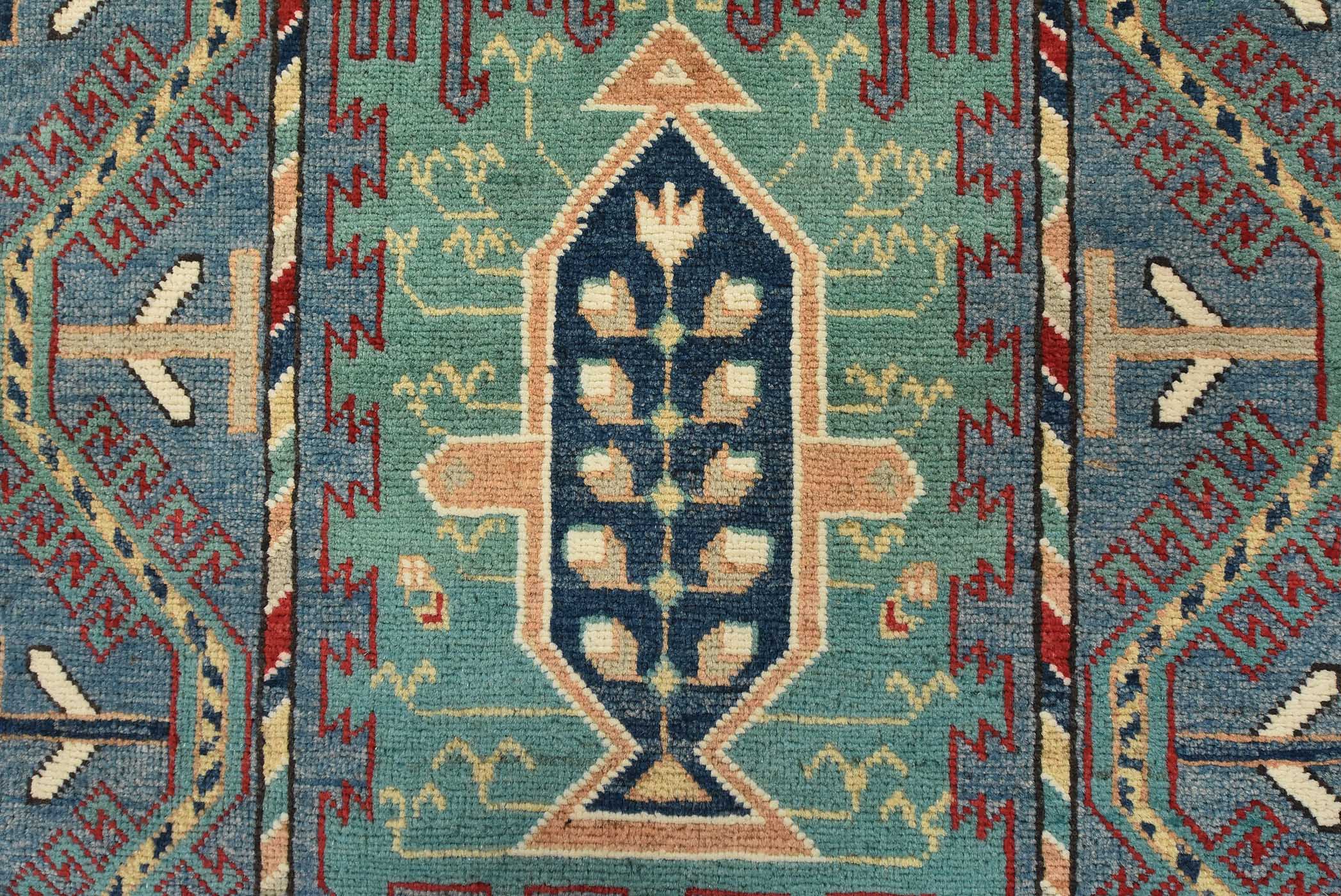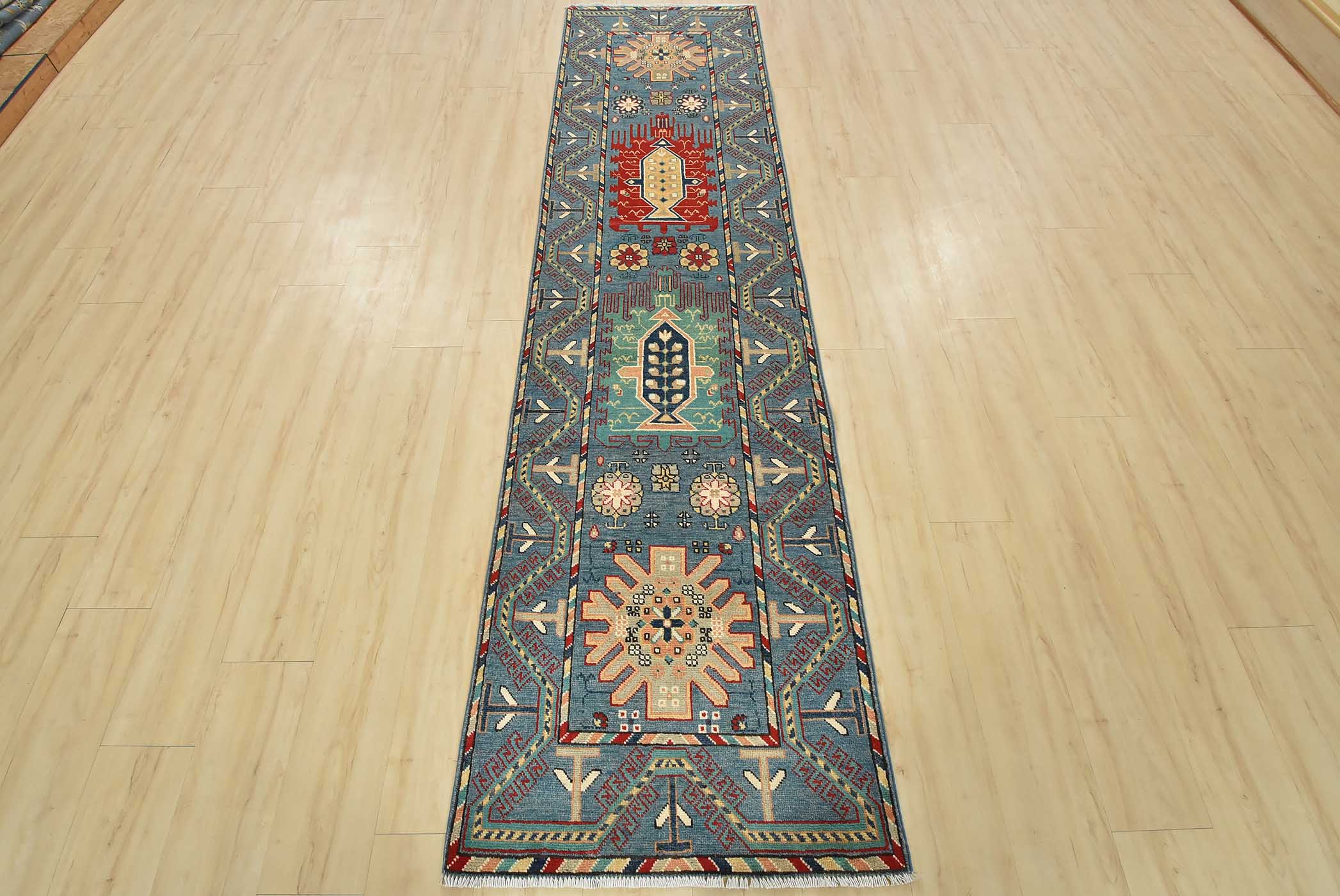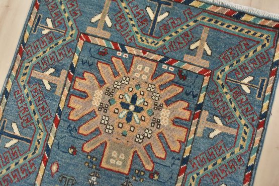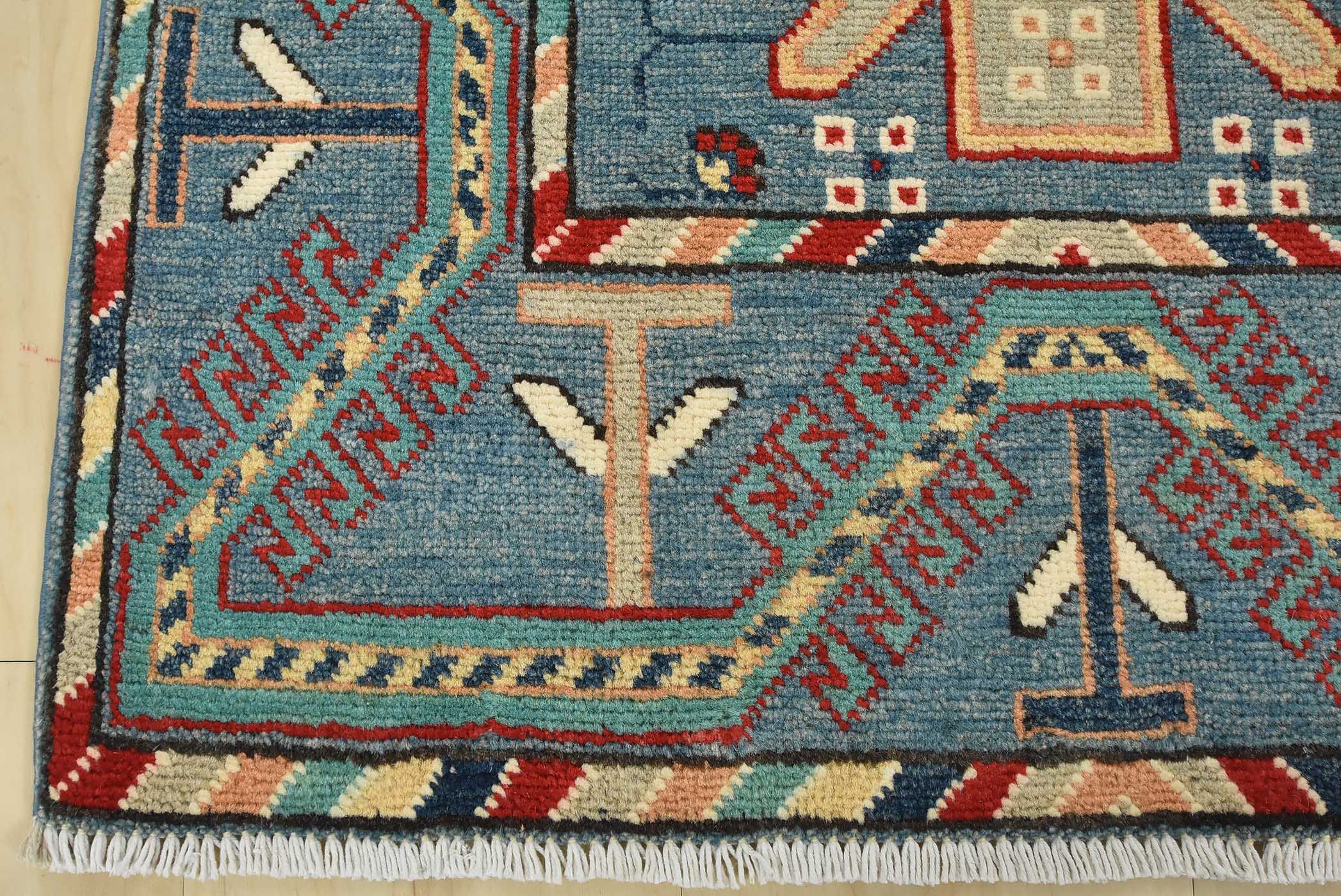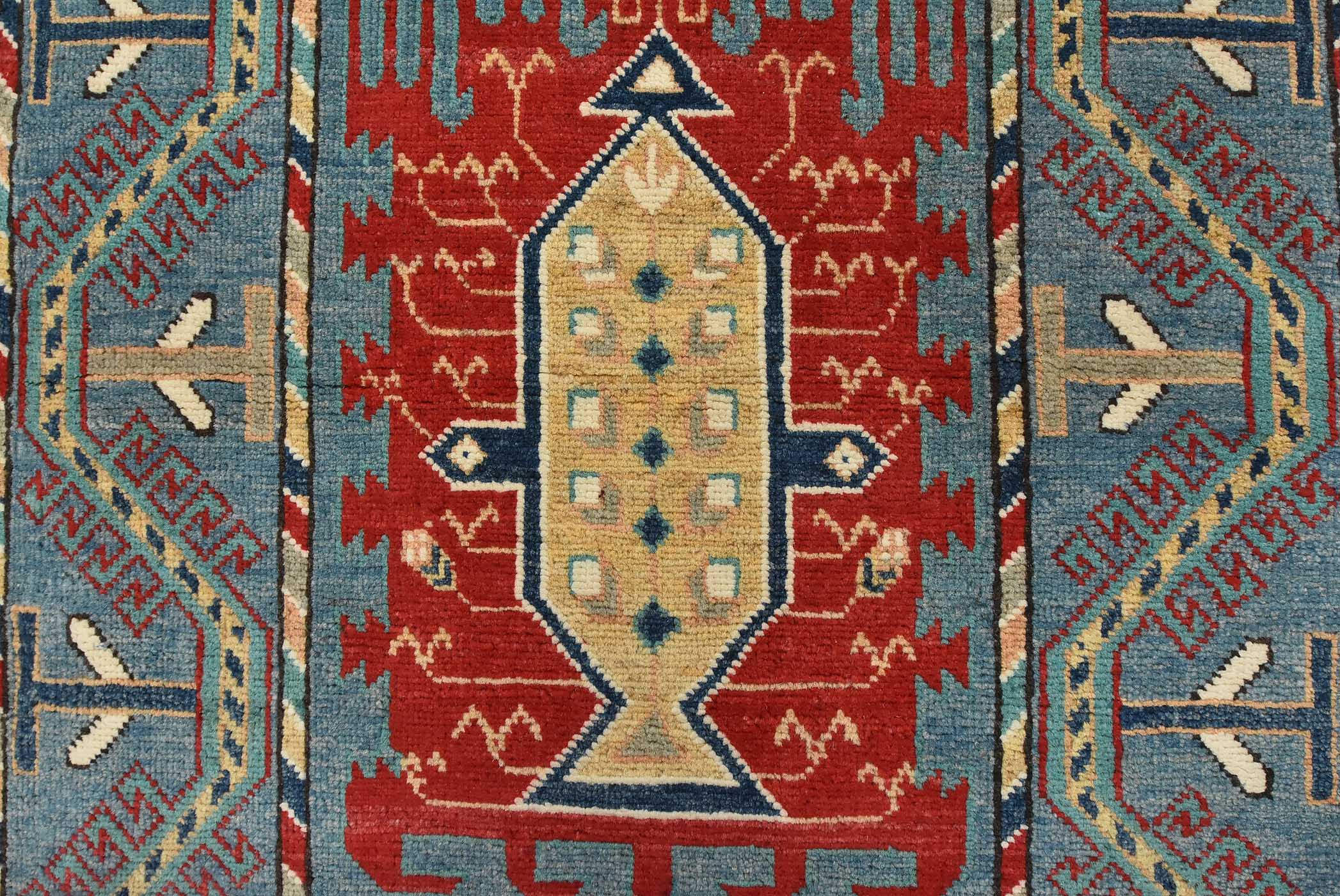 A tribal Caucasian Kazak runner hand-knotted with fine wool on a cotton foundation. This rug features a row of geometric medallions set against a blue background. It is new and in excellent condition.