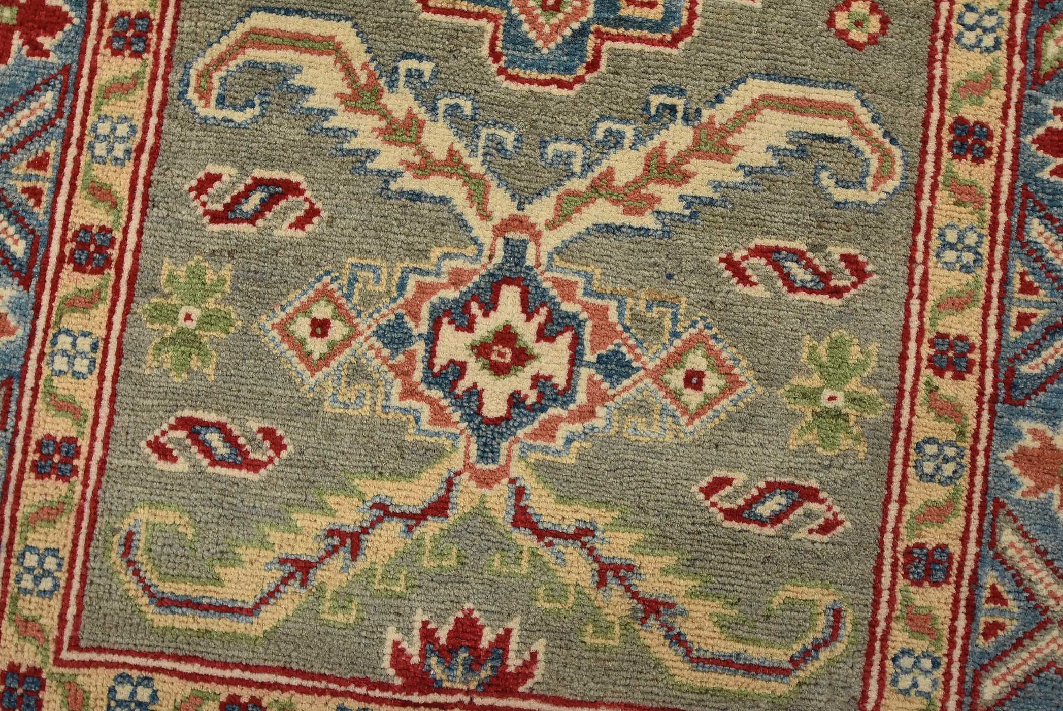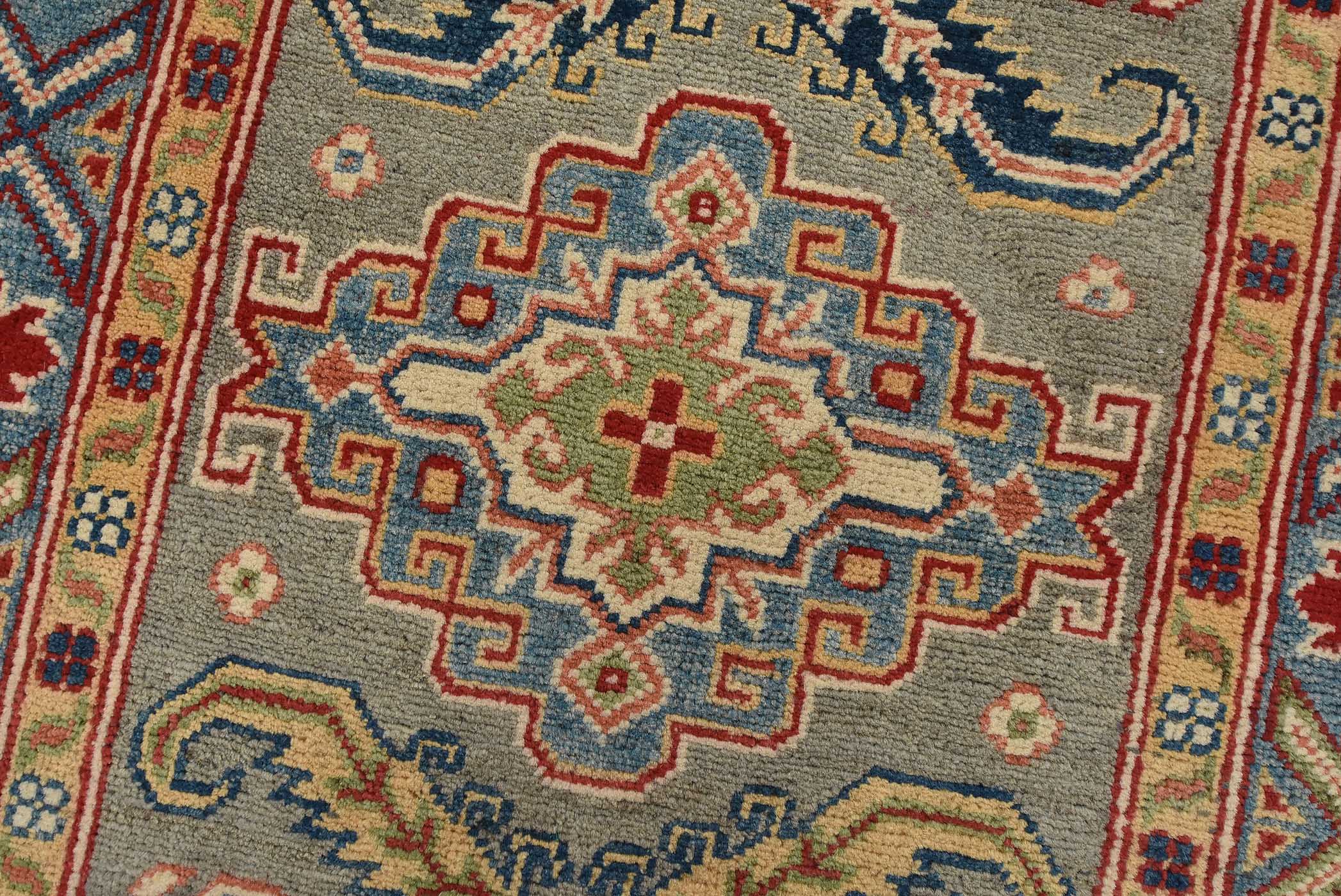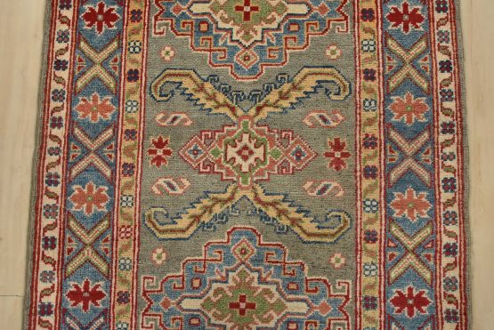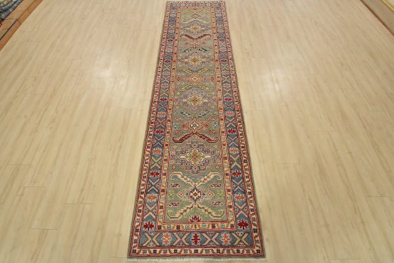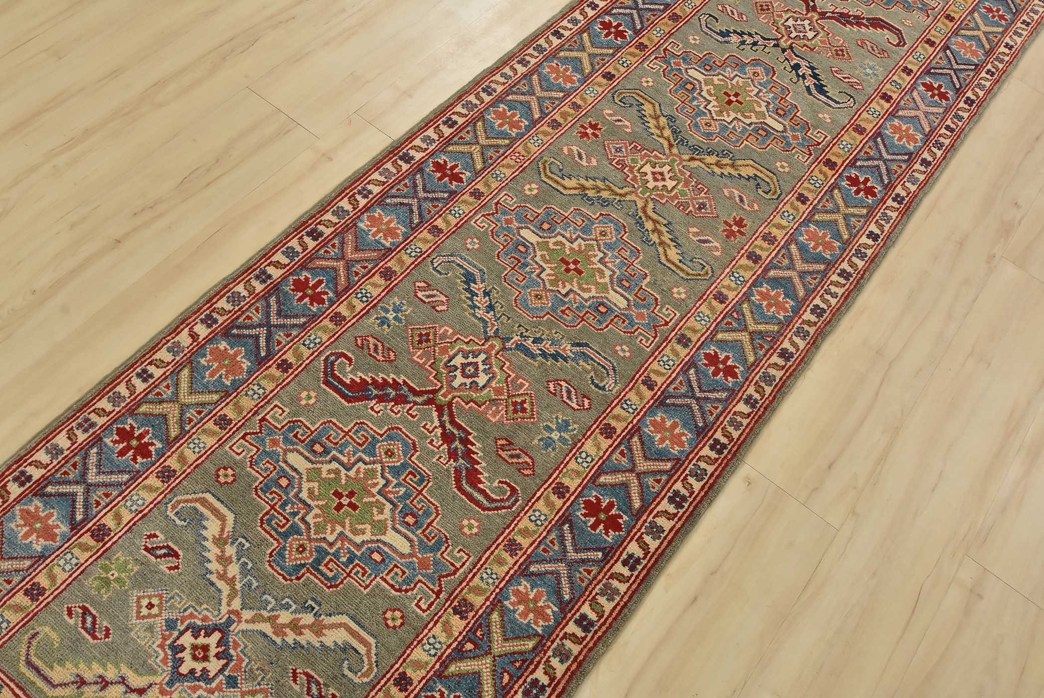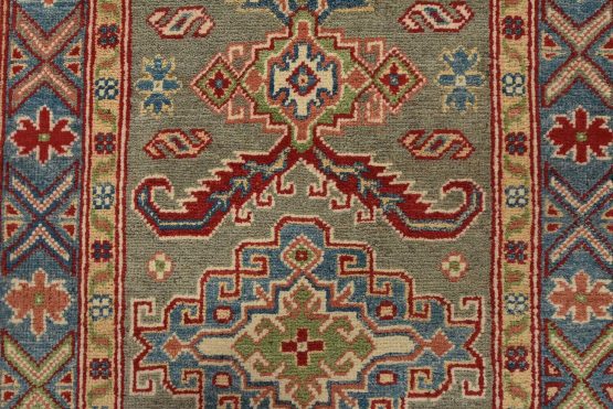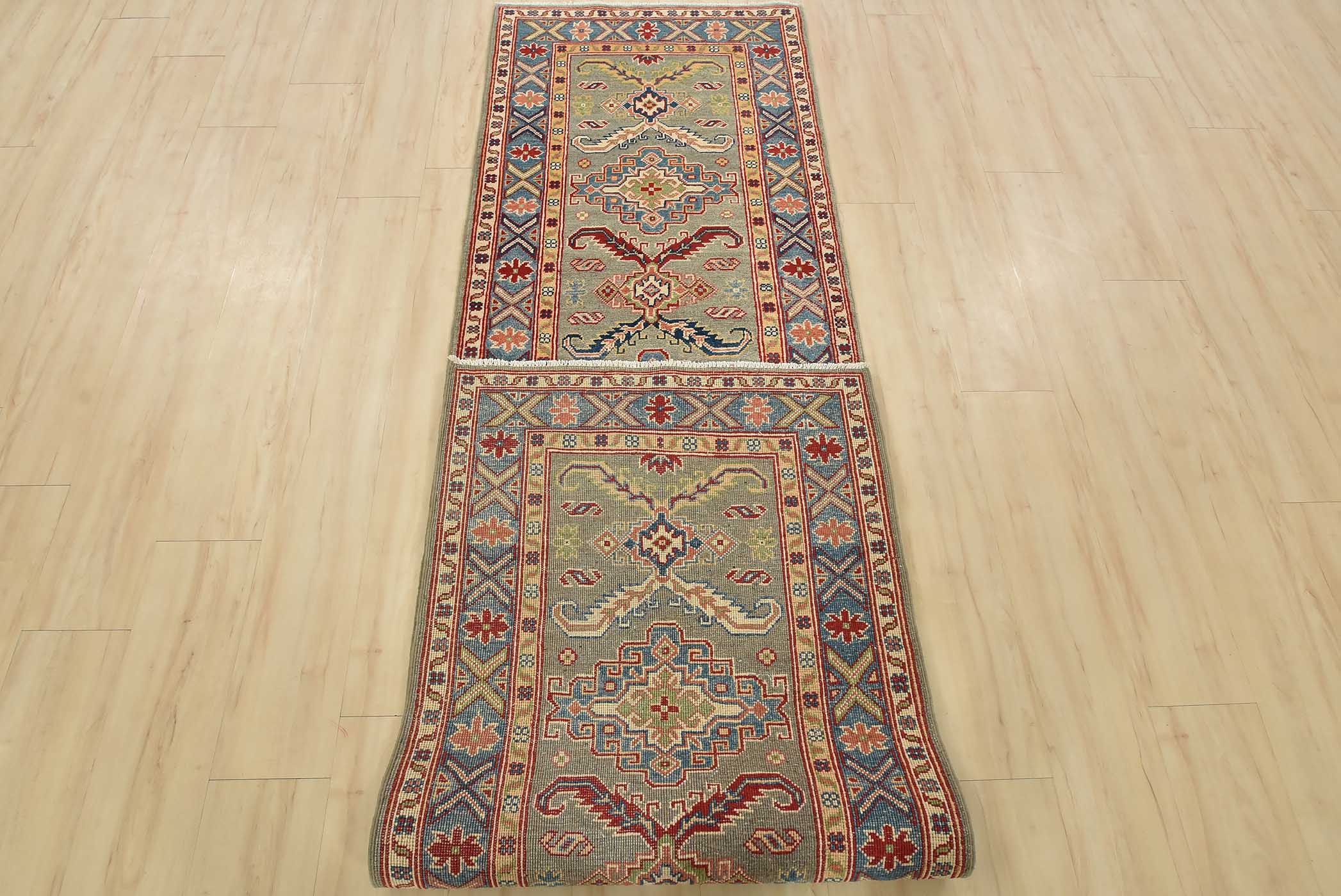 A tribal Caucasian Kazak runner hand-knotted with fine wool on a cotton foundation. This rug features a row of geometric medallions surrounded by small geometric motifs set against a gray background. It is new and in excellent condition.