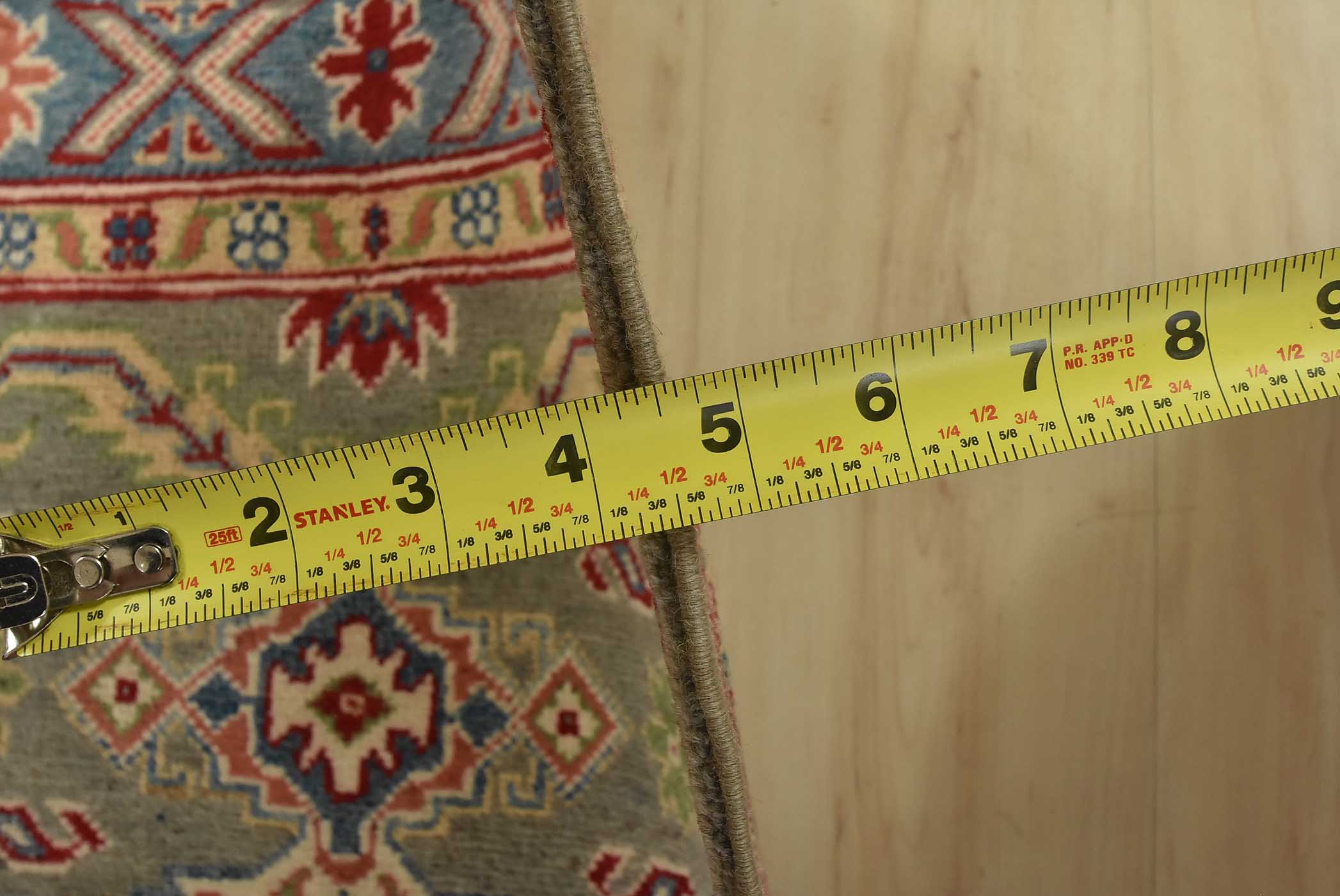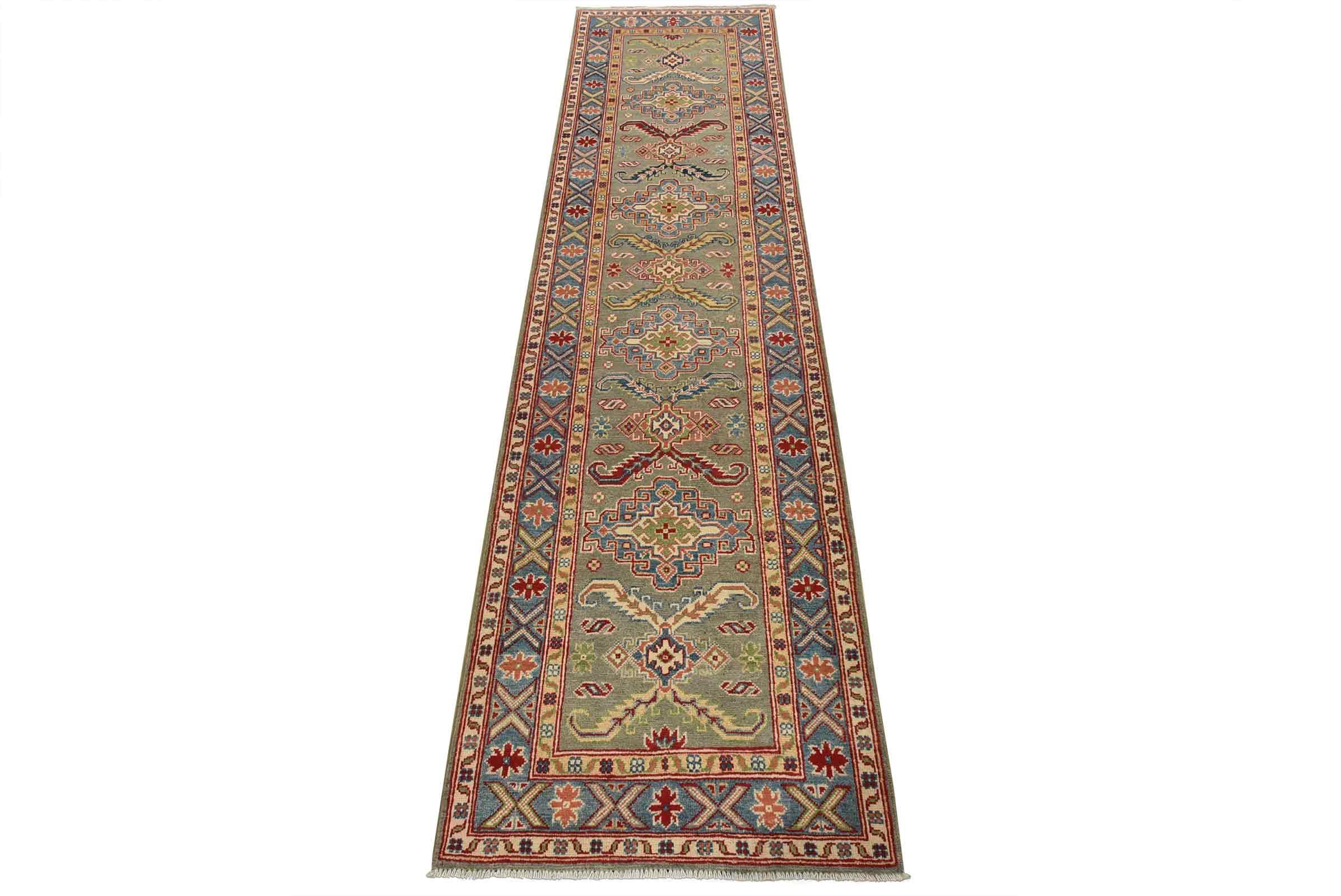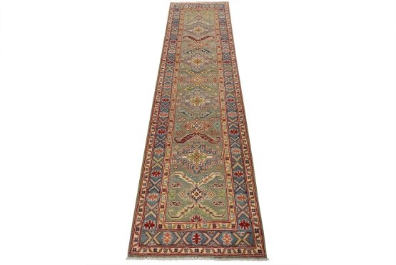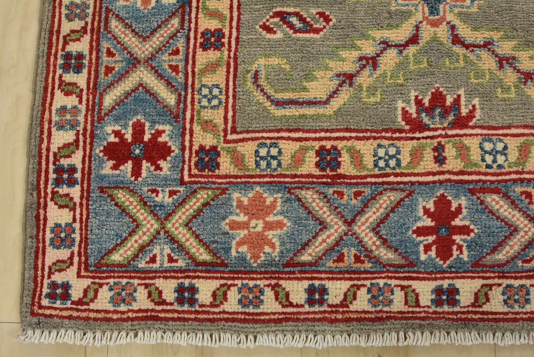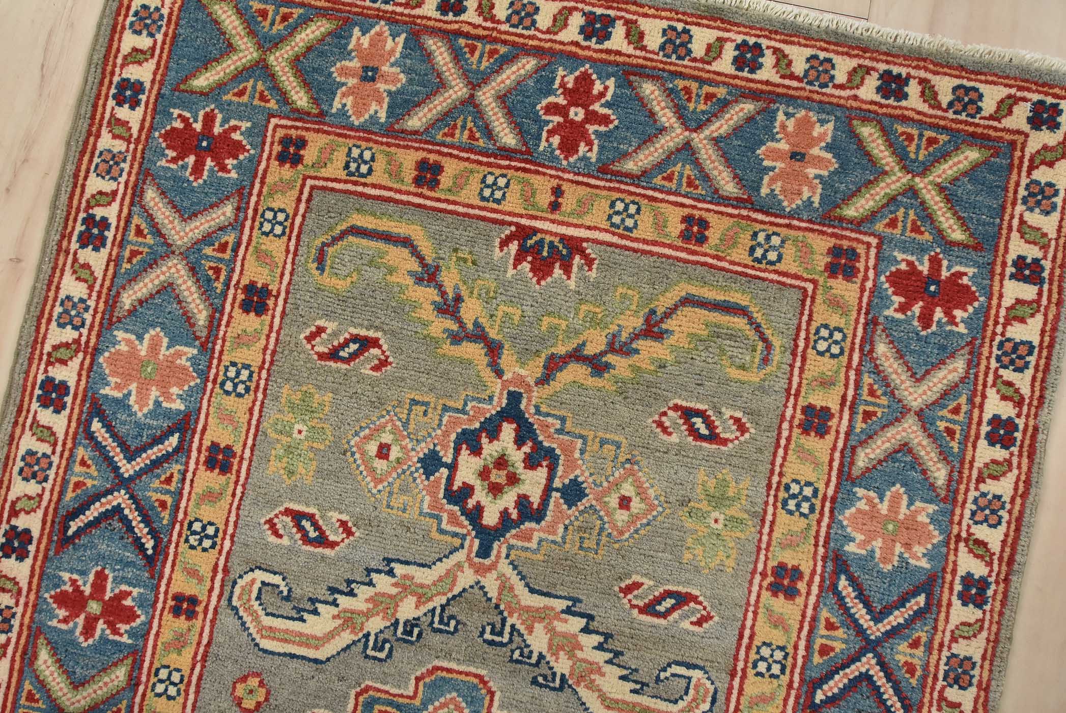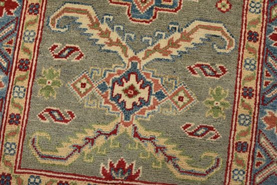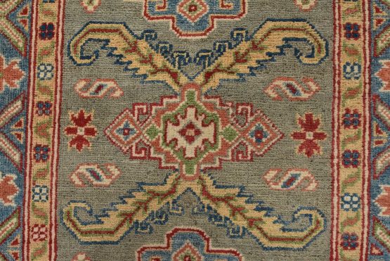 A tribal Caucasian Kazak runner hand-knotted with fine wool on a cotton foundation. This rug features a row of geometric medallions surrounded by small geometric motifs set against a gray background. It is new and in excellent condition.