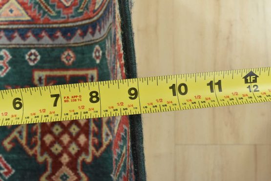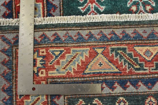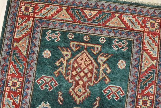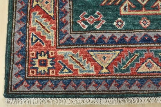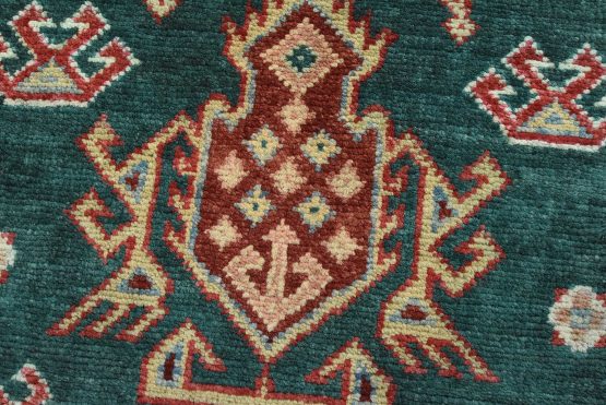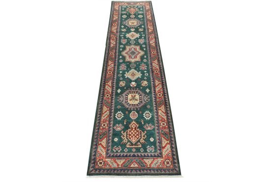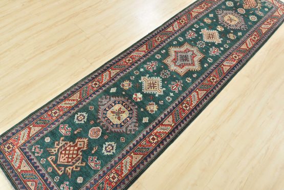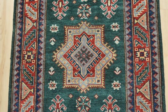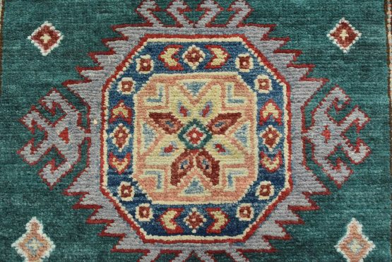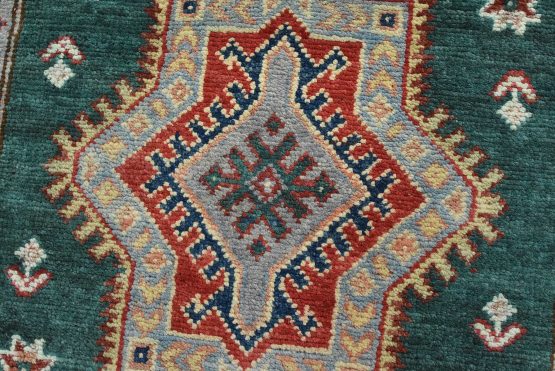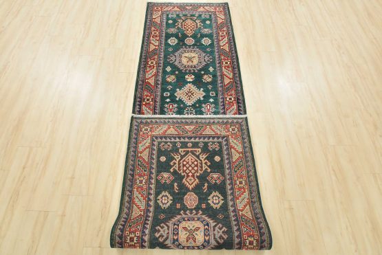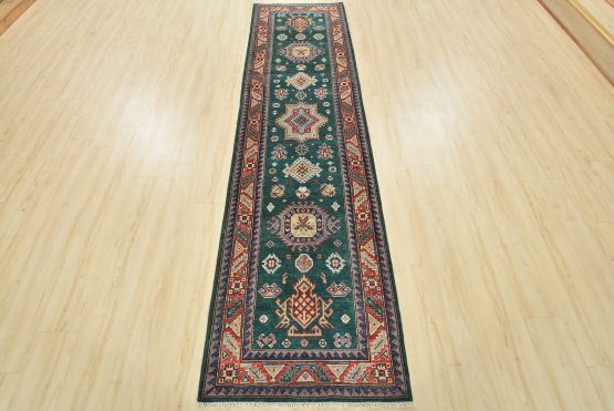 A tribal Caucasian Kazak runner hand-knotted with an all-wool pile on a cotton foundation. This oriental rug features geometric medallions surrounded by geometric motifs set against a green background. It is new and in excellent condition.
