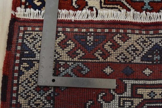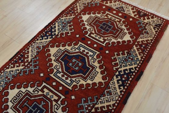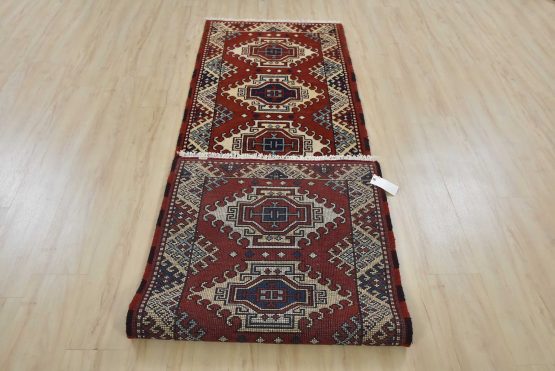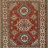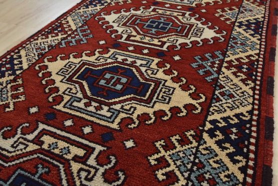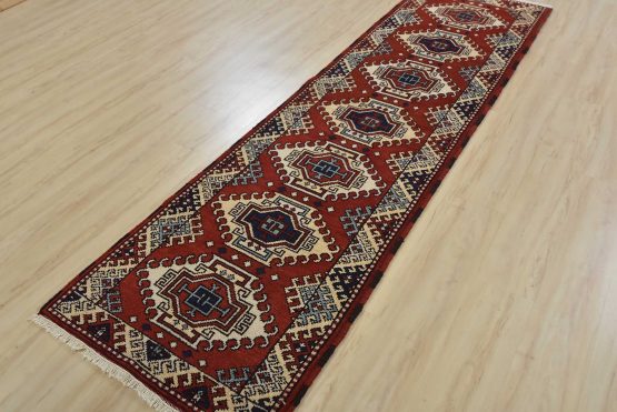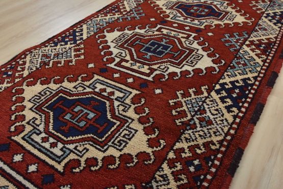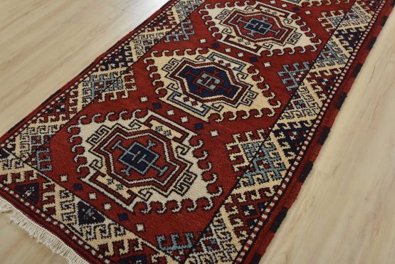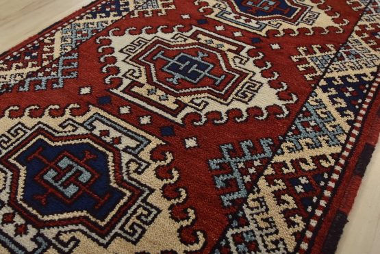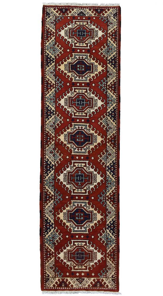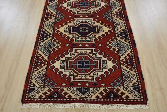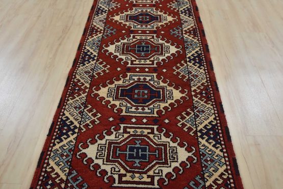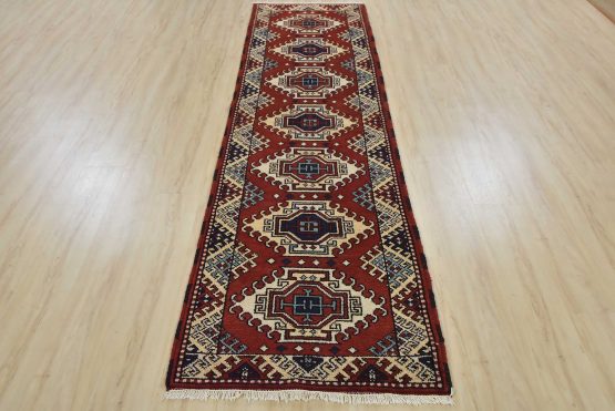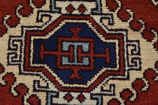 A tribal Caucasian Kazak runner hand-knotted with an all-wool pile on a cotton foundation. This oriental rug features rows of geometric medallions set against a red background. It is new and in excellent condition.