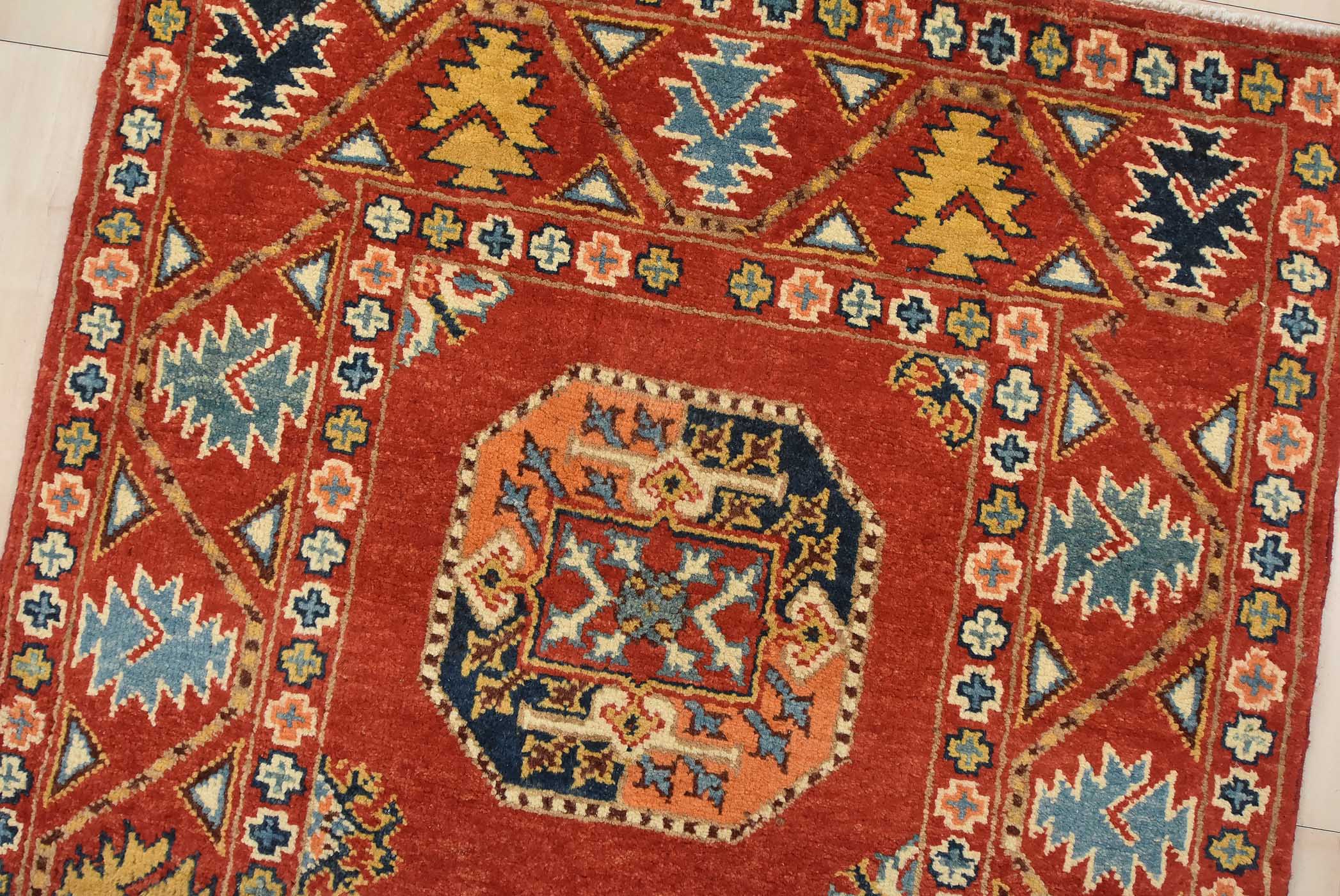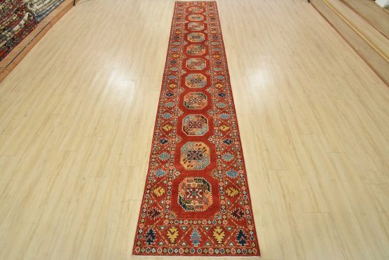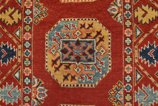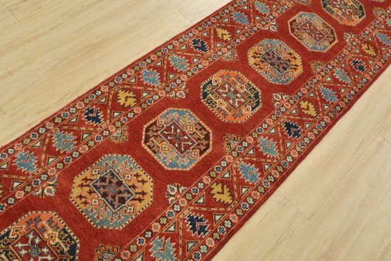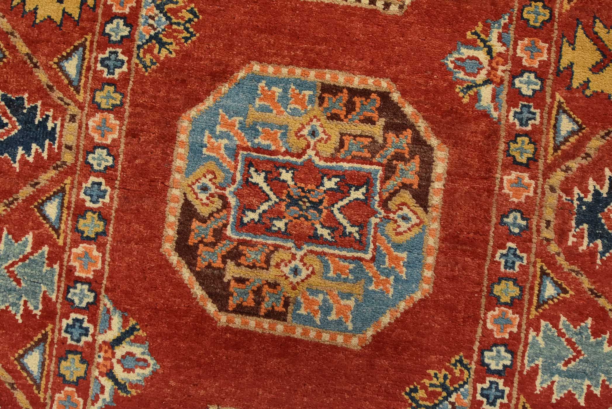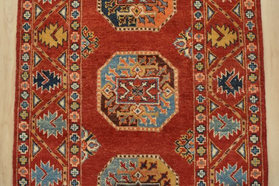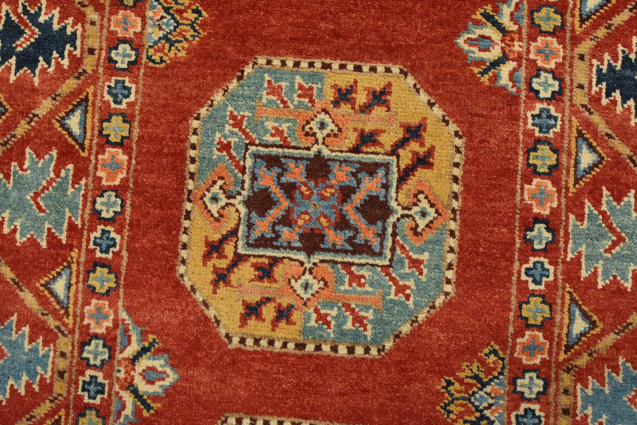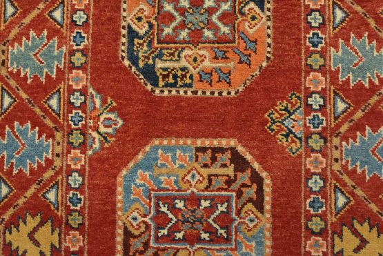 A tribal Caucasian Kazak runner hand-knotted with fine wool on a cotton foundation. This rug features a row of geometric medallions set against a red background. It is new and in excellent condition.