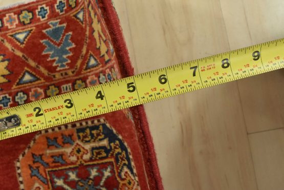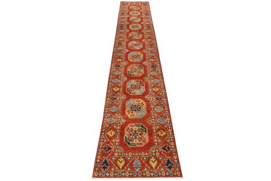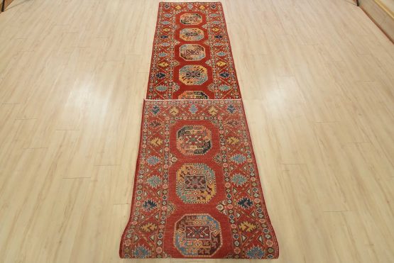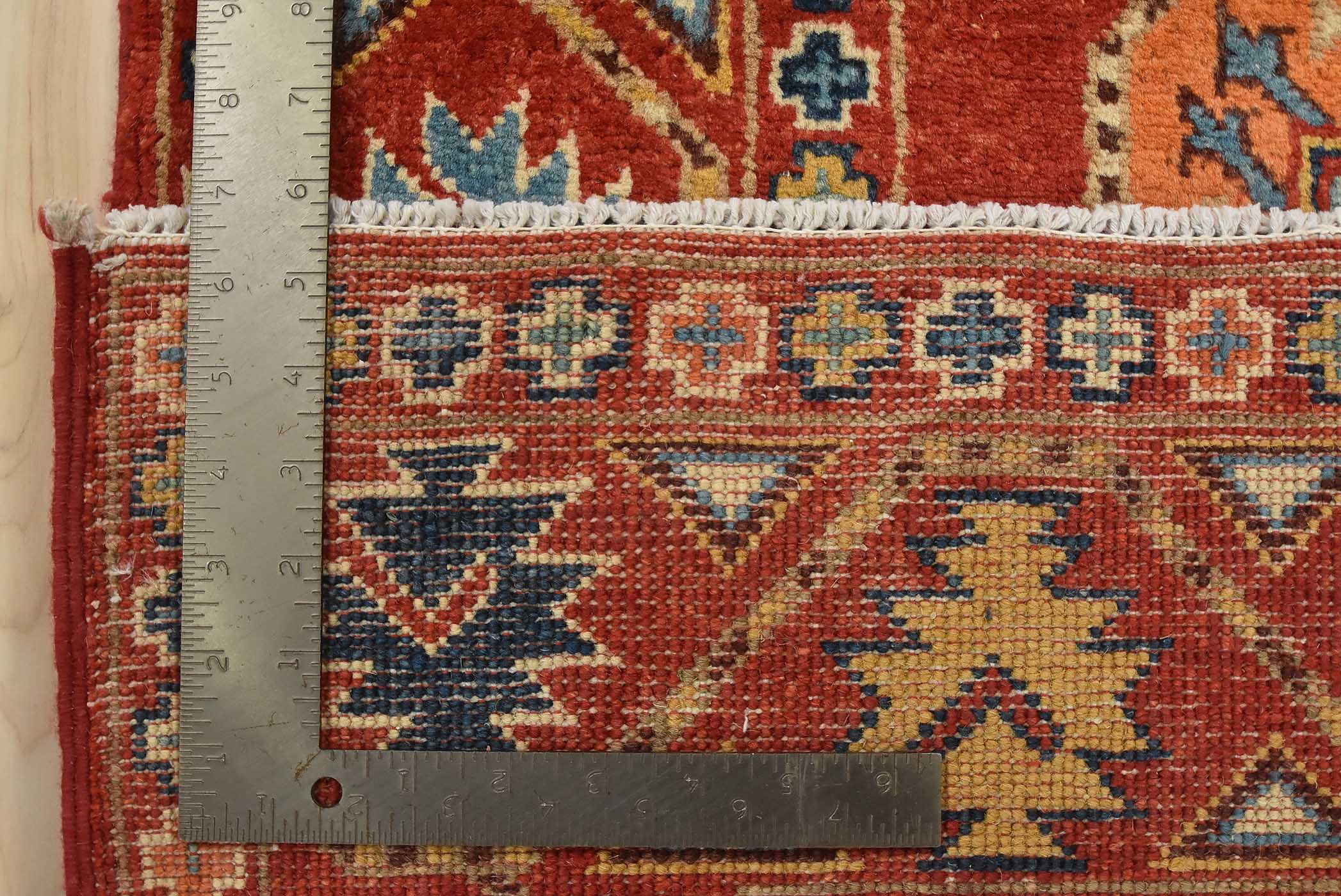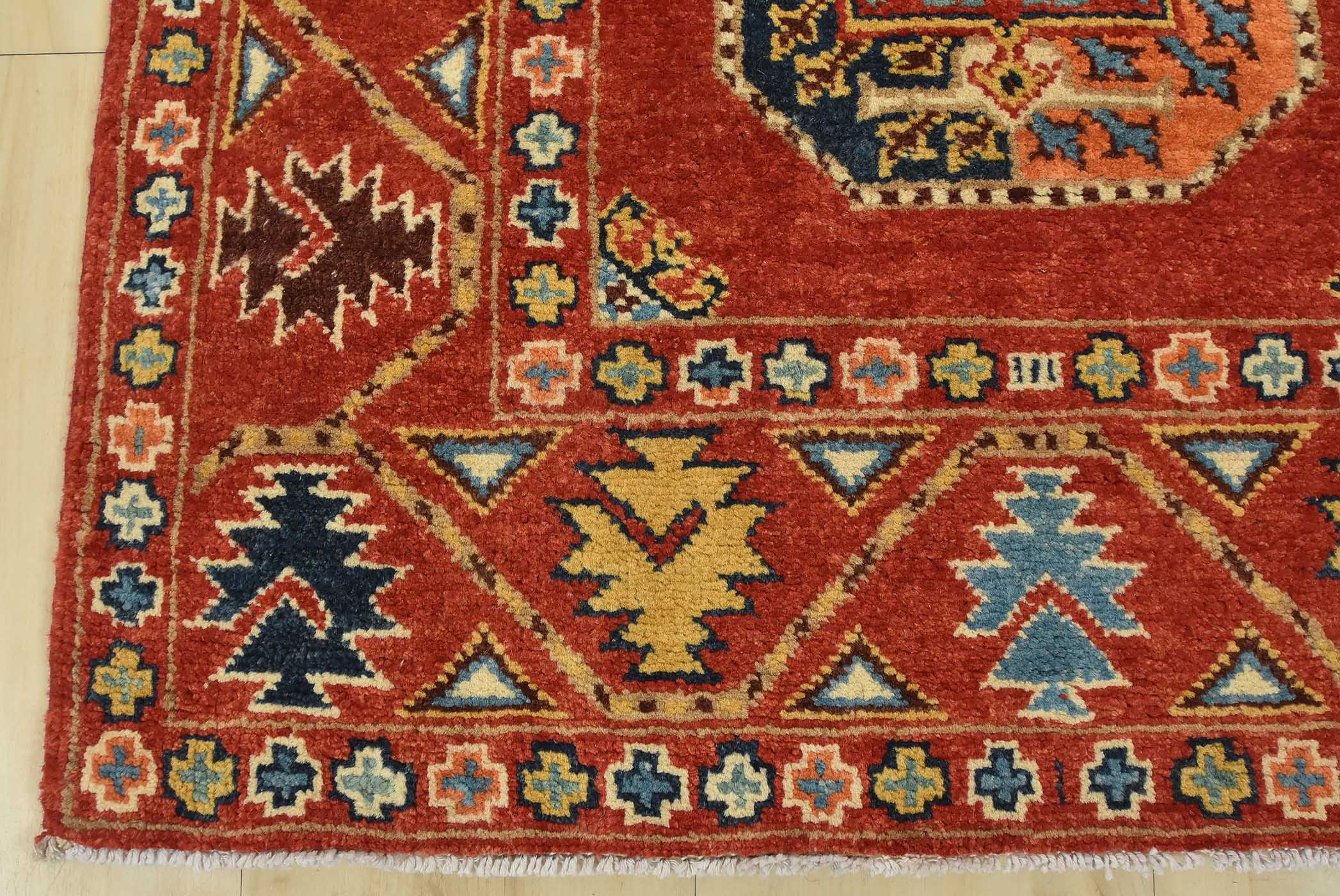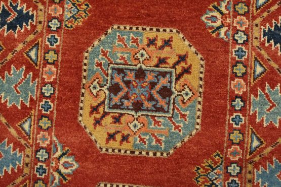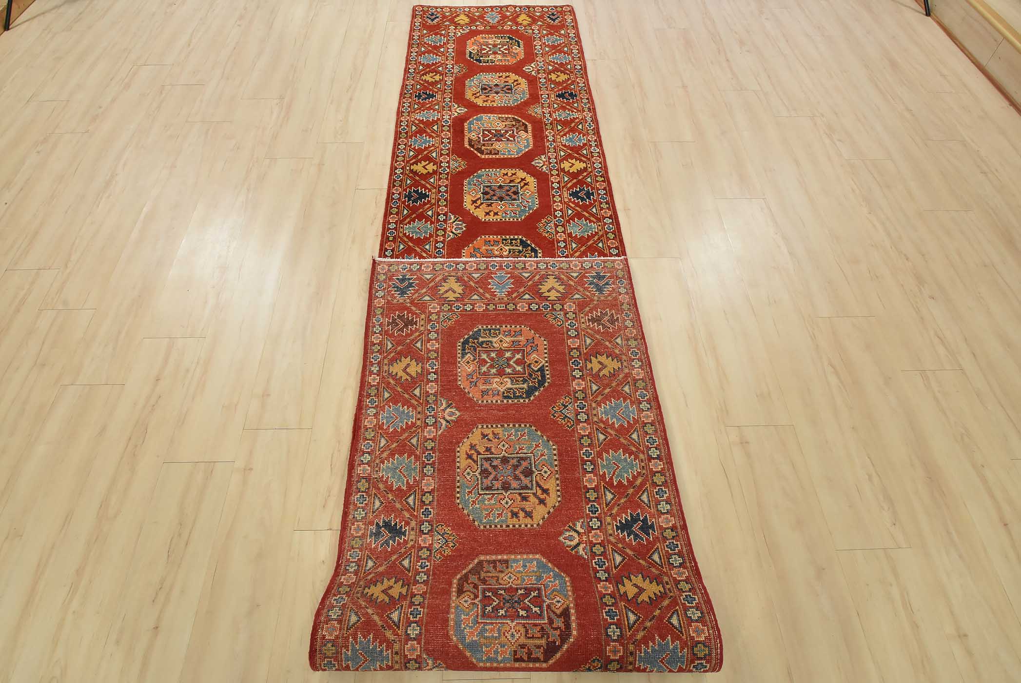 A tribal Caucasian Kazak runner hand-knotted with fine wool on a cotton foundation. This rug features a row of geometric medallions set against a red background. It is new and in excellent condition.