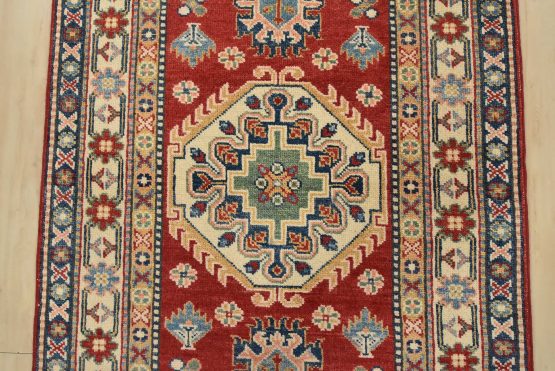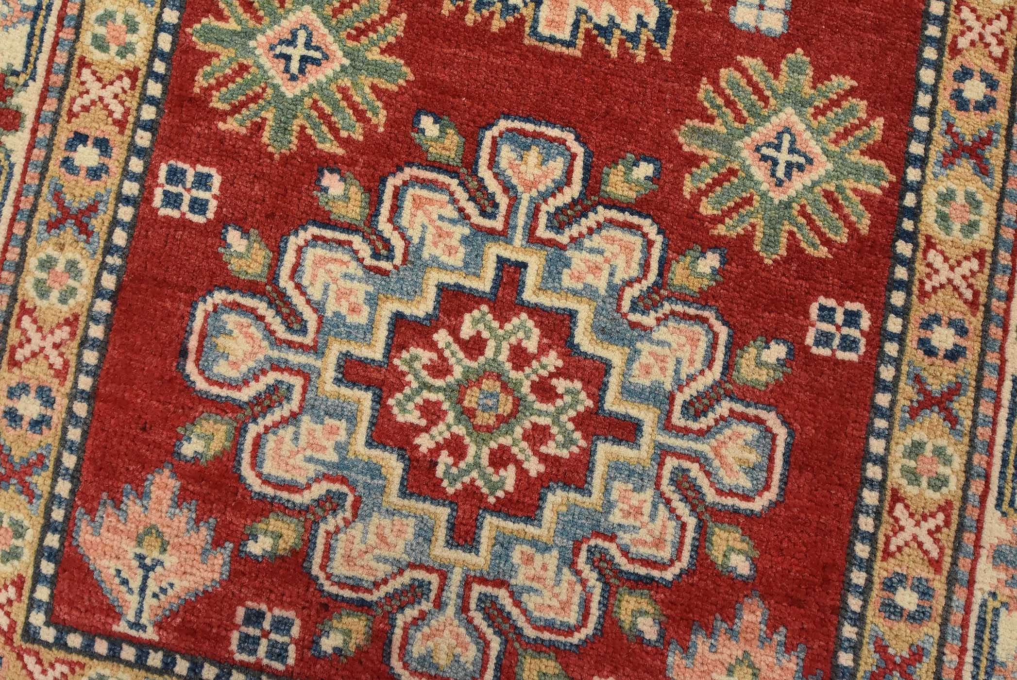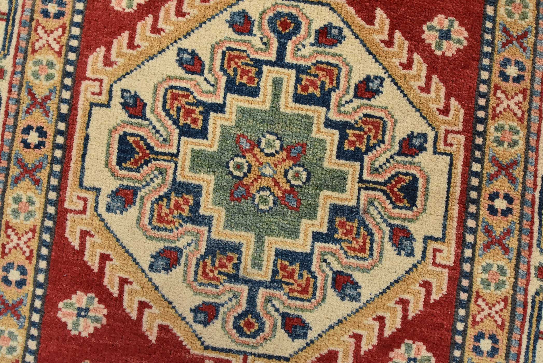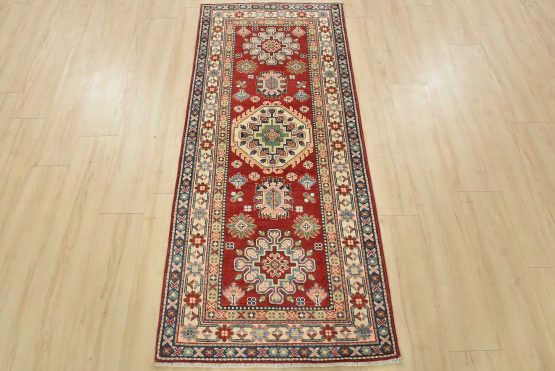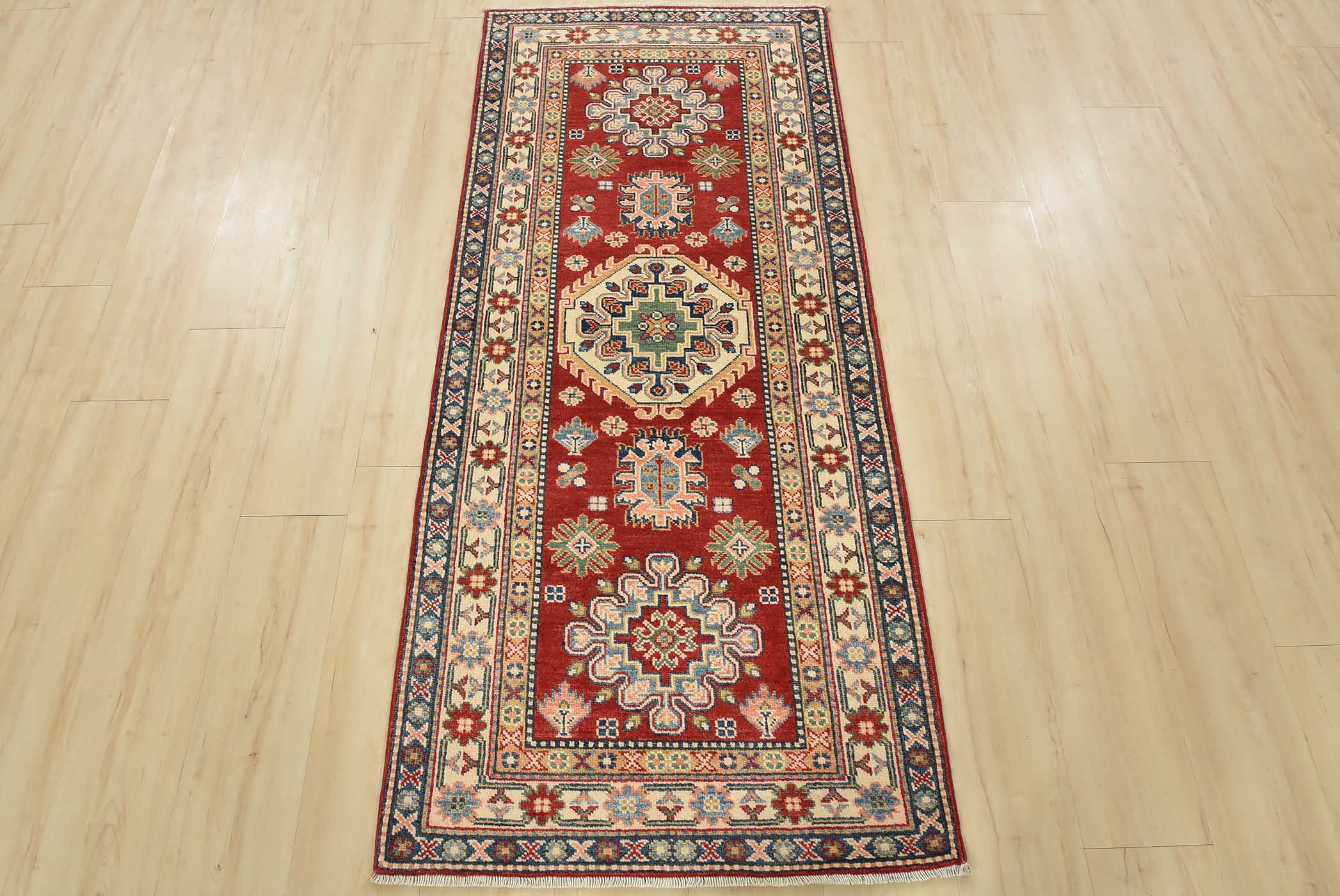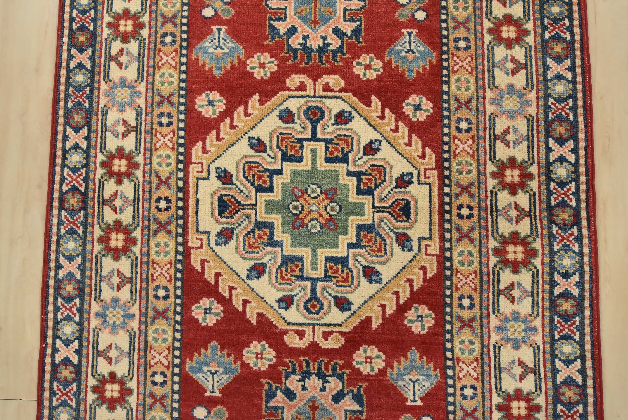A tribal Caucasian Kazak runner hand-knotted with fine wool on a cotton foundation. This rug has geometric medallions surrounded by small geometric motifs set against a red background. It is new and in excellent condition.
