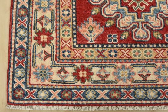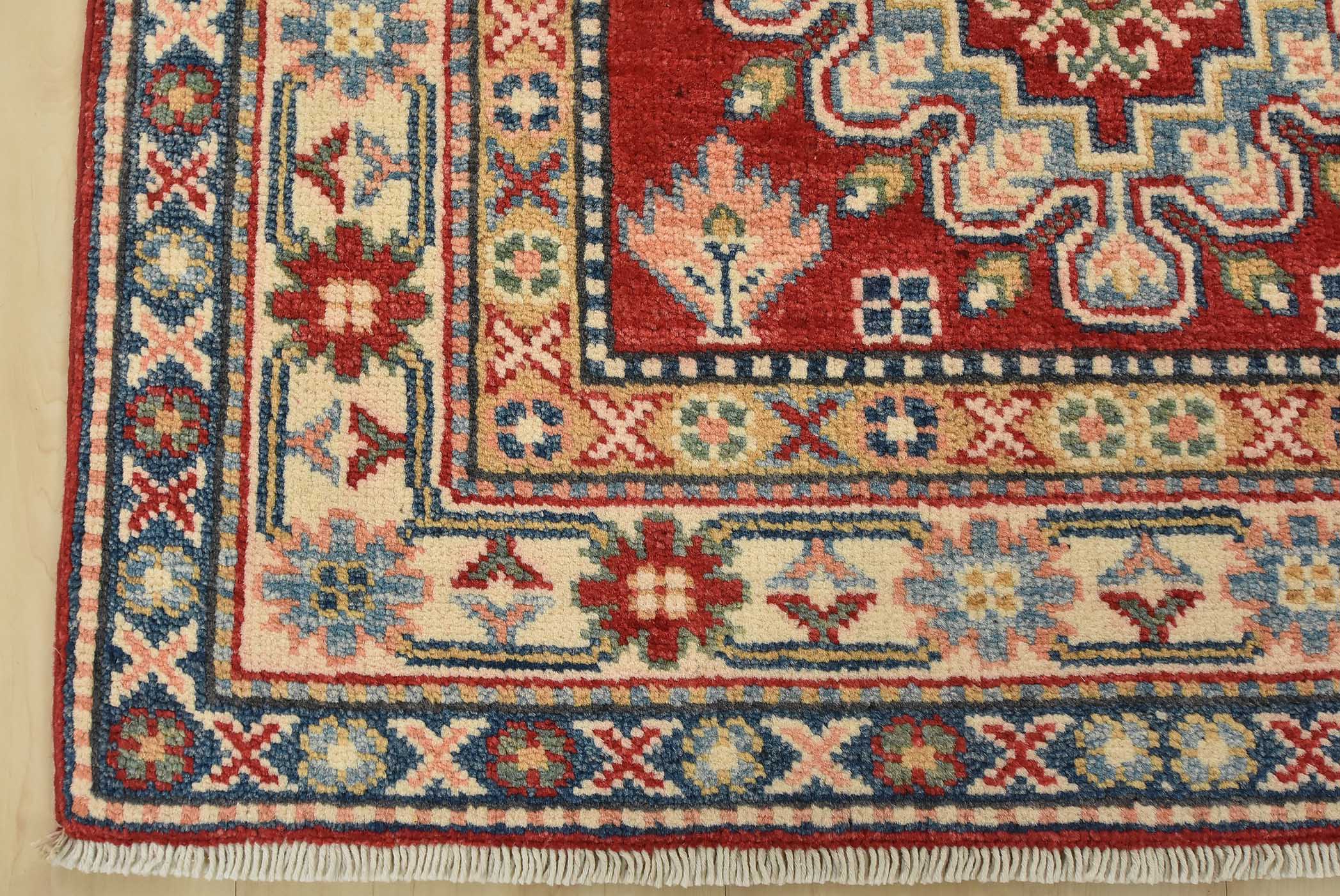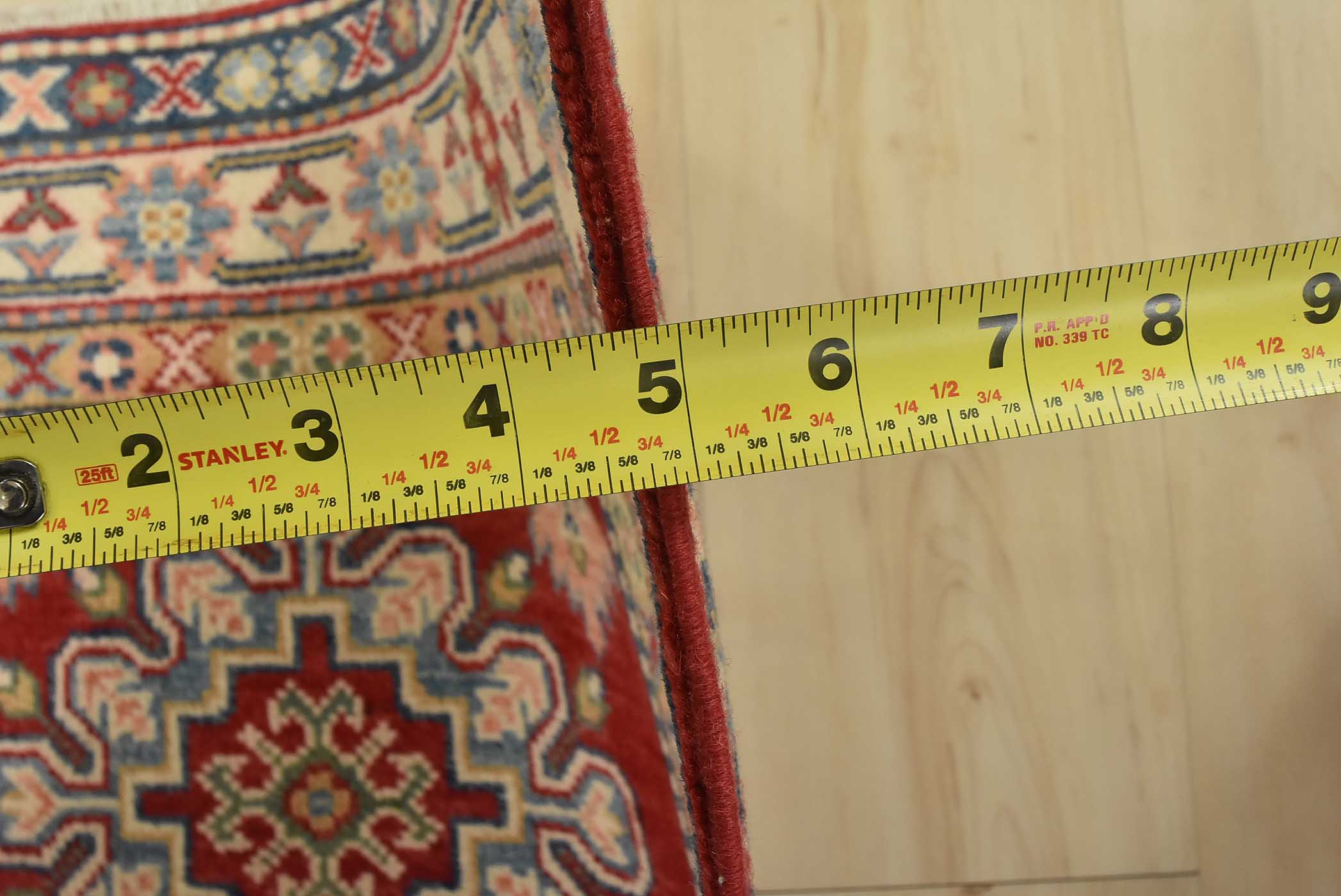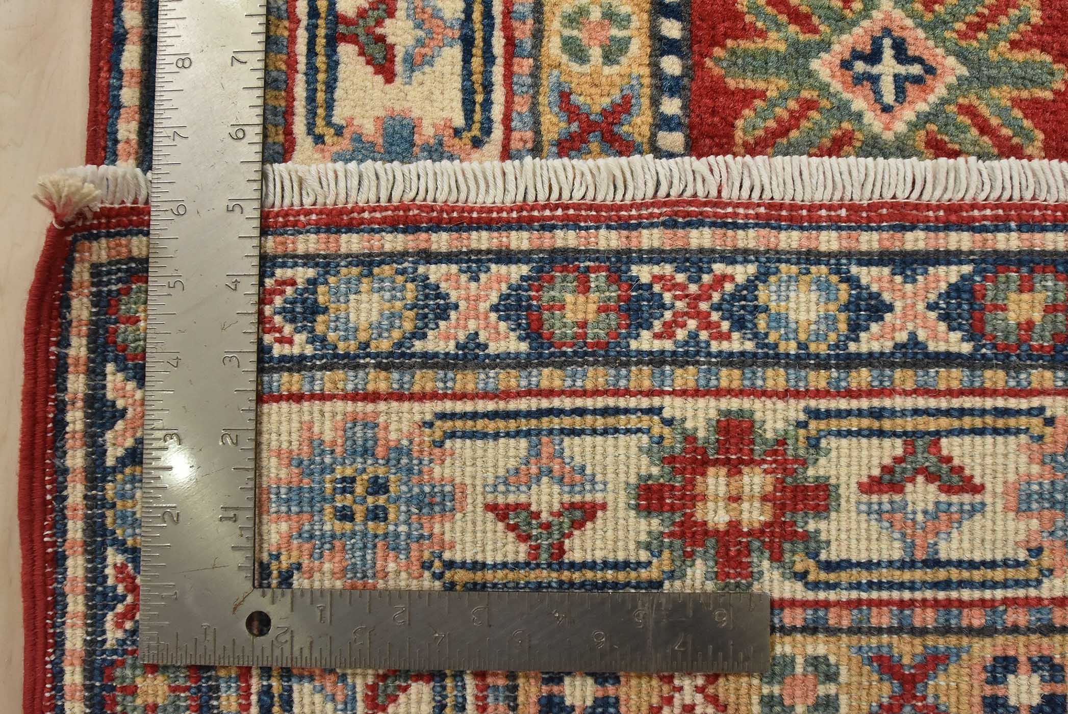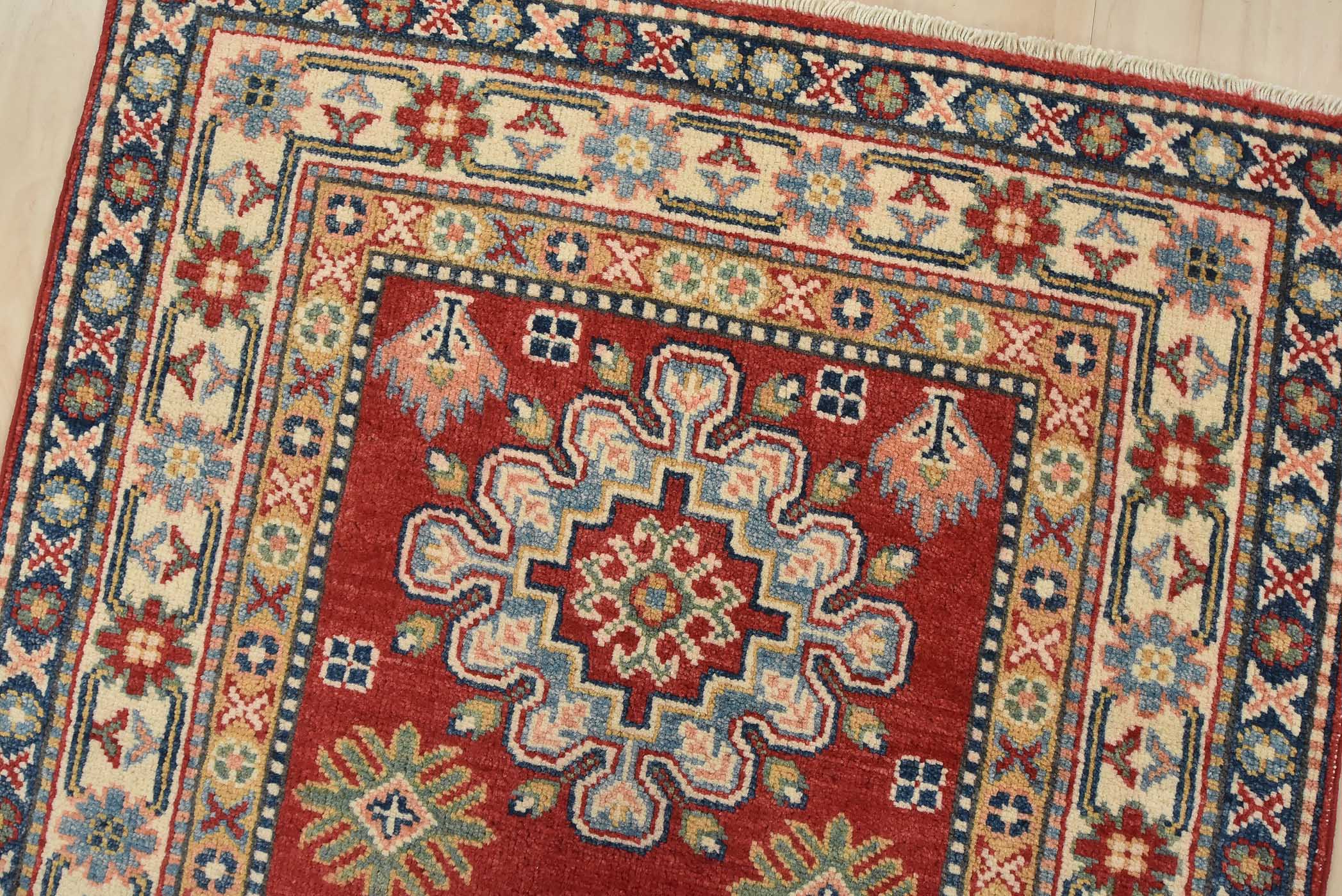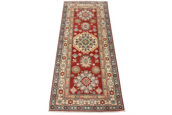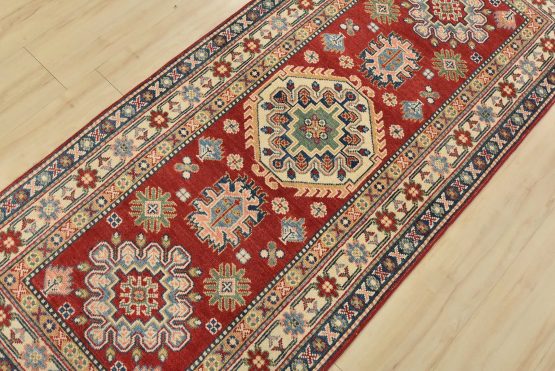 A tribal Caucasian Kazak runner hand-knotted with fine wool on a cotton foundation. This rug has geometric medallions surrounded by small geometric motifs set against a red background. It is new and in excellent condition.