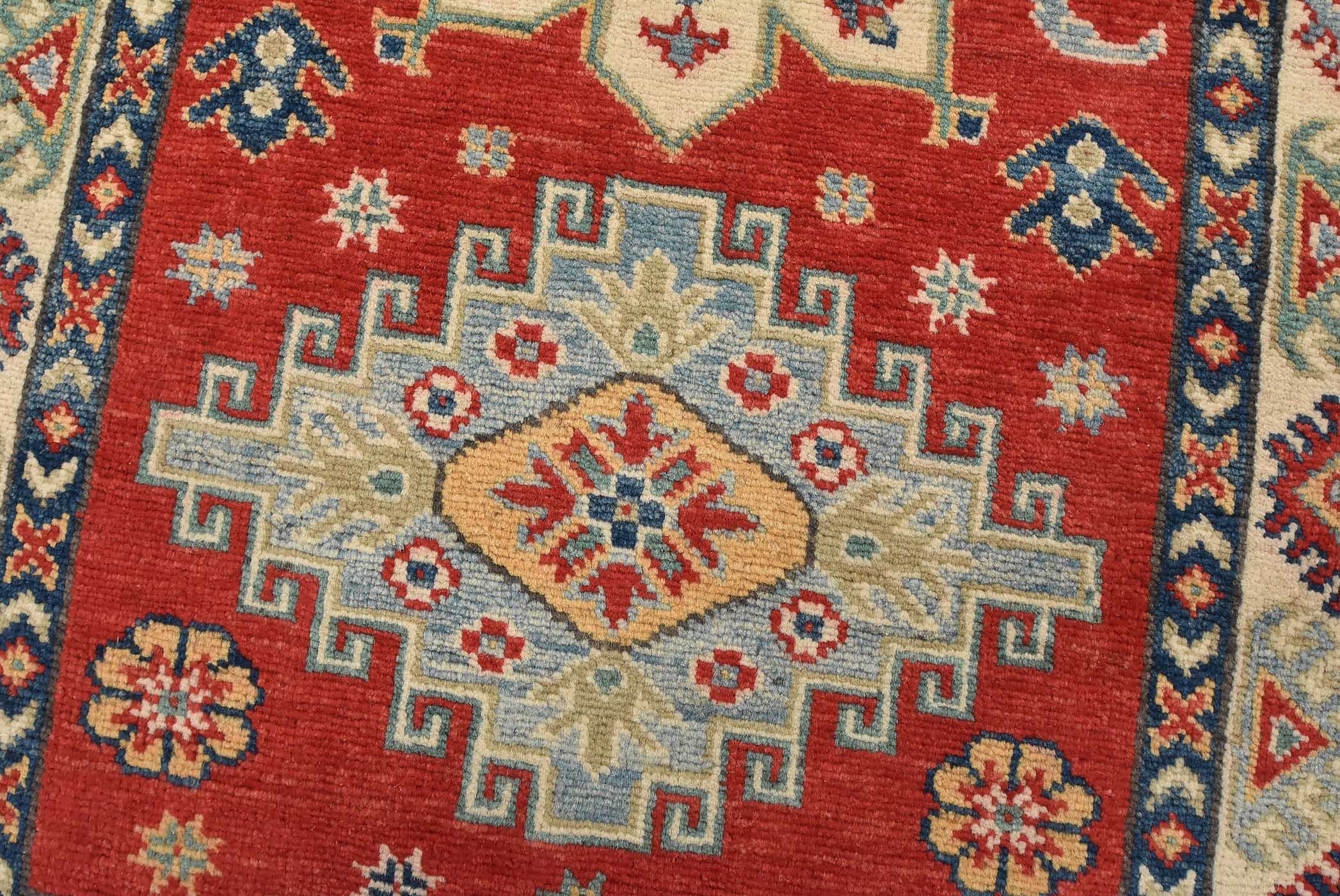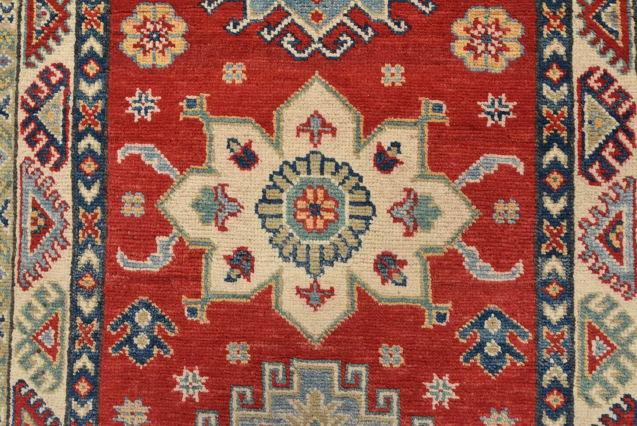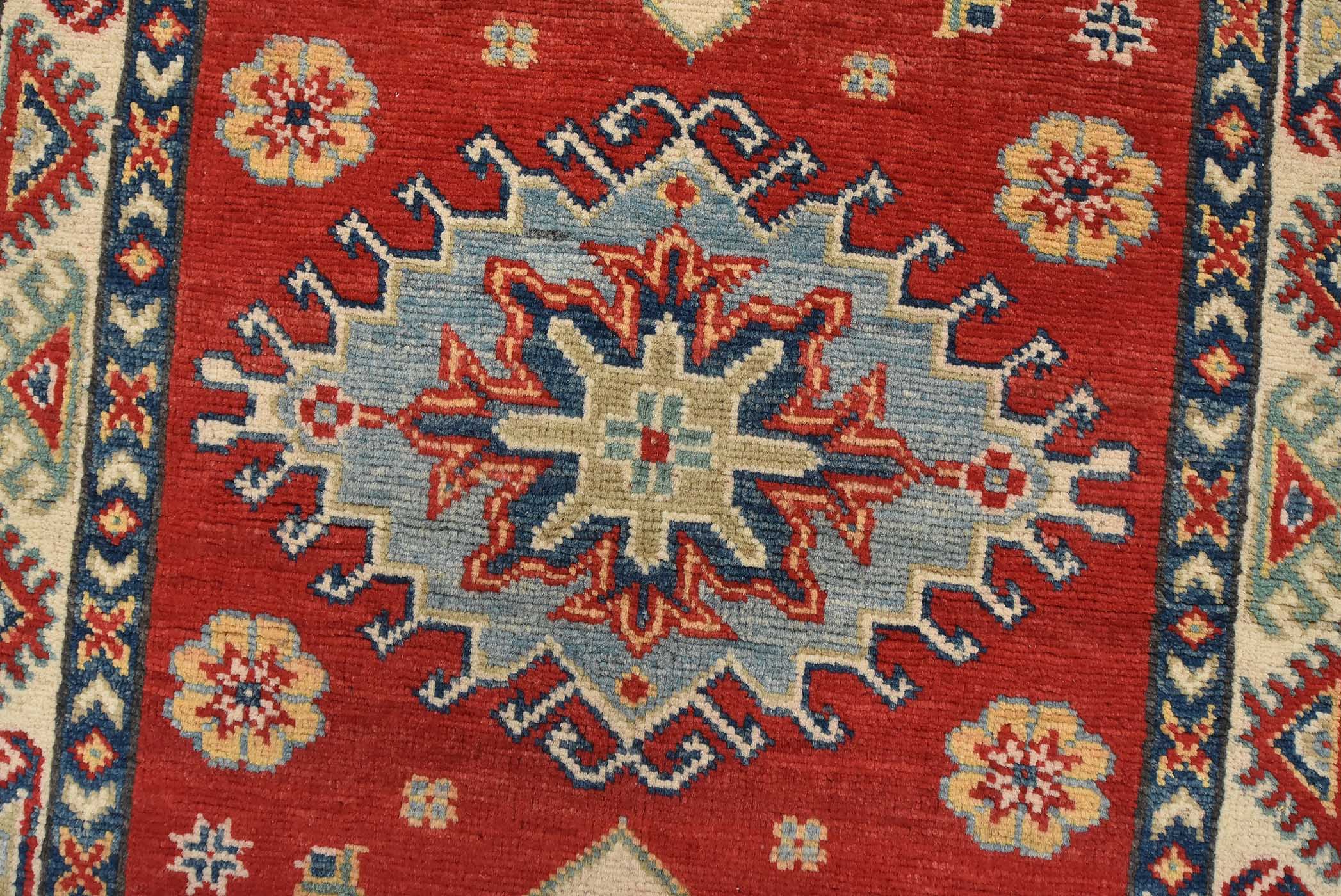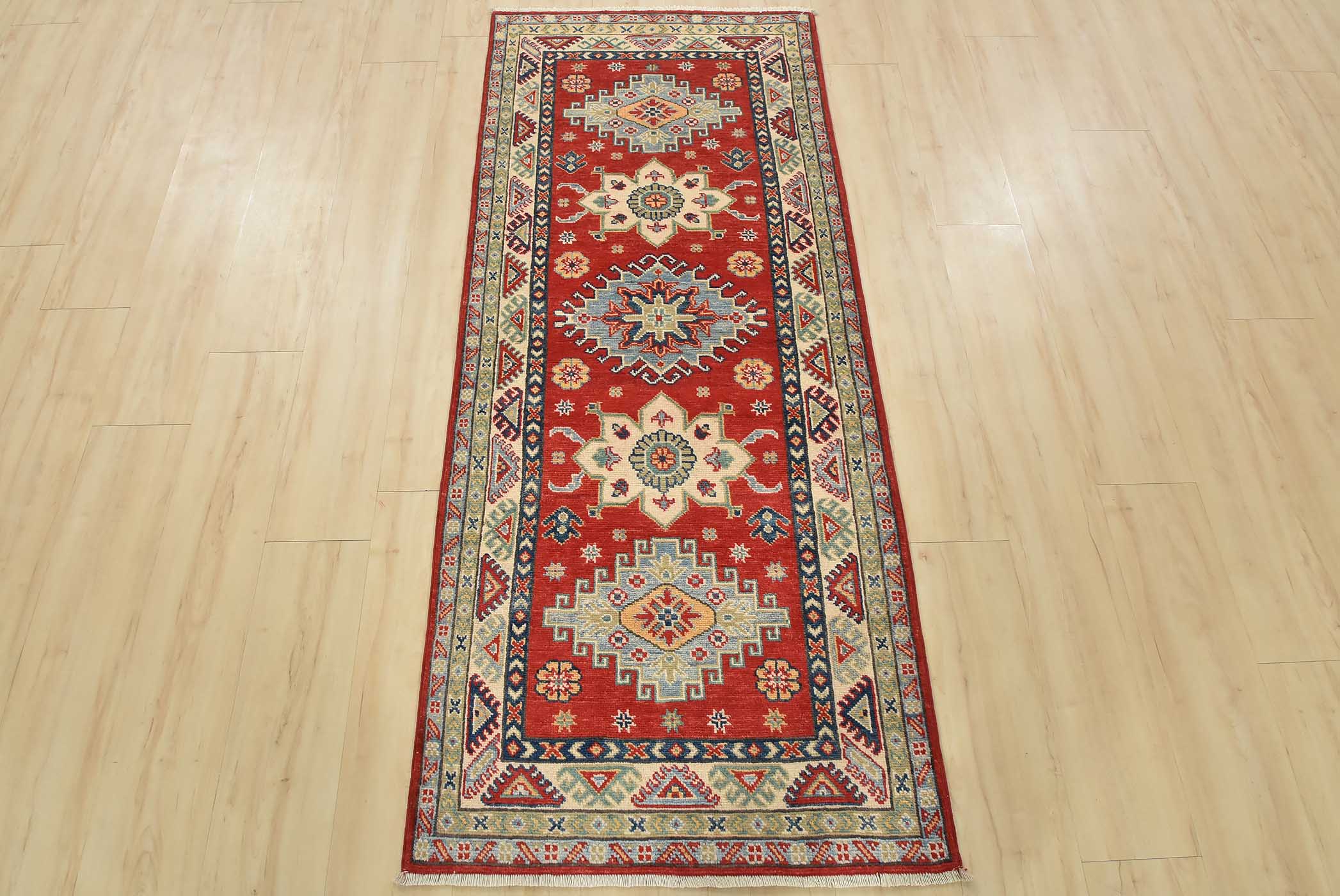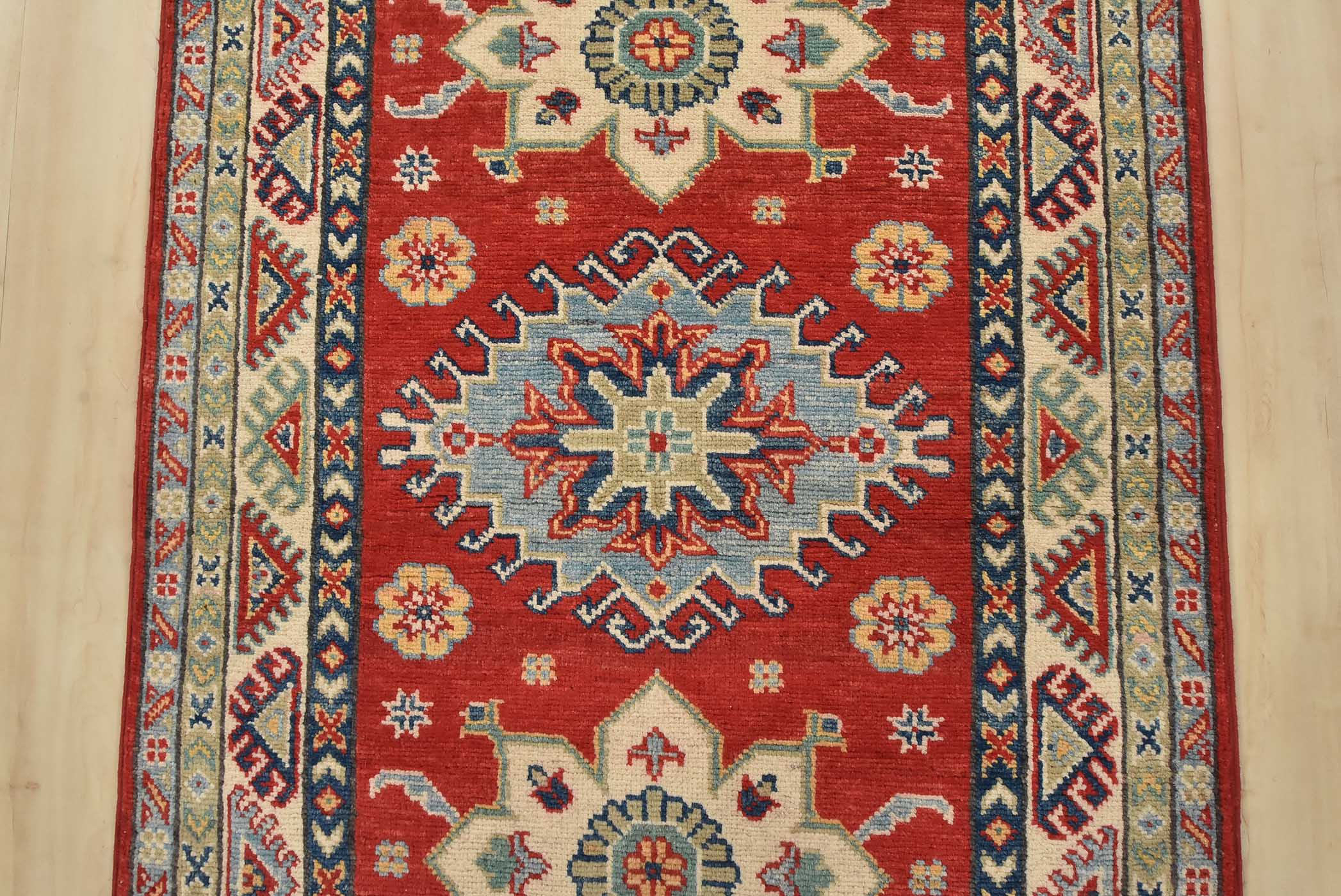 A tribal Caucasian Kazak runner hand-knotted with fine wool on a cotton foundation. This rug features a row of geometric medallions surrounded by small motifs set against a red background. It is new and in excellent condition.