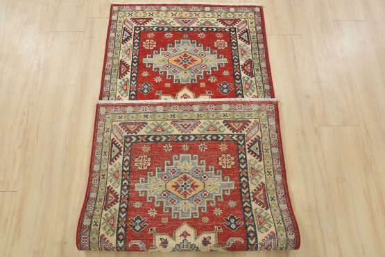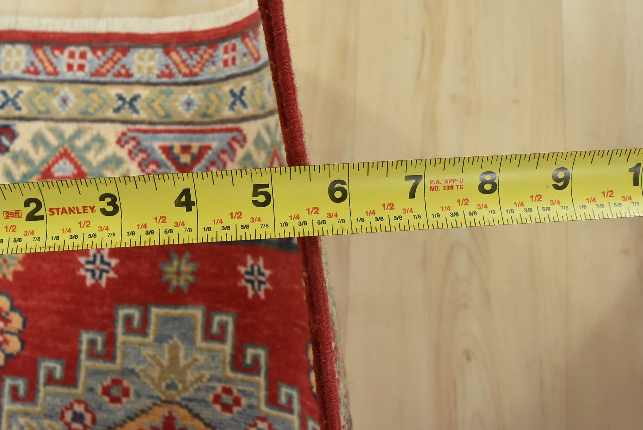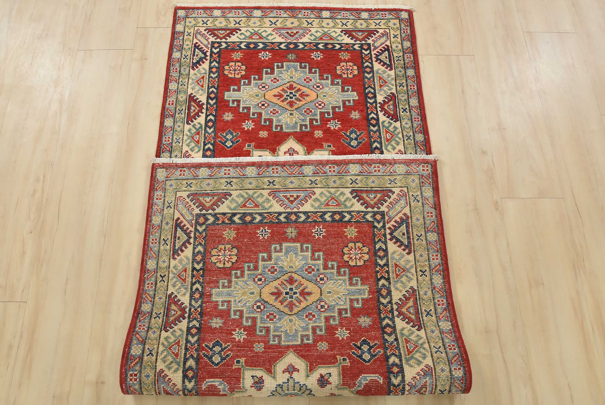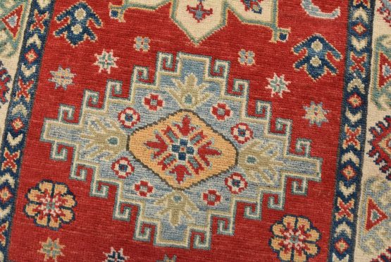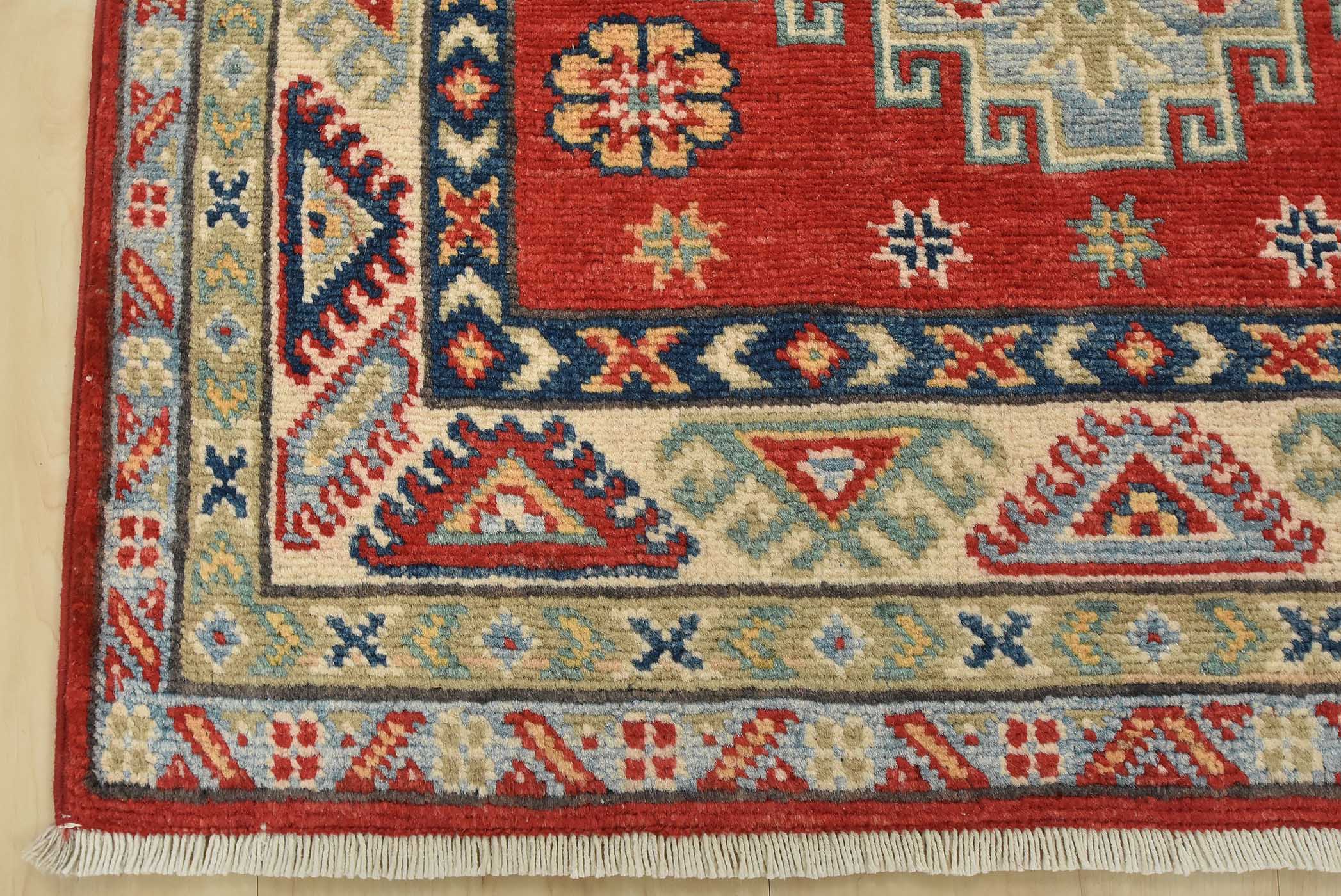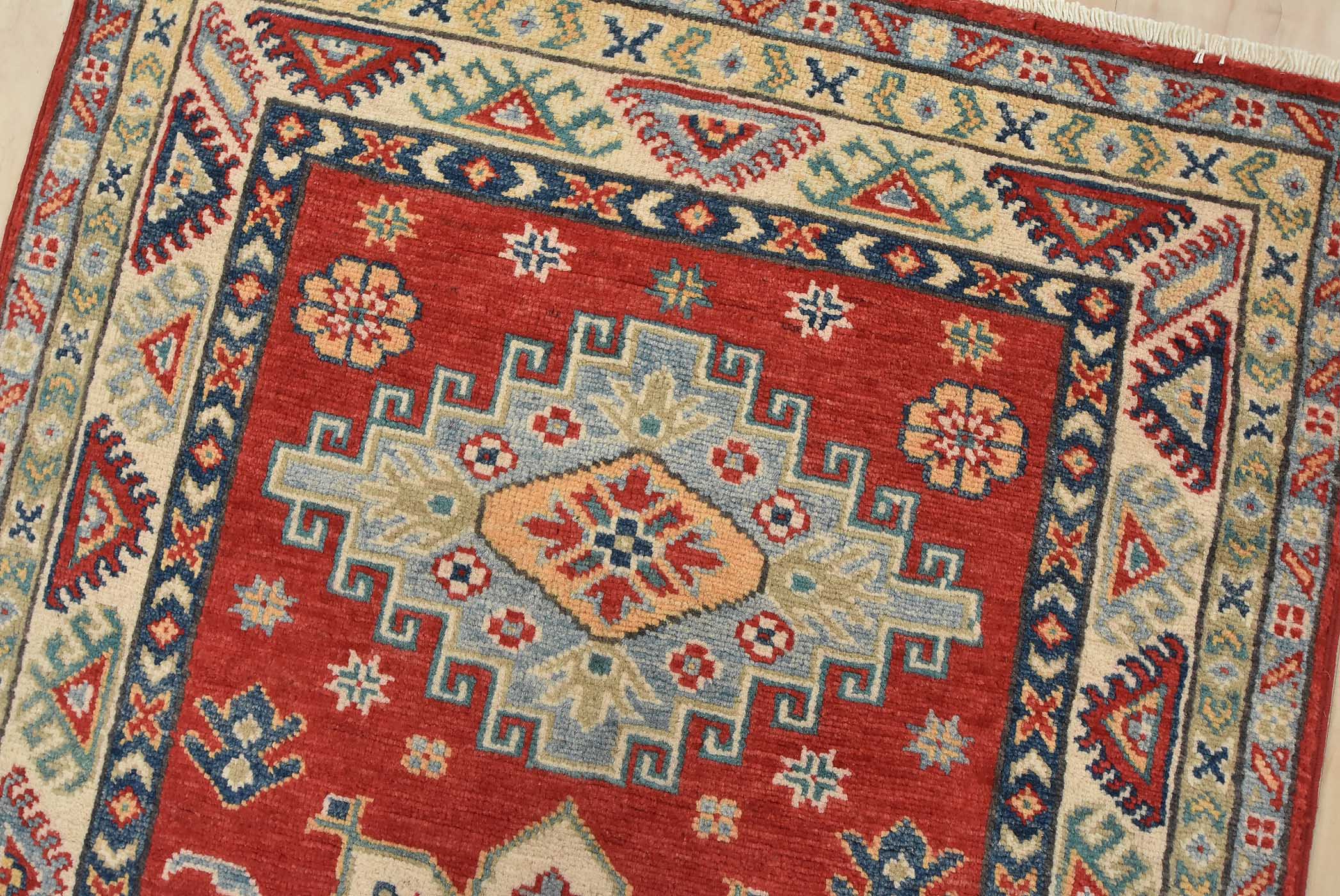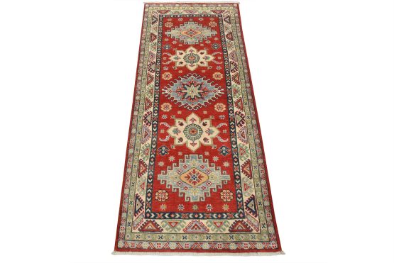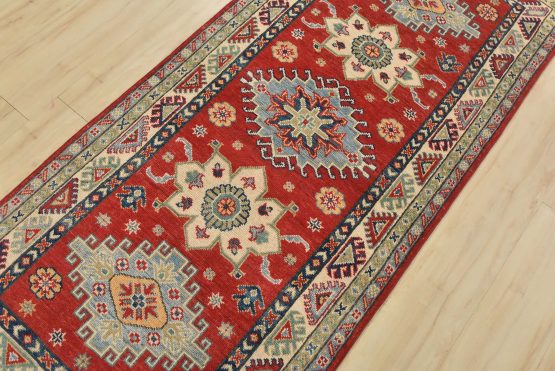 A tribal Caucasian Kazak runner hand-knotted with fine wool on a cotton foundation. This rug features a row of geometric medallions surrounded by small motifs set against a red background. It is new and in excellent condition.