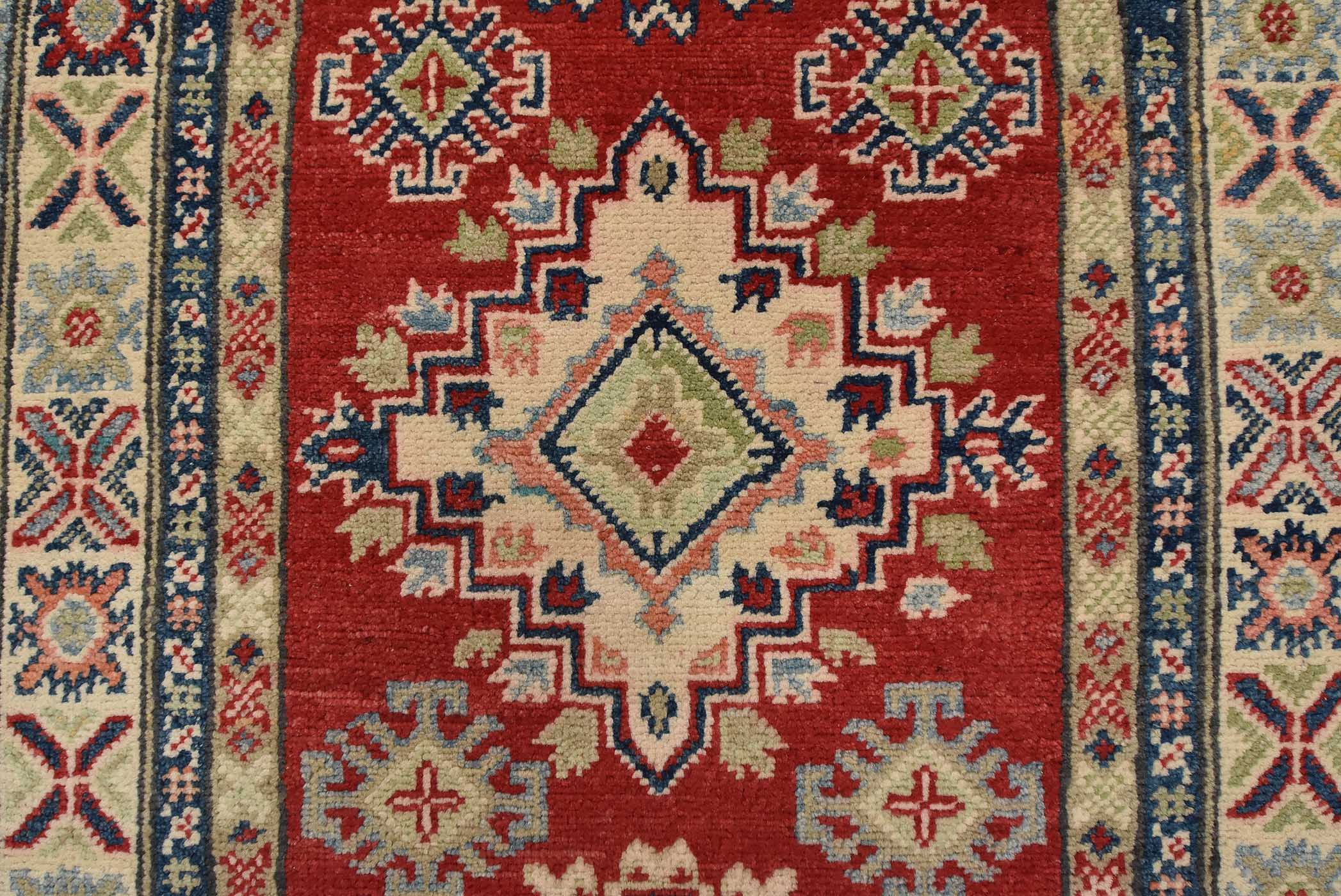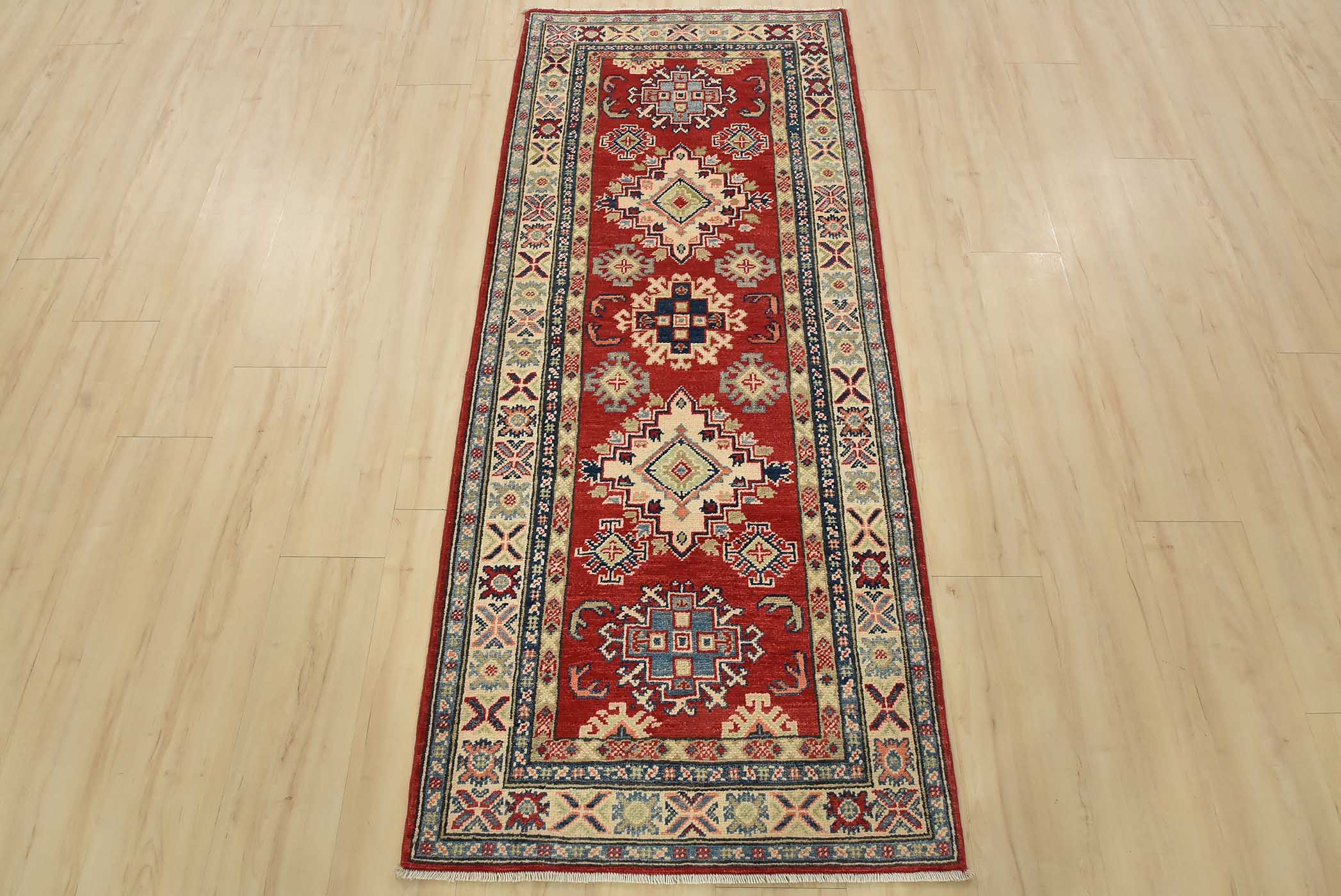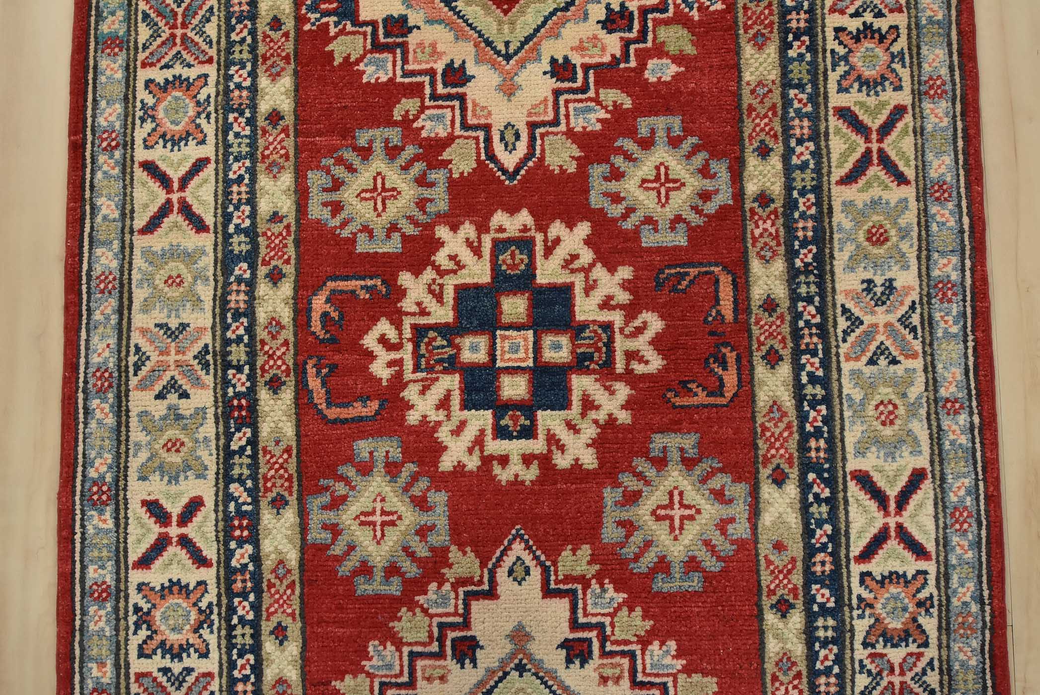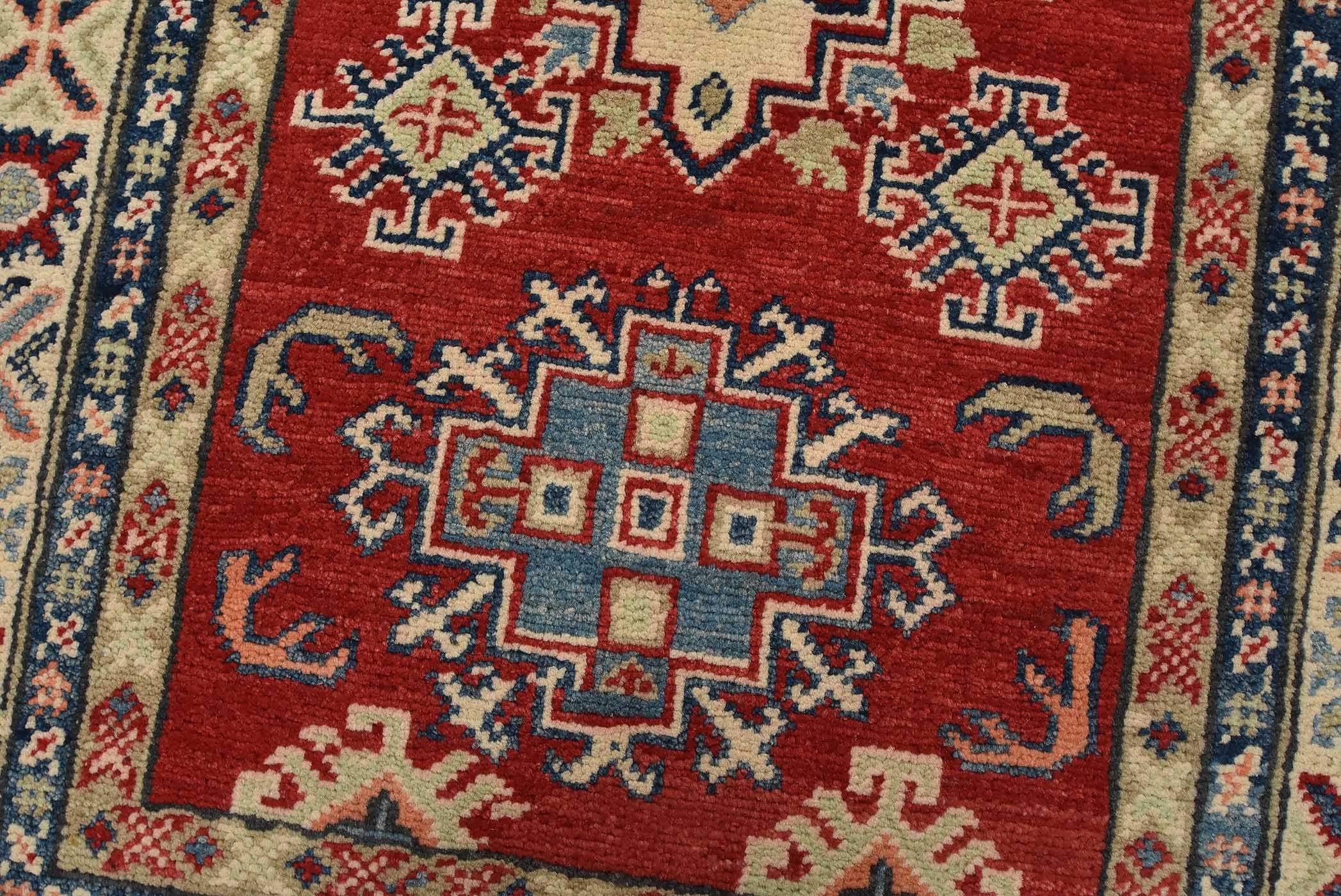 A tribal Caucasian Kazak runner hand-knotted with fine wool on a cotton foundation. This rug features geometric medallions surrounded by small geometric motifs set against a red background. It is new and in excellent condition.