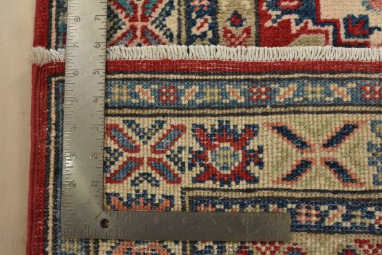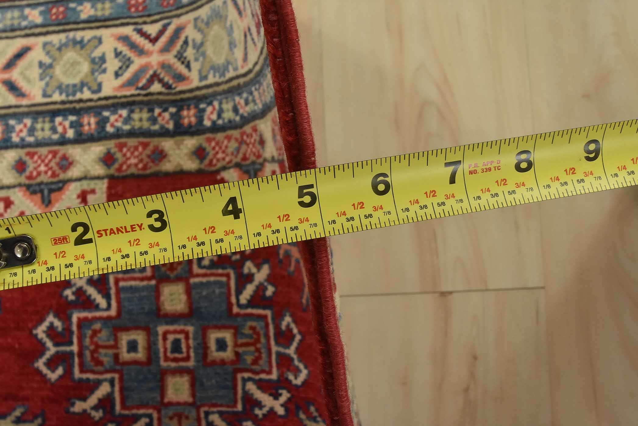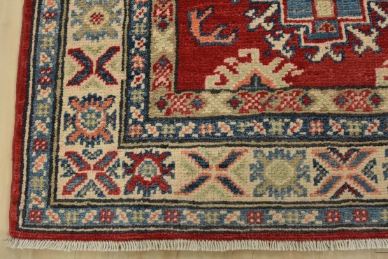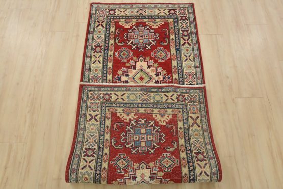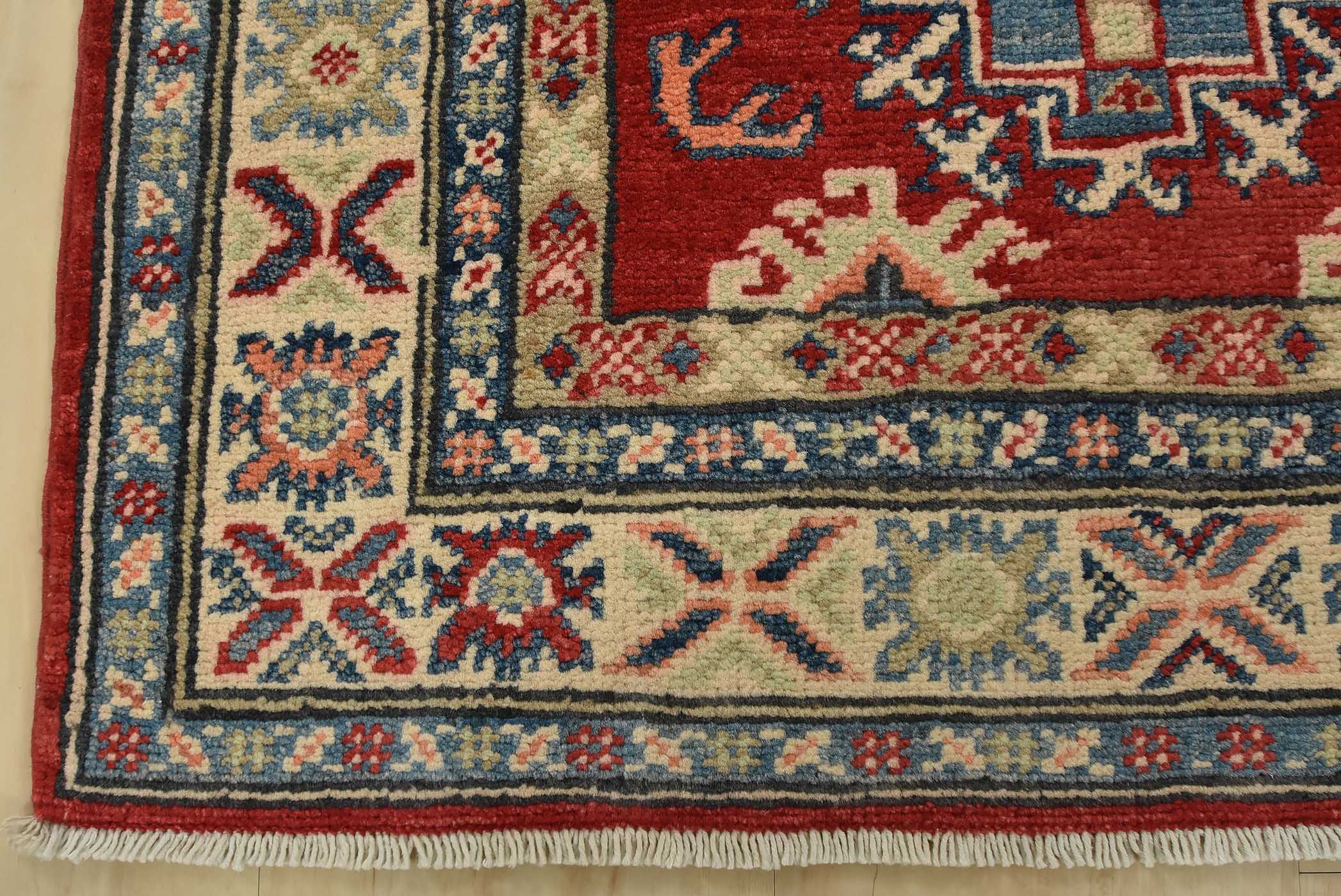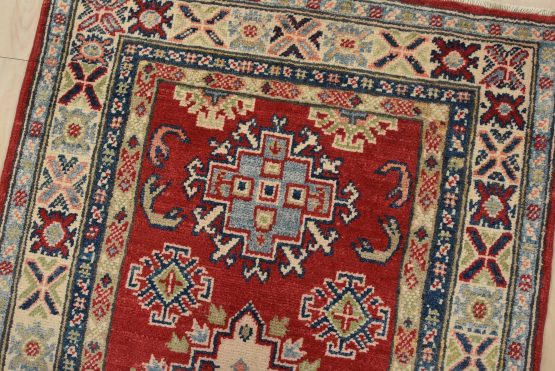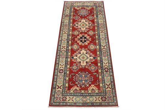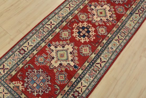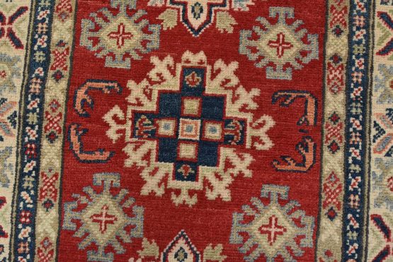 A tribal Caucasian Kazak runner hand-knotted with fine wool on a cotton foundation. This rug features geometric medallions surrounded by small geometric motifs set against a red background. It is new and in excellent condition.