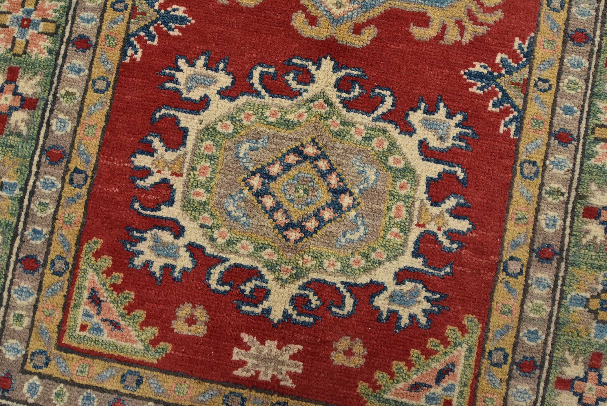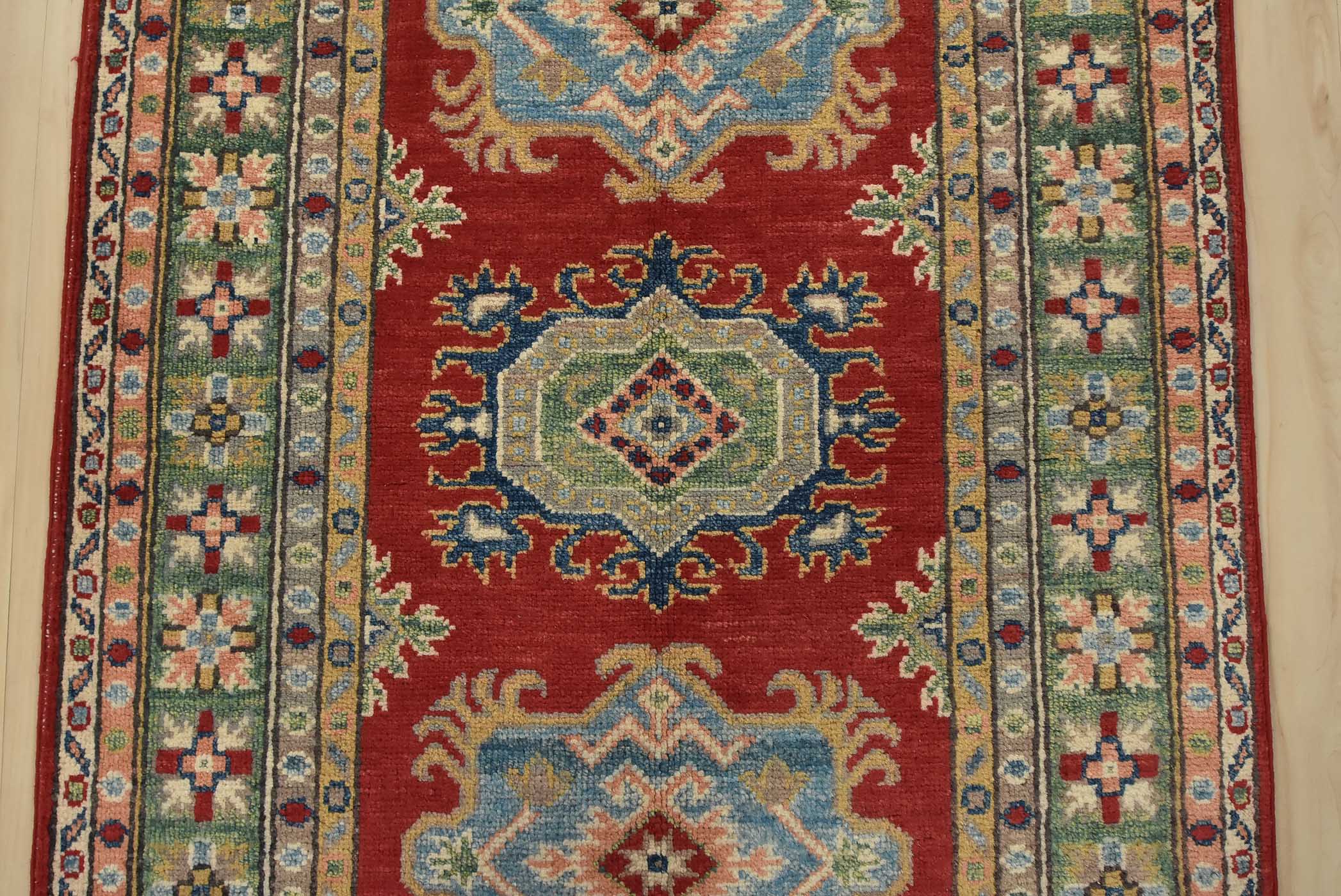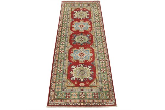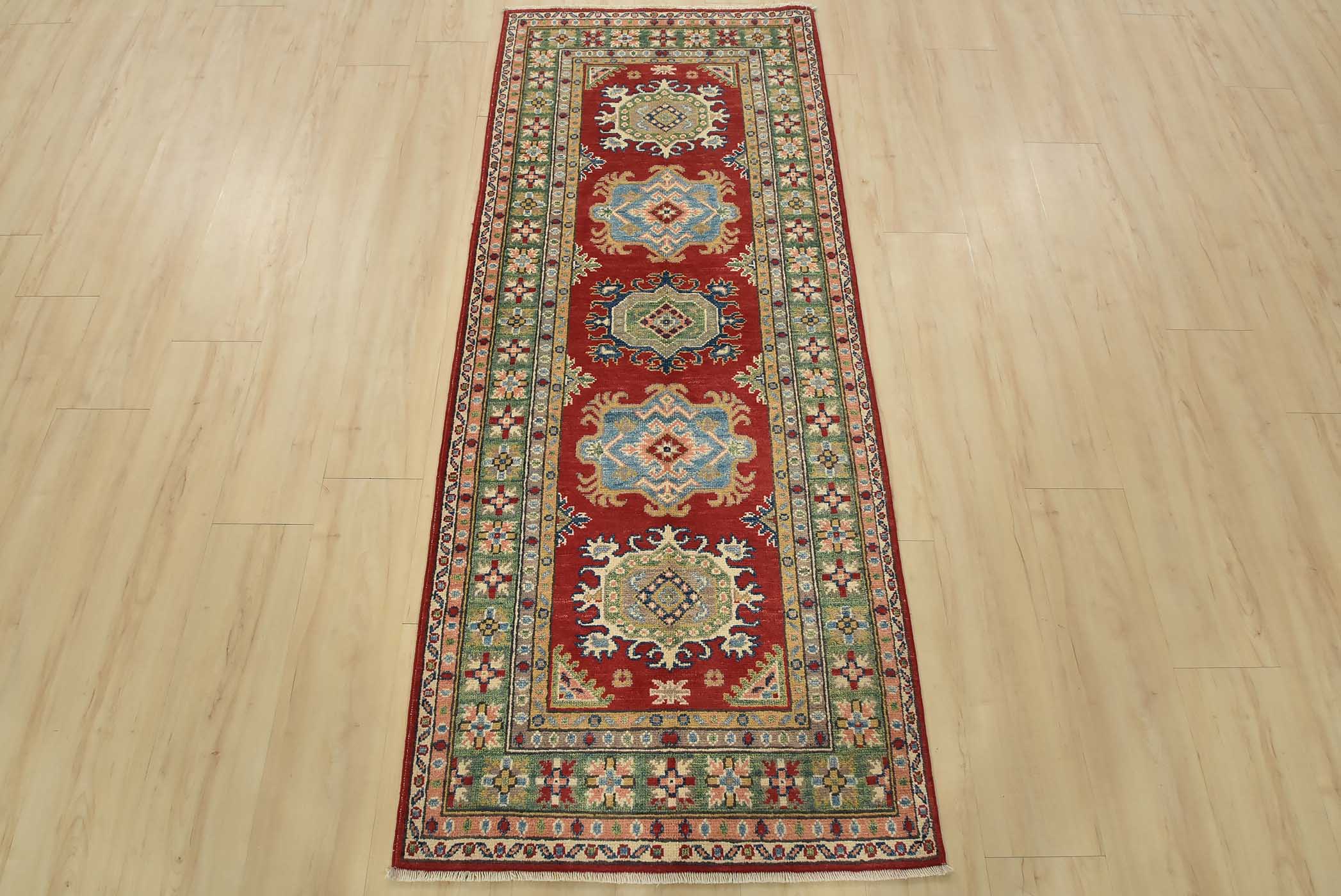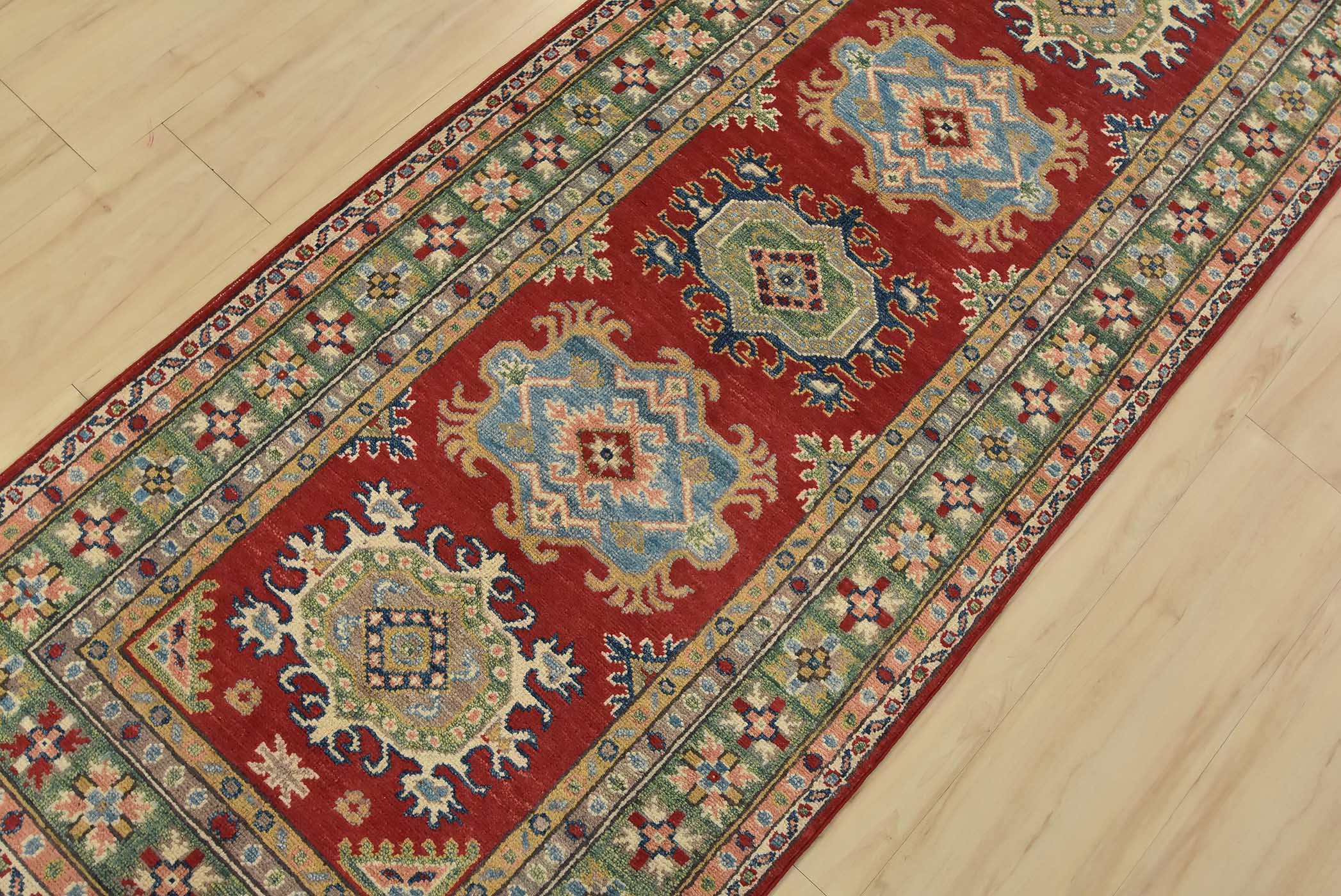 A tribal Caucasian Kazak runner hand-knotted with fine wool on a cotton foundation. This rug features geometric medallions set against a red background. It is new and in excellent condition.