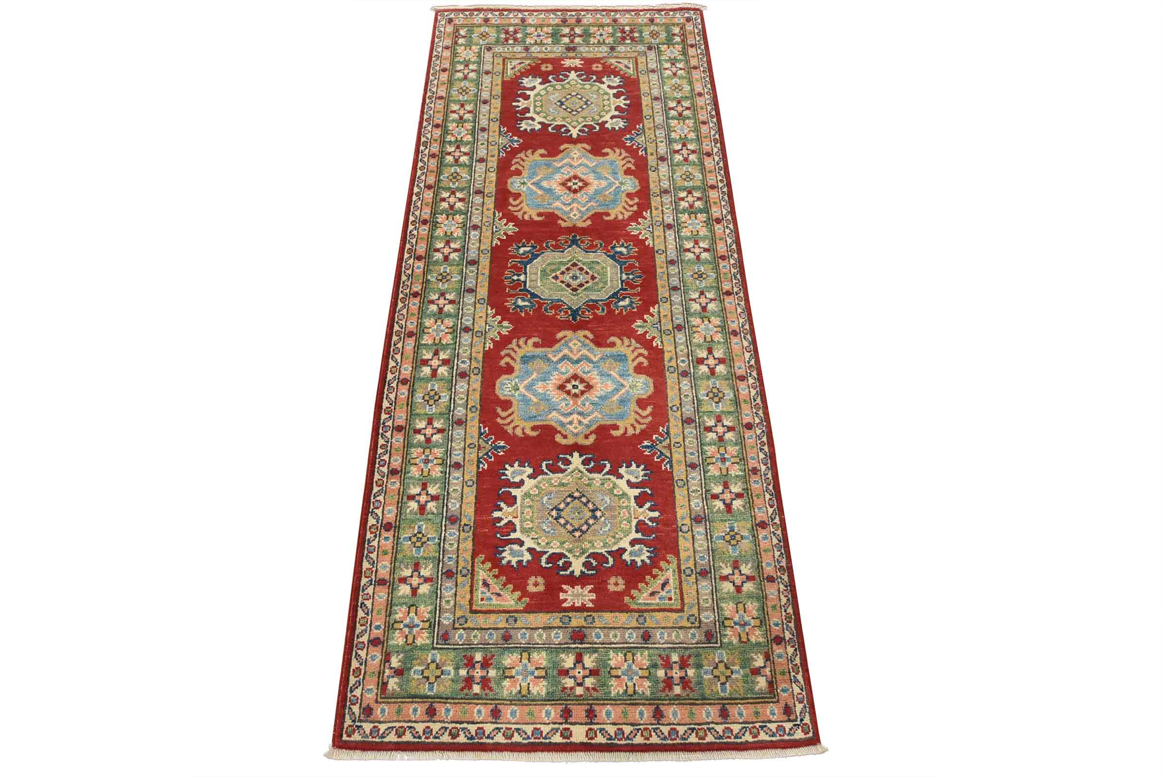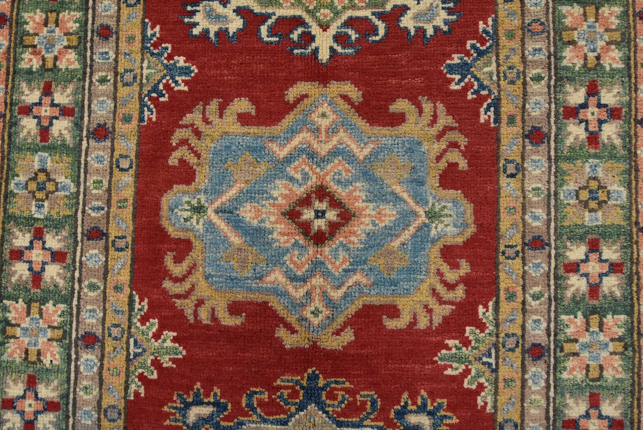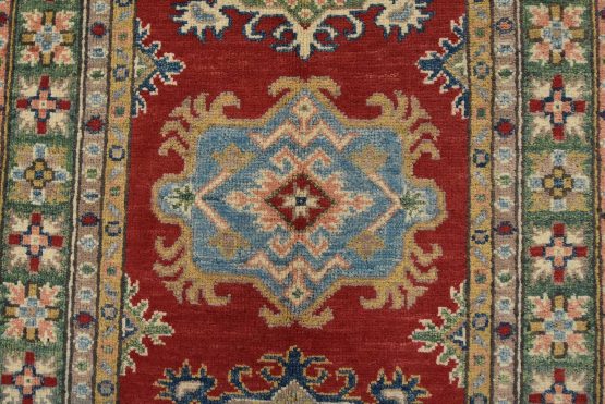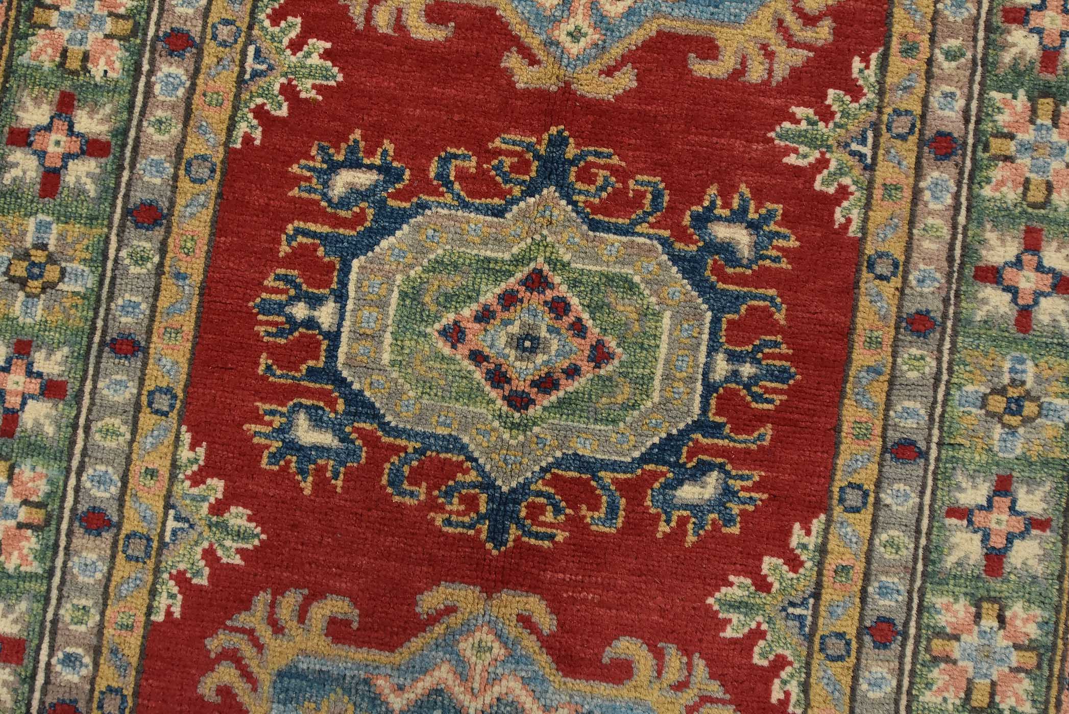 A tribal Caucasian Kazak runner hand-knotted with fine wool on a cotton foundation. This rug features geometric medallions set against a red background. It is new and in excellent condition.