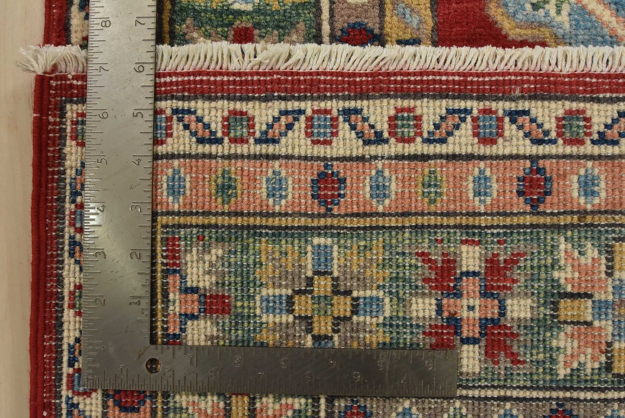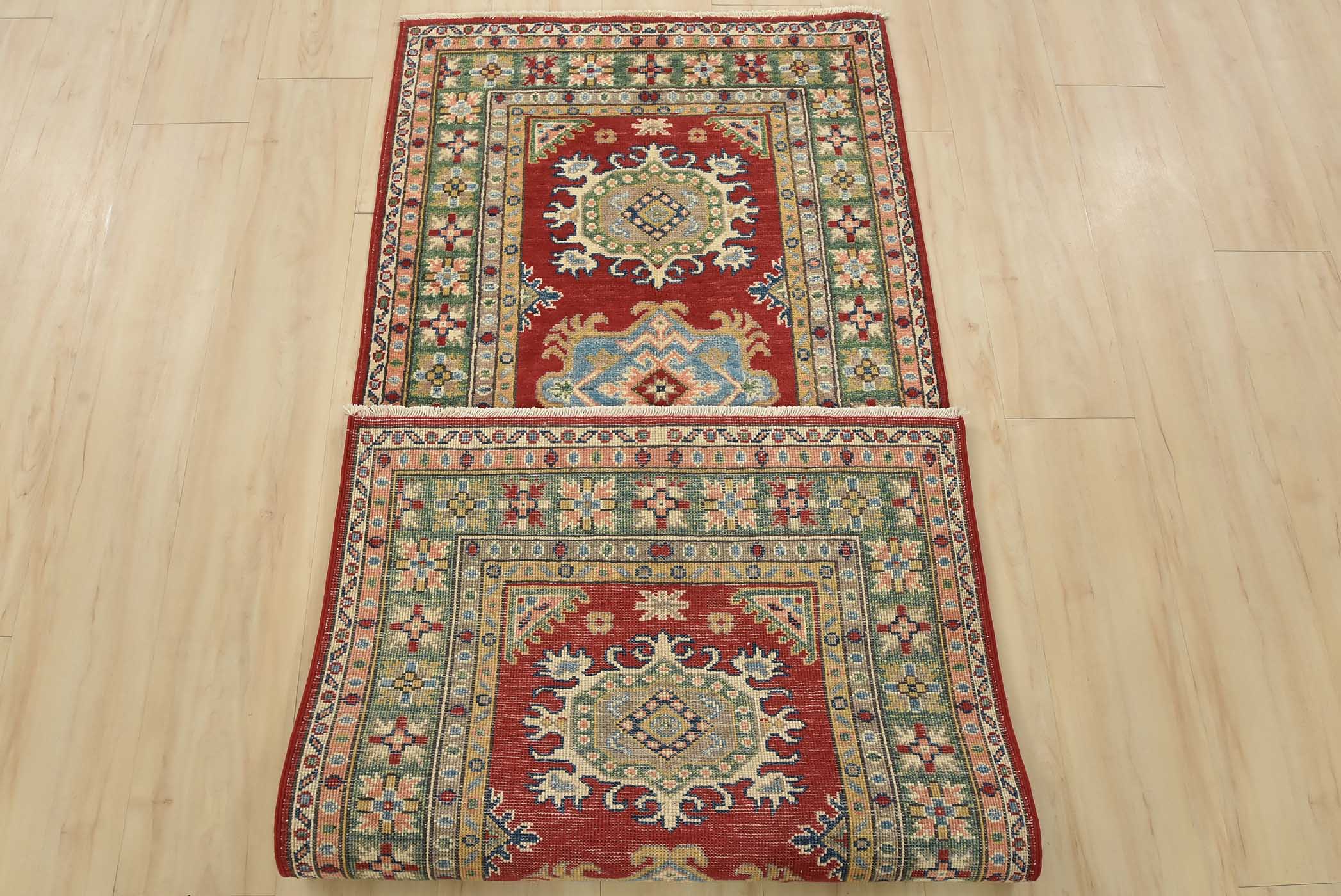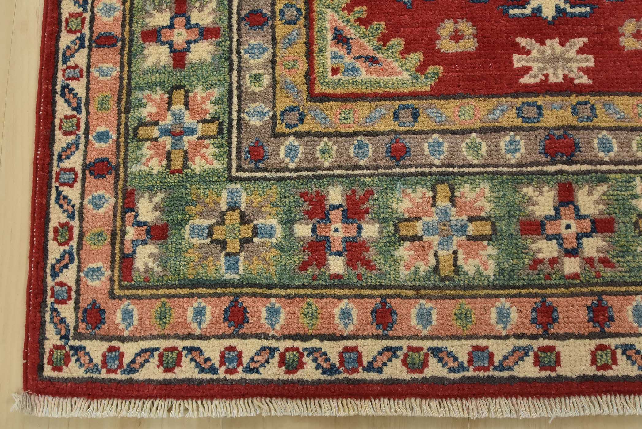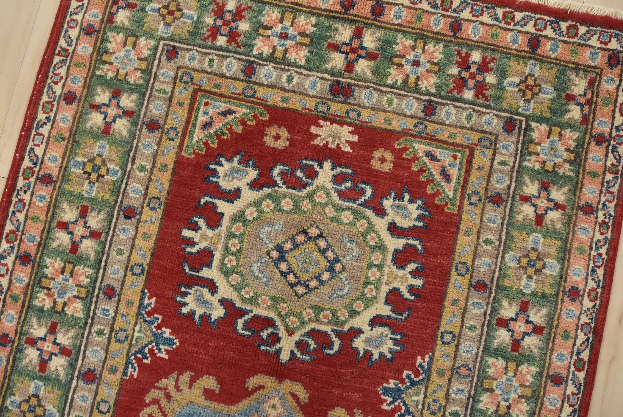 A tribal Caucasian Kazak runner hand-knotted with fine wool on a cotton foundation. This rug features geometric medallions set against a red background. It is new and in excellent condition.