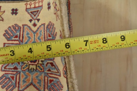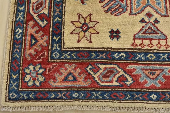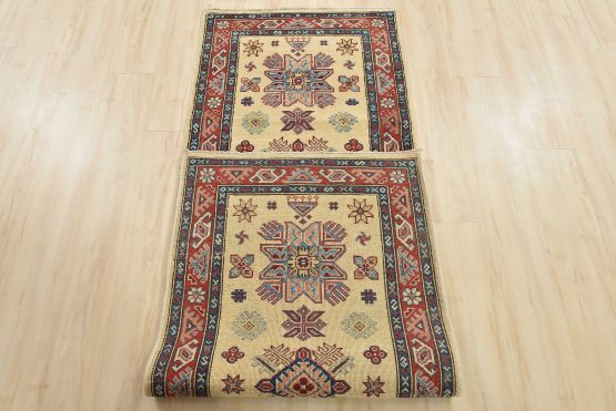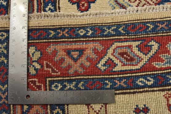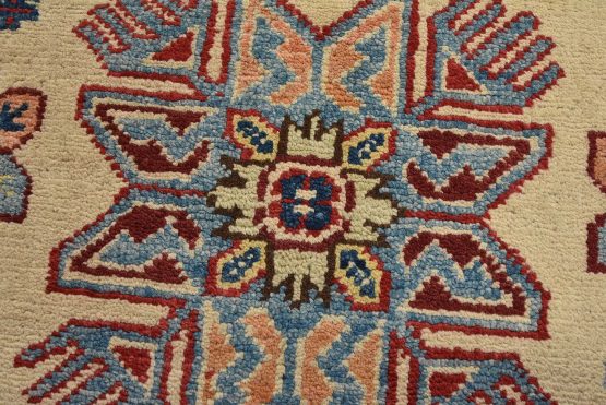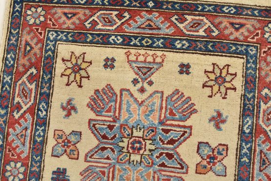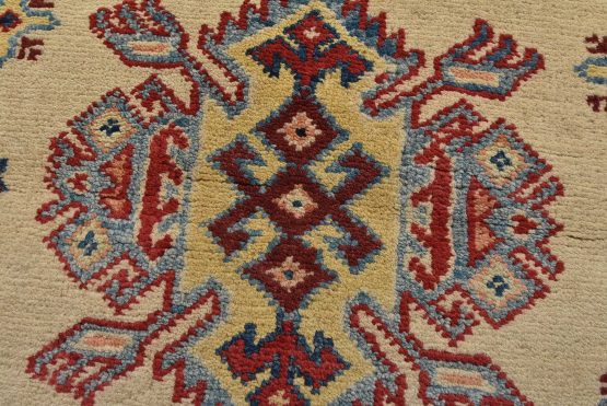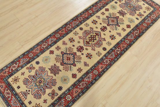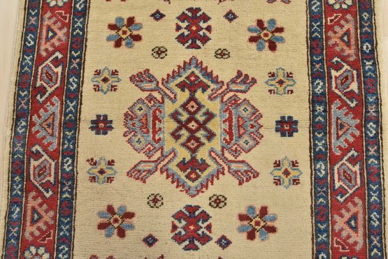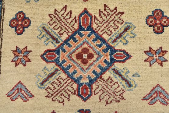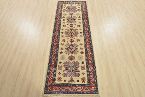 A tribal Caucasian Kazak runner hand-knotted with an all-wool pile on a cotton foundation. This oriental rug features geometric medallions surrounded by small geometric motifs set against a beige background. It is new and in excellent condition.