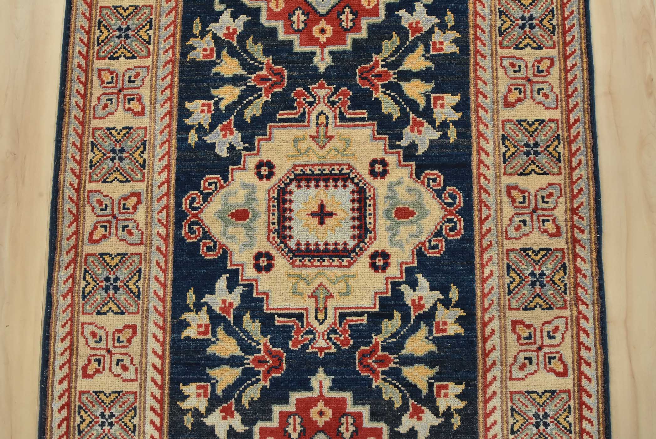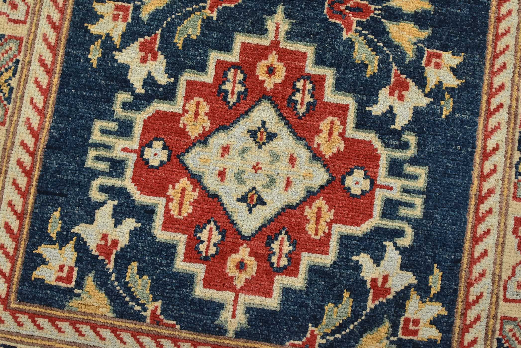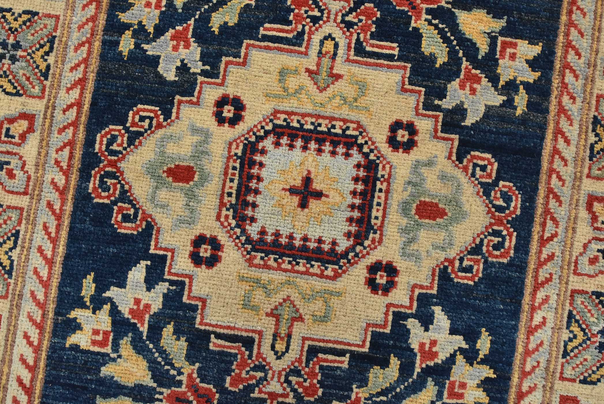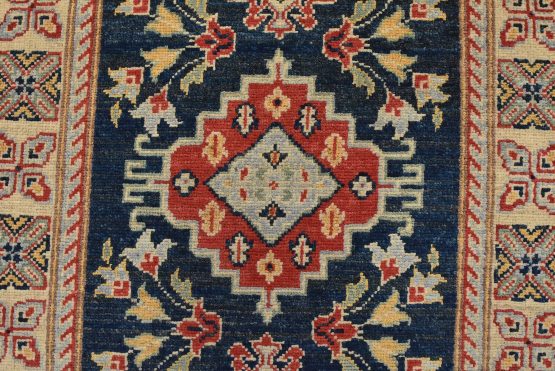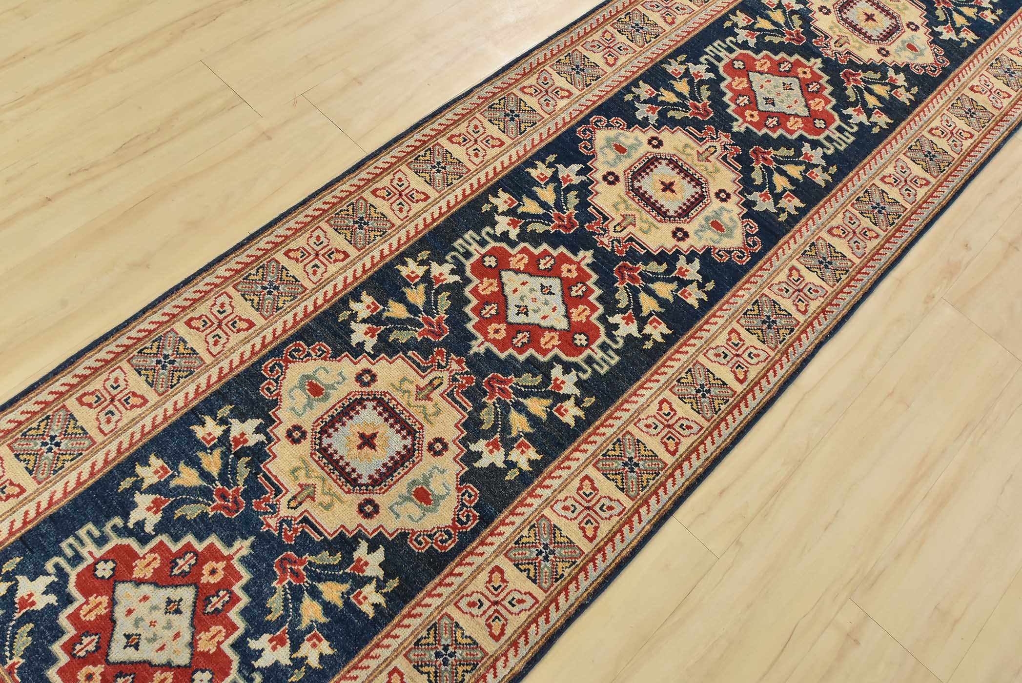 A traditional Caucasian Kazak runner hand-knotted with fine wool on a cotton foundation. This rug features a row of geometric medallions surrounded by botanical motifs set against a blue background. It is new and in excellent condition.