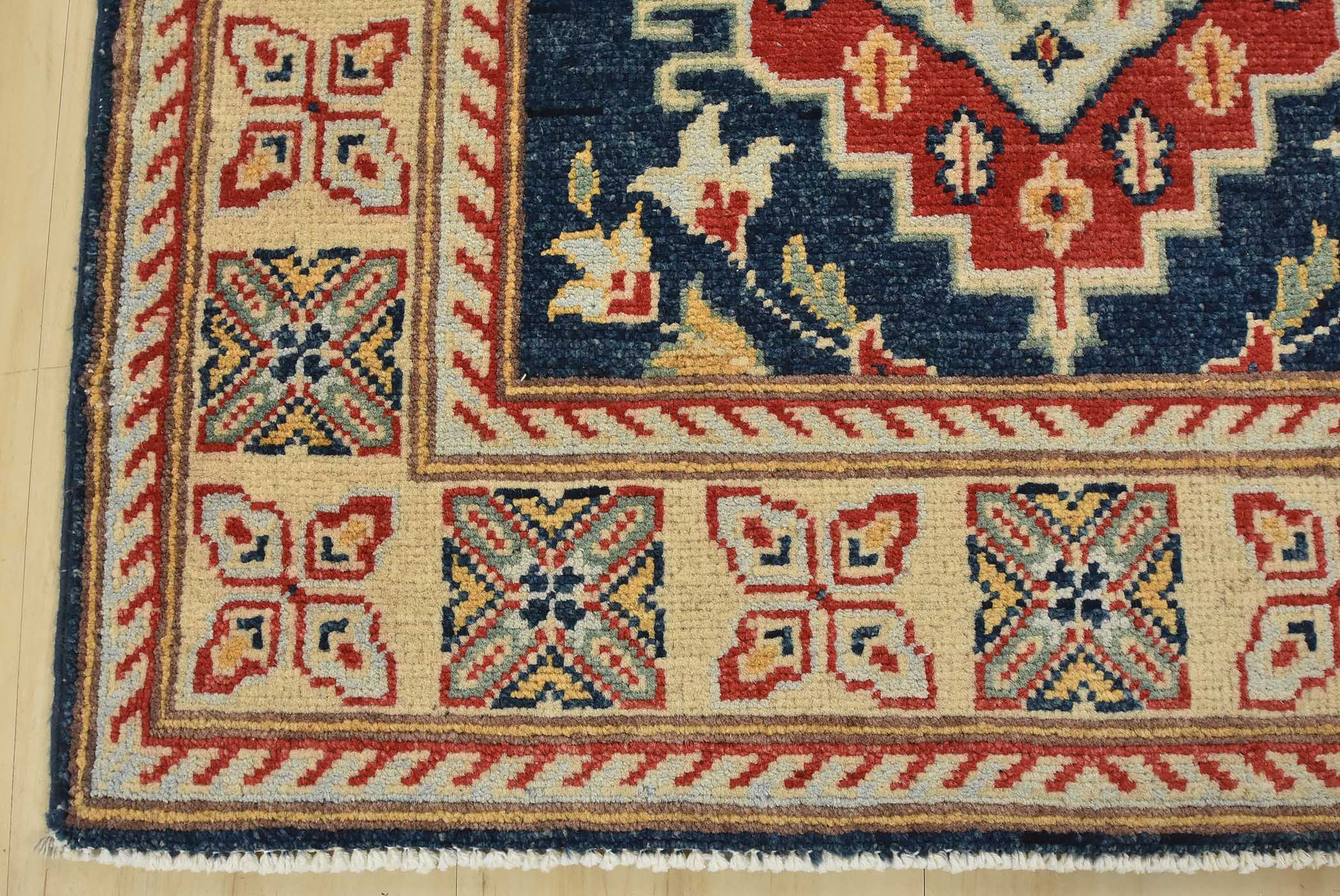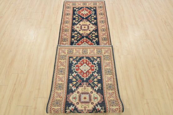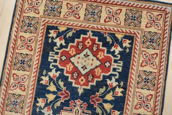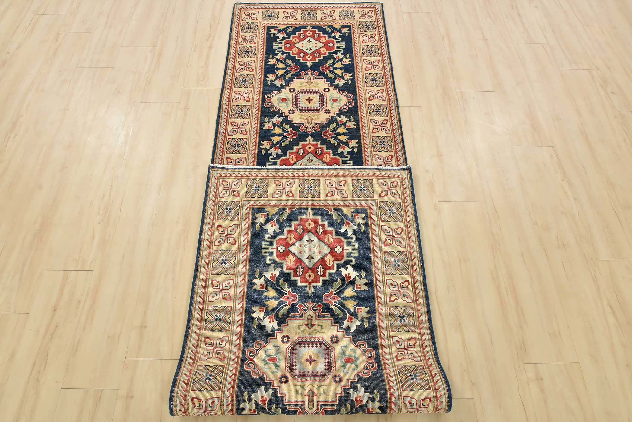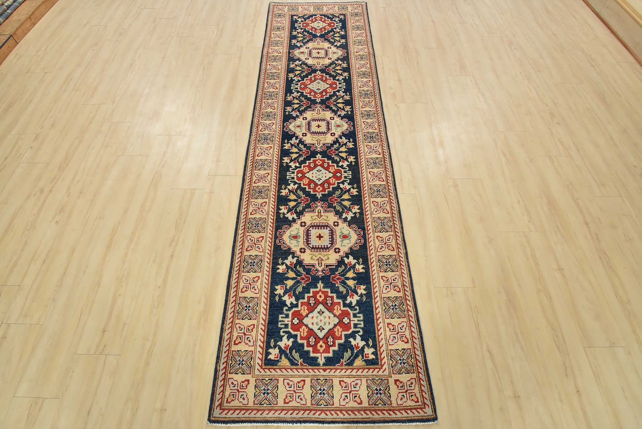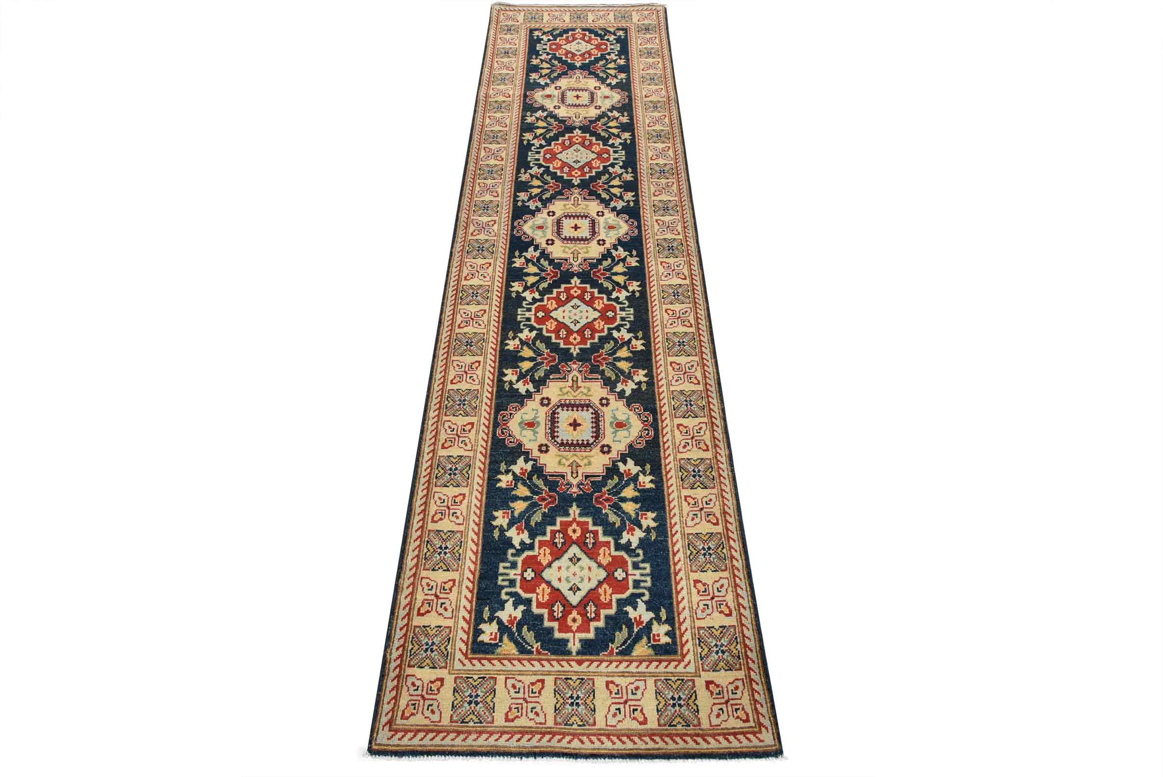 A traditional Caucasian Kazak runner hand-knotted with fine wool on a cotton foundation. This rug features a row of geometric medallions surrounded by botanical motifs set against a blue background. It is new and in excellent condition.