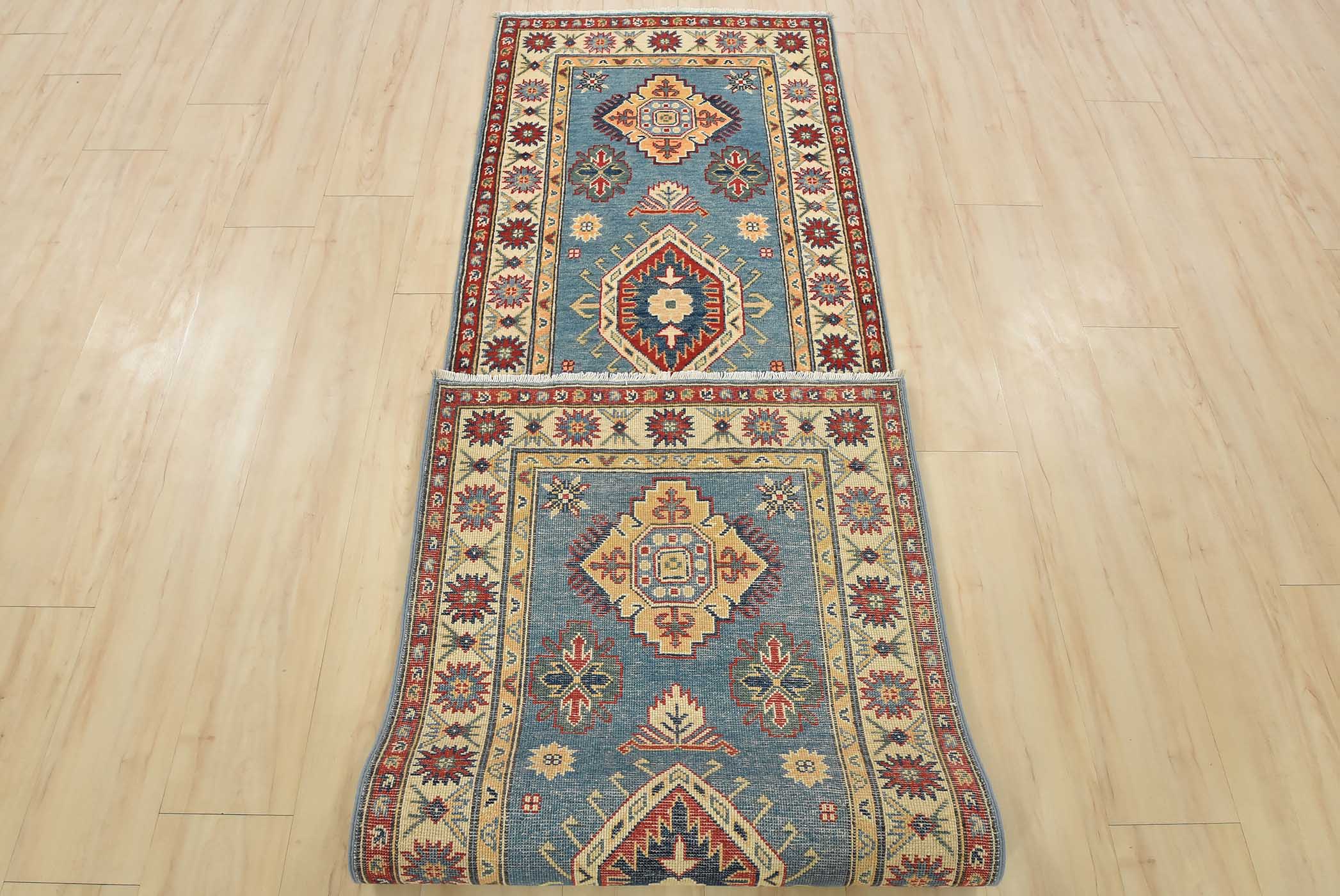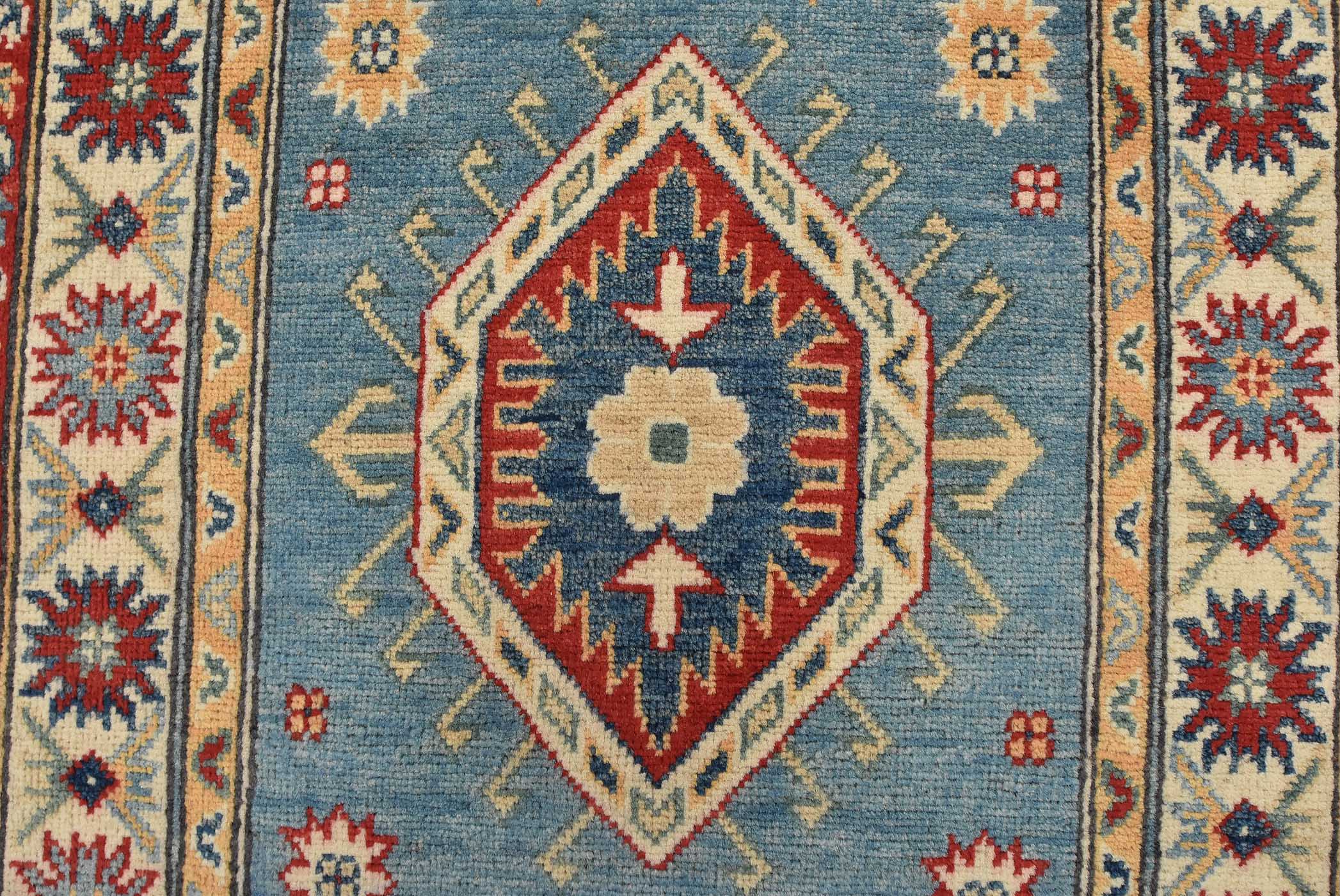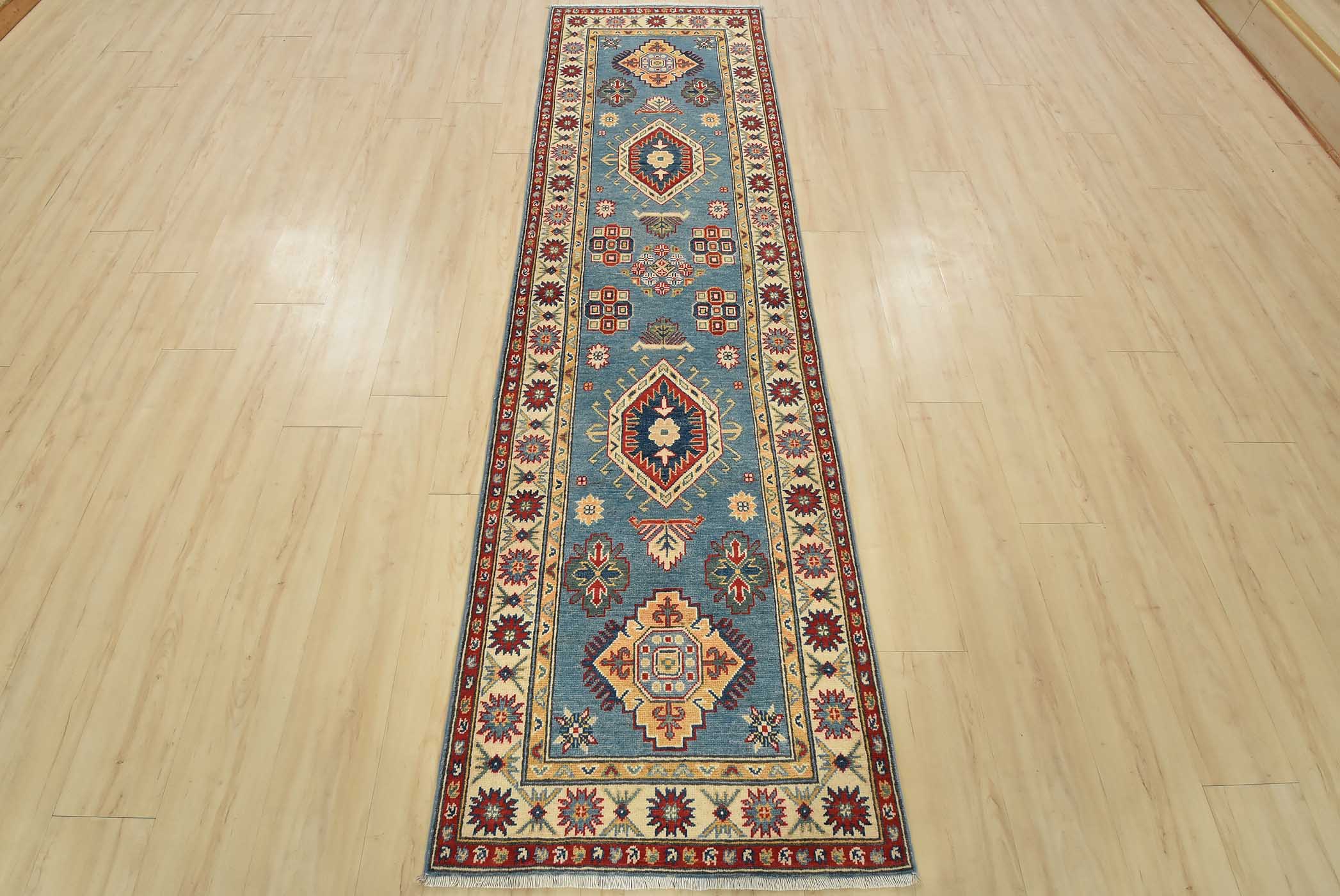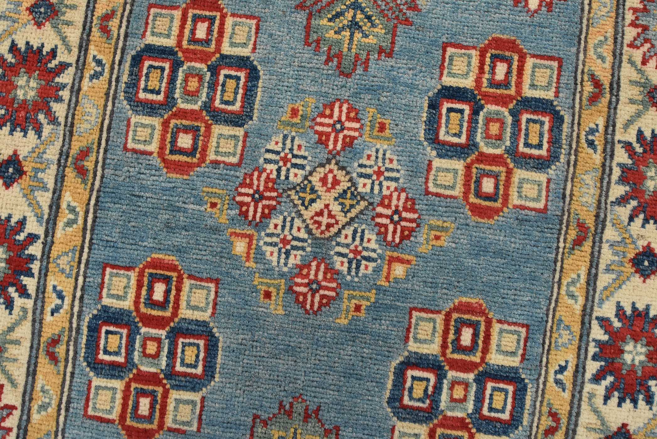A tribal Caucasian Kazak runner hand-knotted with fine wool on a cotton foundation. This rug features a row of geometric medallions surrounded by small geometric motifs set against a blue background. It is new and in excellent condition.