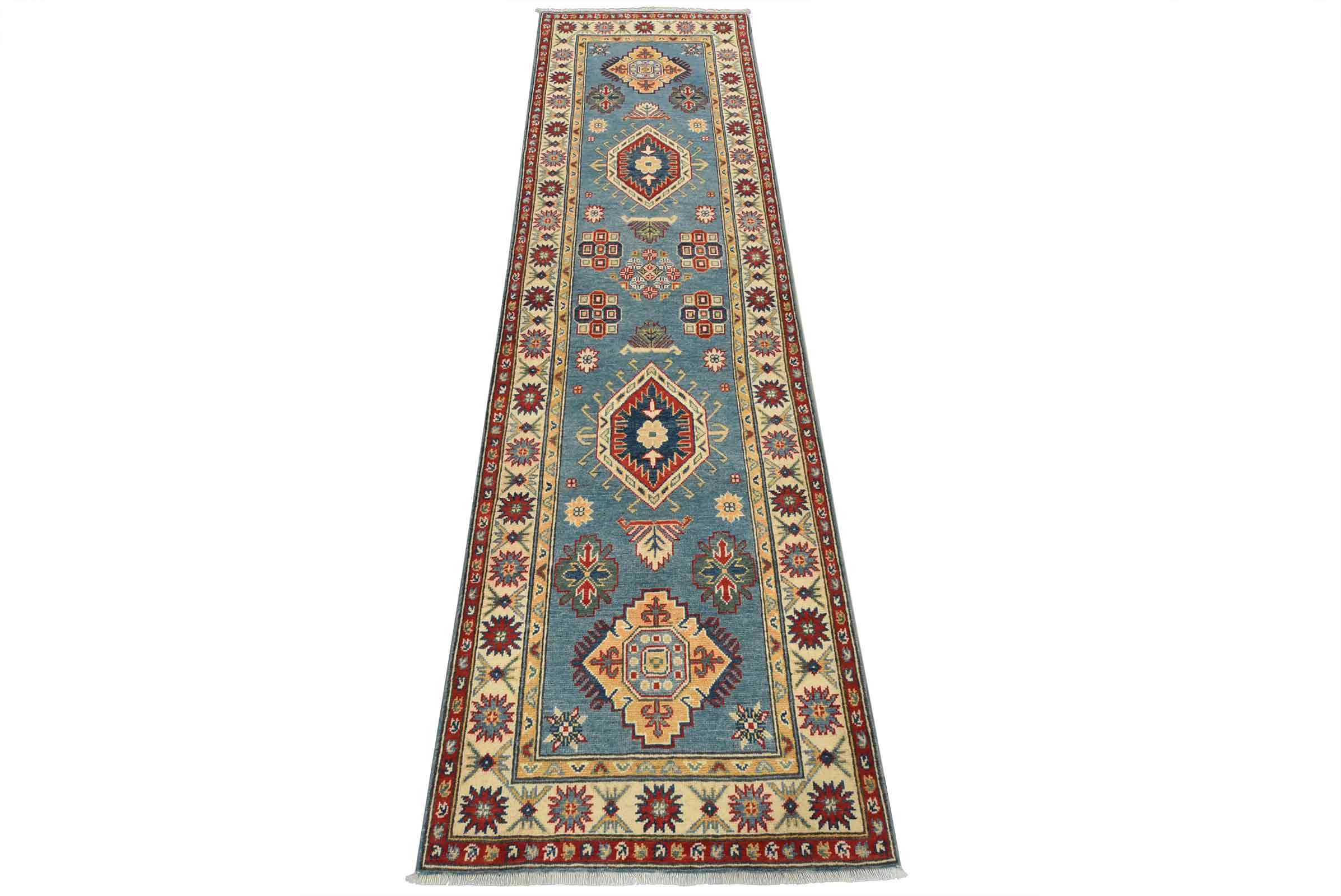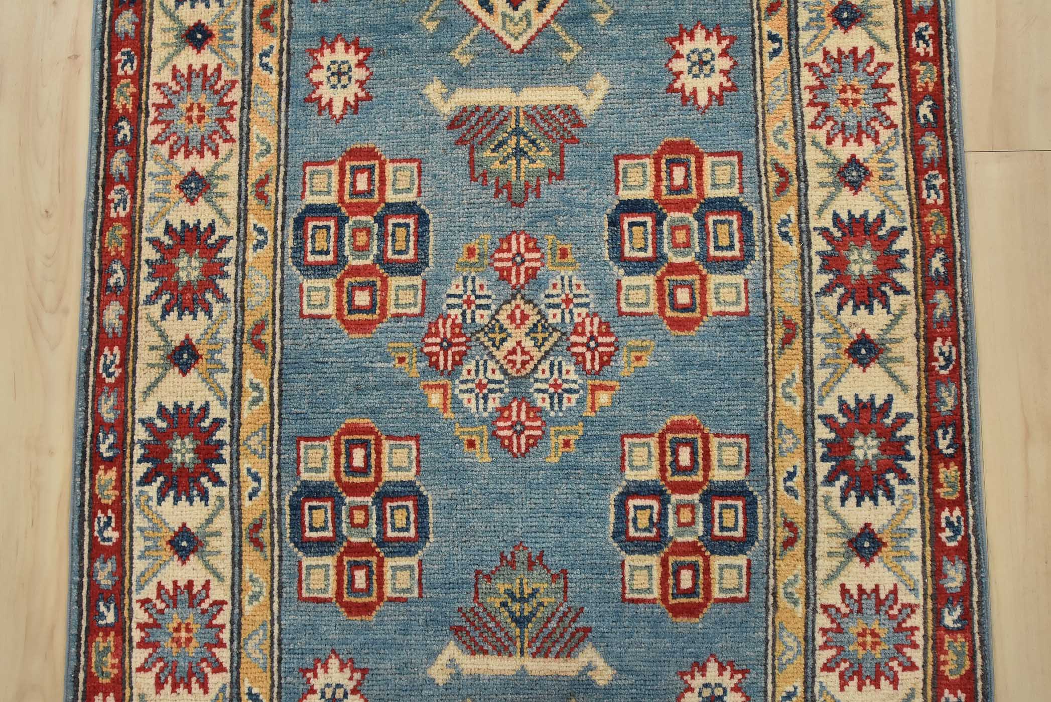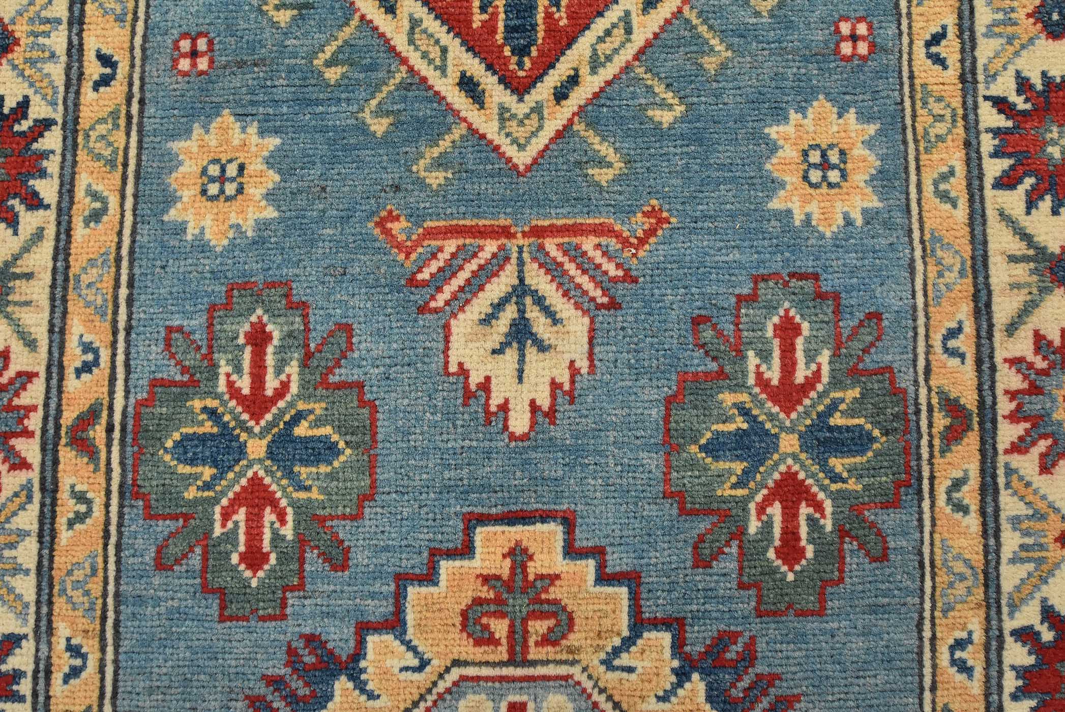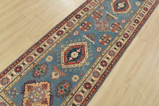 A tribal Caucasian Kazak runner hand-knotted with fine wool on a cotton foundation. This rug features a row of geometric medallions surrounded by small geometric motifs set against a blue background. It is new and in excellent condition.