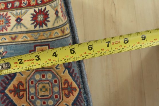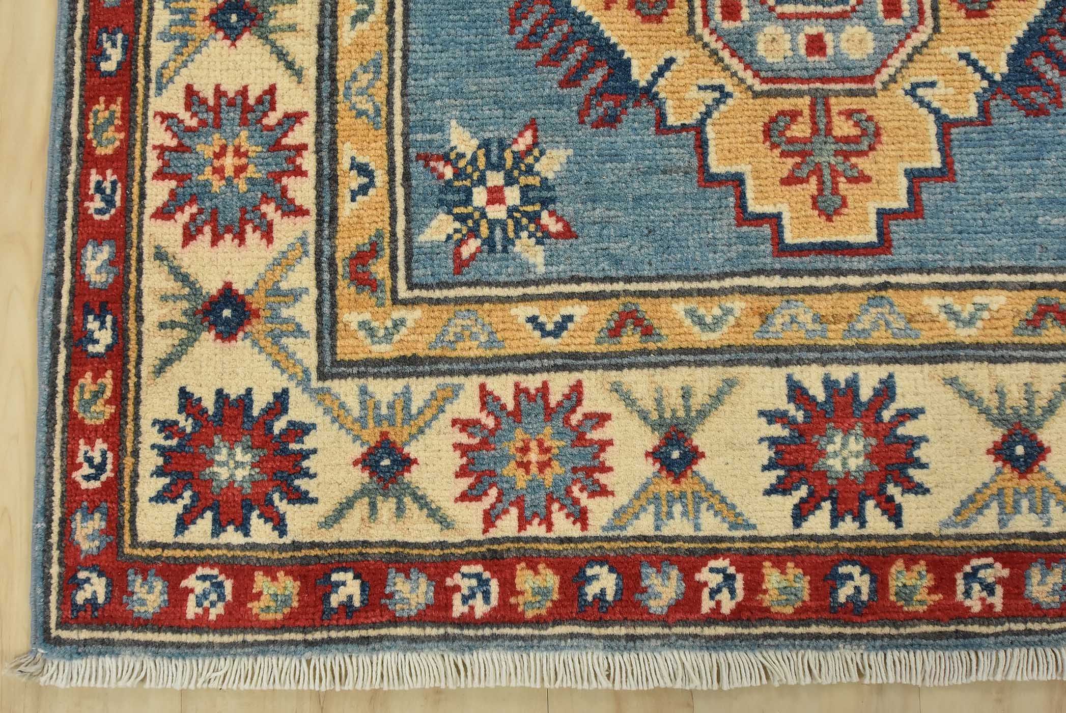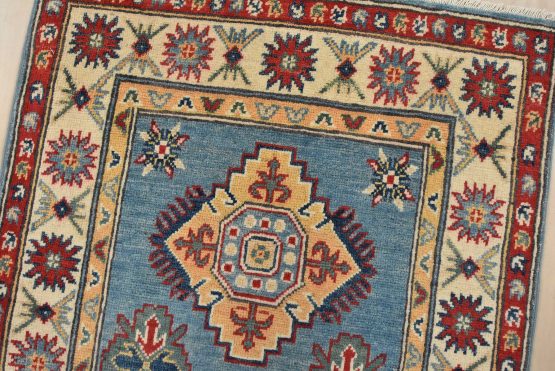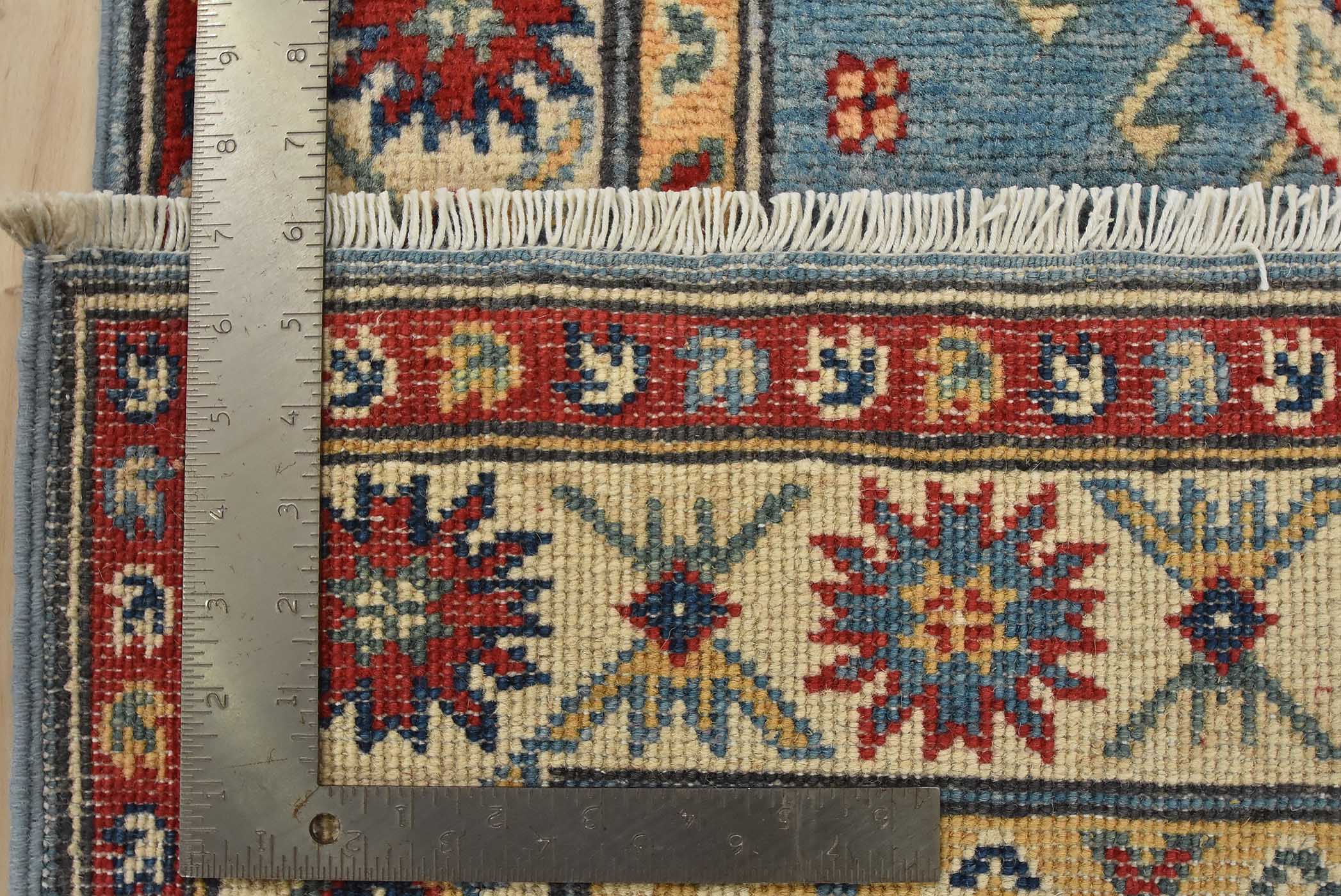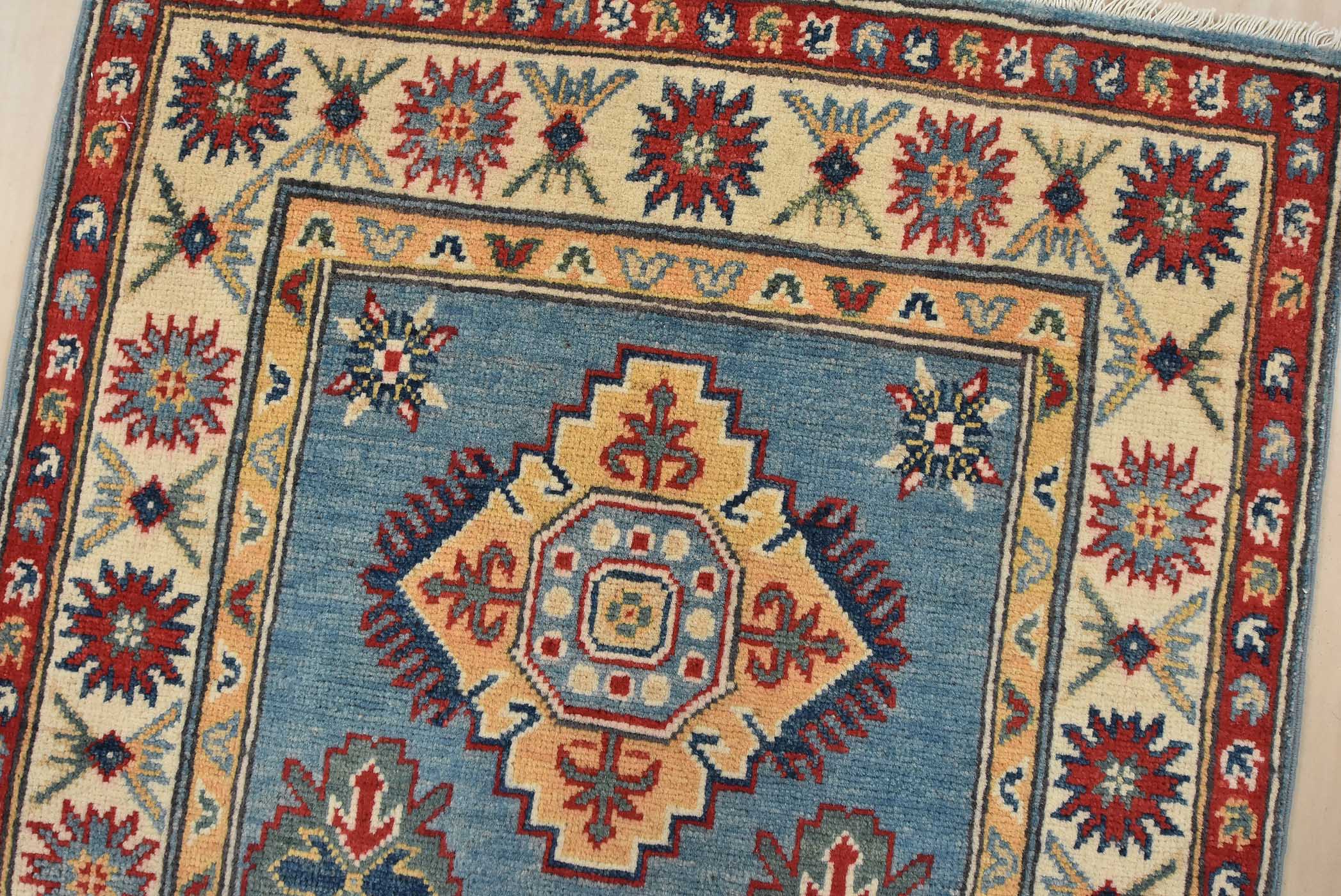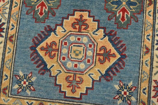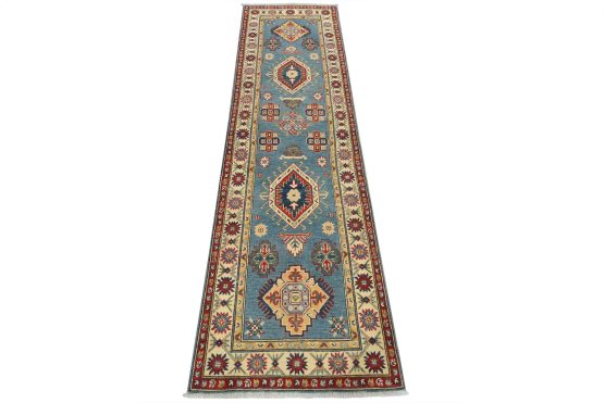 A tribal Caucasian Kazak runner hand-knotted with fine wool on a cotton foundation. This rug features a row of geometric medallions surrounded by small geometric motifs set against a blue background. It is new and in excellent condition.