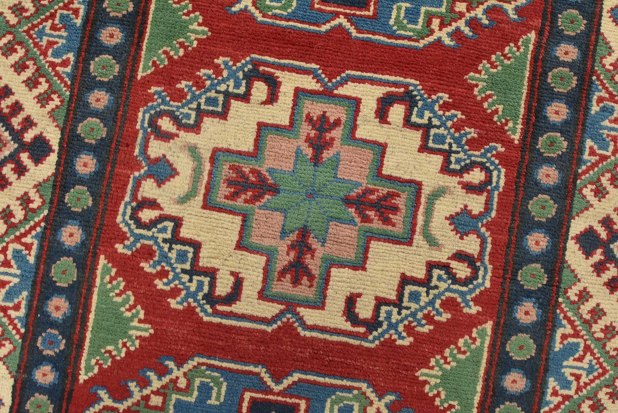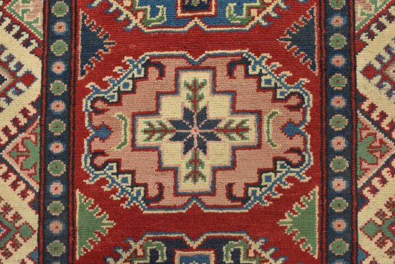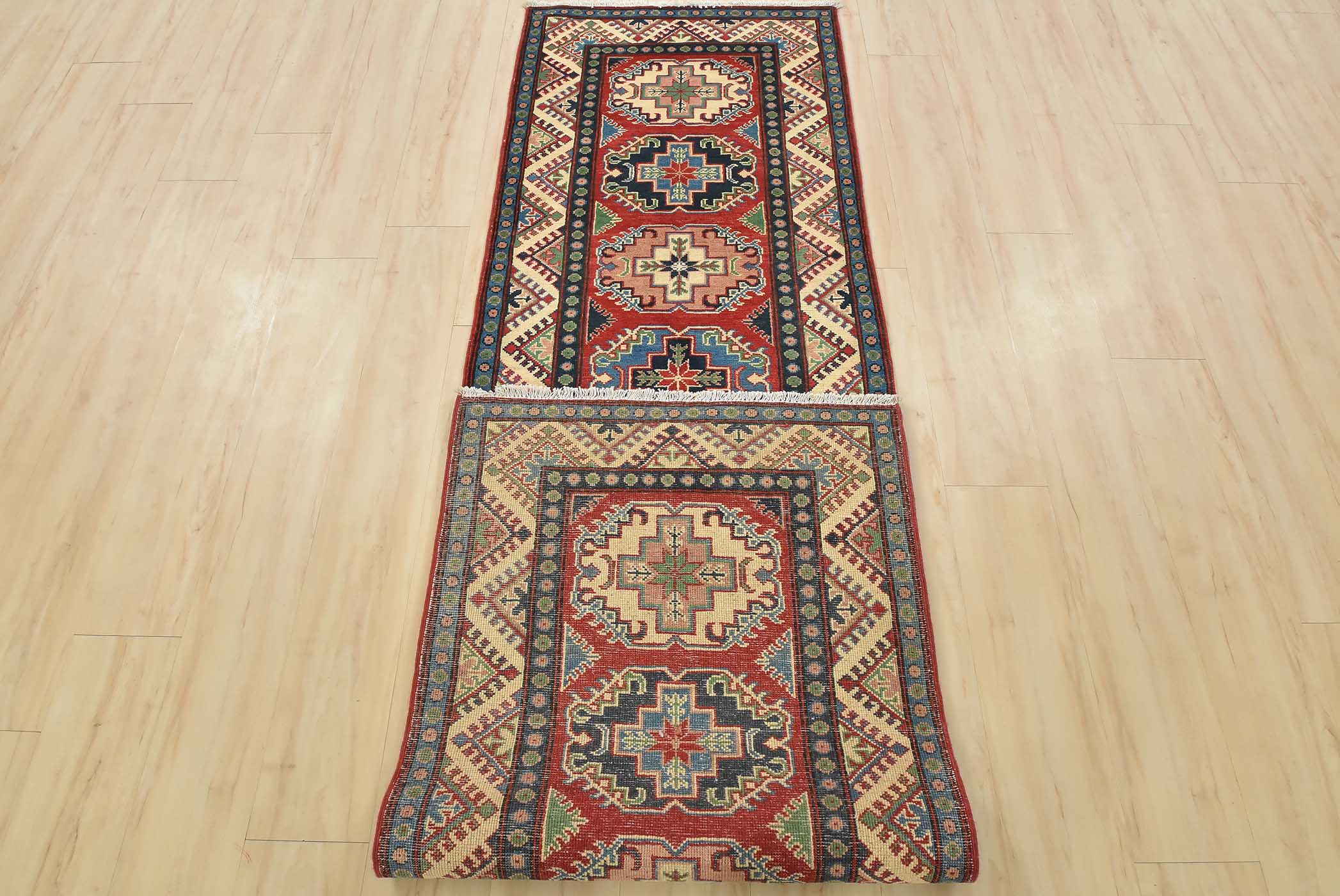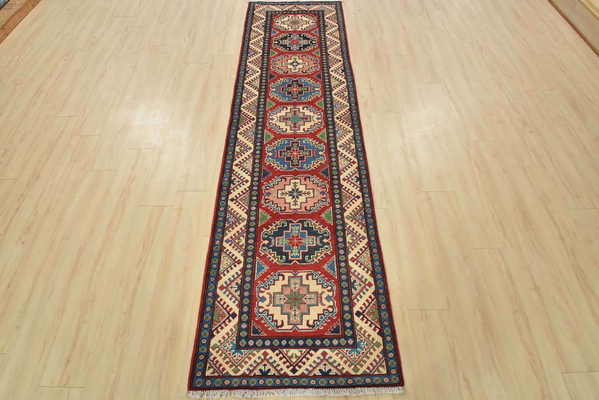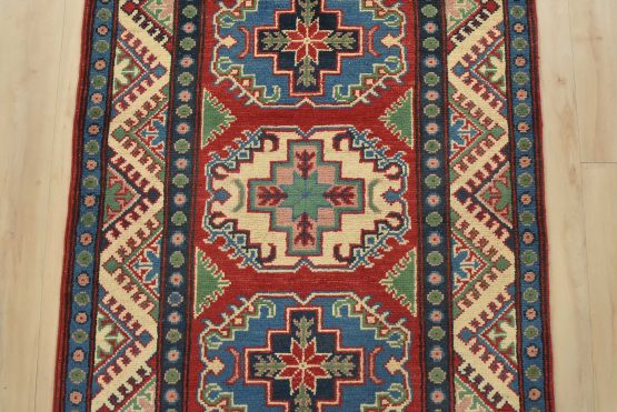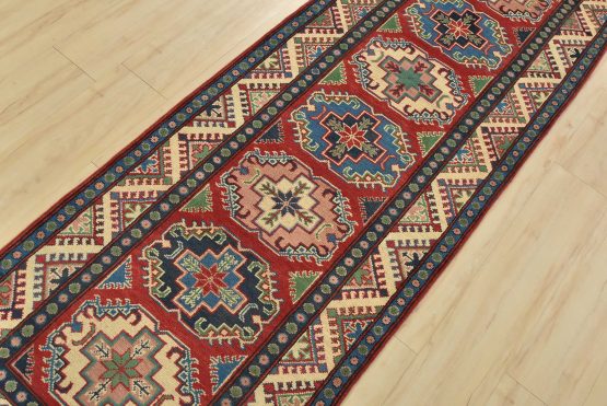 A tribal Caucasian Kazak runner hand-knotted with fine wool on a cotton foundation. This rug features a row of geometric medallions set against a red background. It is new and in excellent condition.