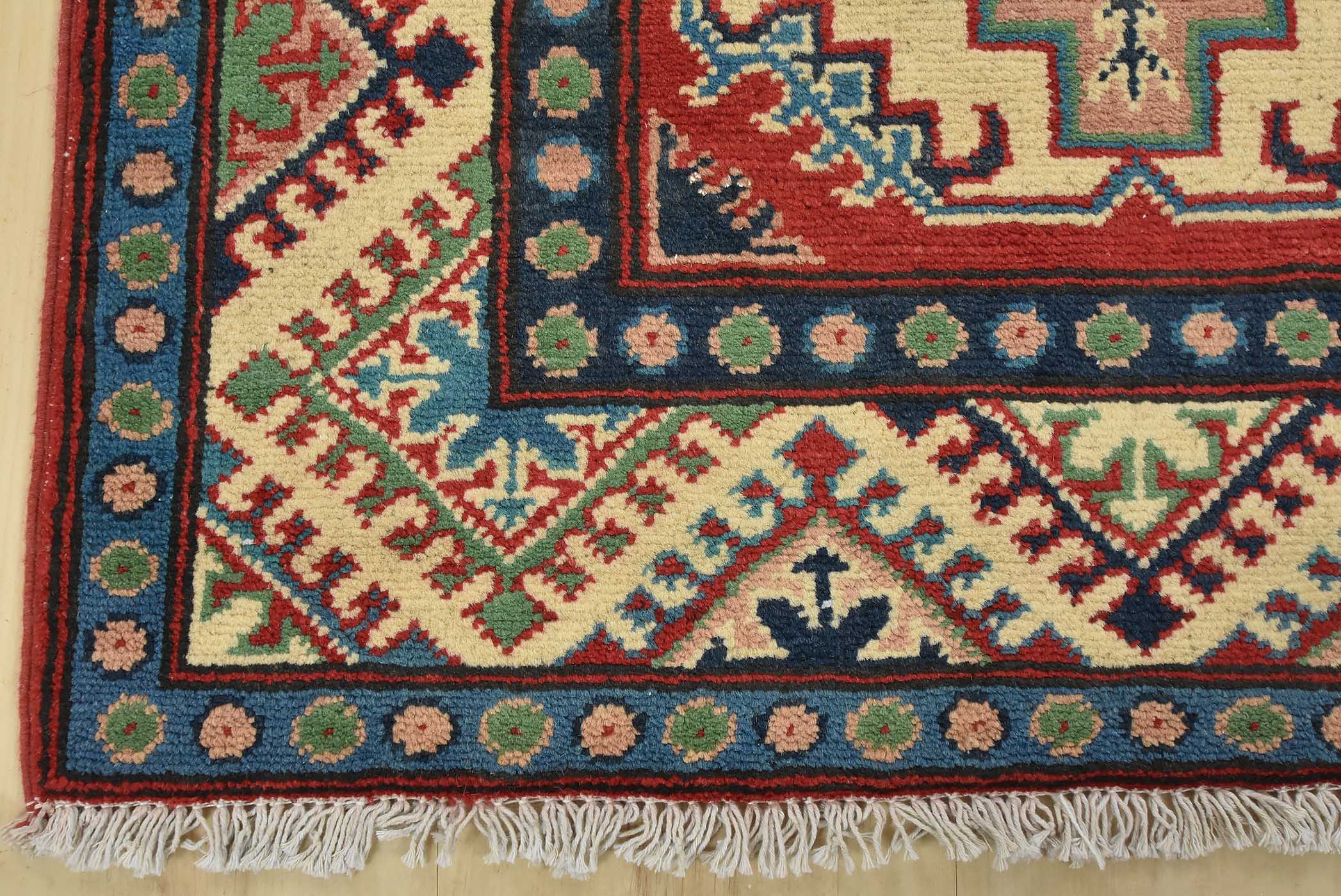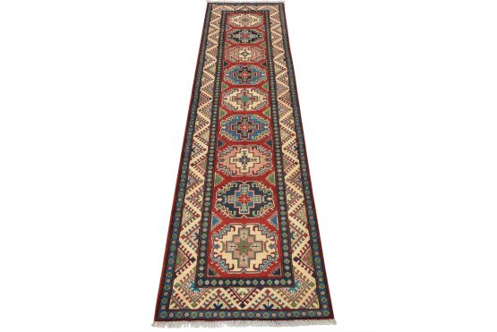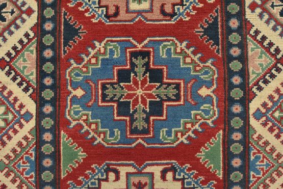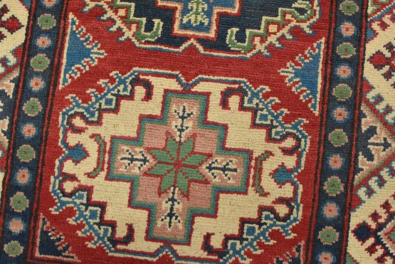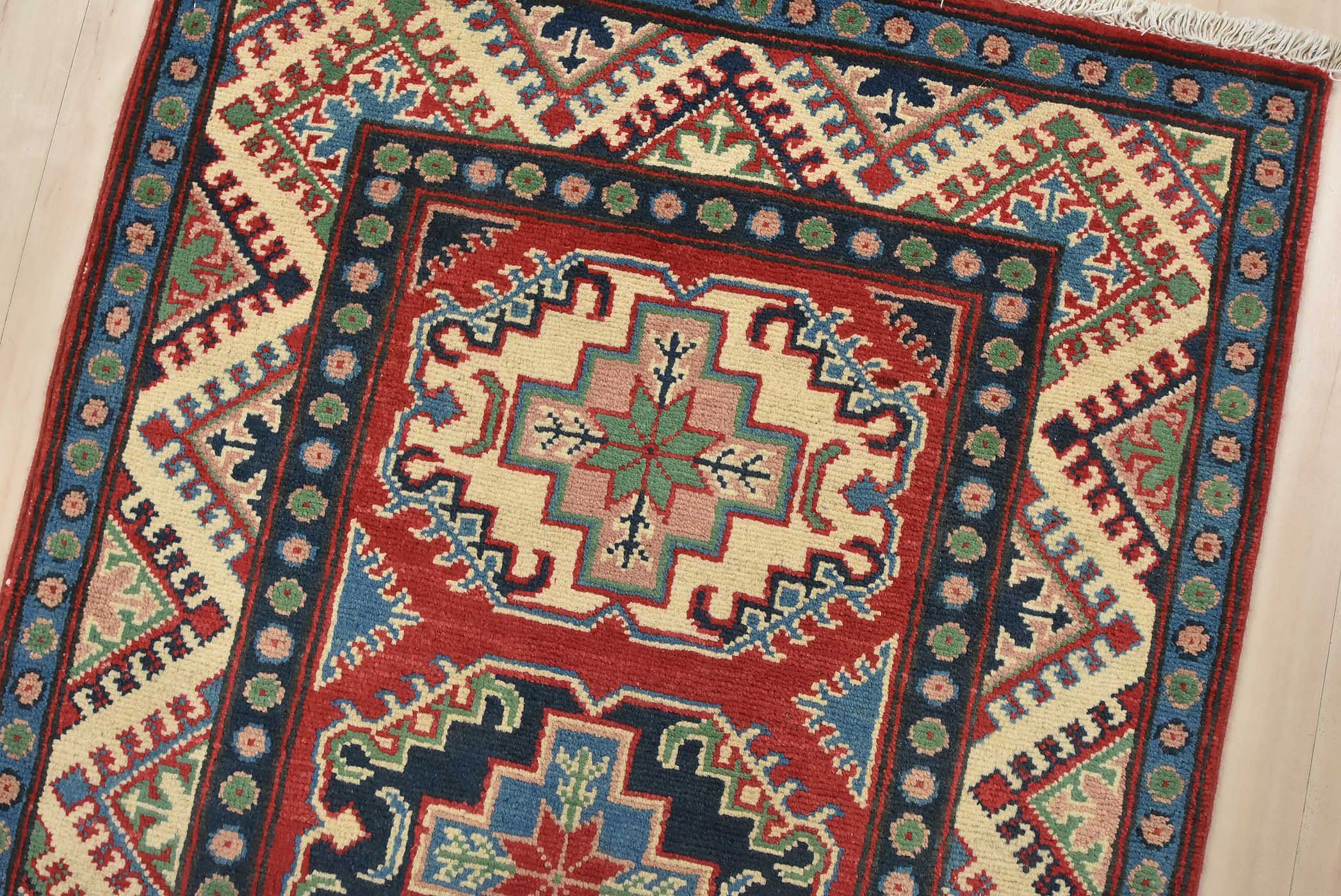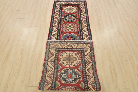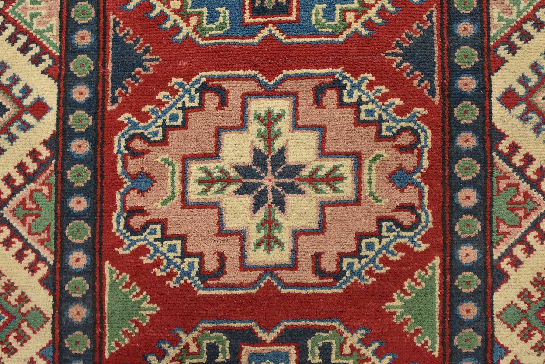 A tribal Caucasian Kazak runner hand-knotted with fine wool on a cotton foundation. This rug features a row of geometric medallions set against a red background. It is new and in excellent condition.