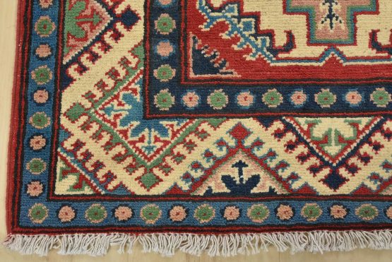 Original antique Kazak rugs from the Caucasus region inspire the creation of new Kazak rugs. These rugs are woven with fine wool using traditional Kazak patterns and finished with a low-cut pile to give them an authentic vintage look.