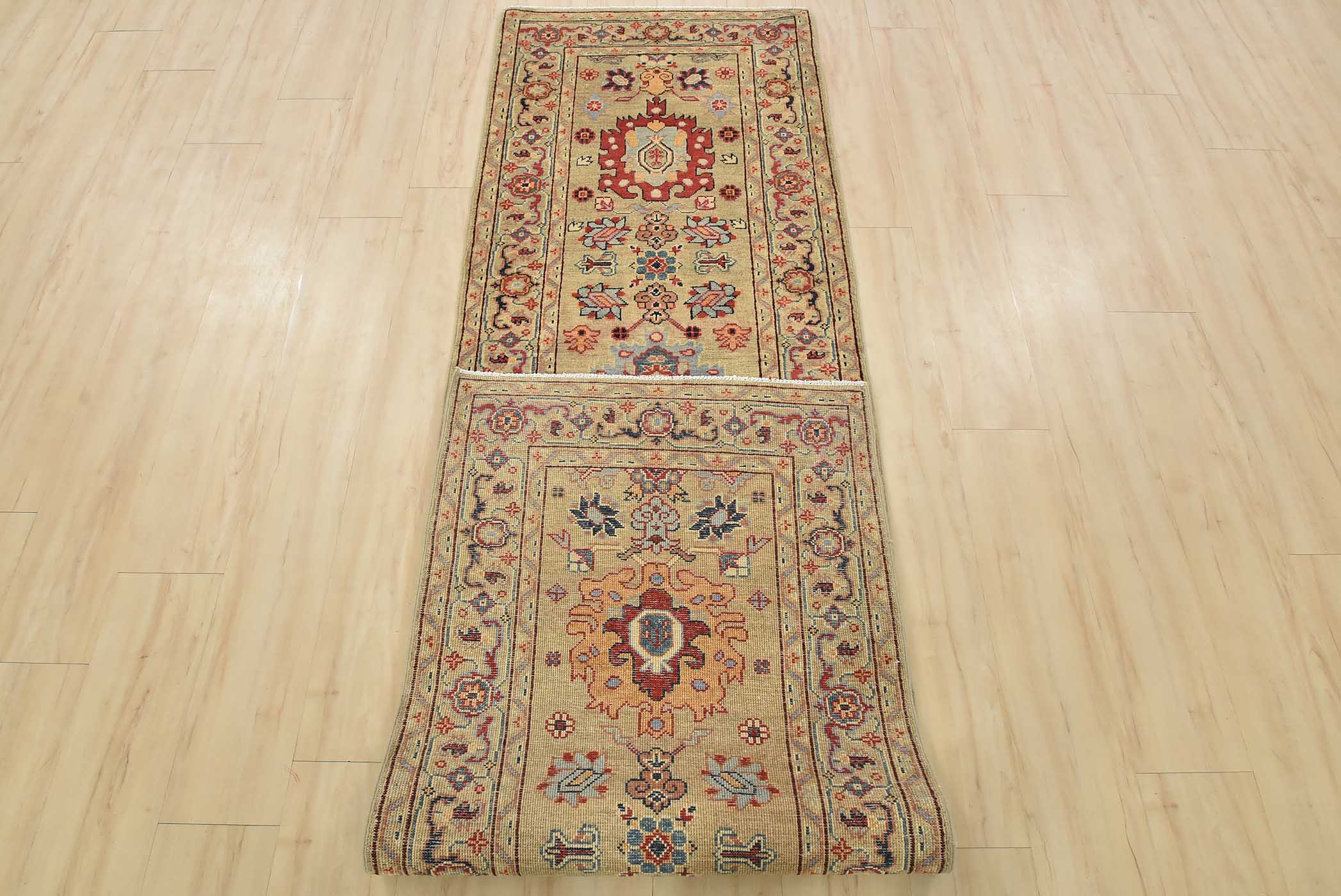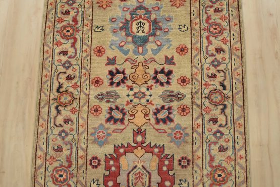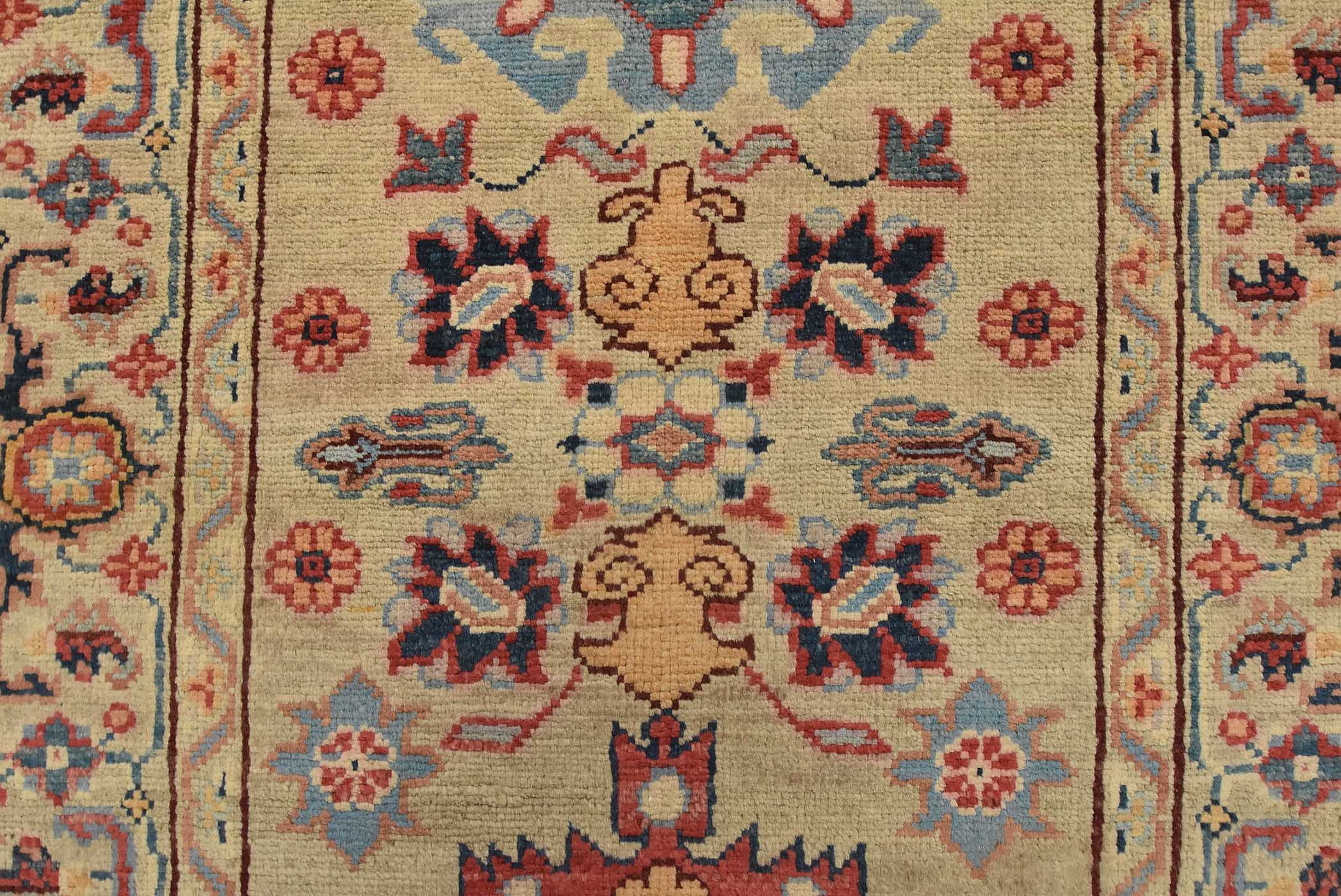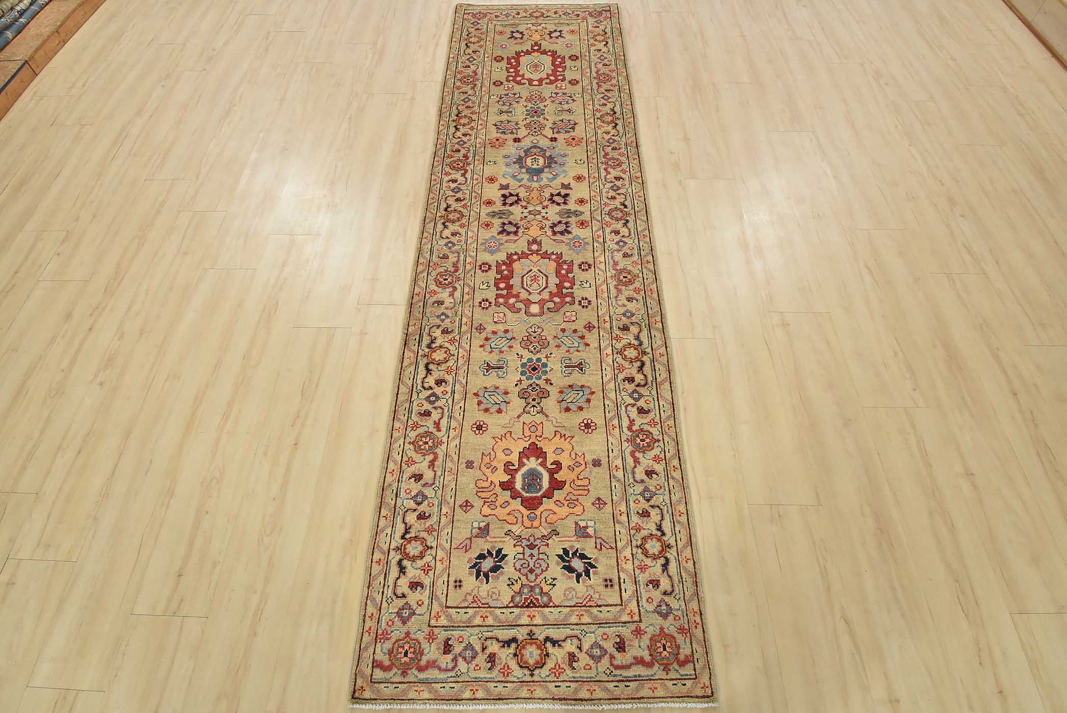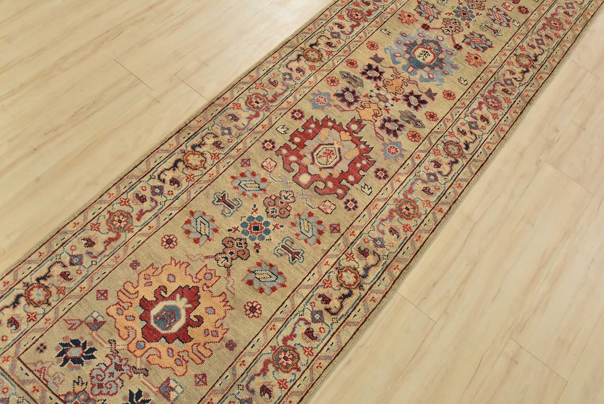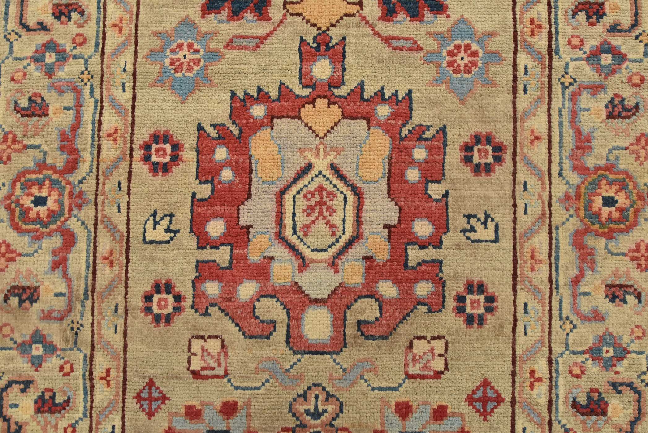 A traditional tribal Caucasian Kazak runner hand-knotted with fine wool on a cotton foundation. This rug features a row of medallions surrounded by small geometric floral motifs set against a beige background. It is new and in excellent condition.