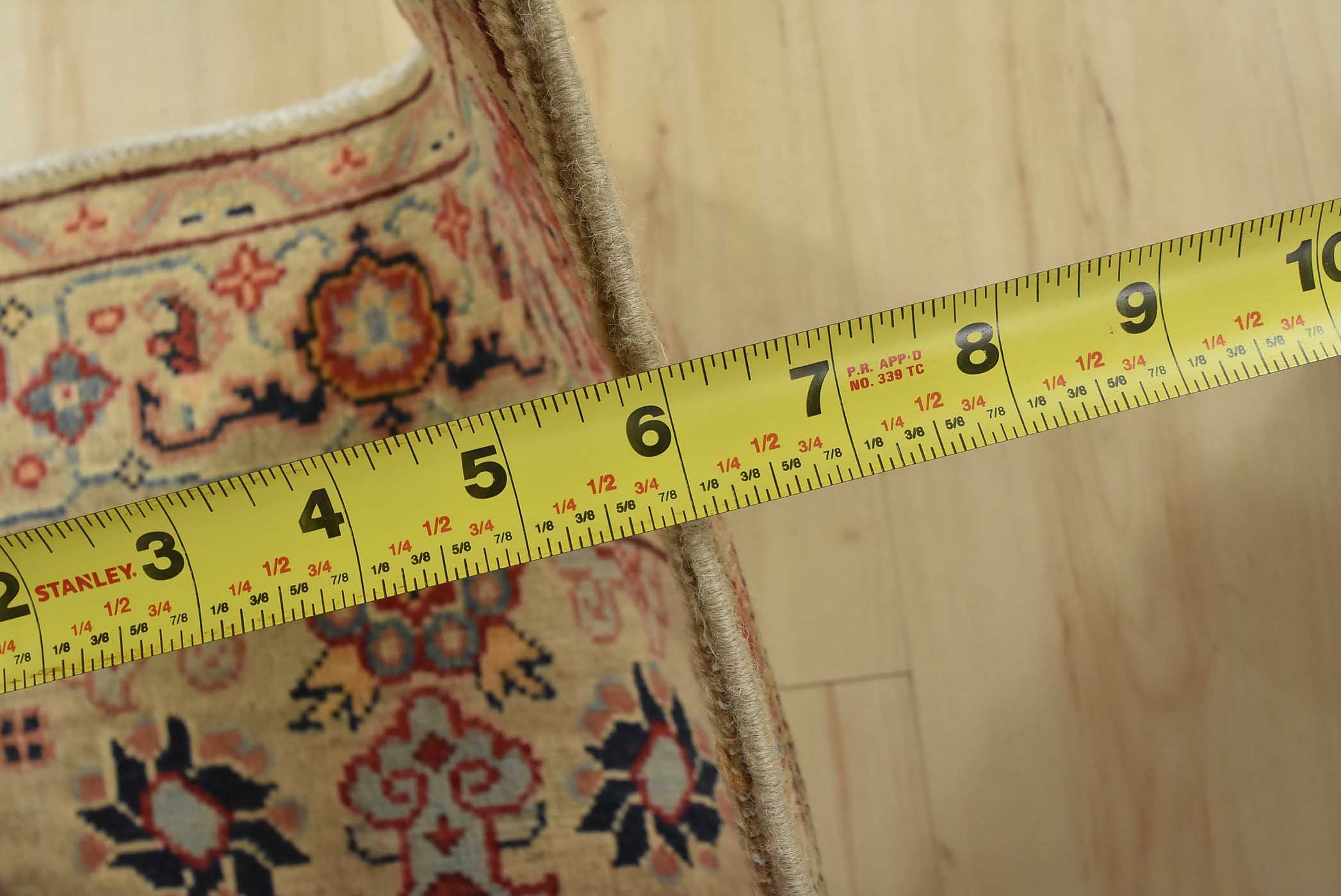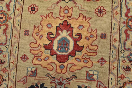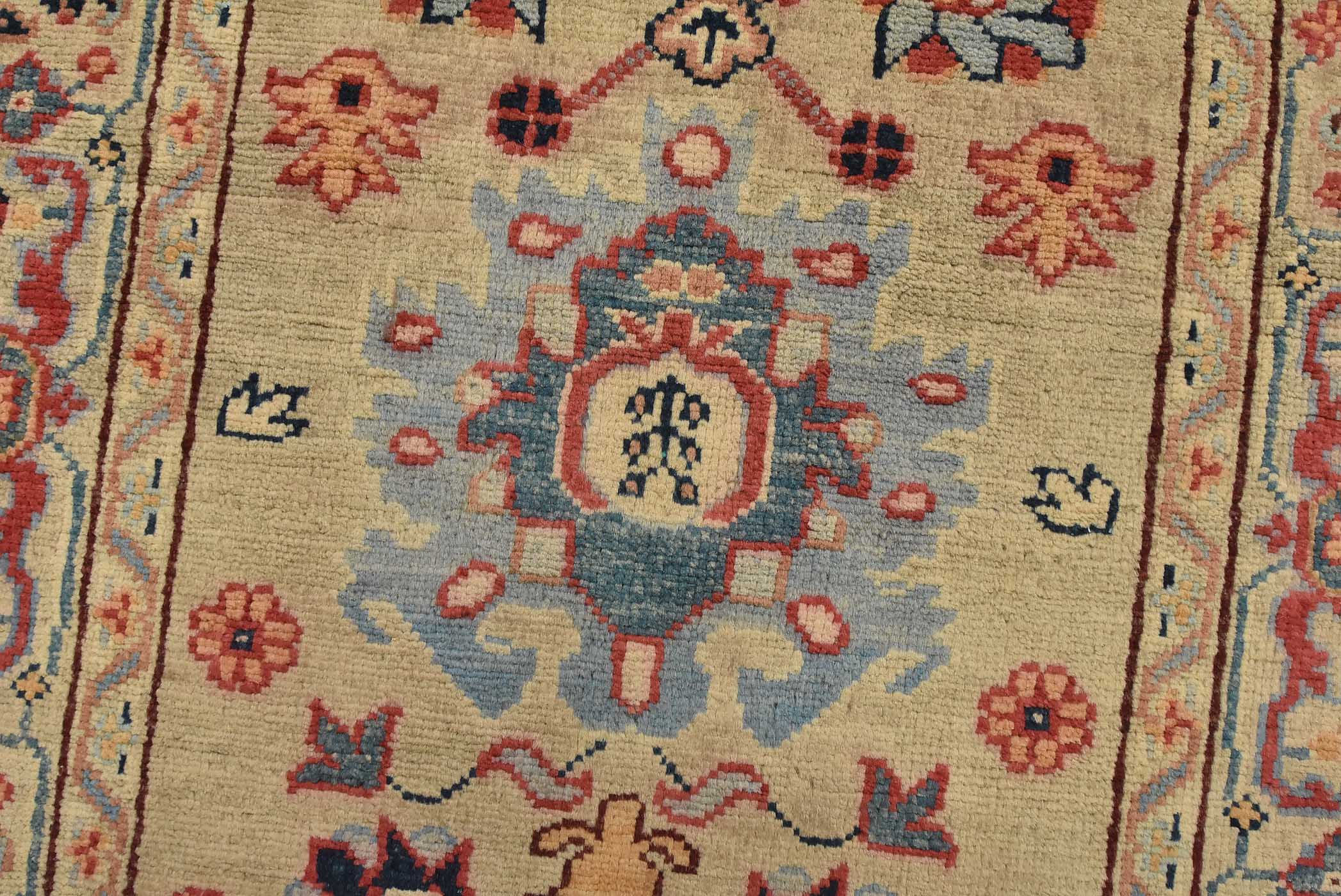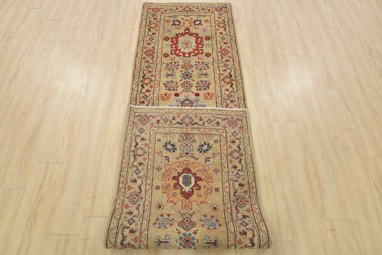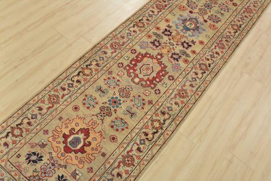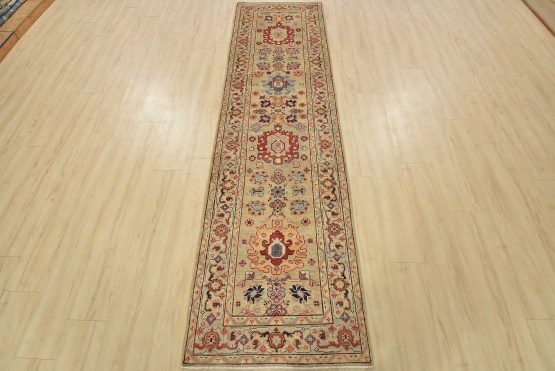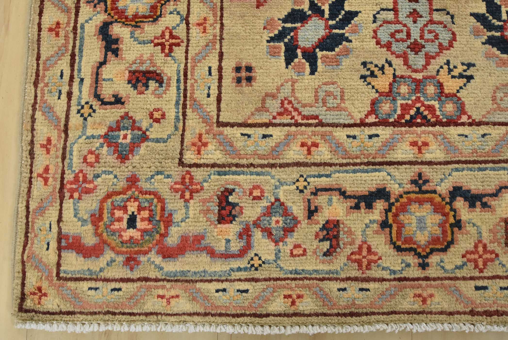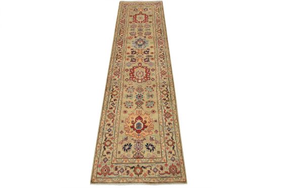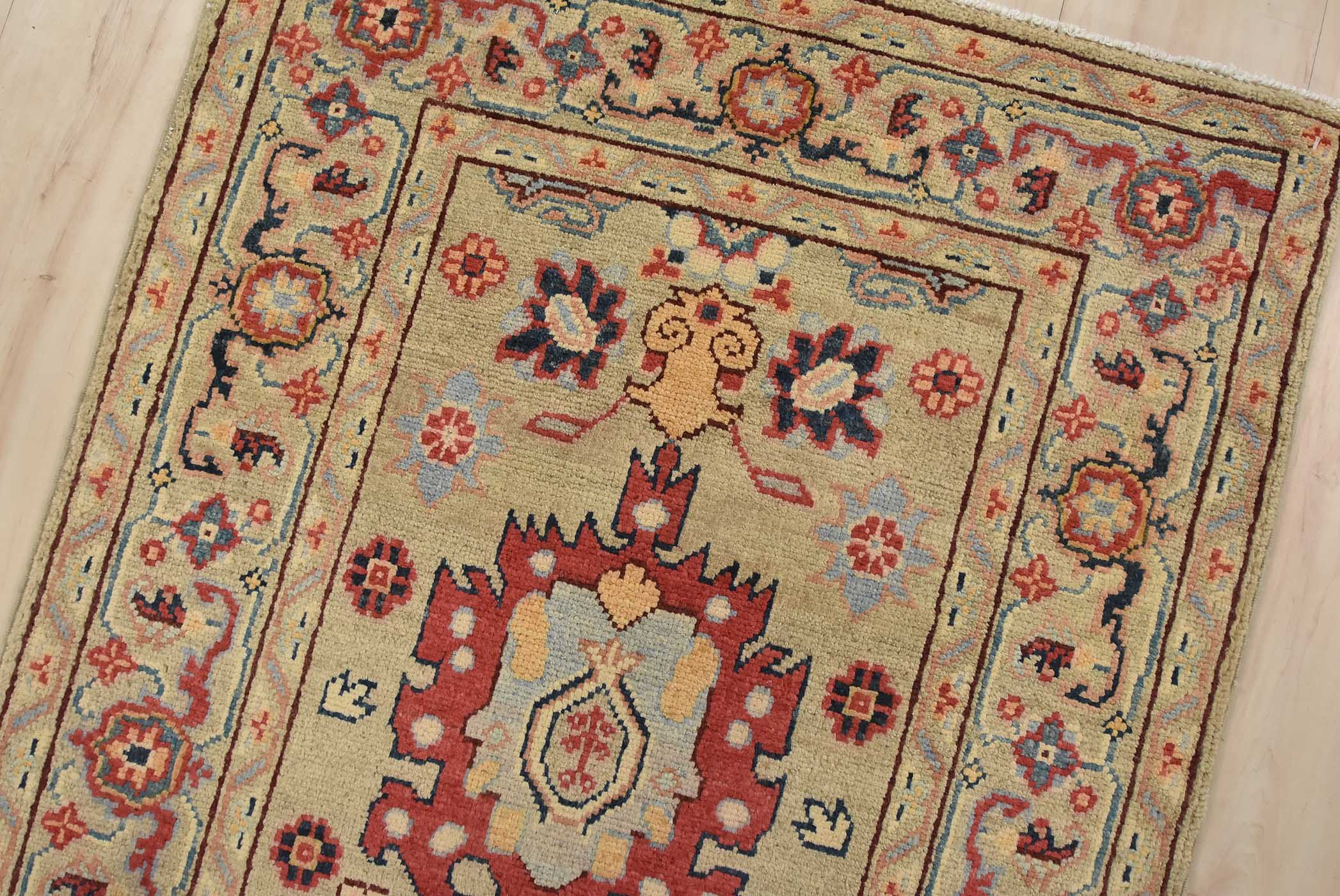 A traditional tribal Caucasian Kazak runner hand-knotted with fine wool on a cotton foundation. This rug features a row of medallions surrounded by small geometric floral motifs set against a beige background. It is new and in excellent condition.
