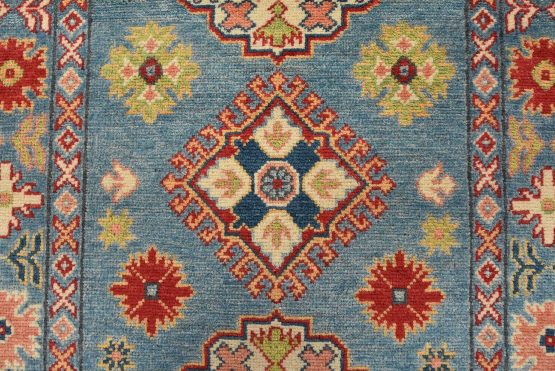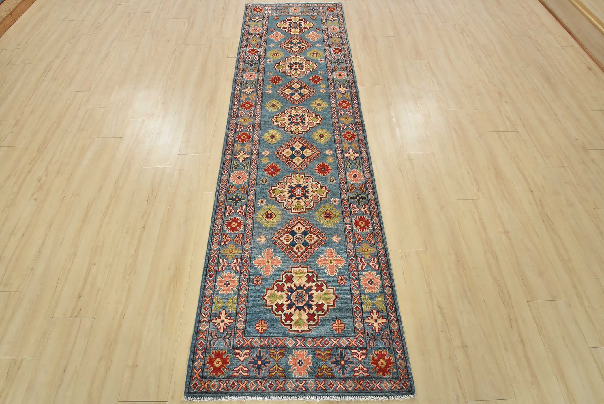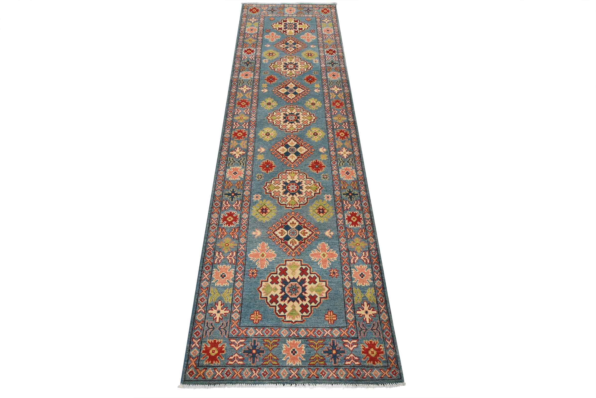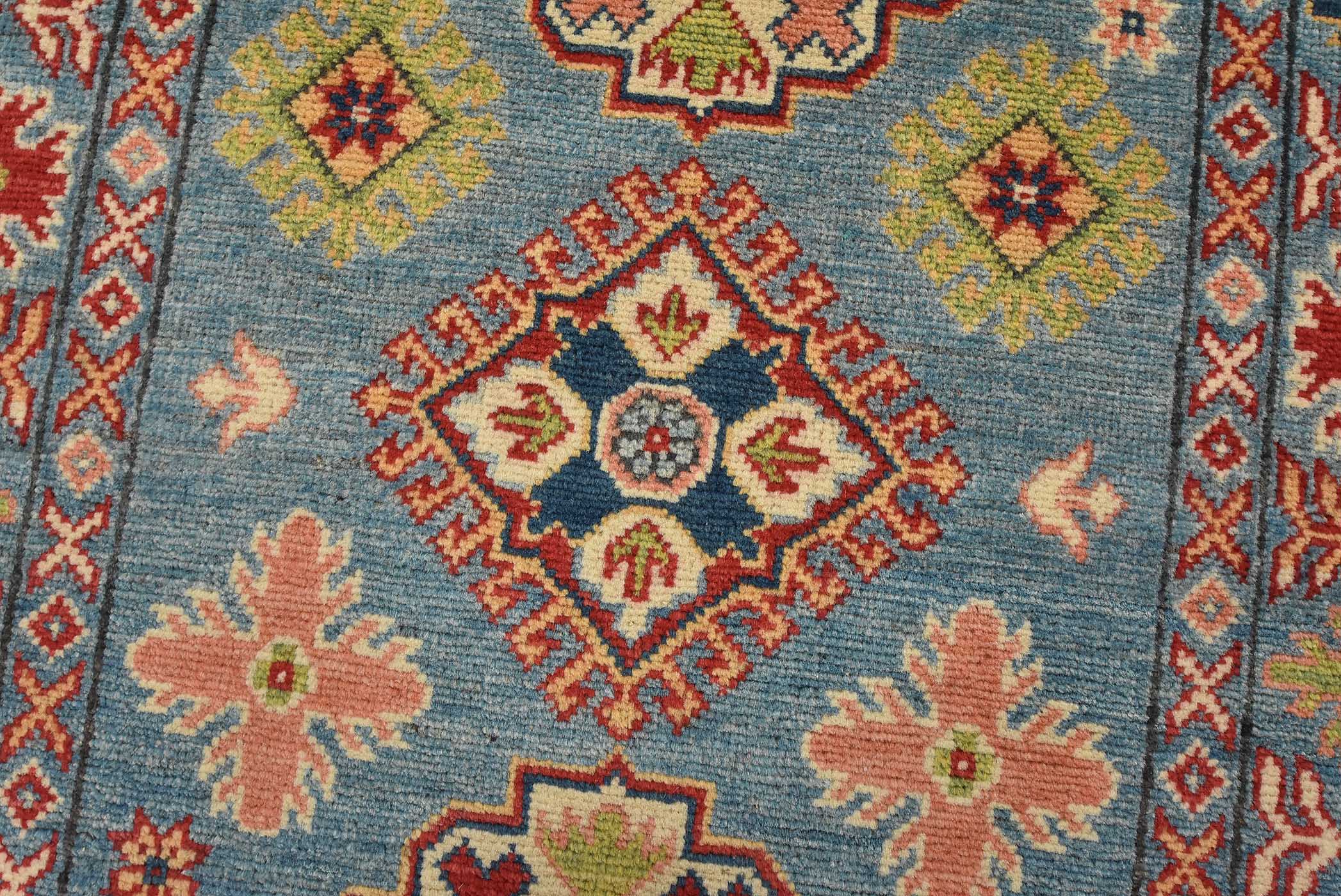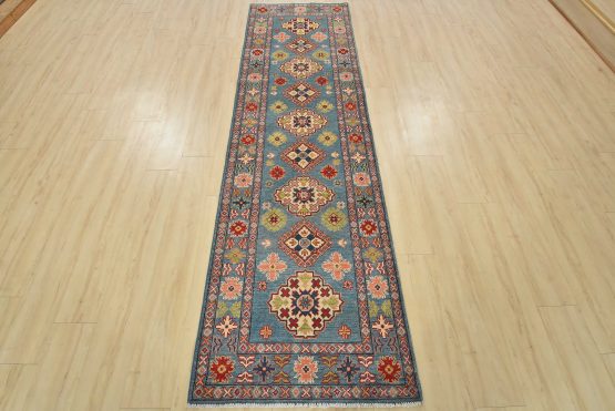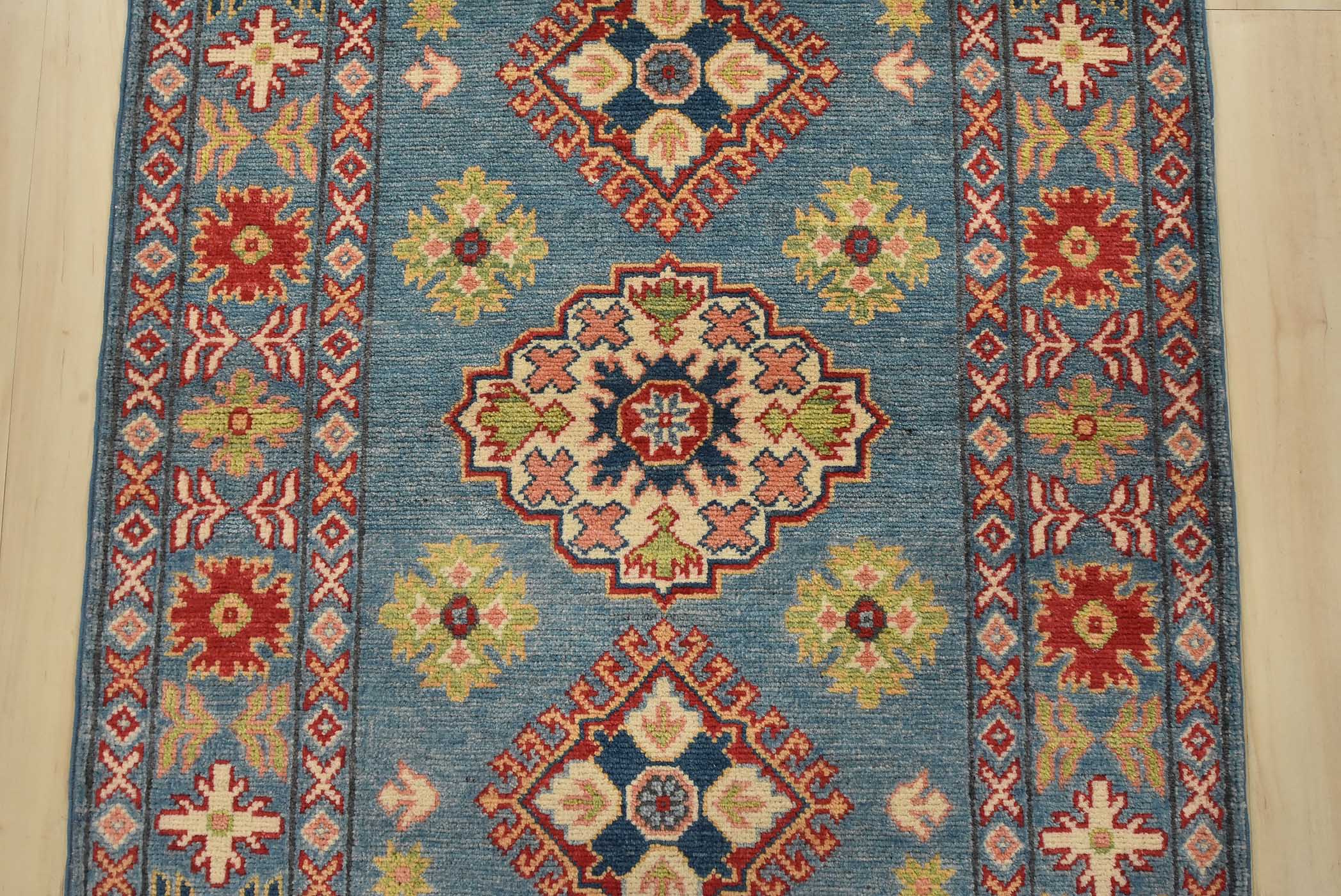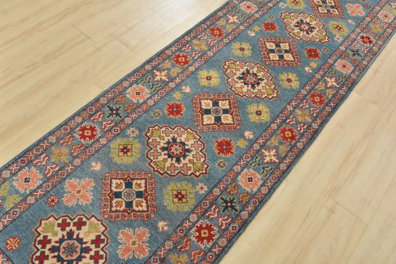 A tribal Caucasian Kazak runner hand-knotted with fine wool on a cotton foundation. This rug features a row of geometric medallions surrounded by small geometric motifs set against a blue background. It is new and in excellent condition.