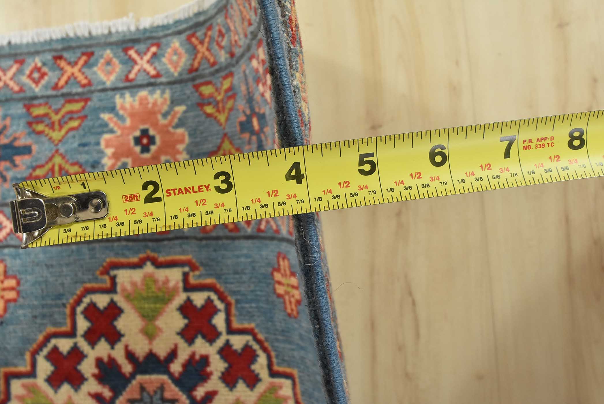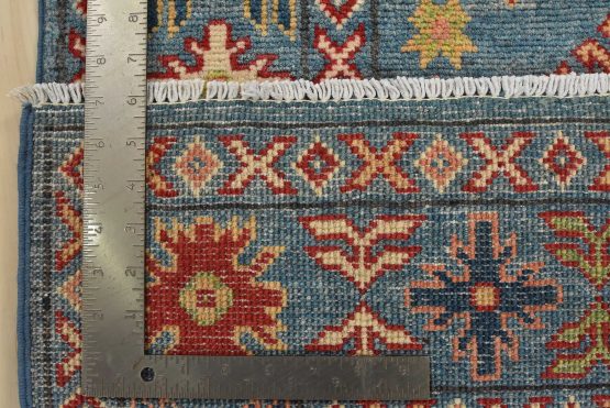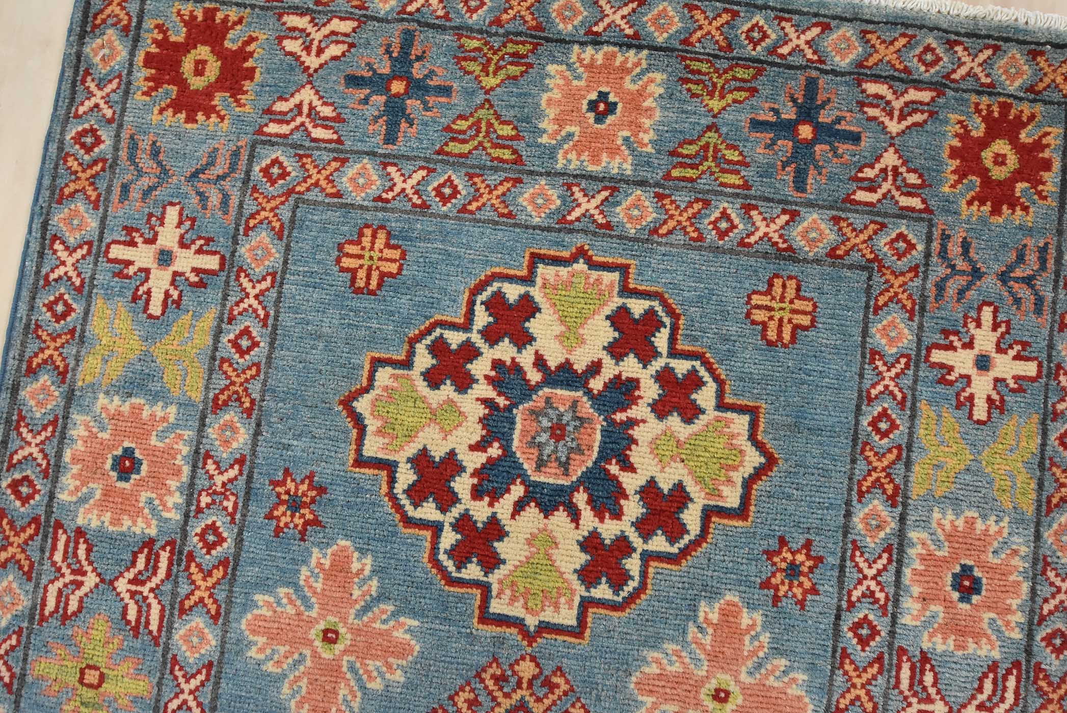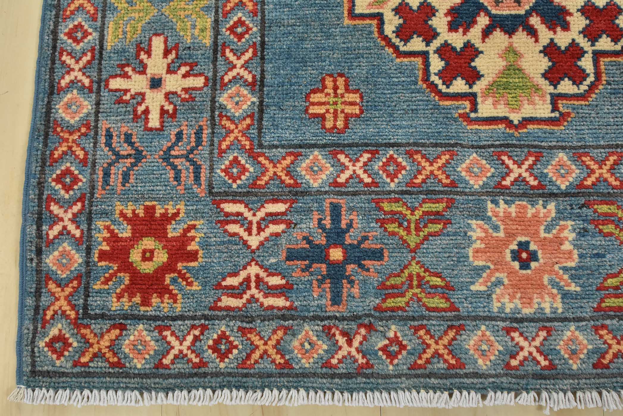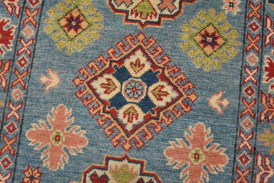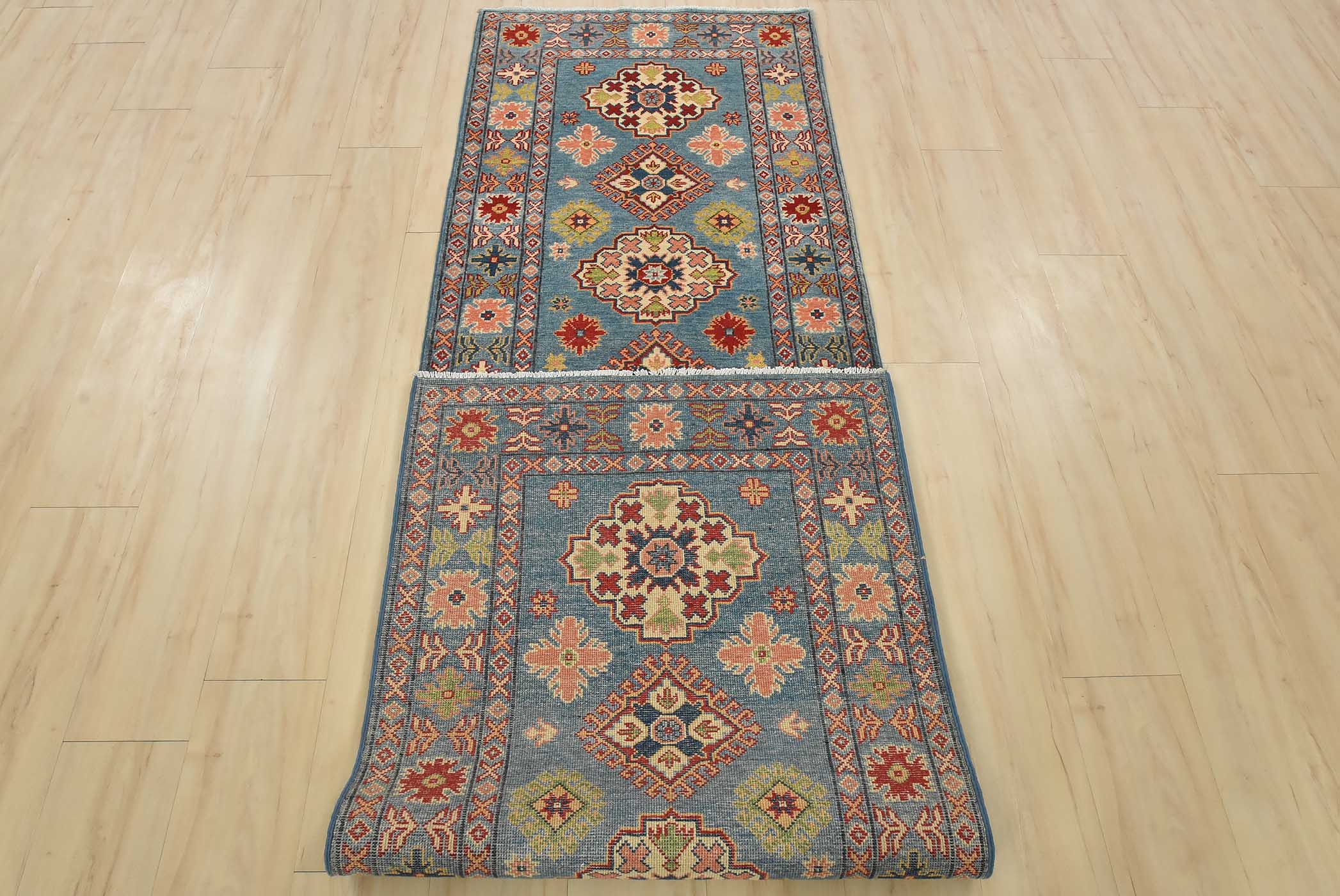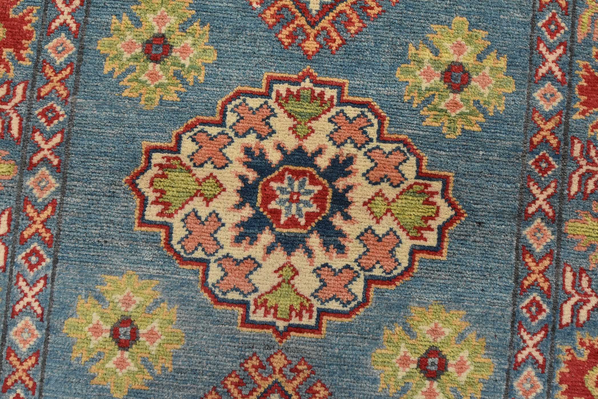 A tribal Caucasian Kazak runner hand-knotted with fine wool on a cotton foundation. This rug features a row of geometric medallions surrounded by small geometric motifs set against a blue background. It is new and in excellent condition.