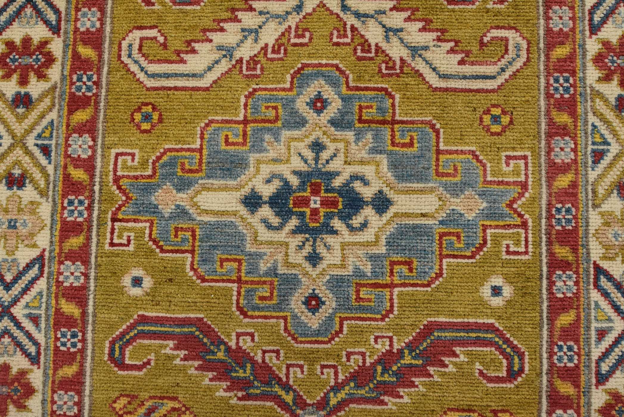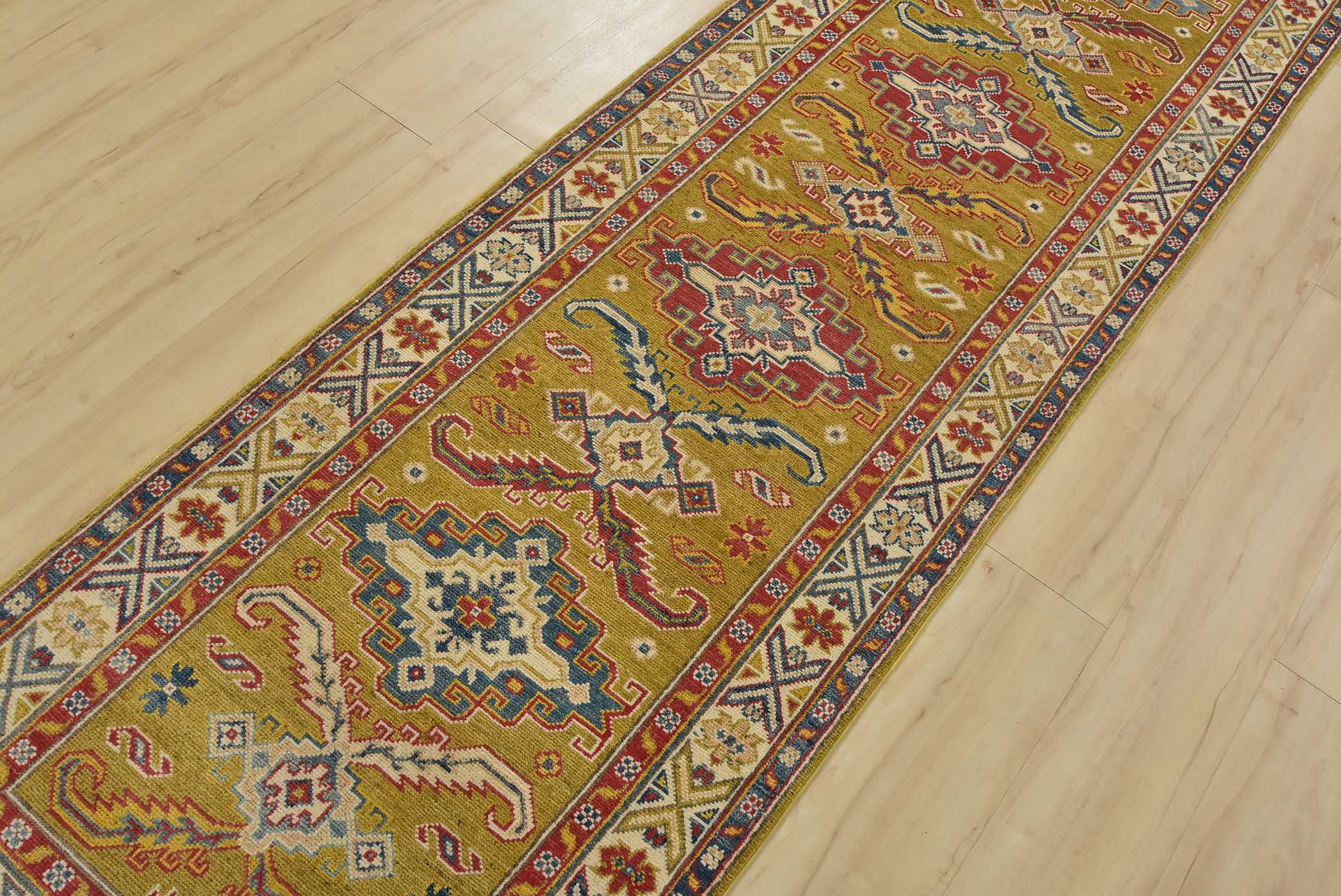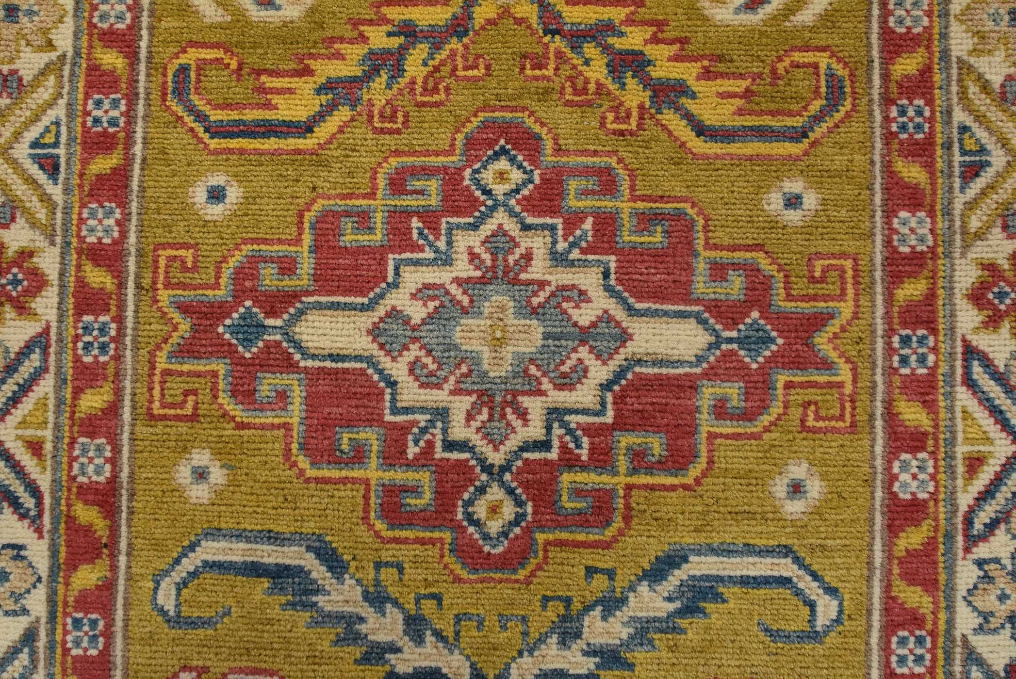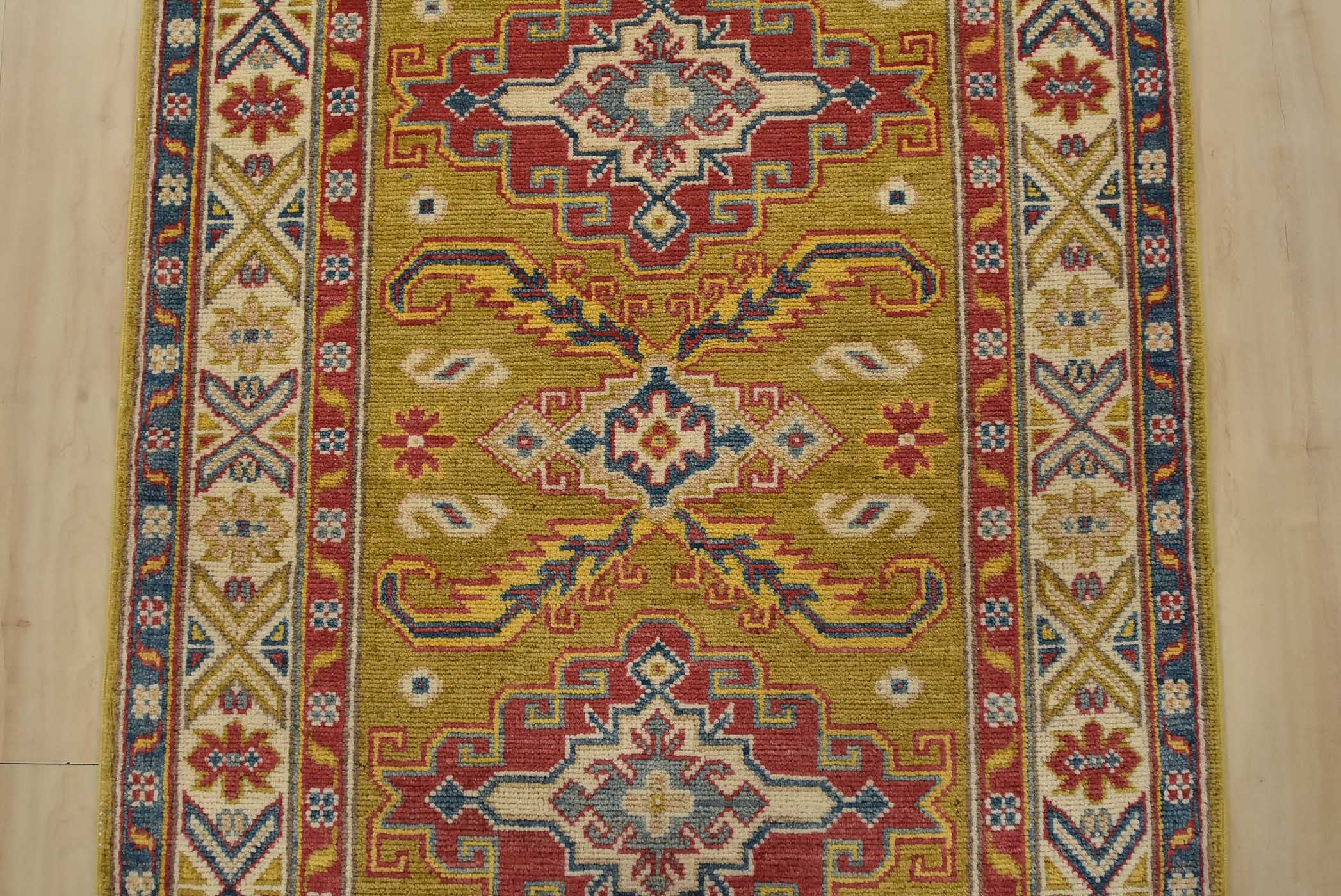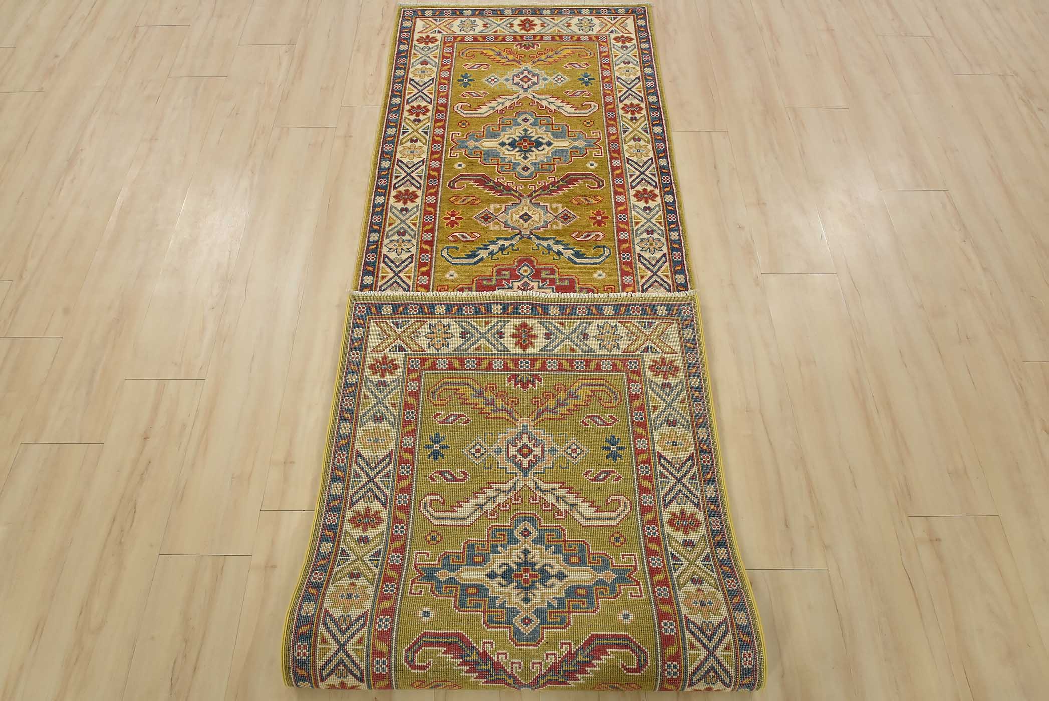 A tribal Caucasian Kazak runner hand-knotted with fine wool on a cotton foundation. This rug features a row of geometric medallions surrounded by botanical motifs set against a green background. It is new and in excellent condition.