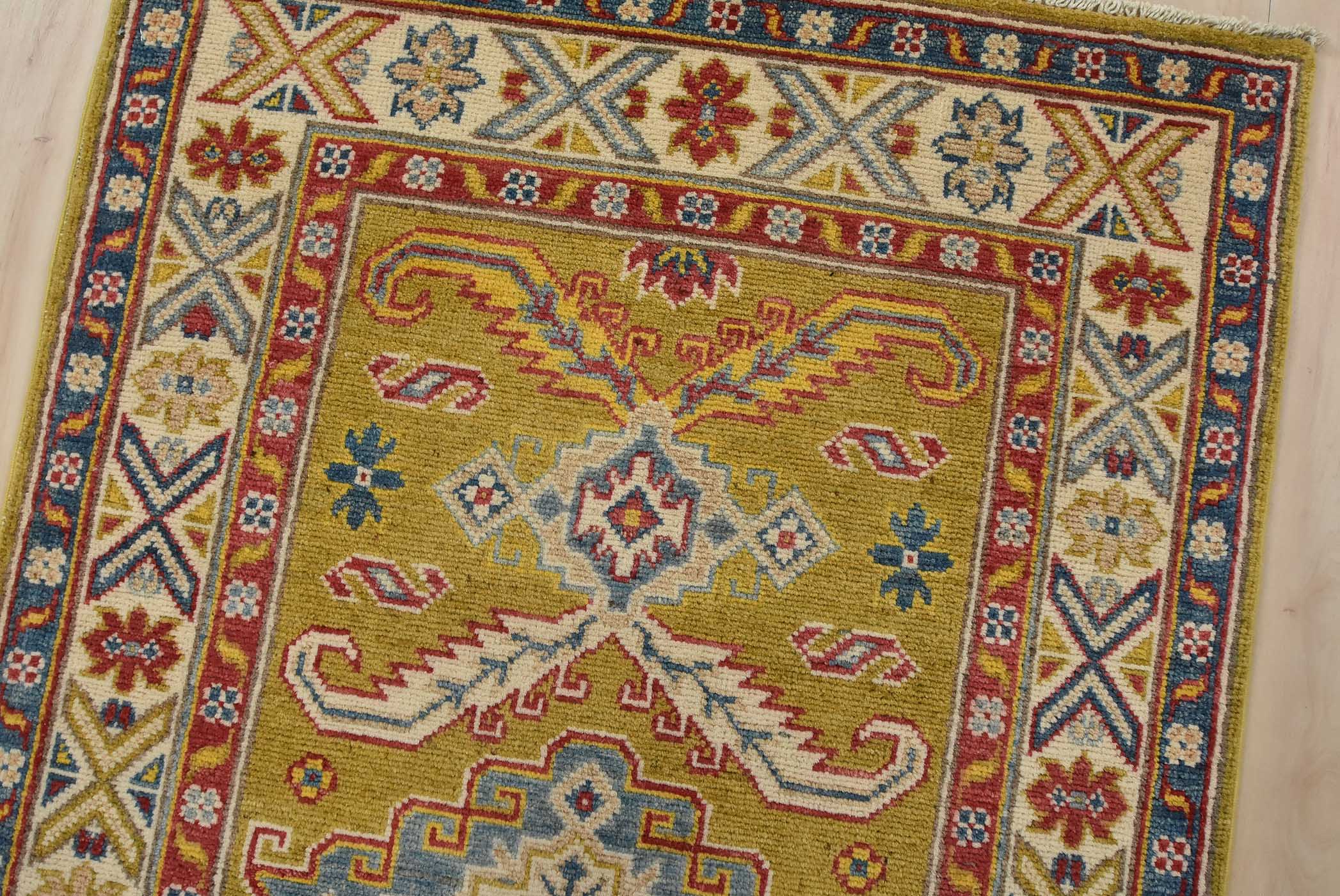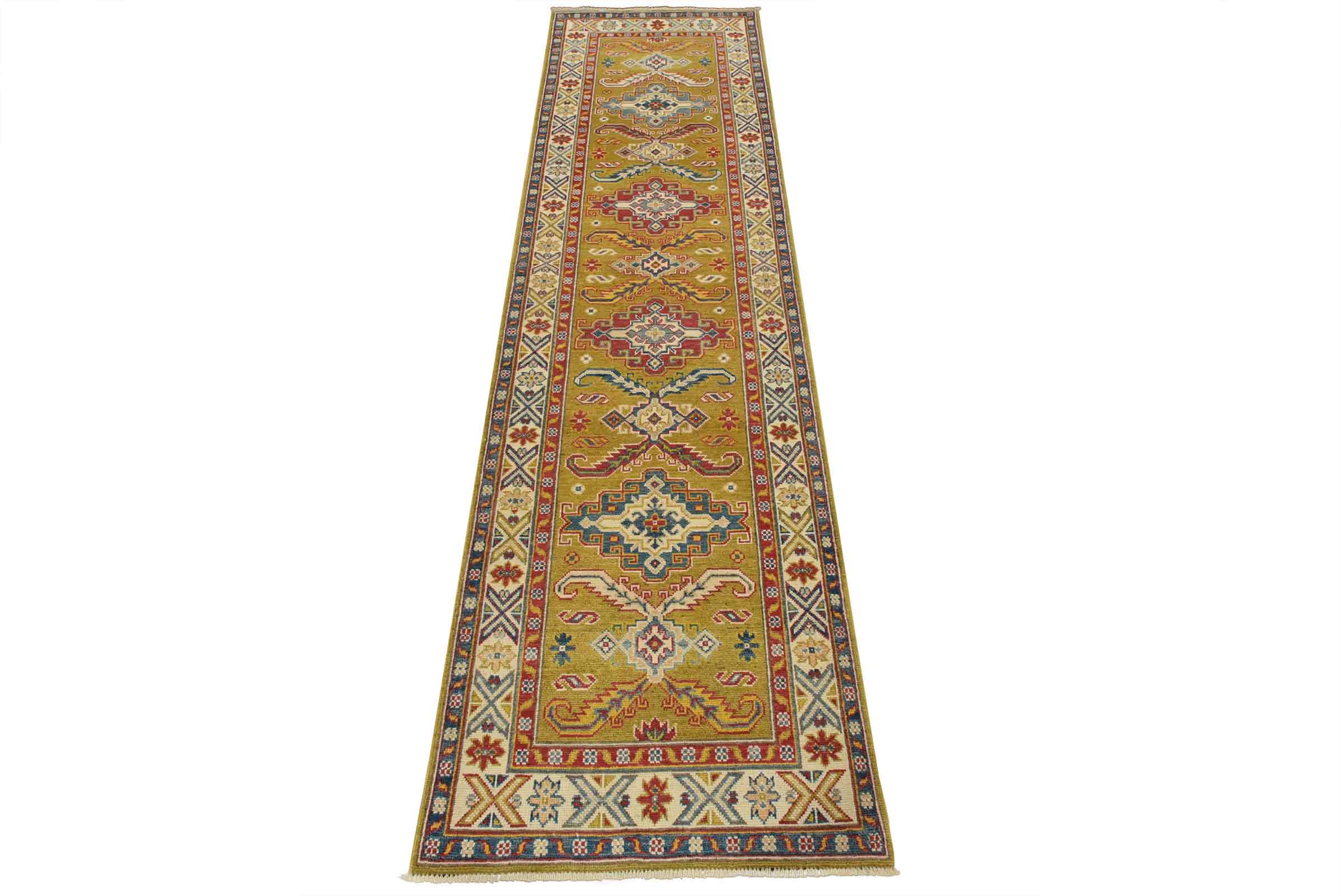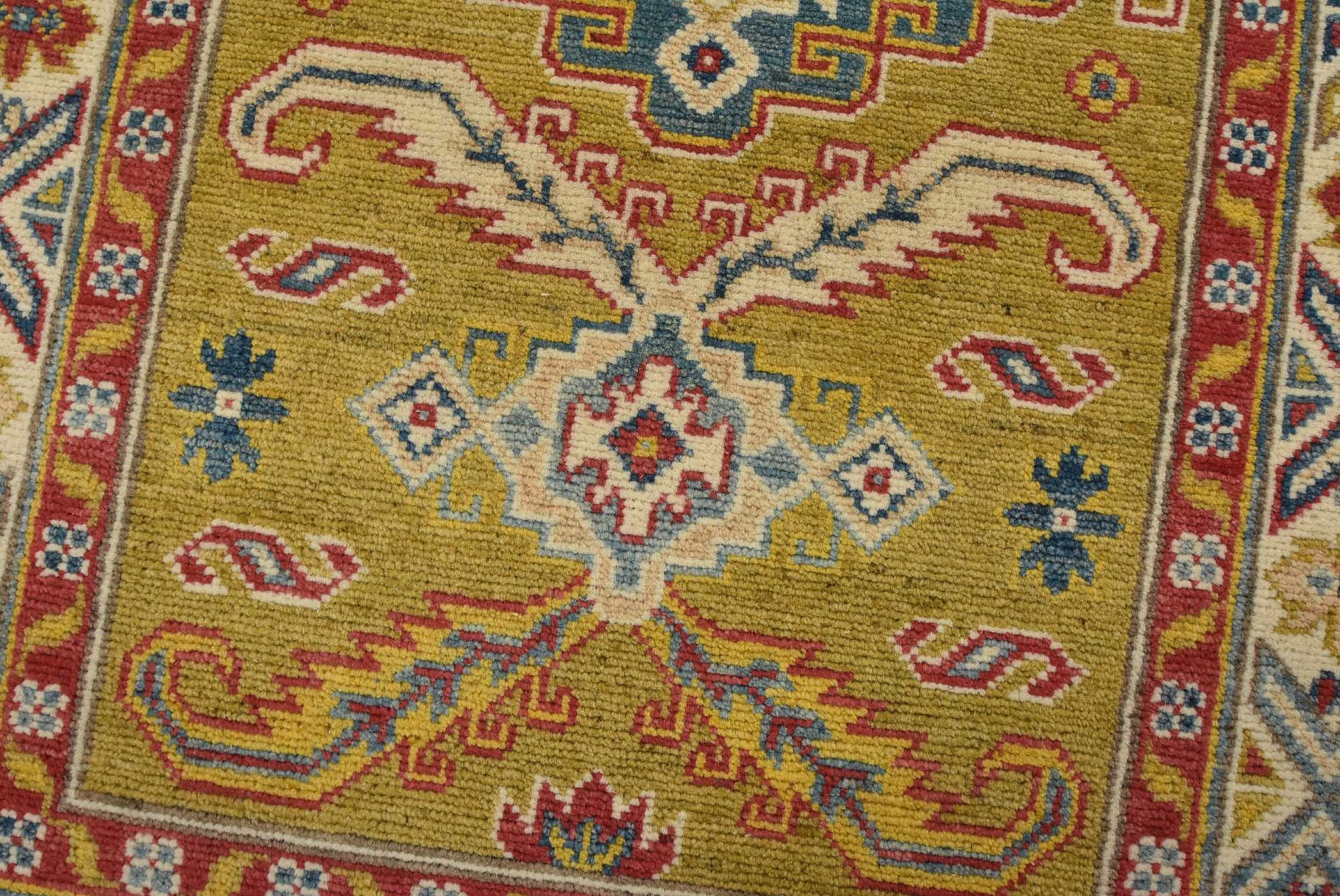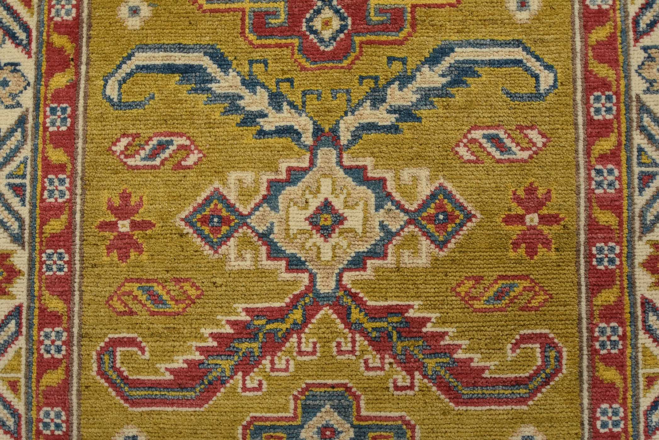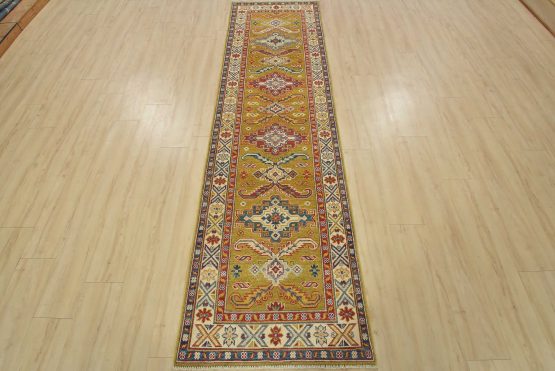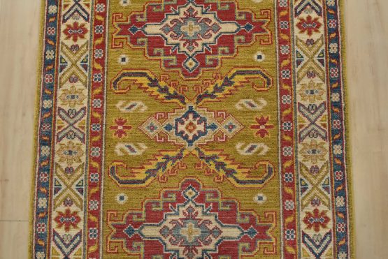 A tribal Caucasian Kazak runner hand-knotted with fine wool on a cotton foundation. This rug features a row of geometric medallions surrounded by botanical motifs set against a green background. It is new and in excellent condition.