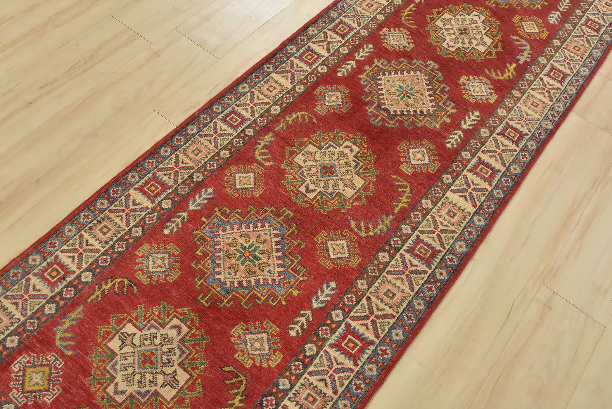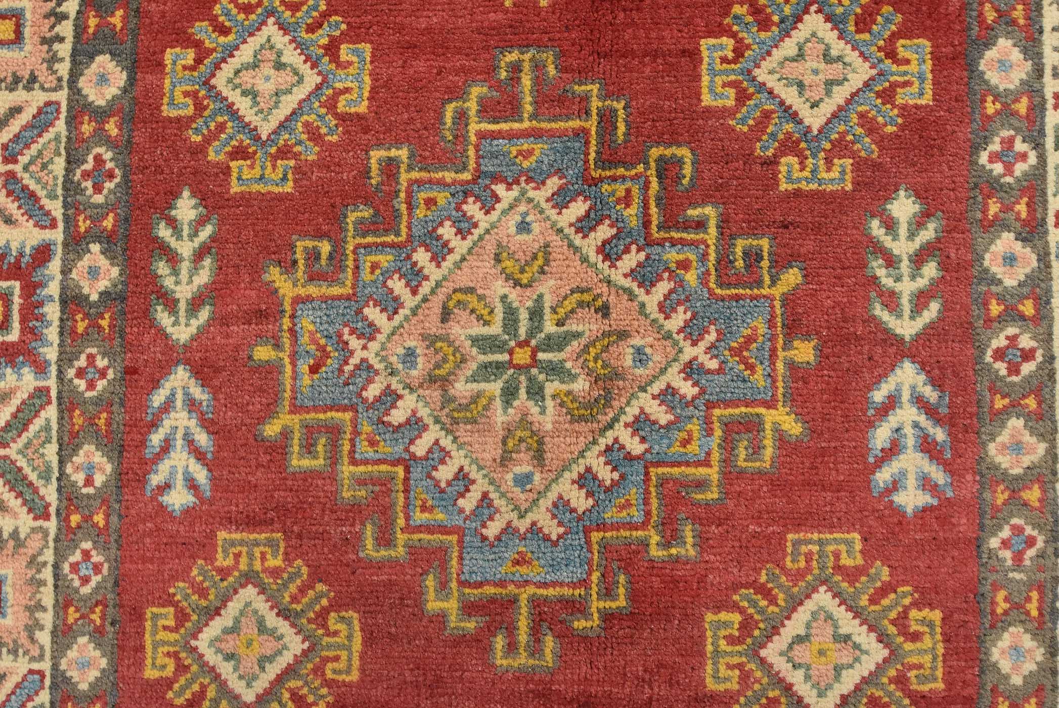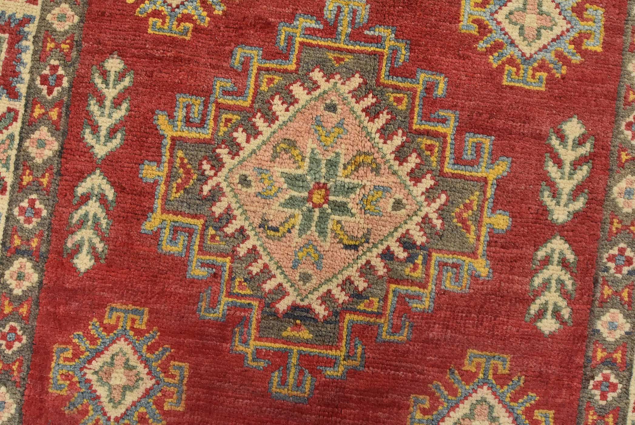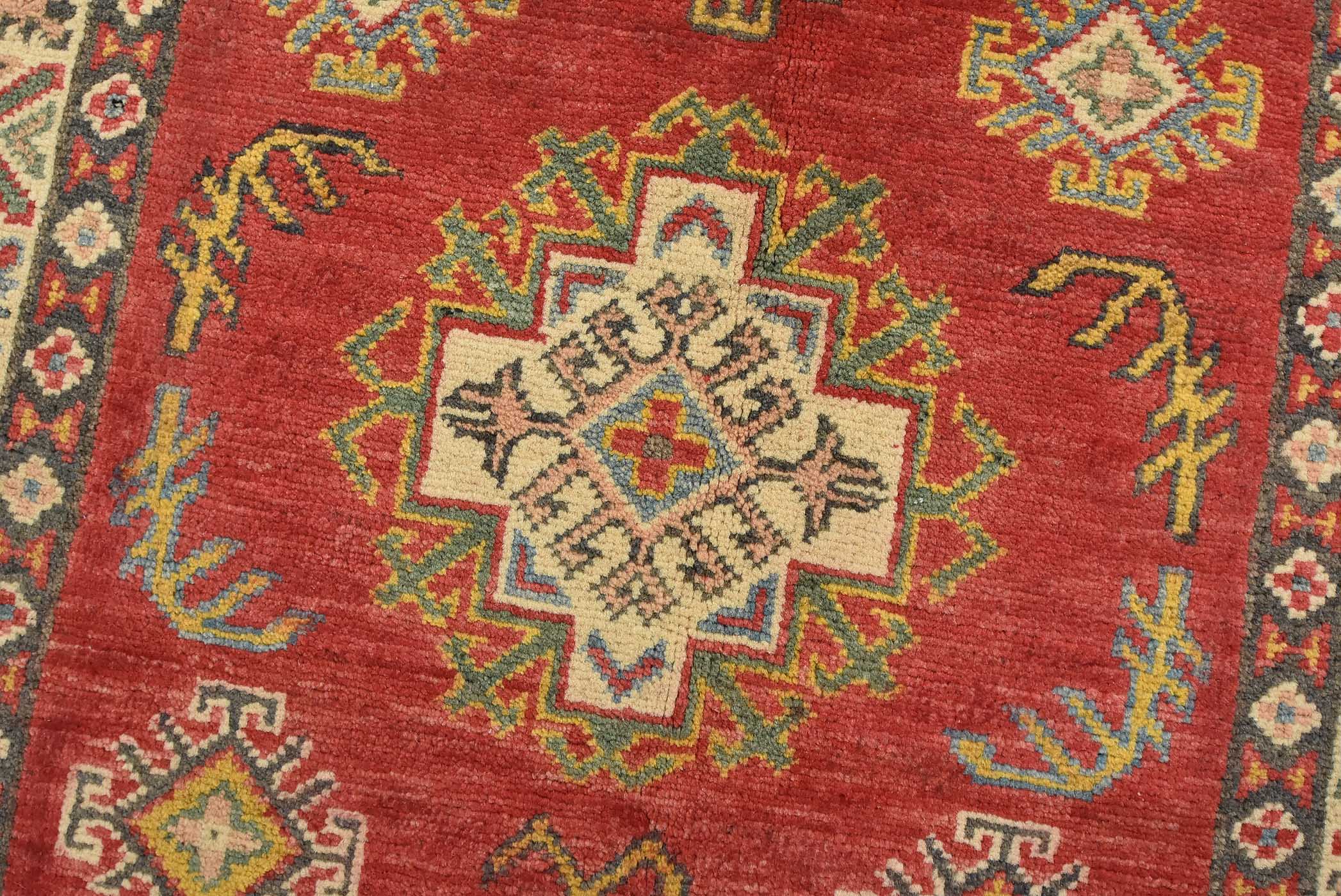 A tribal Caucasian Kazak runner hand-knotted with fine wool on a cotton foundation. This rug features a row of geometric medallions surrounded by by small geometric motifs set against a red background. It is new and in excellent condition.