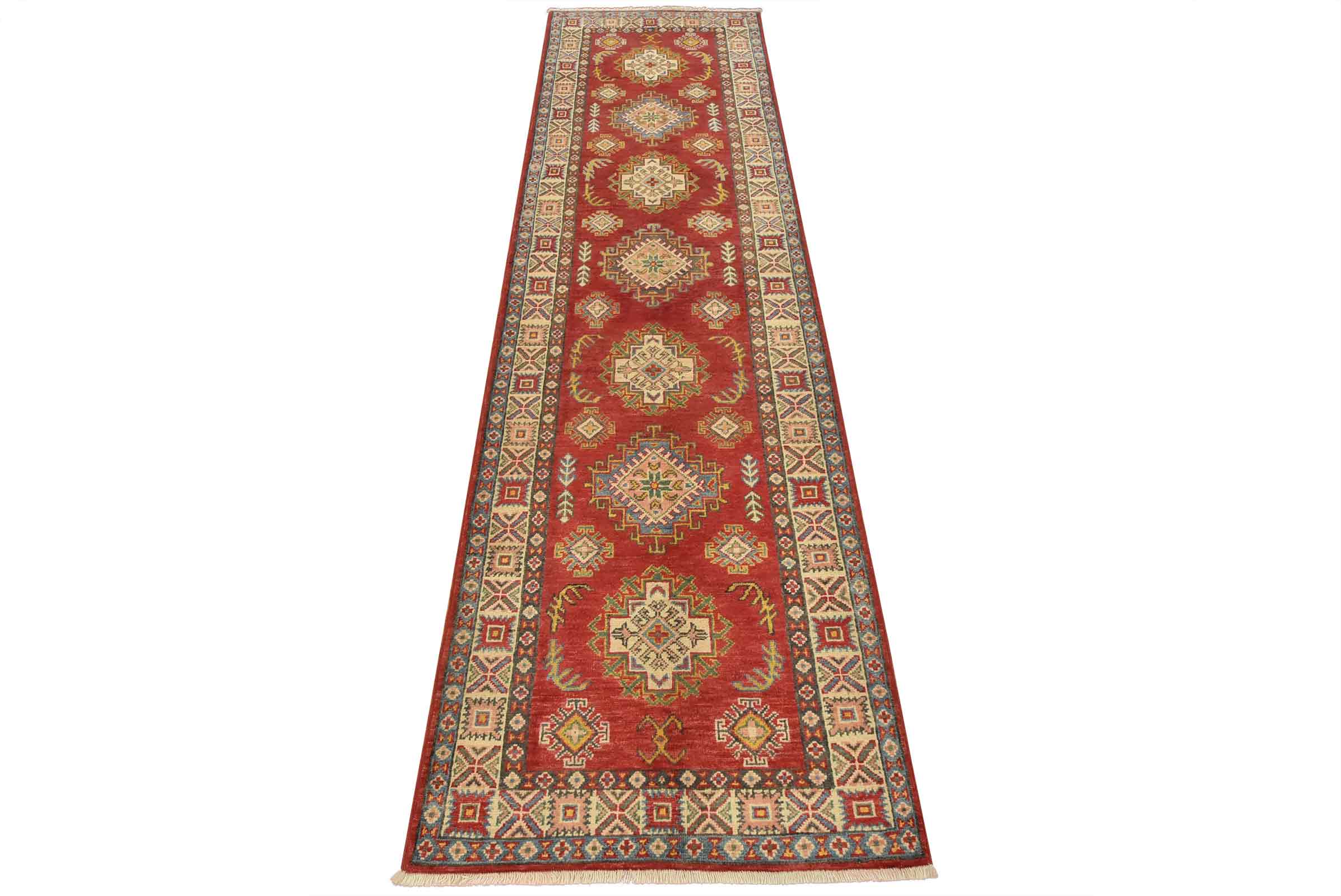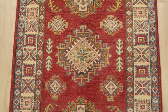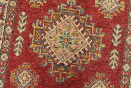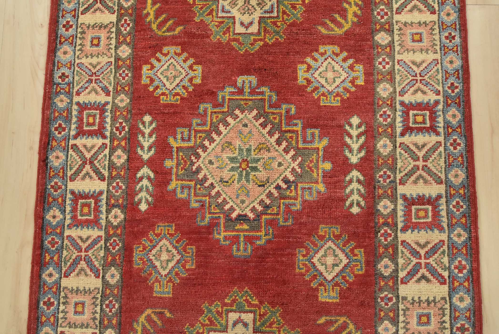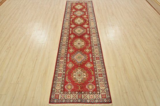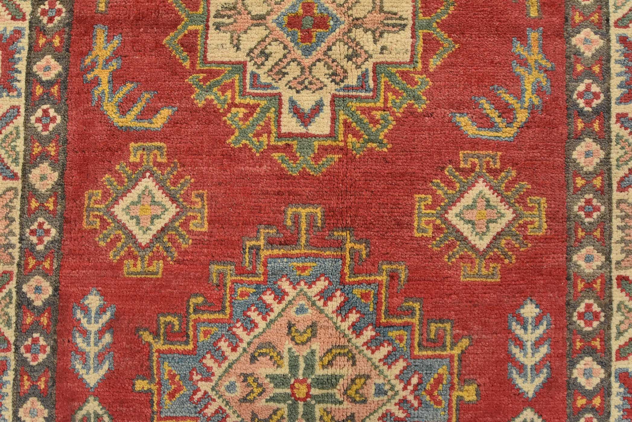 A tribal Caucasian Kazak runner hand-knotted with fine wool on a cotton foundation. This rug features a row of geometric medallions surrounded by by small geometric motifs set against a red background. It is new and in excellent condition.