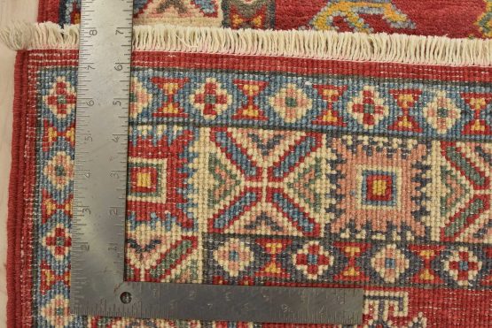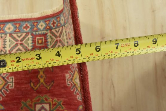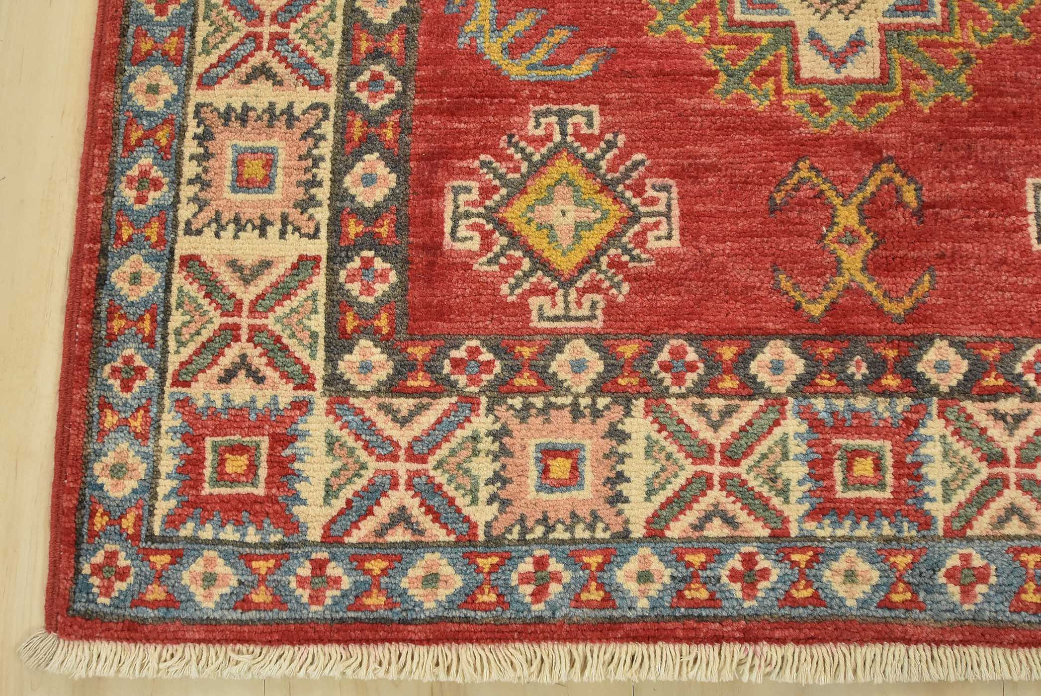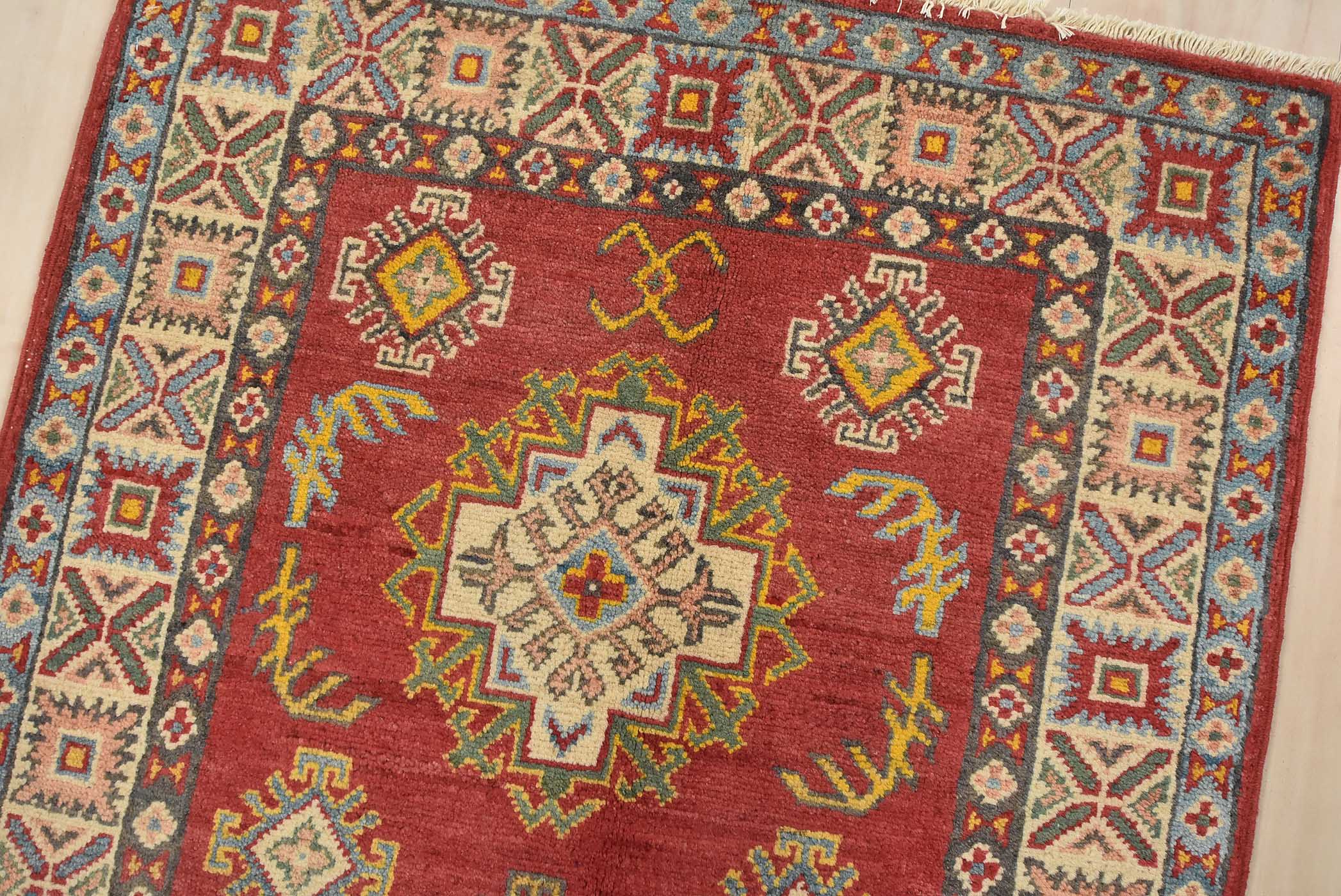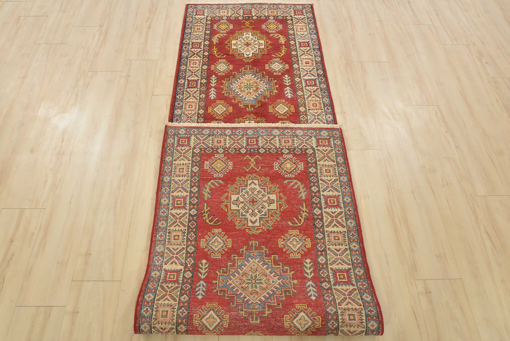 A tribal Caucasian Kazak runner hand-knotted with fine wool on a cotton foundation. This rug features a row of geometric medallions surrounded by by small geometric motifs set against a red background. It is new and in excellent condition.