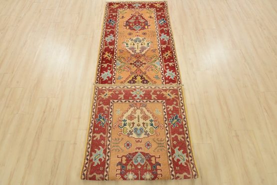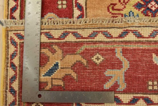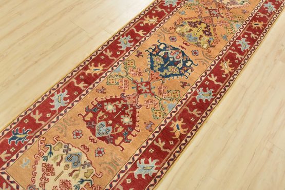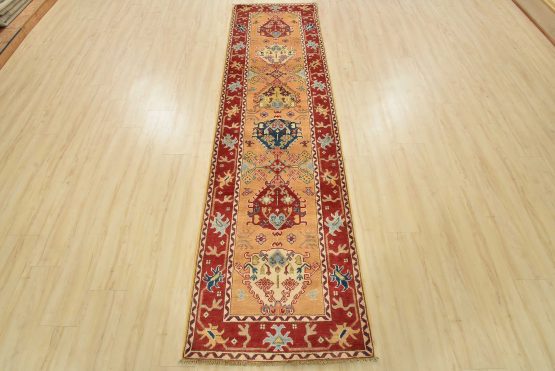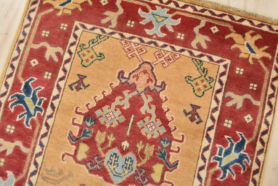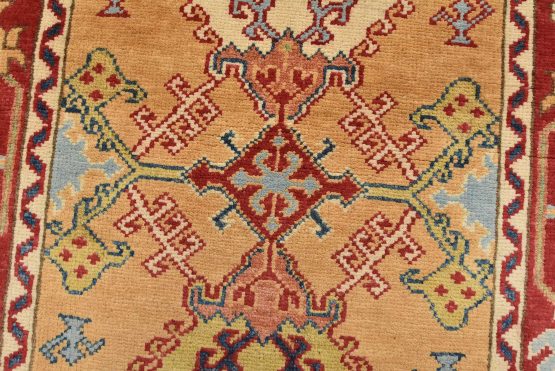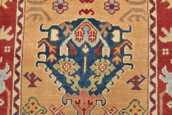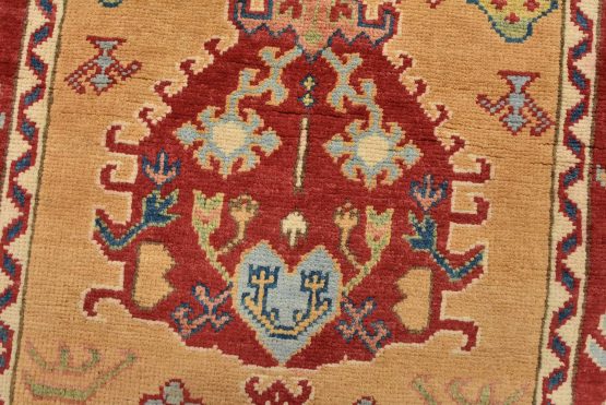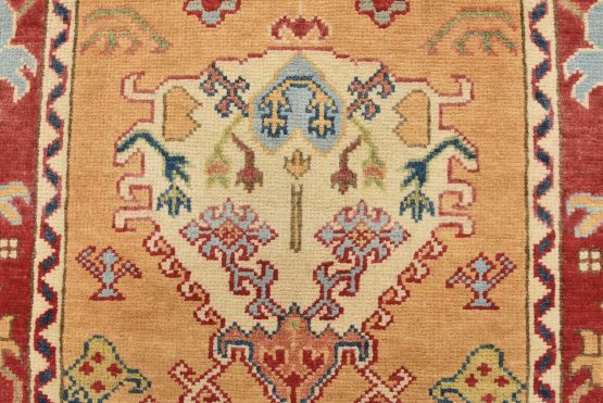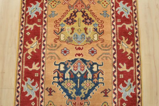 A traditional tribal Caucasian Kazak runner hand-knotted with an all-wool pile on a cotton foundation. This oriental rug features a row of geometric medallions set against a gold background. It is new and in excellent condition.