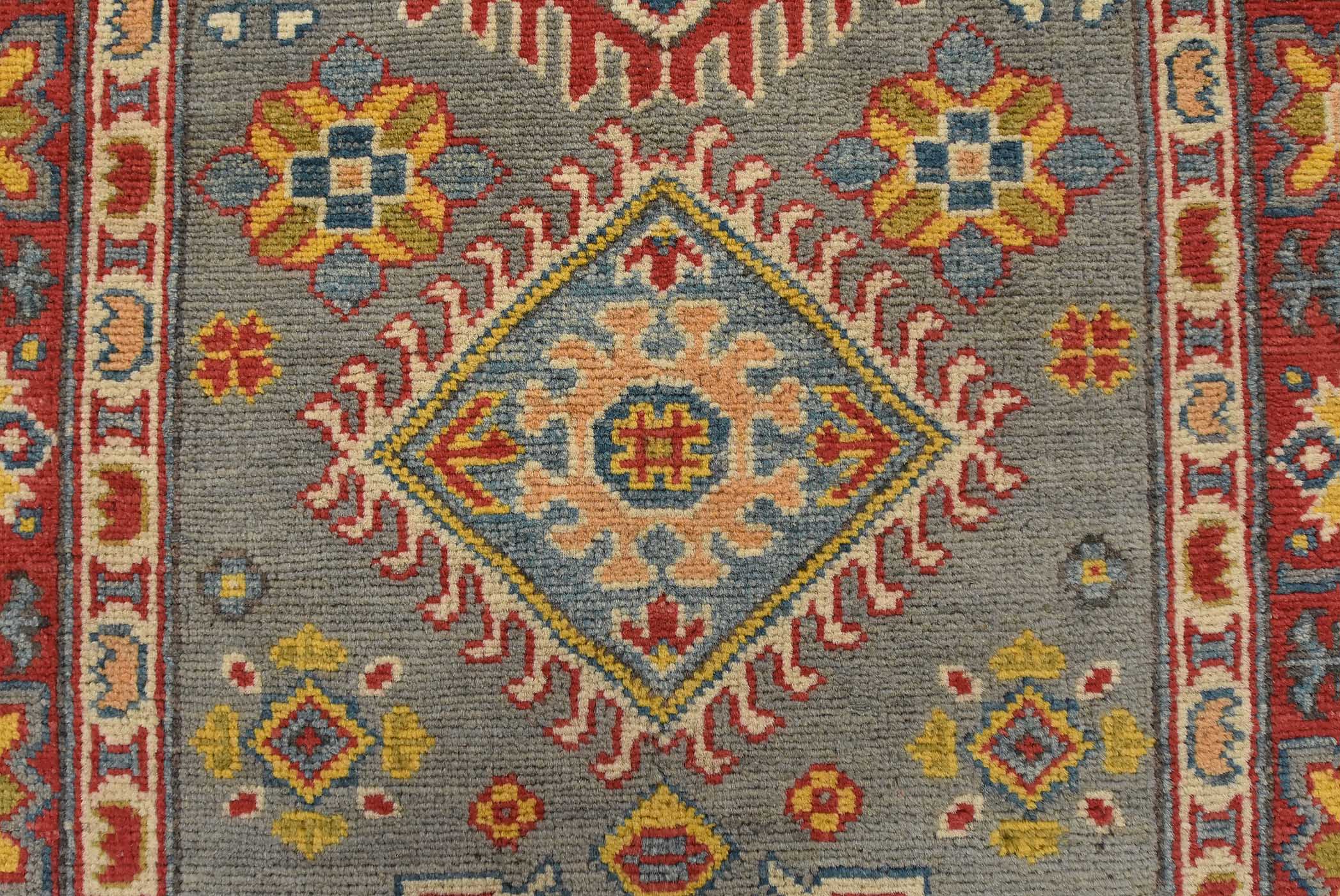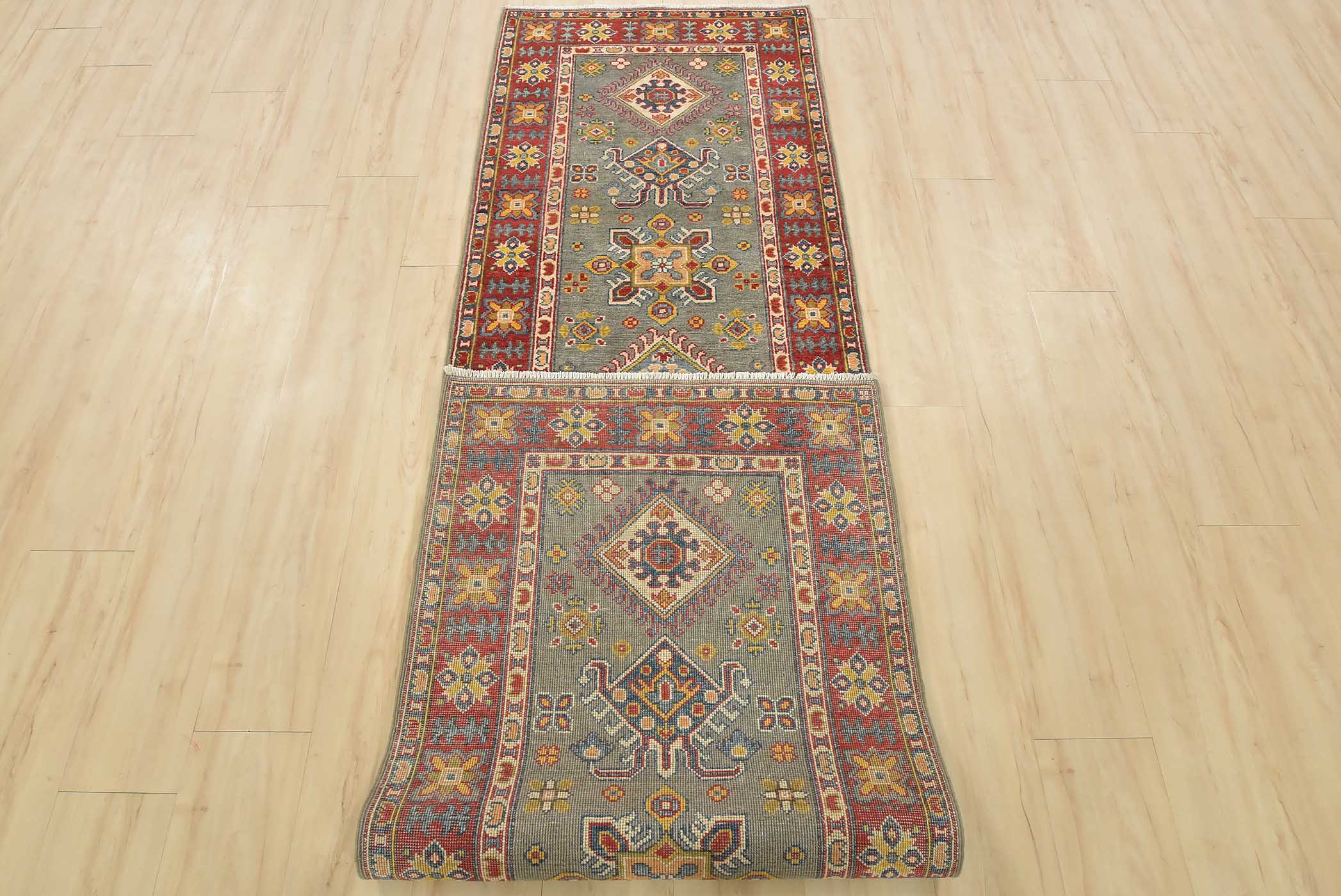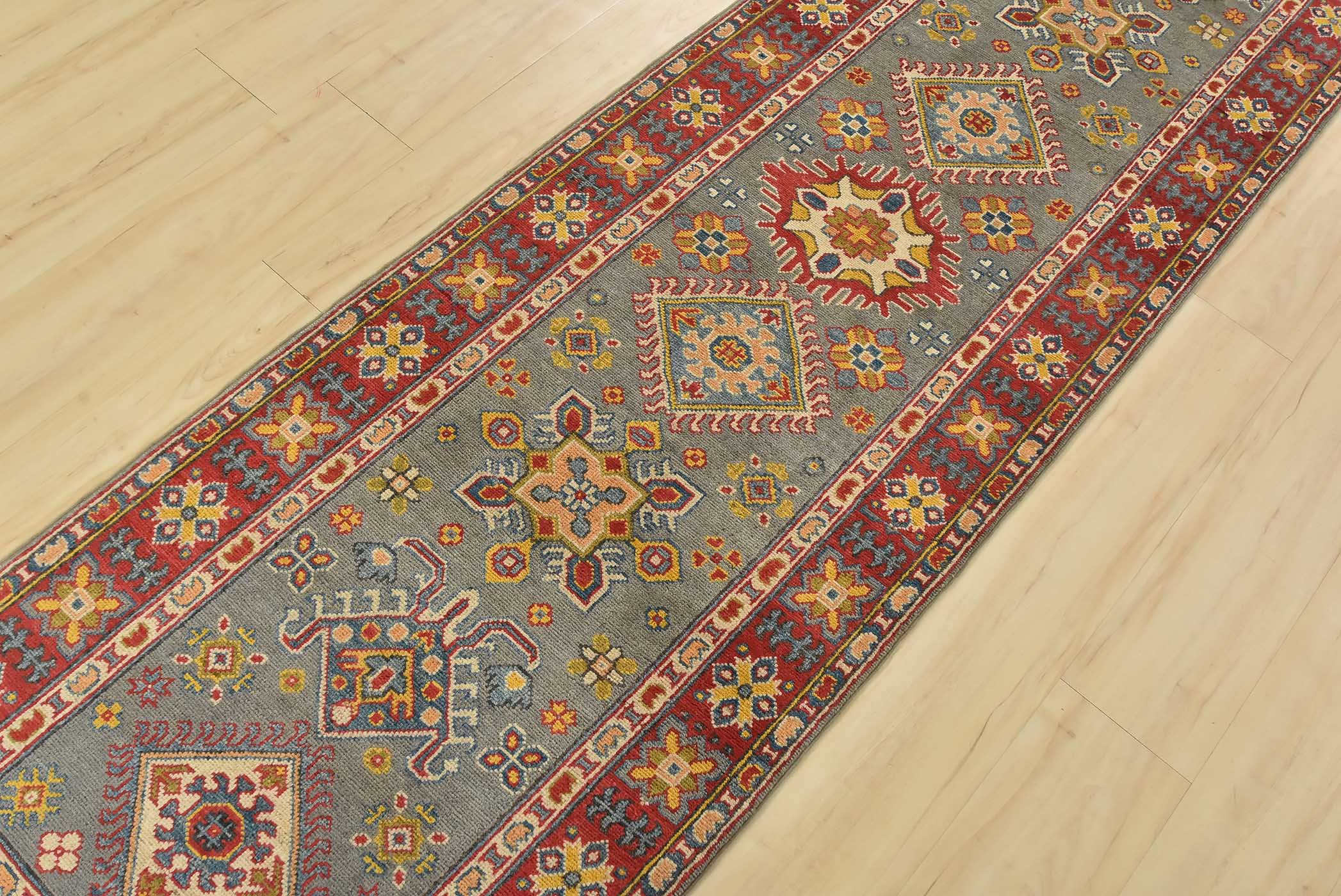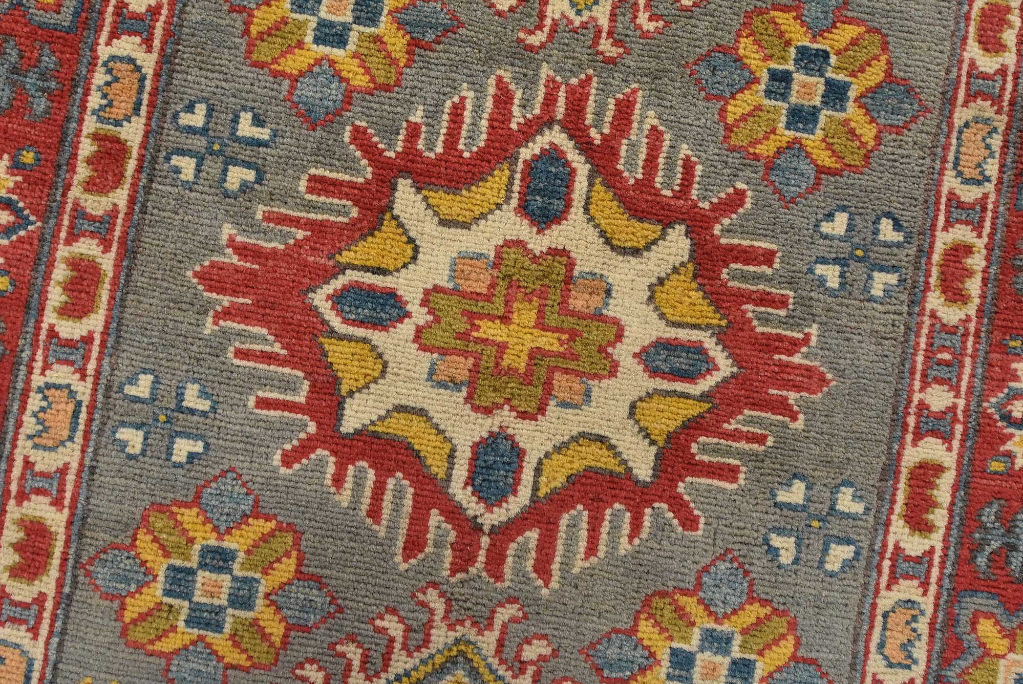 A tribal Caucasian Kazak runner hand-knotted with fine wool on a cotton foundation. This rug features a row of geometric medallions surrounded by small geometric motifs set against a gray background. It is new and in excellent condition.
