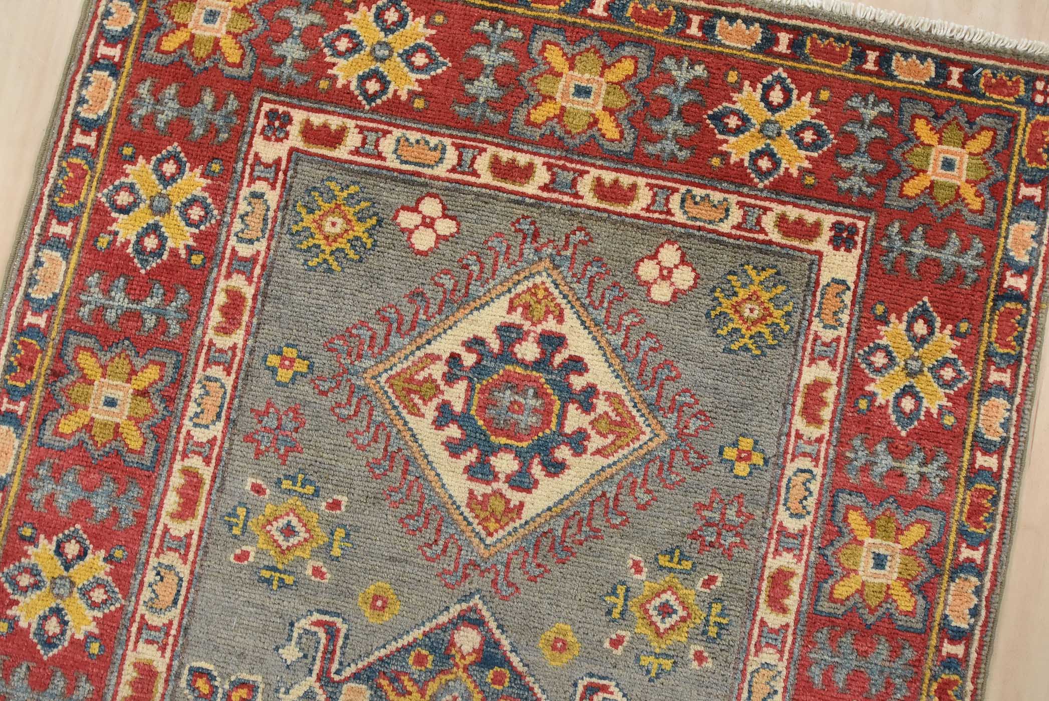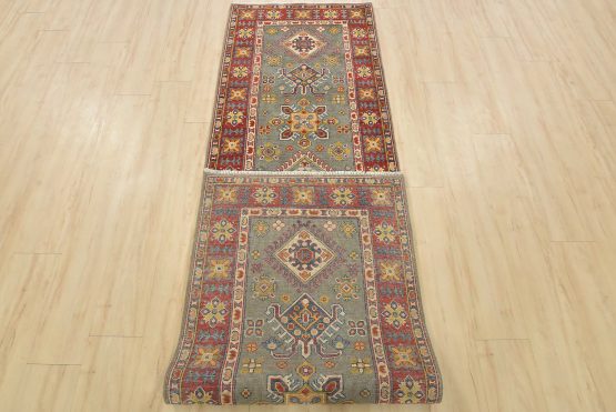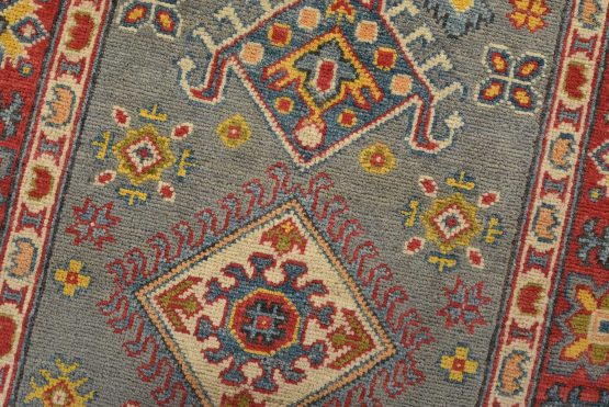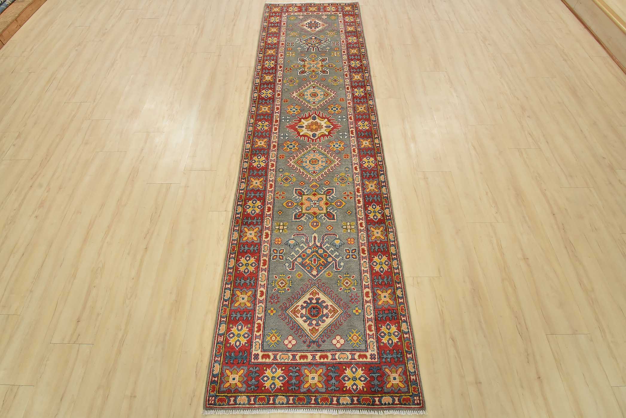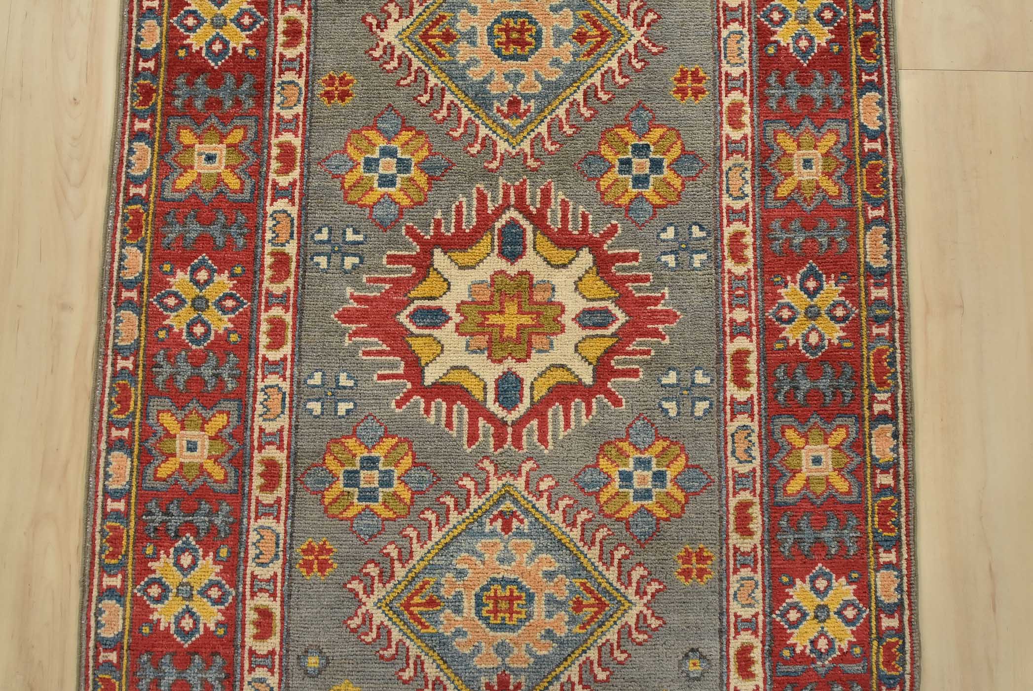 A tribal Caucasian Kazak runner hand-knotted with fine wool on a cotton foundation. This rug features a row of geometric medallions surrounded by small geometric motifs set against a gray background. It is new and in excellent condition.