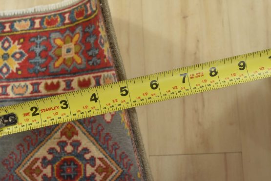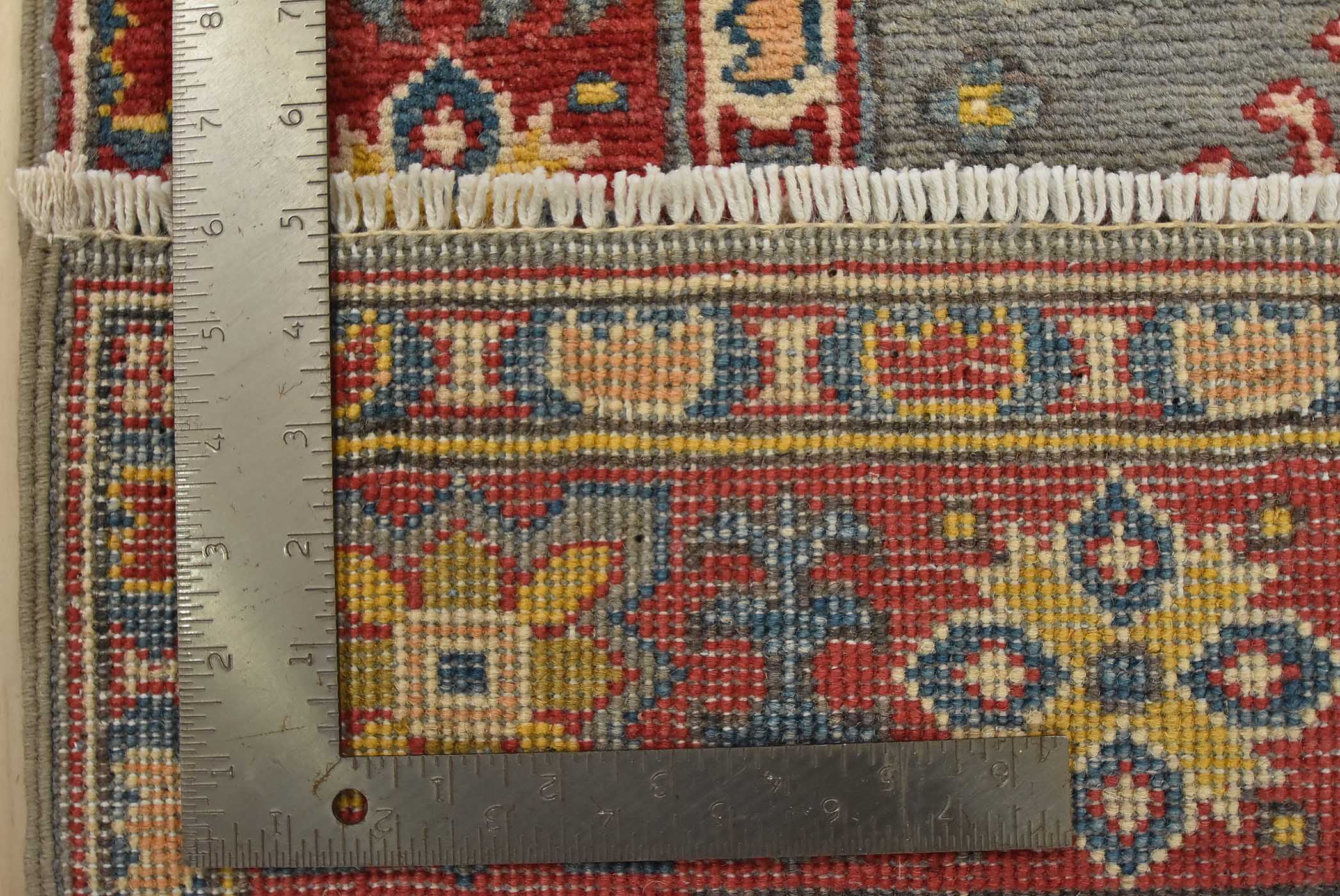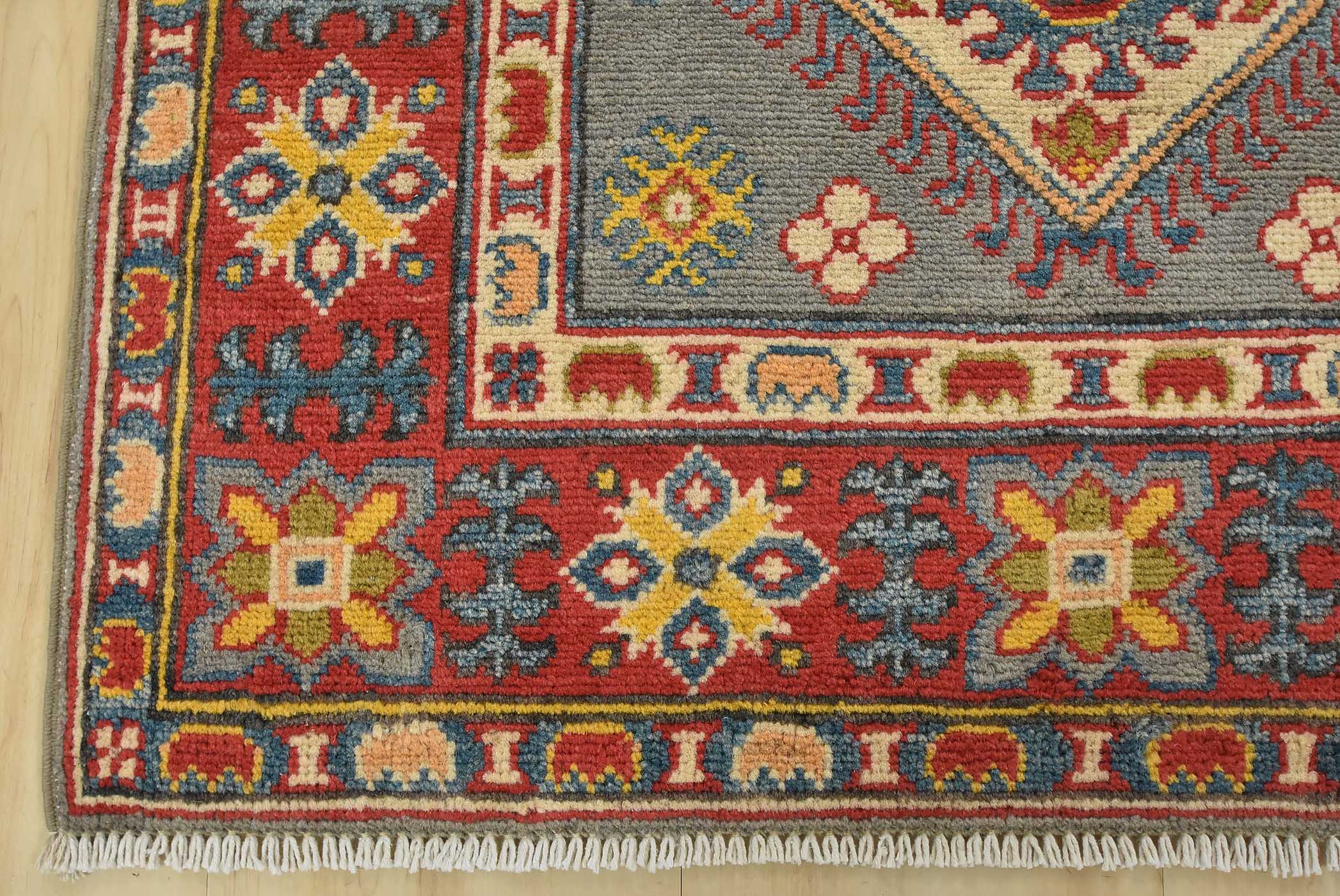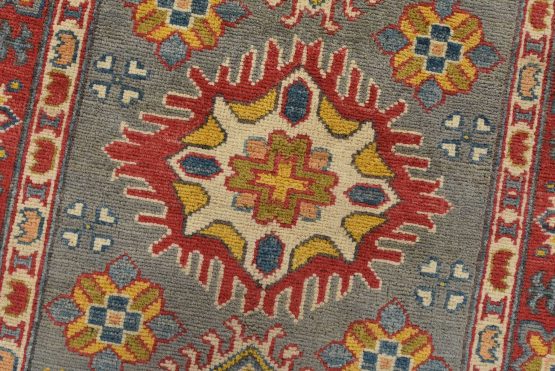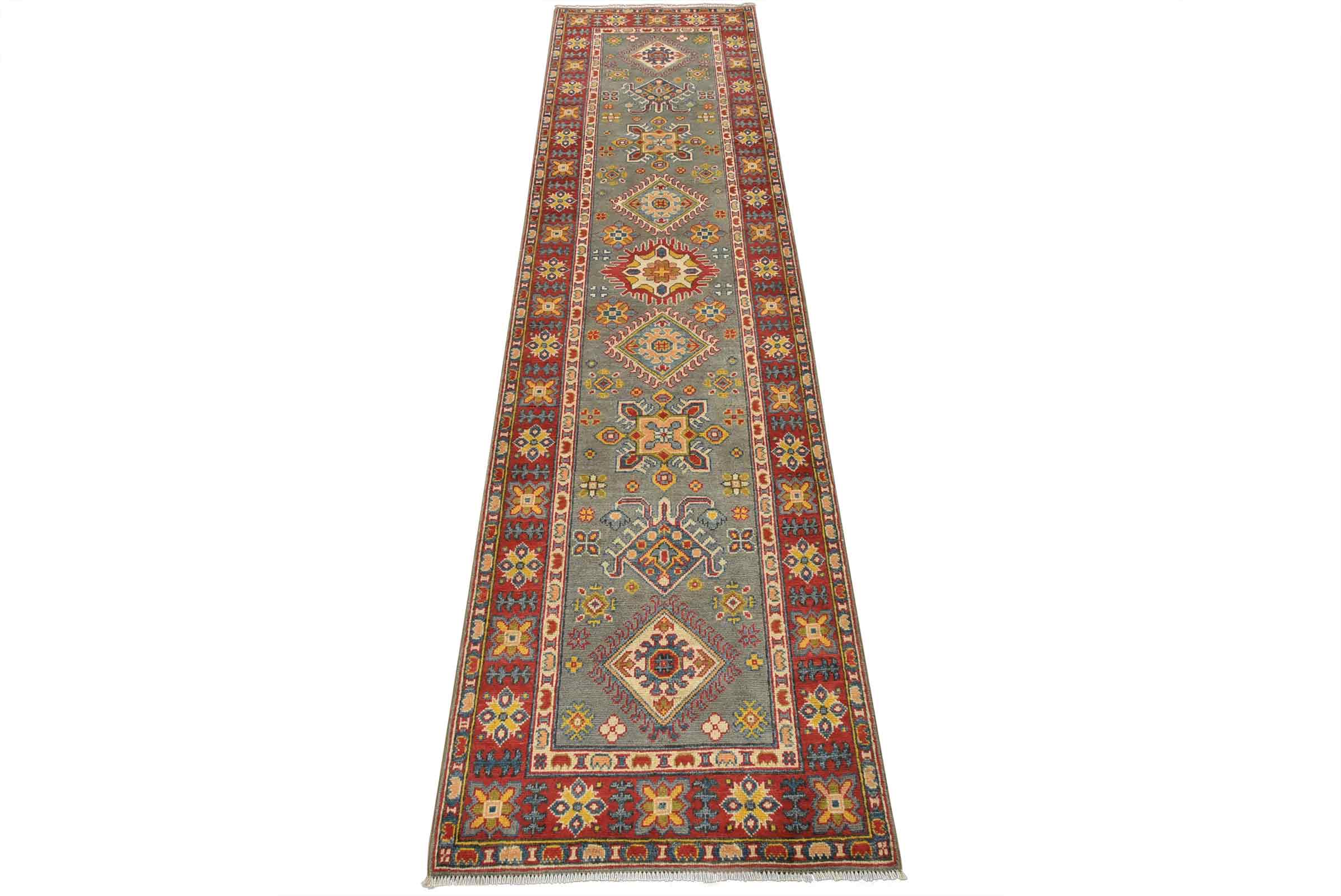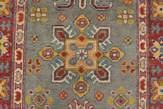 A tribal Caucasian Kazak runner hand-knotted with fine wool on a cotton foundation. This rug features a row of geometric medallions surrounded by small geometric motifs set against a gray background. It is new and in excellent condition.