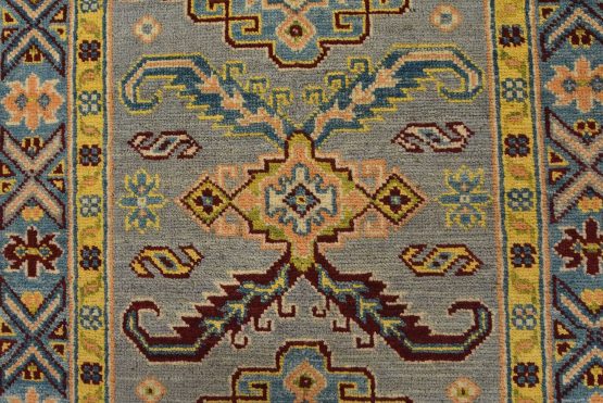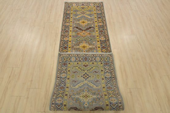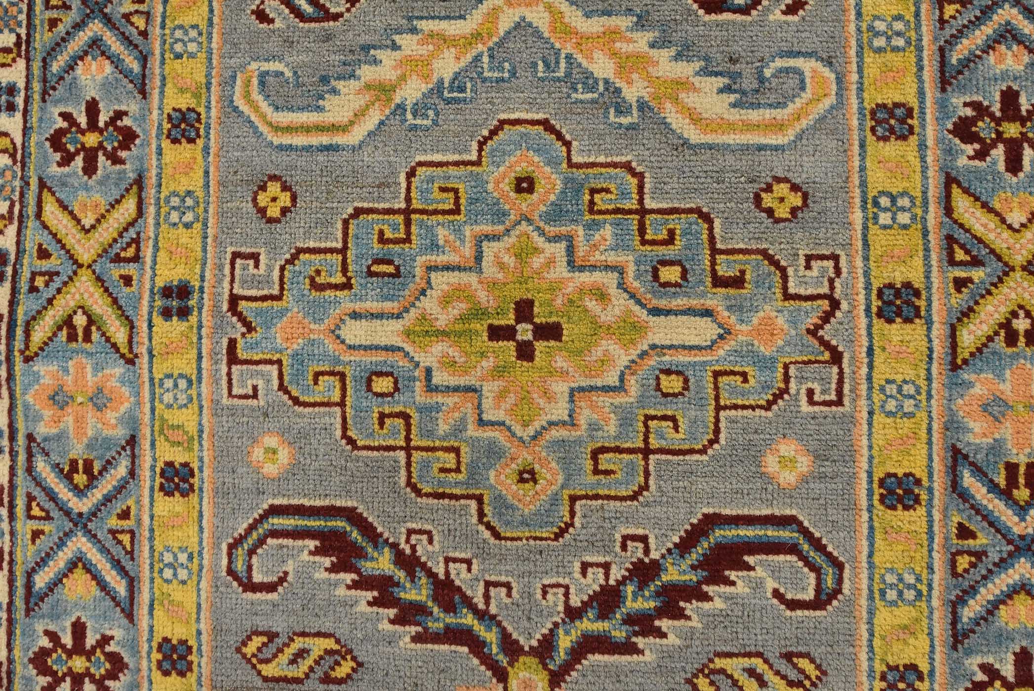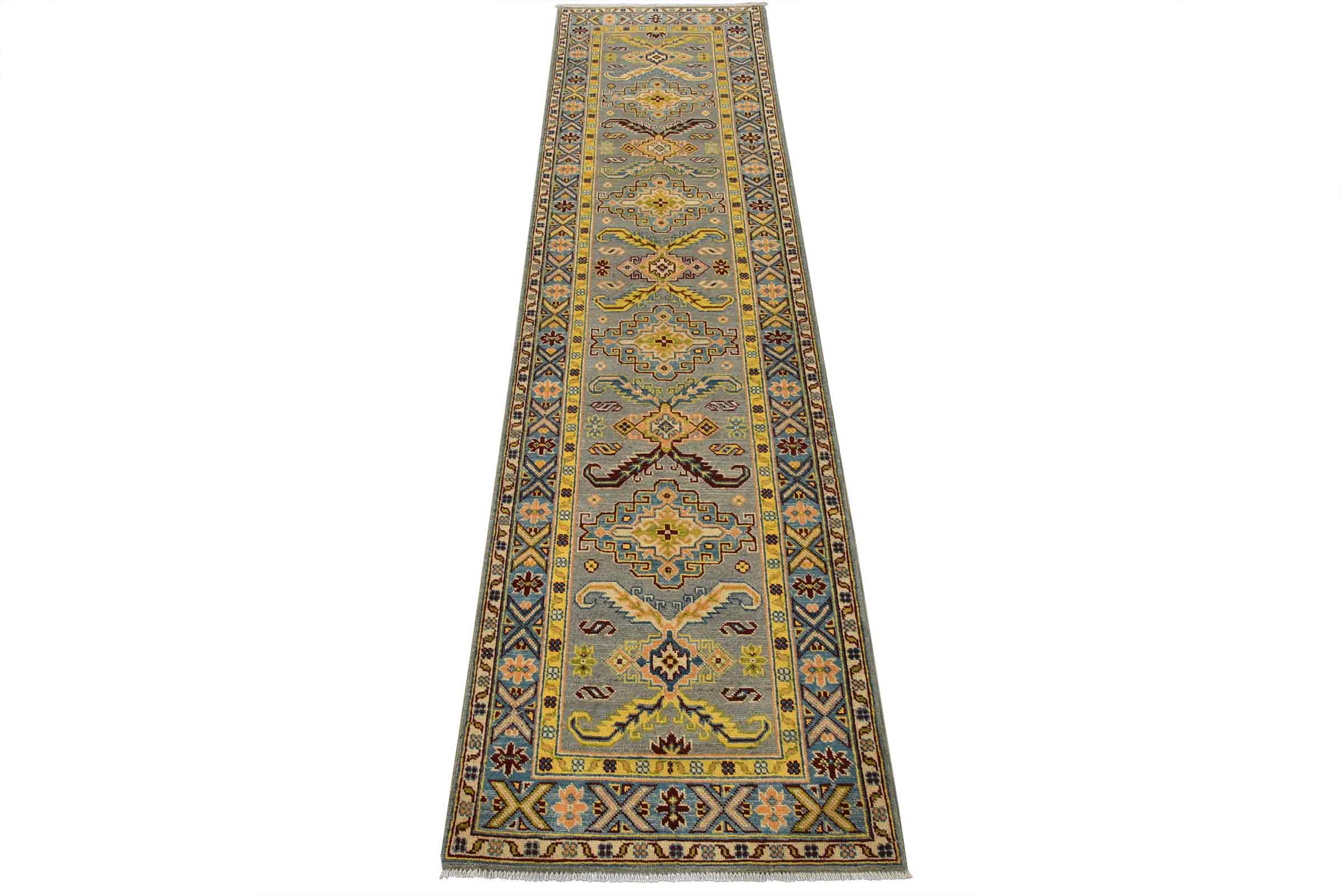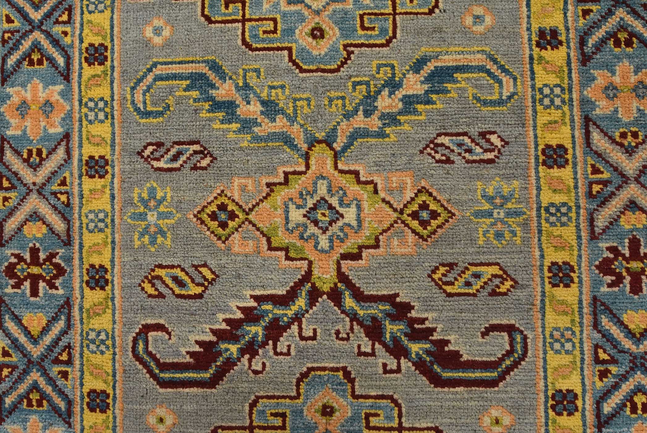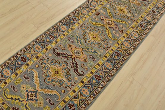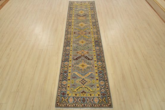 A tribal Caucasian Kazak runner hand-knotted with fine wool on a cotton foundation. This rug features geometric medallions surrounded by small geometric motifs set against a gray background. It is new and in excellent condition.