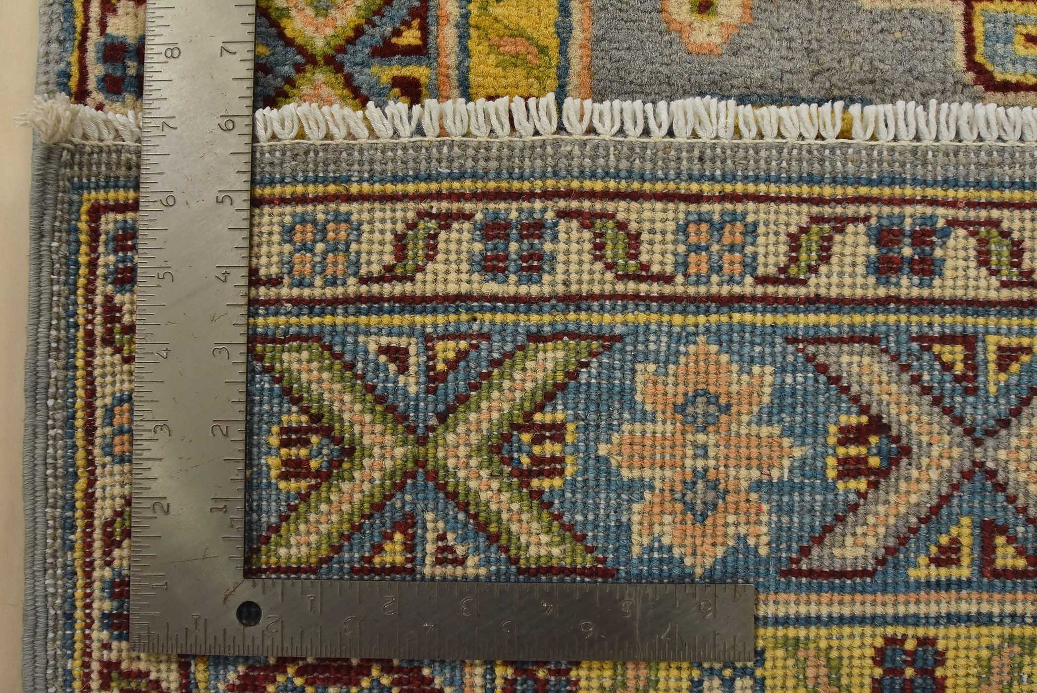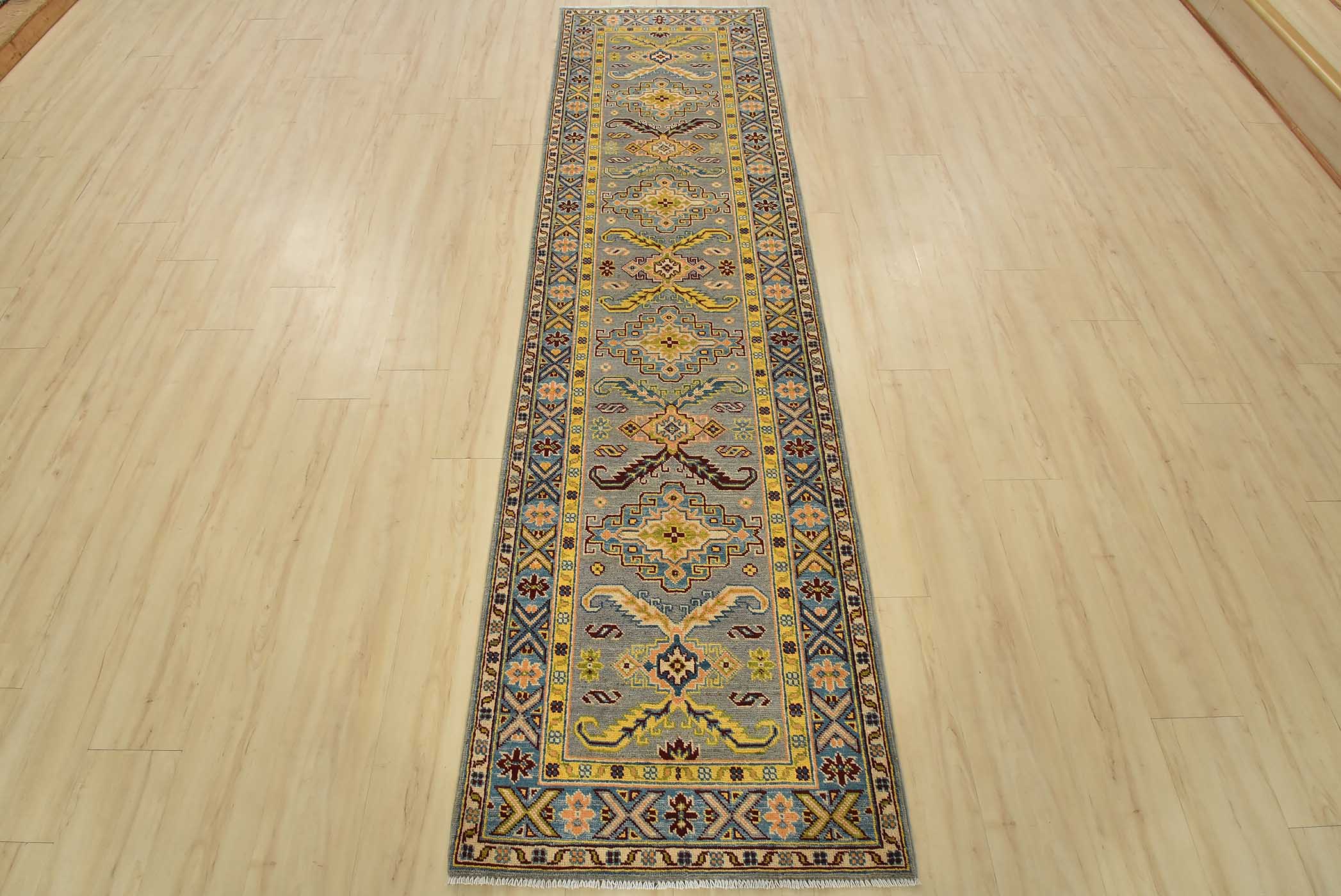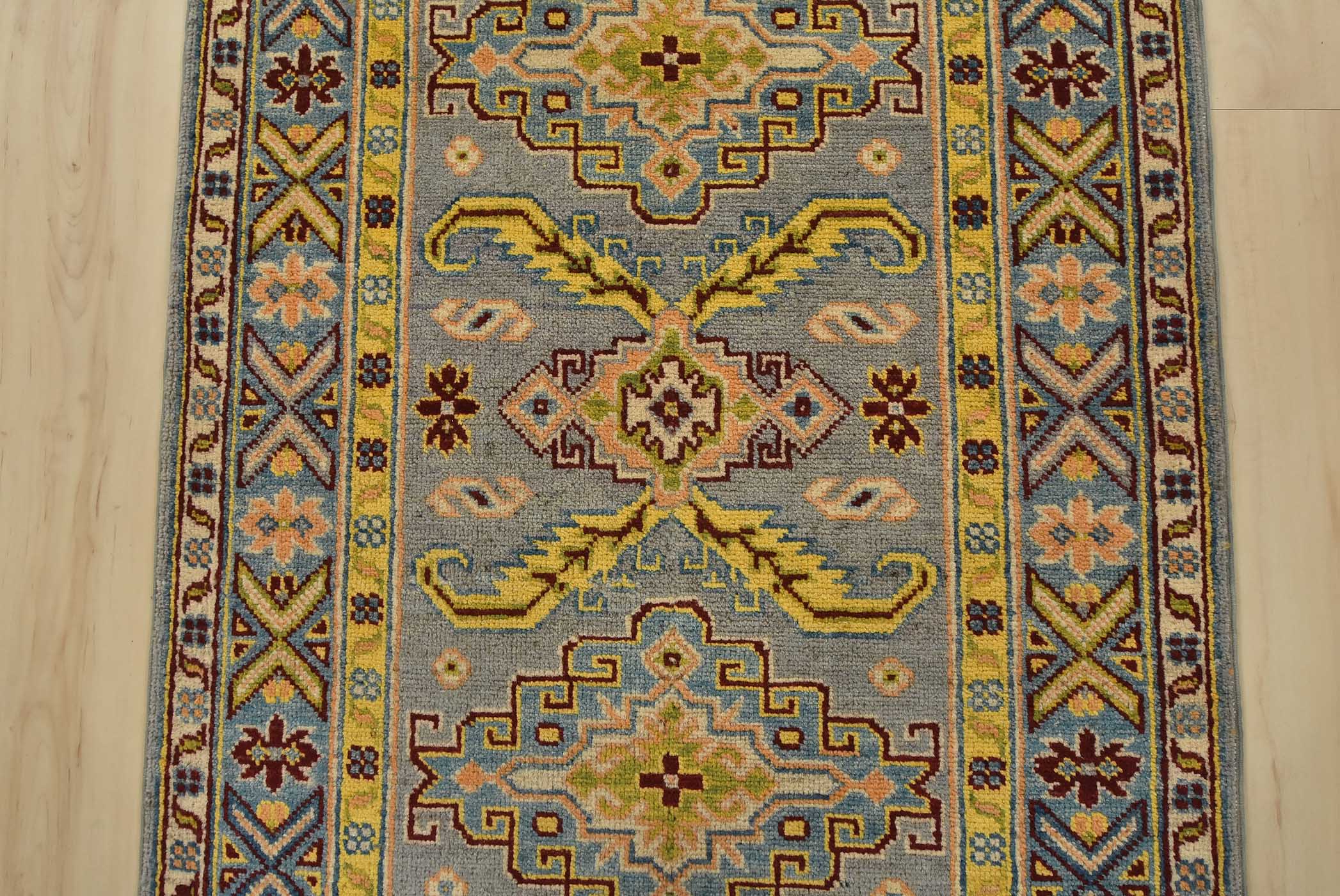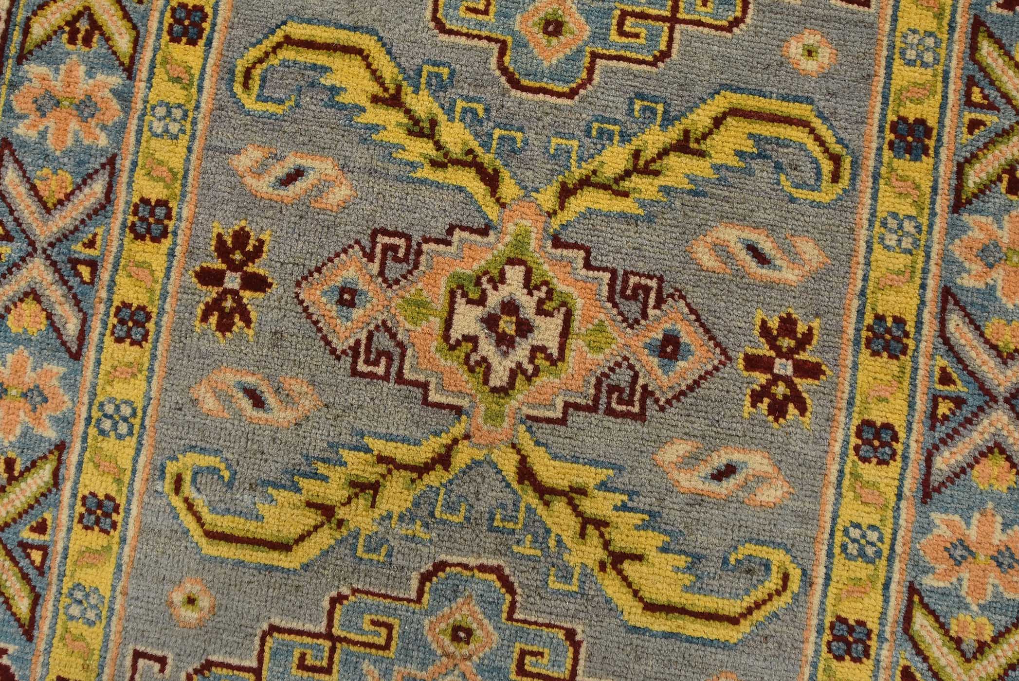 A tribal Caucasian Kazak runner hand-knotted with fine wool on a cotton foundation. This rug features geometric medallions surrounded by small geometric motifs set against a gray background. It is new and in excellent condition.