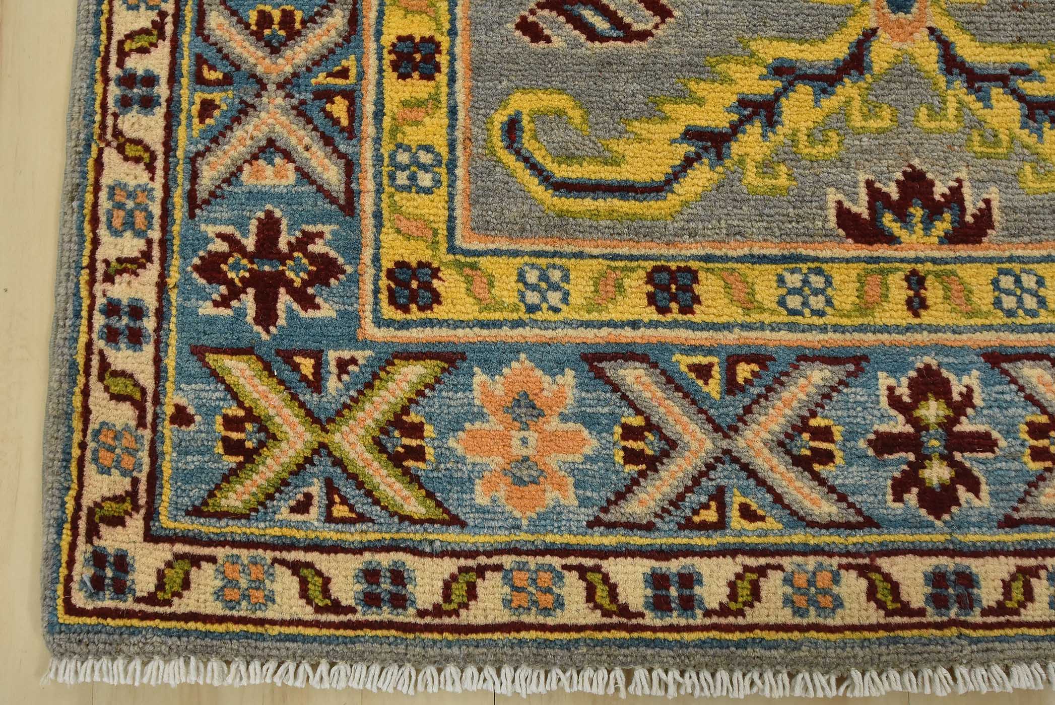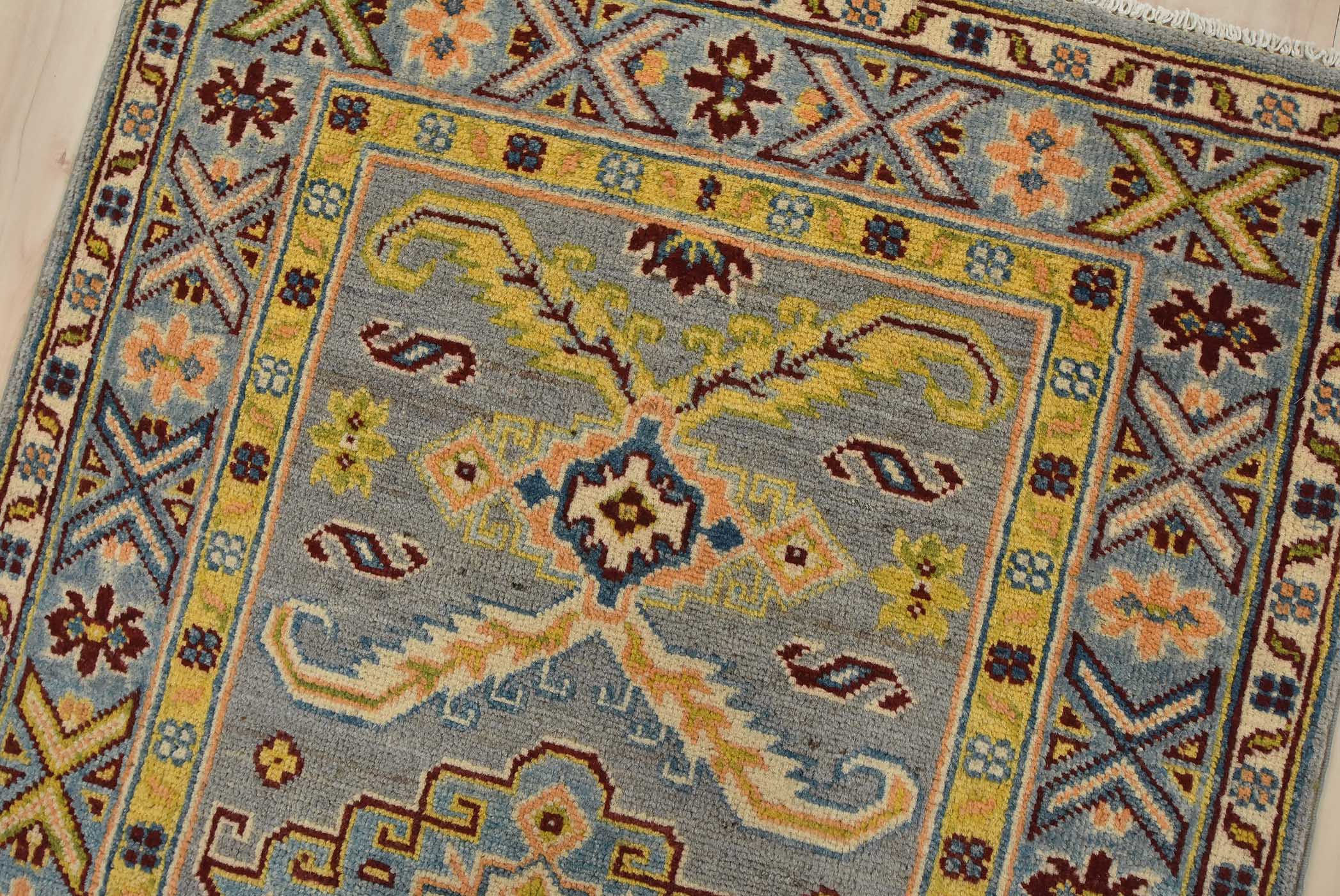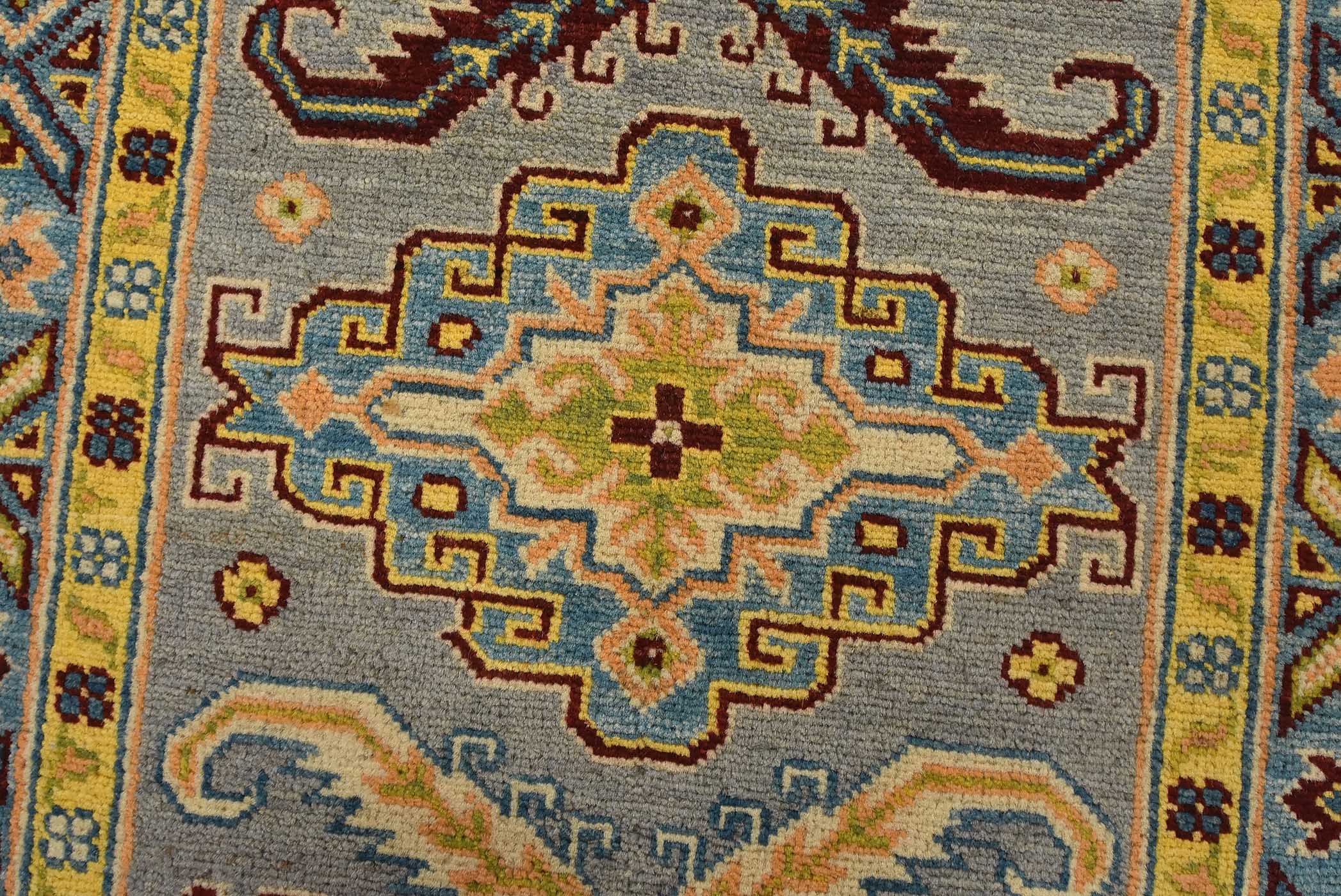 Original antique Kazak rugs from the Caucasus region inspire the creation of new Kazak rugs. These rugs are woven with fine wool using traditional Kazak patterns and finished with a low-cut pile to give them an authentic vintage look.