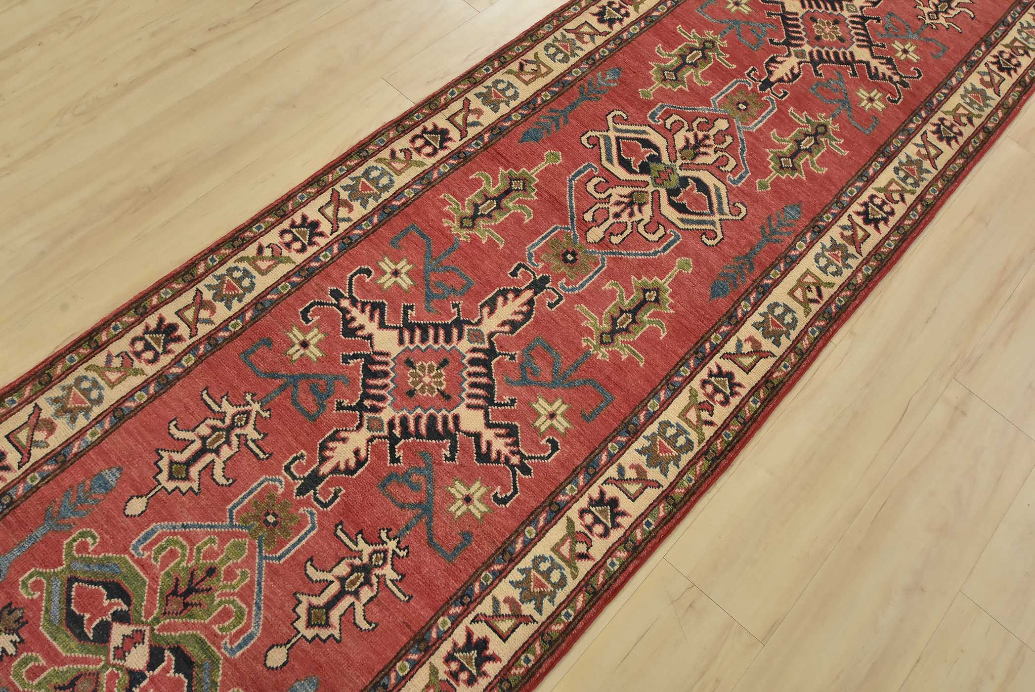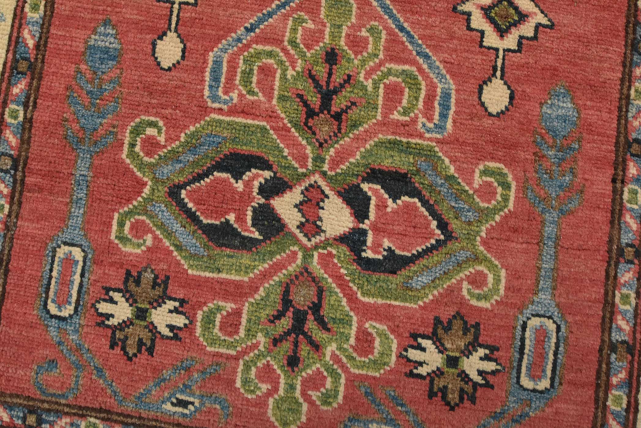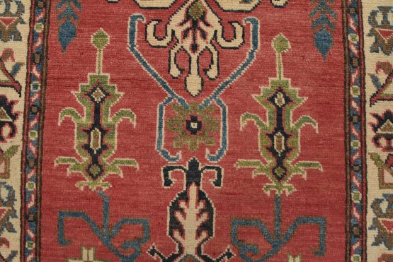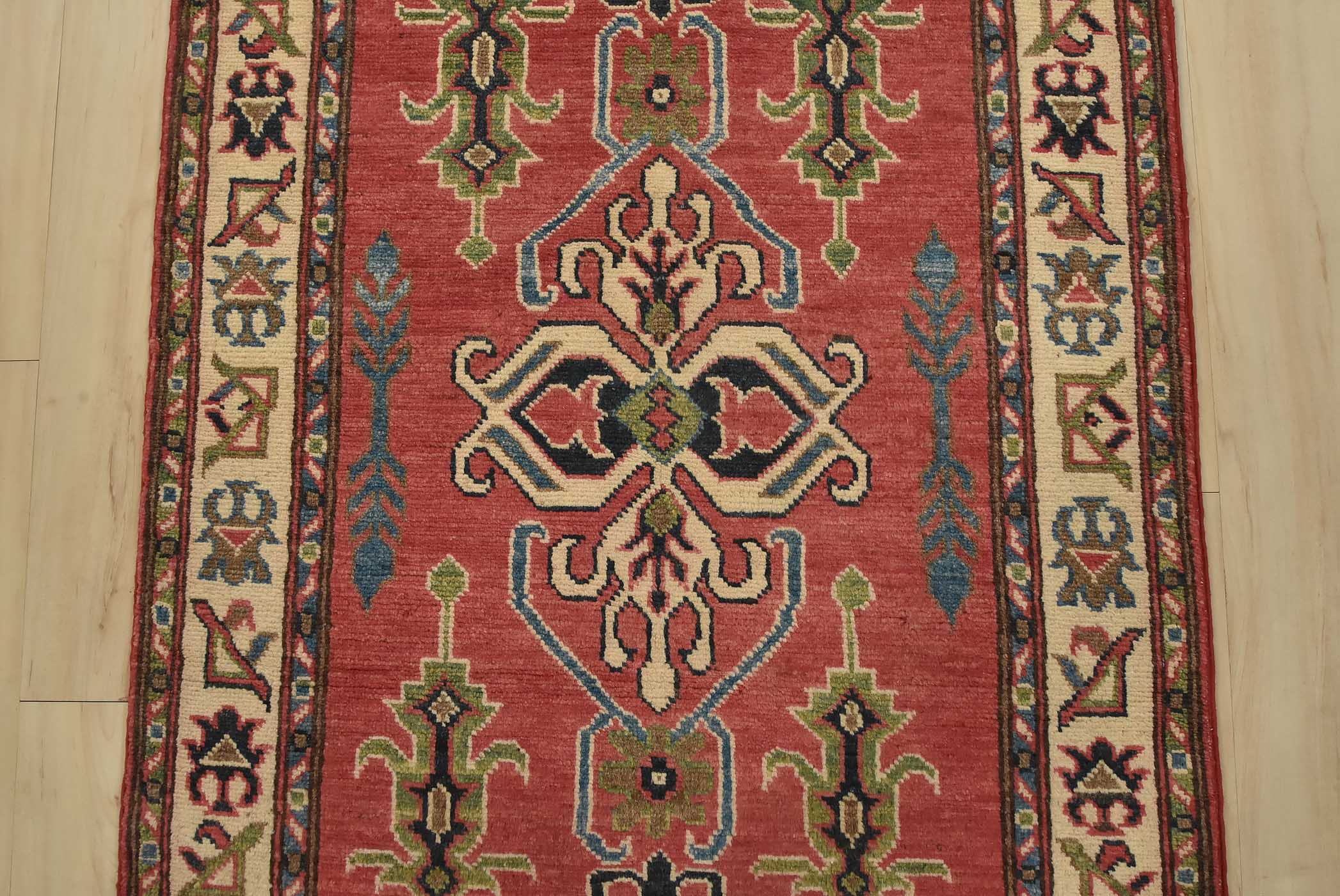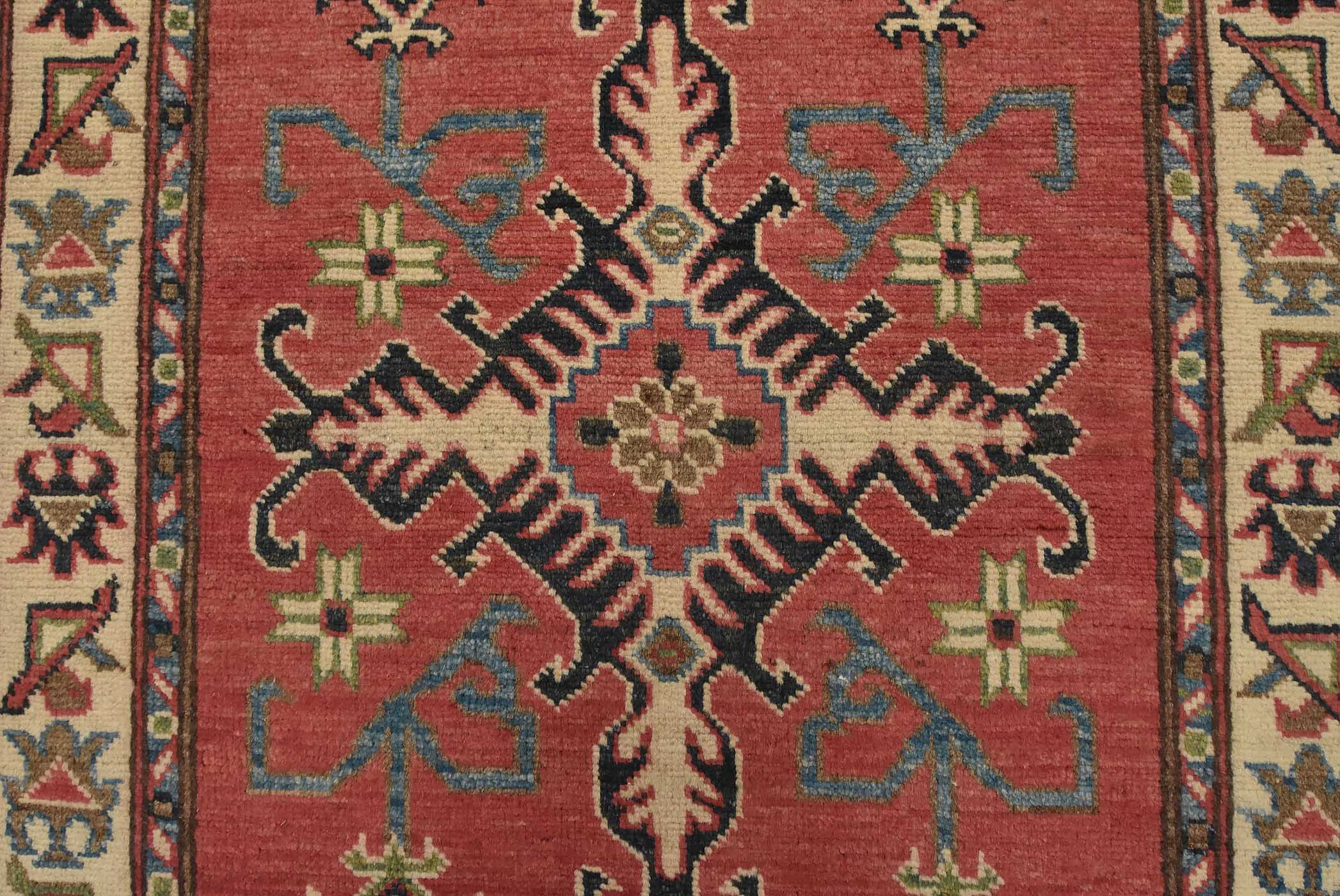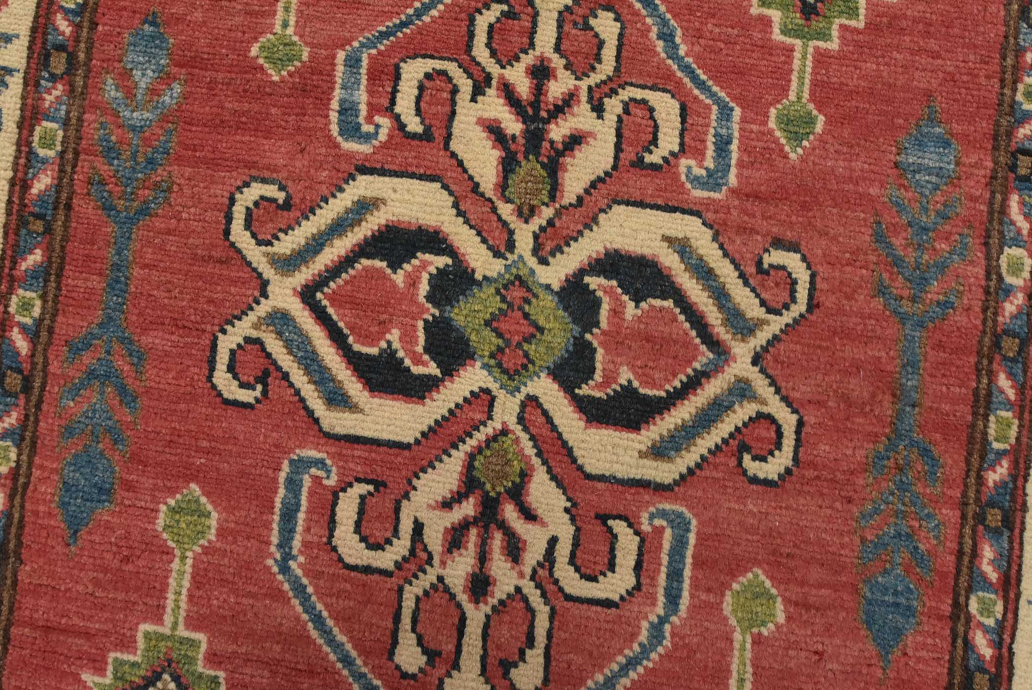 A tribal Caucasian Kazak runner hand-knotted with fine wool on a cotton foundation. This rug features a row of medallions surrounded by geometric botanical motifs set against a red background. It is new and in excellent condition.