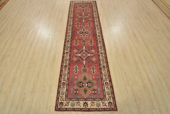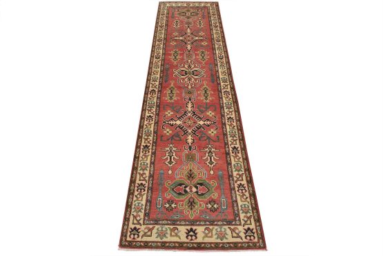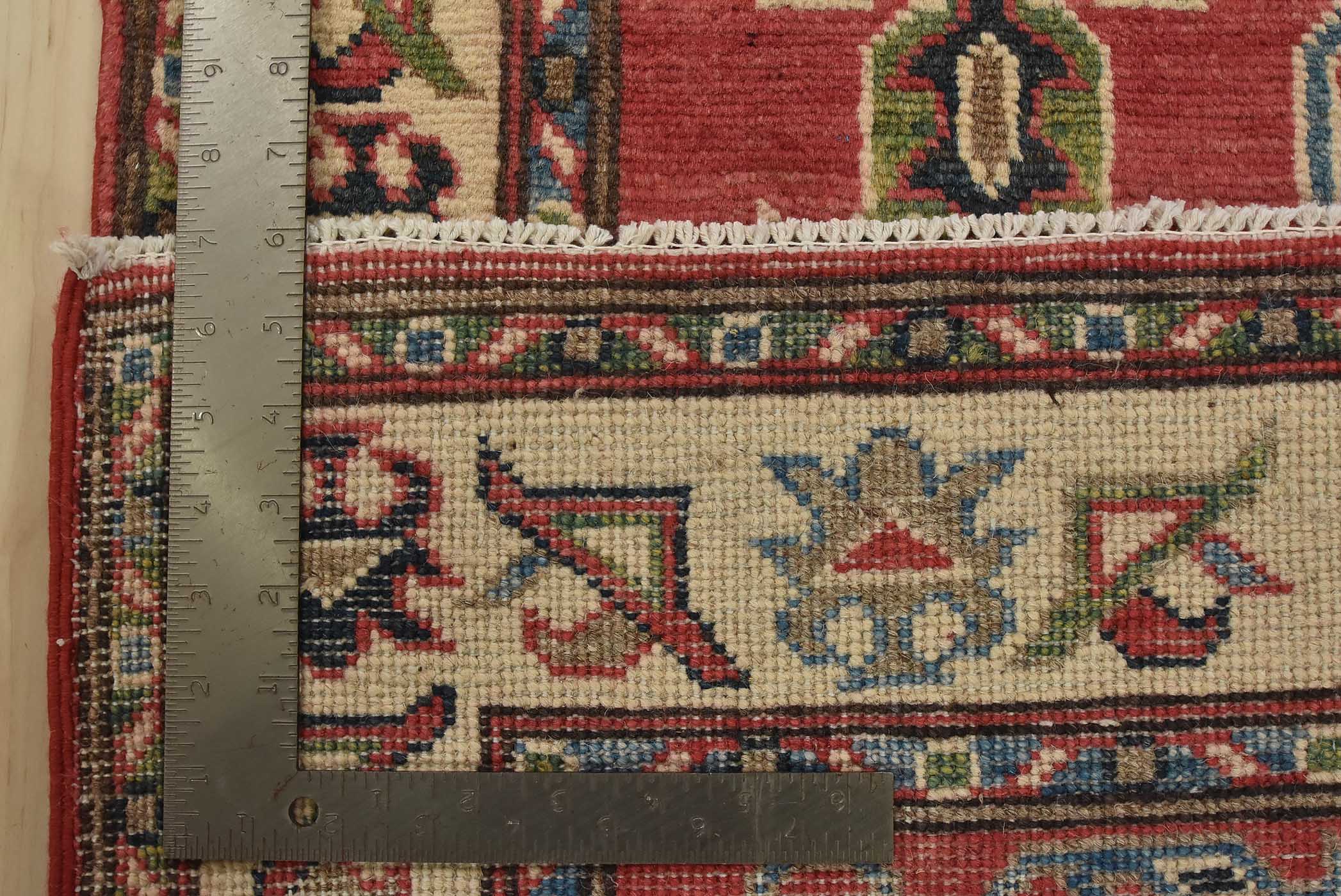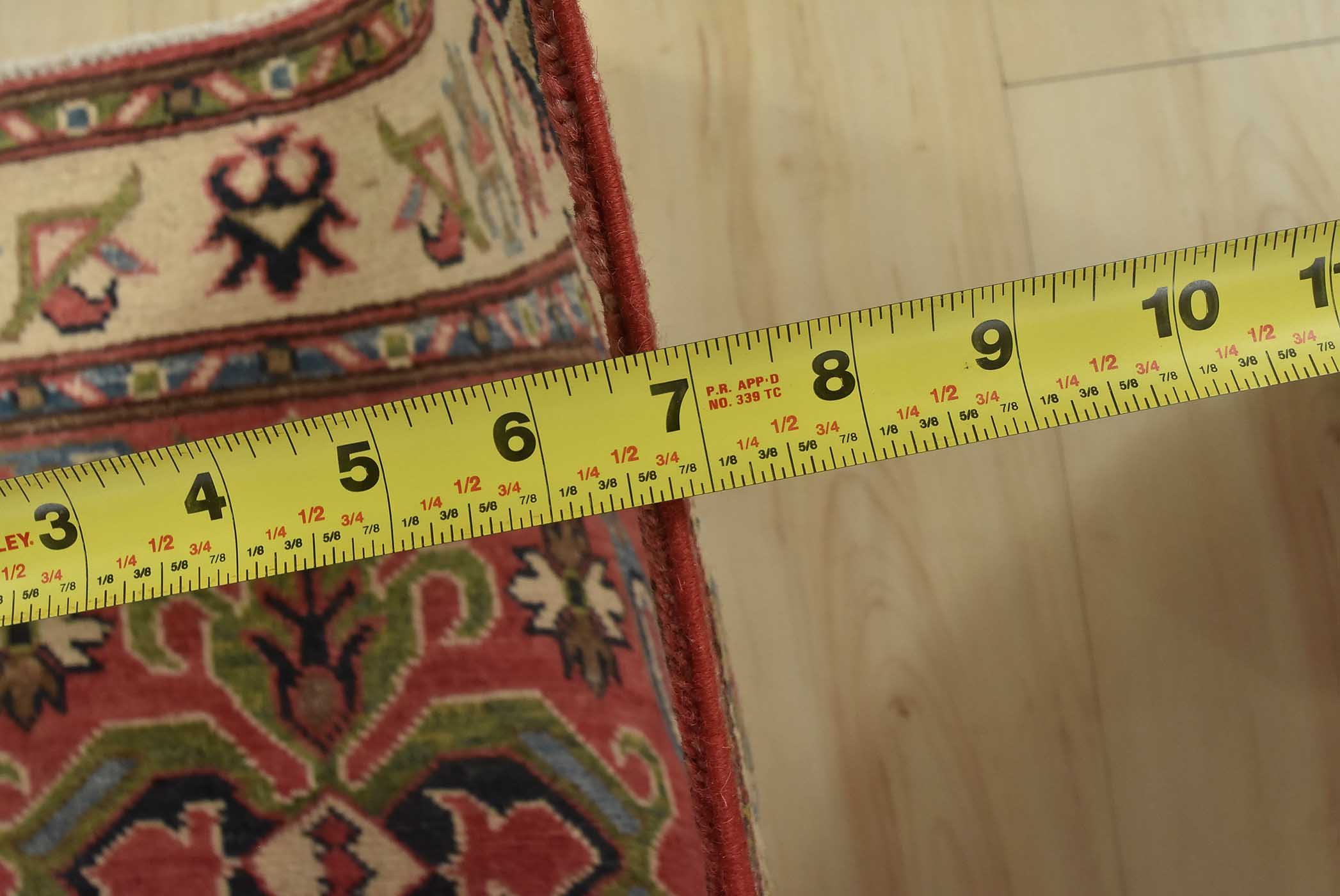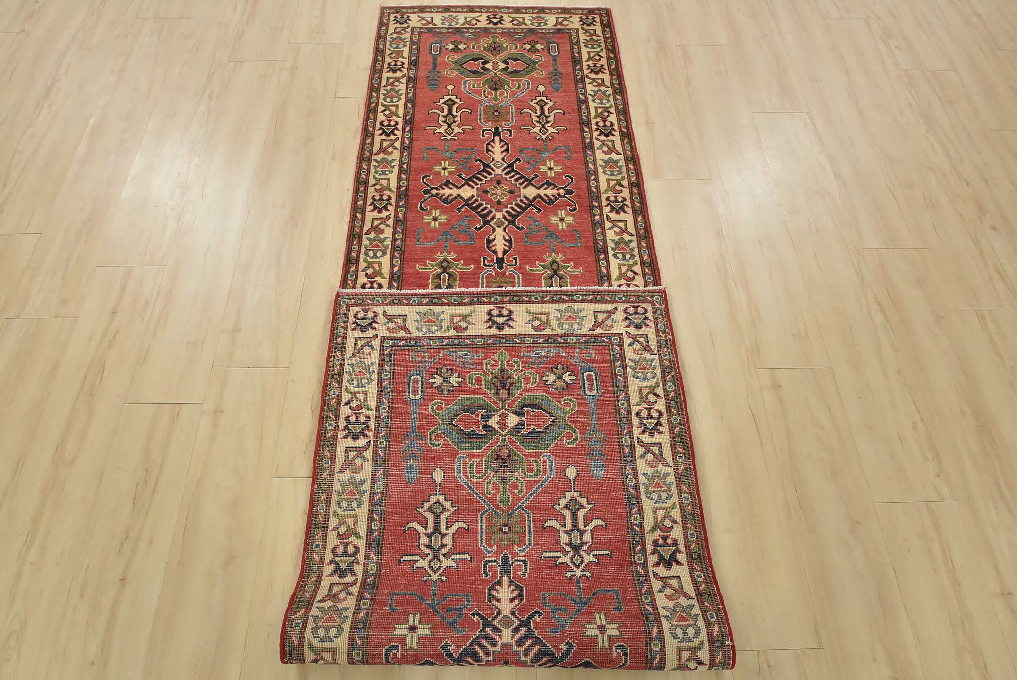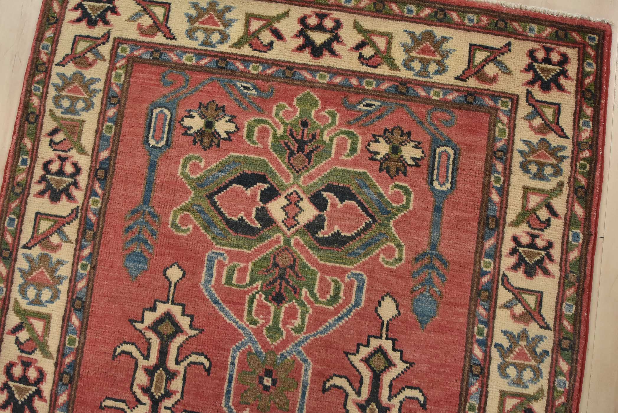 A tribal Caucasian Kazak runner hand-knotted with fine wool on a cotton foundation. This rug features a row of medallions surrounded by geometric botanical motifs set against a red background. It is new and in excellent condition.